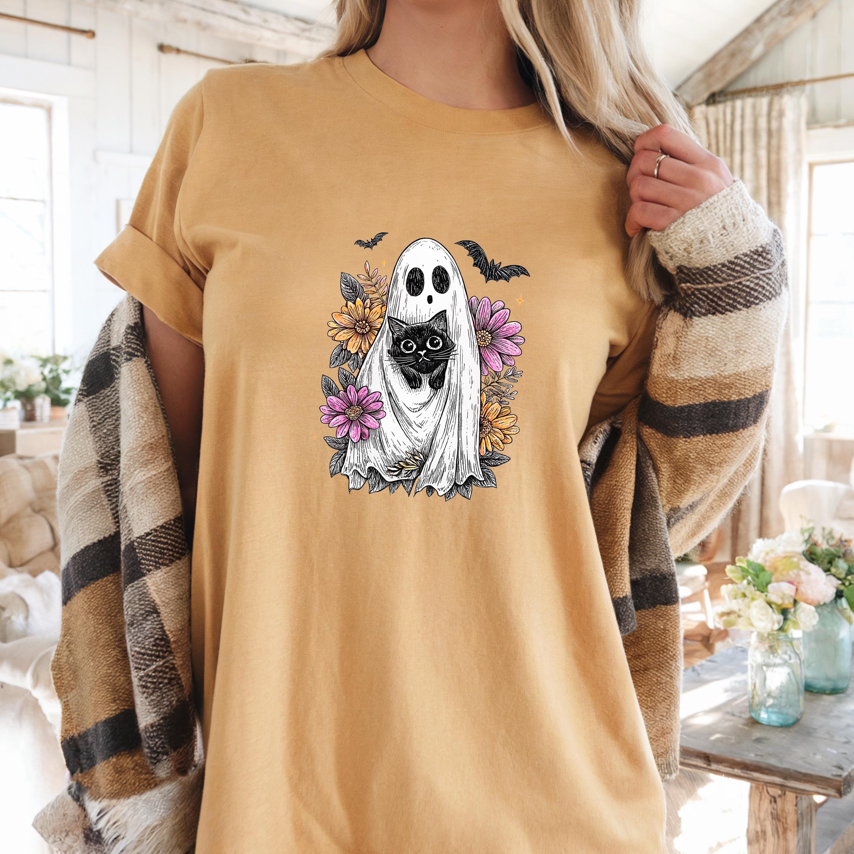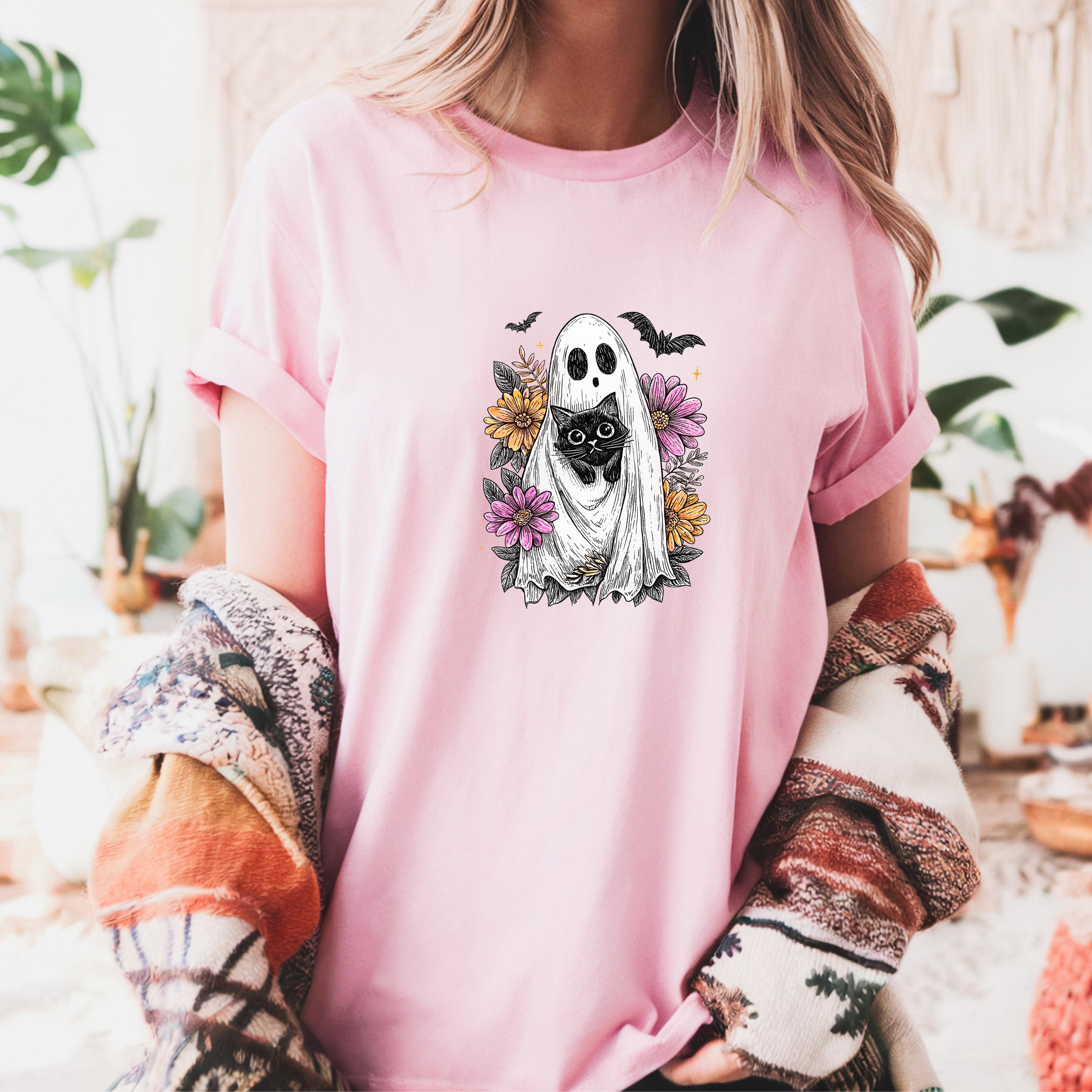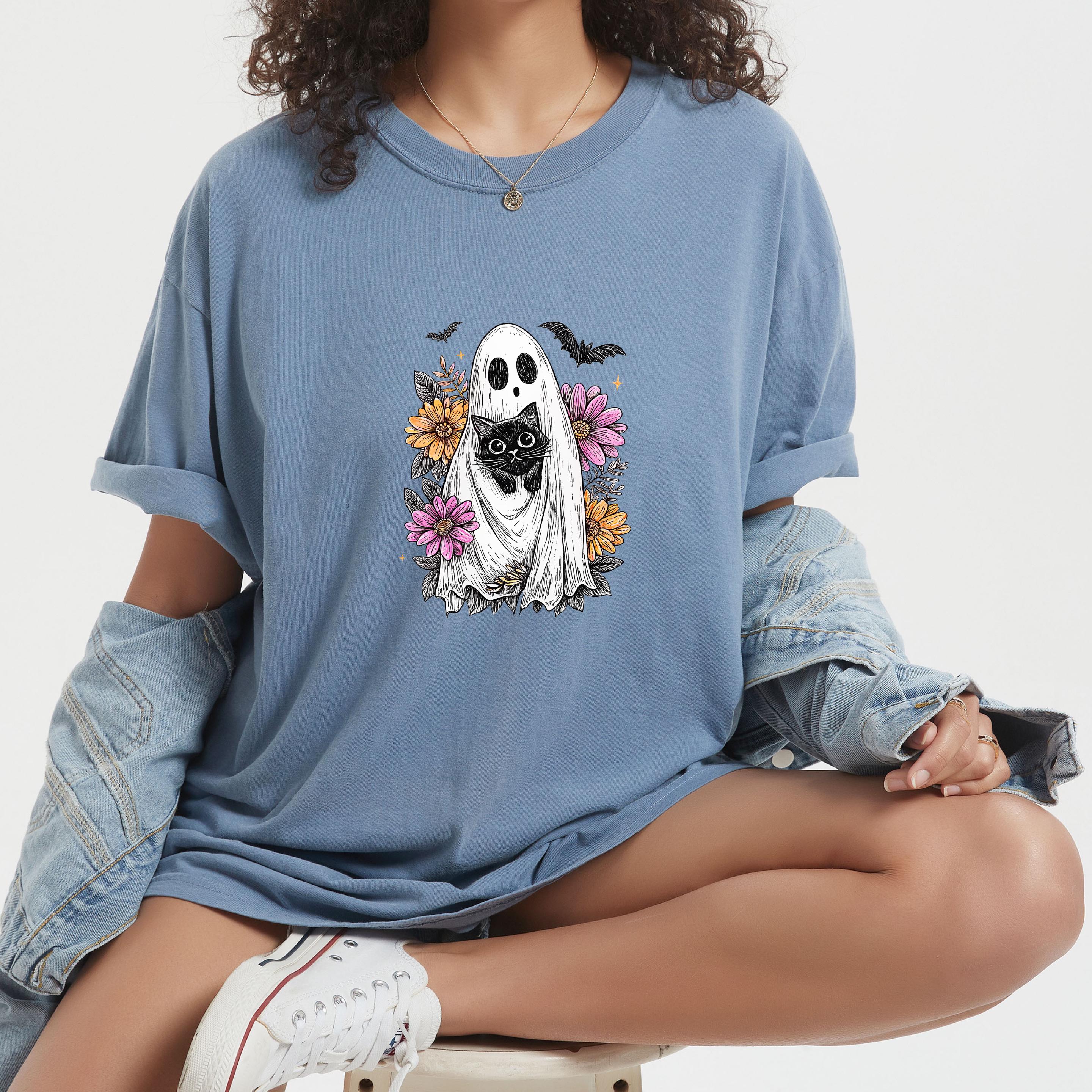 Comfort Colors Black Cat Ghost Shirt: Wildflower Halloween Tee Description