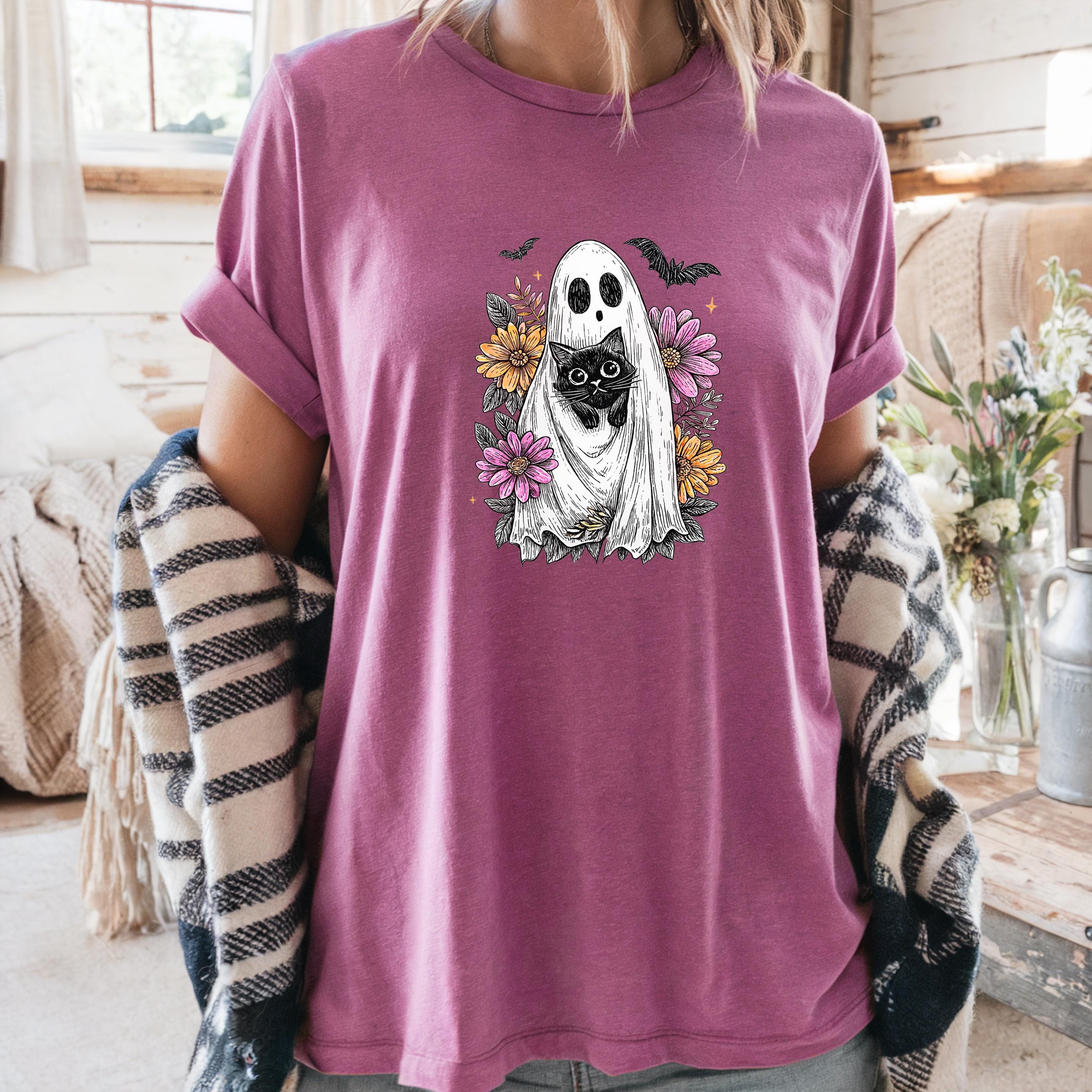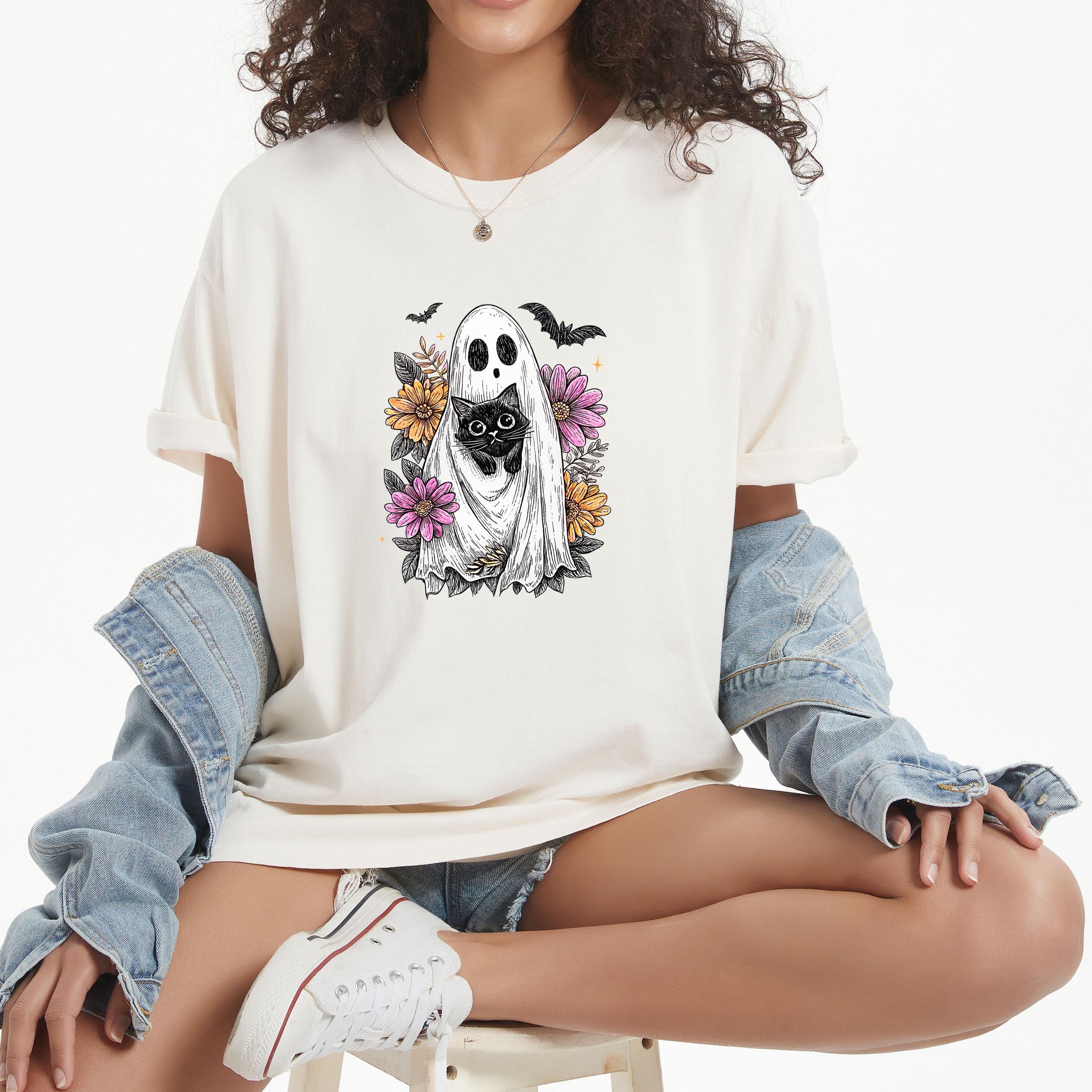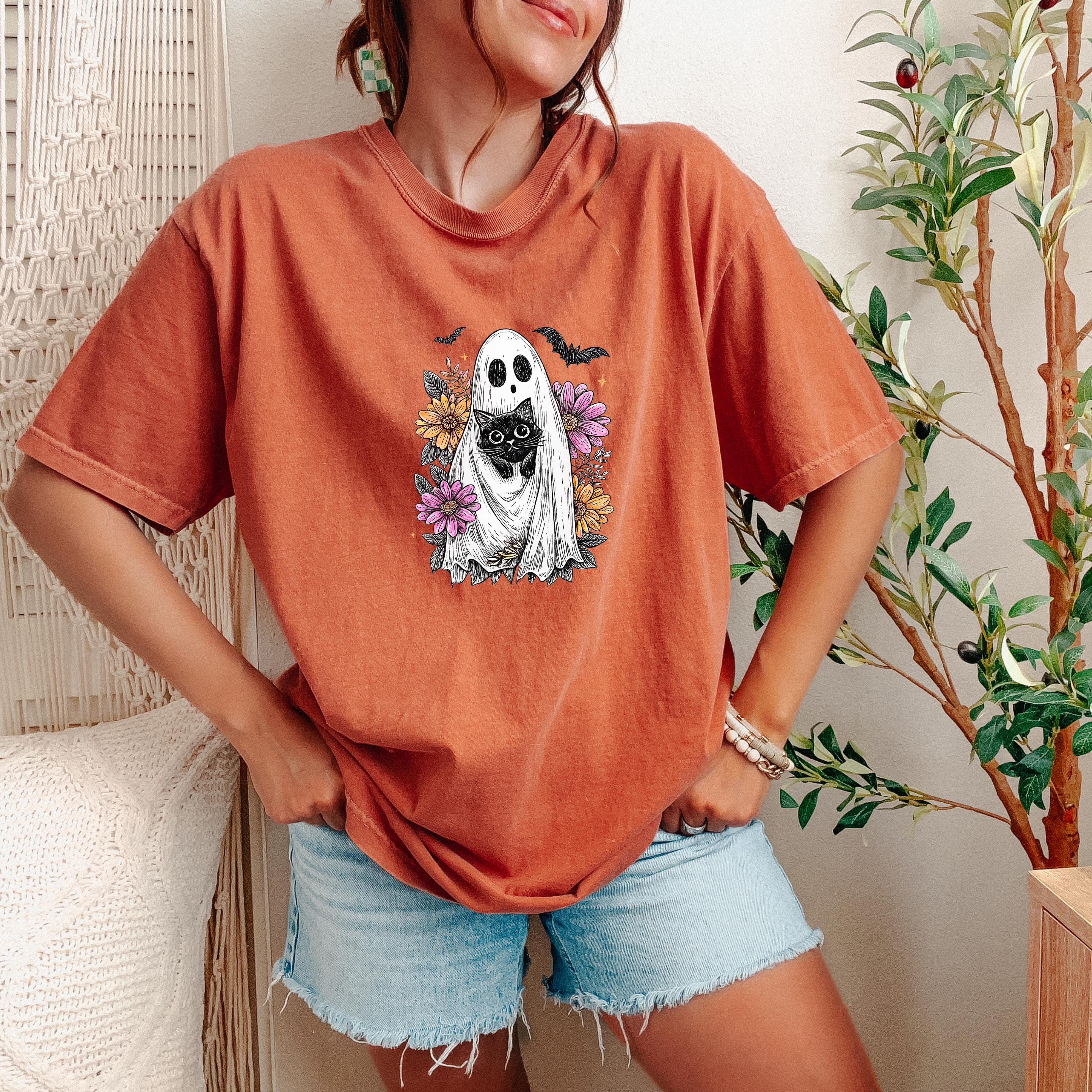 Comfort Colors Black Cat Ghost Shirt: Wildflower Halloween Tee Description