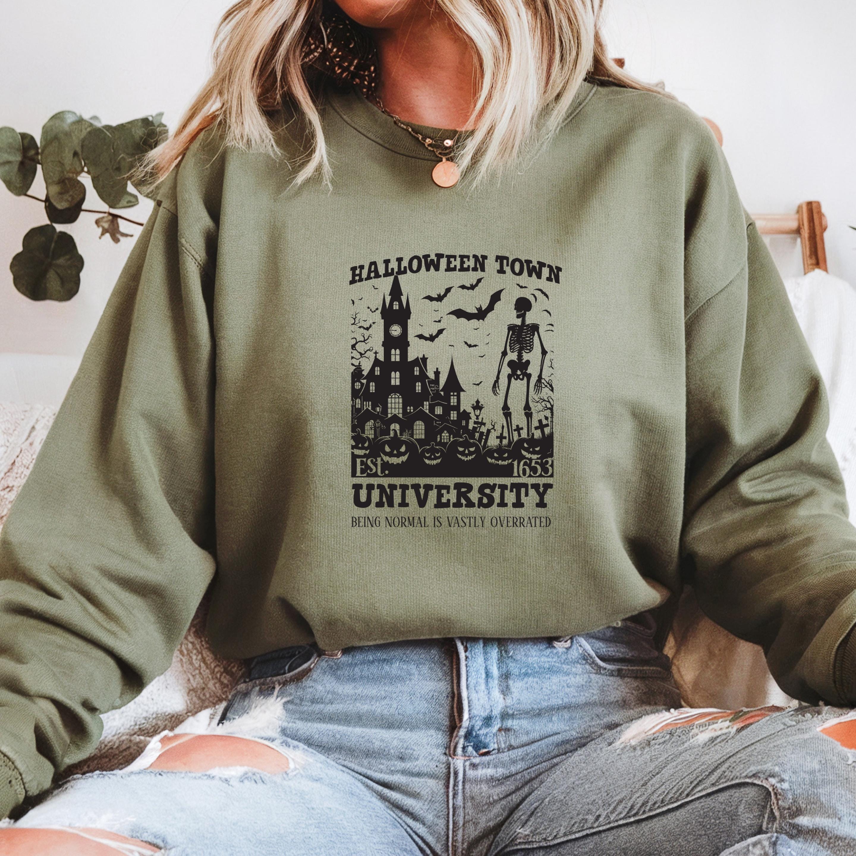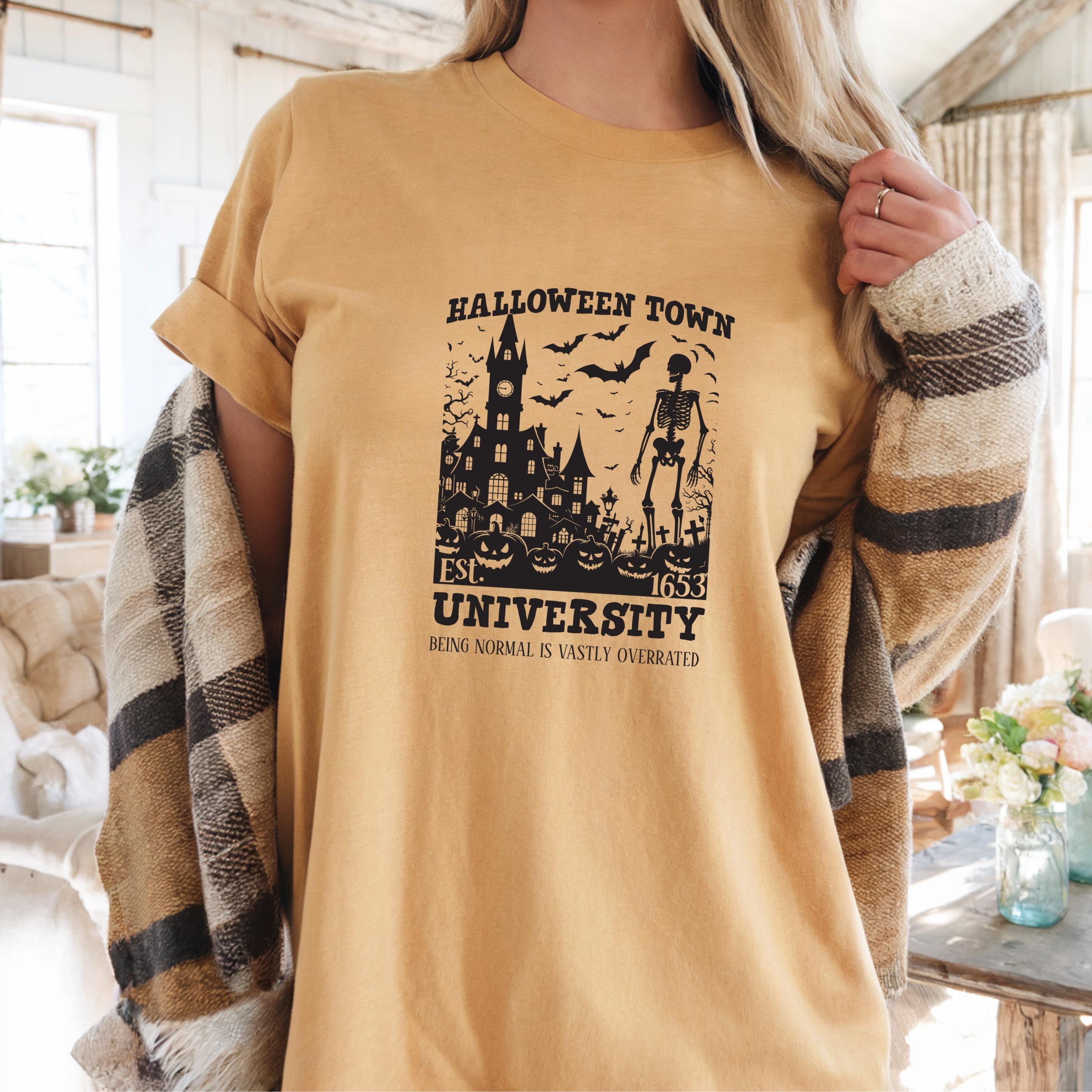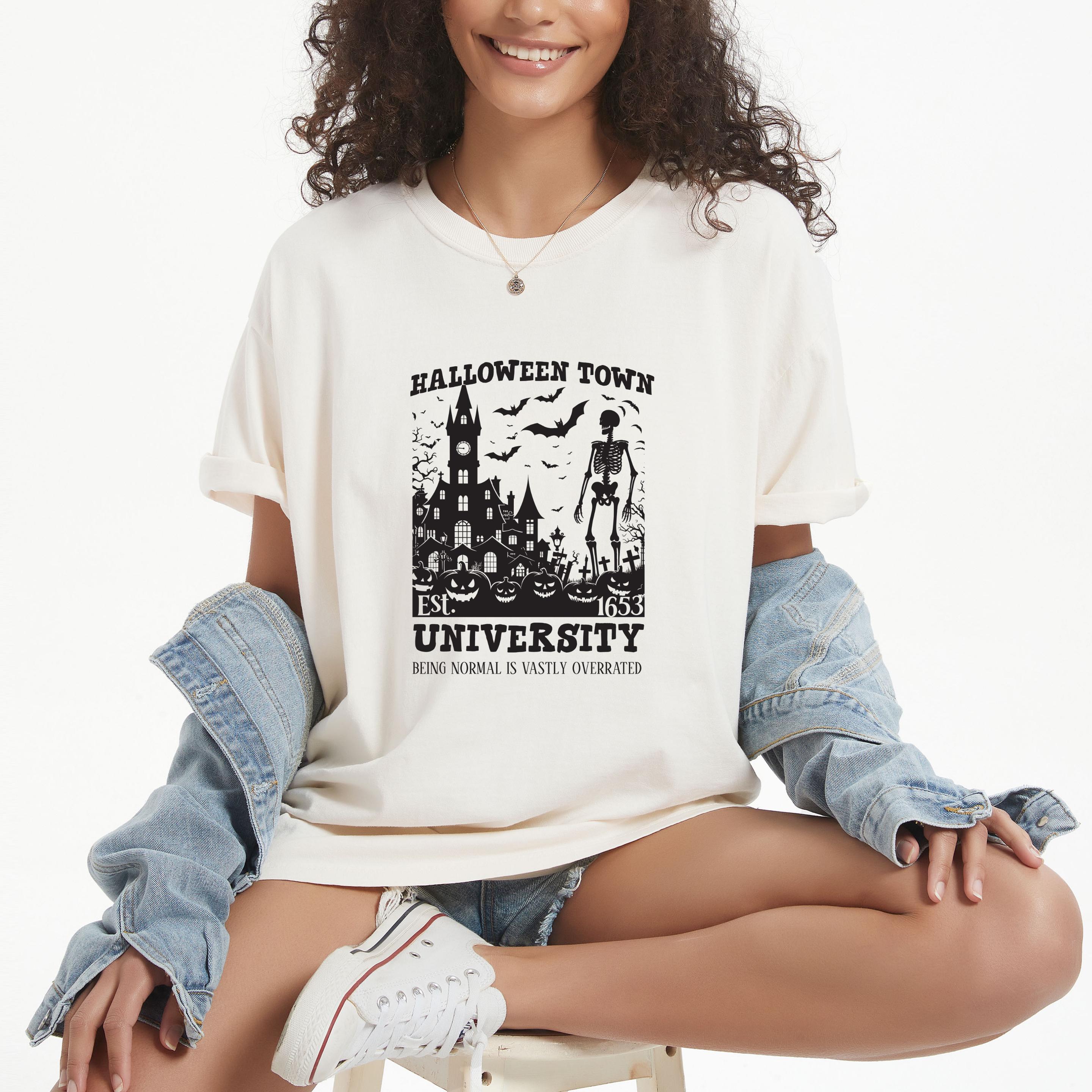Halloweentown University Sweatshirt: Y2K Fall Pumpkin Design Description 🧵 Product Features: Comfort Colors T-shirts: High-quality unisex t-shirt is made from 100% ring-spun cotton. It’s soft, breathable, and built to last – perfect for everyday wear or special occasion. Gildan Sweatshirt: - Material Type: Polyester, Blends, Cotton/Poly - Unisex style - Gildan brand or any other brand that is available. Customers may make a special request for Gildan.