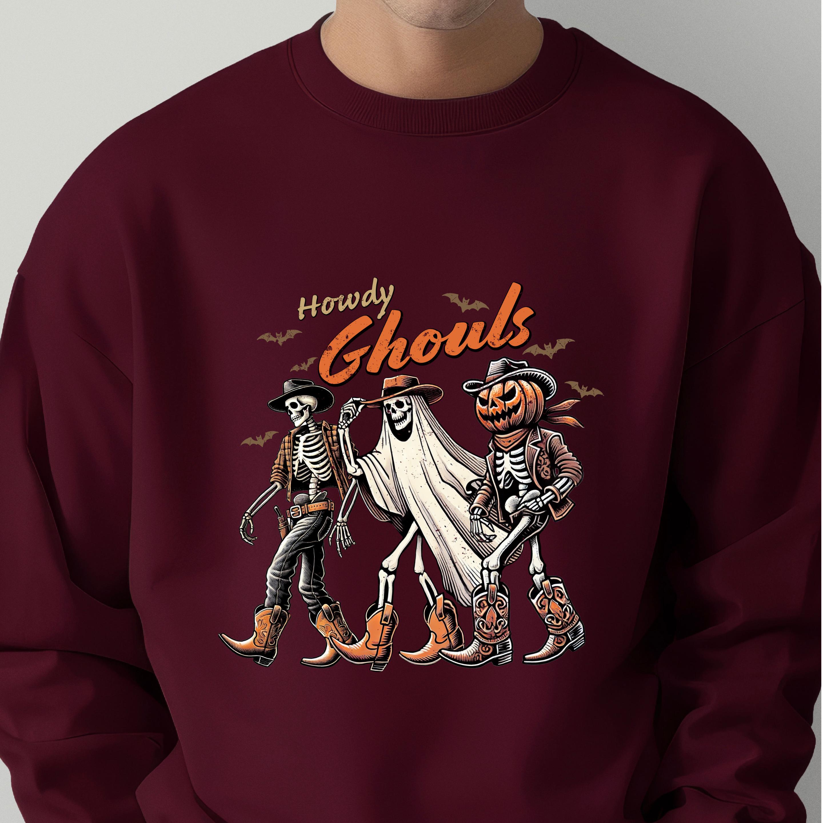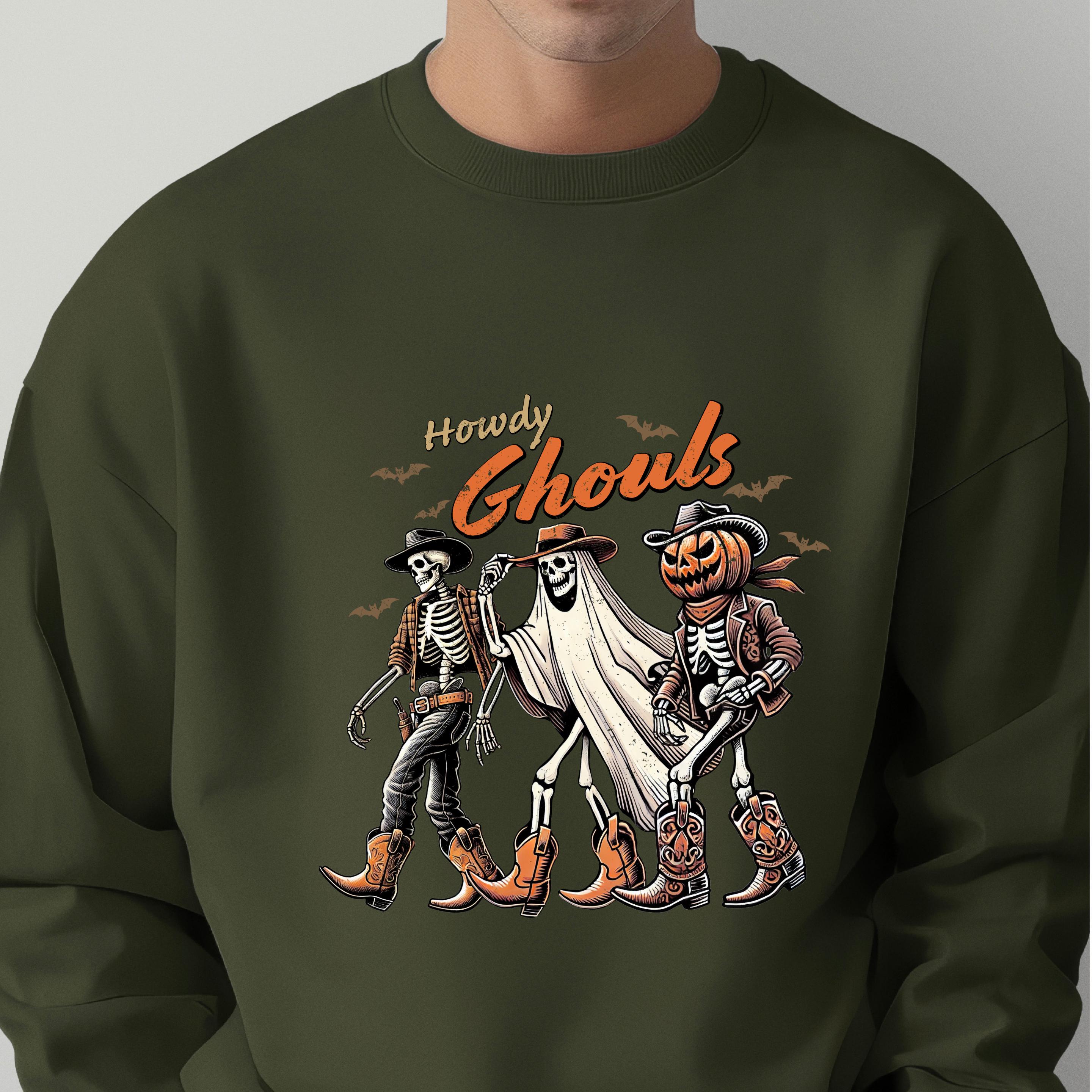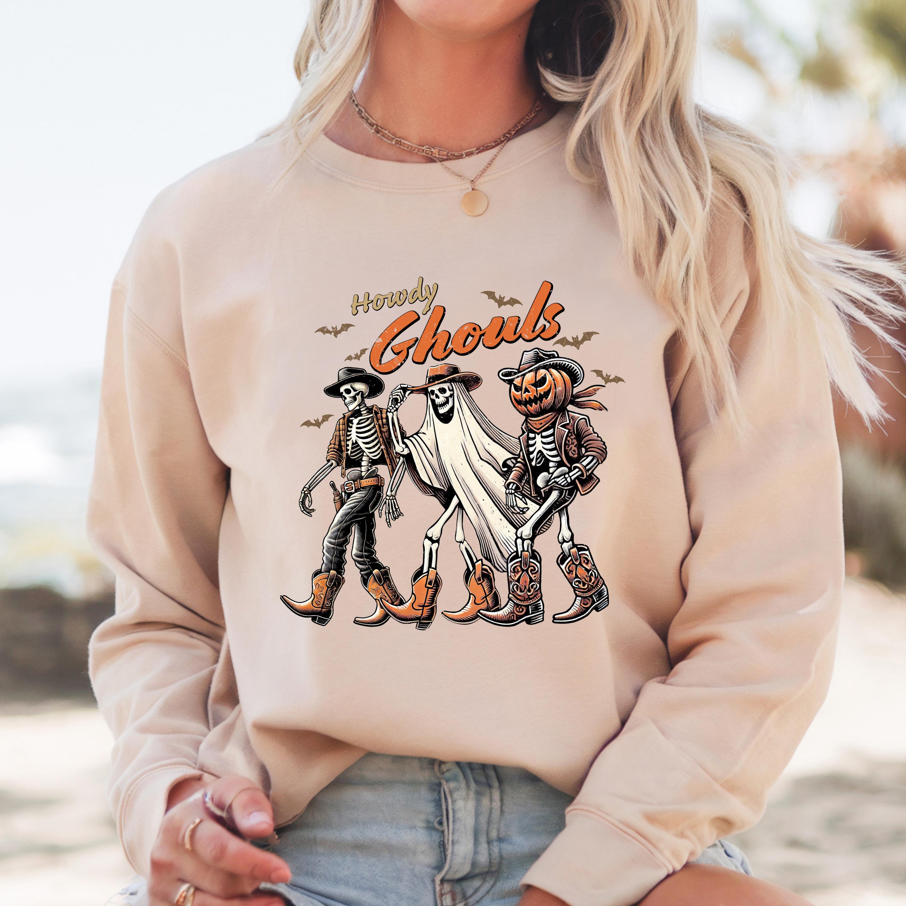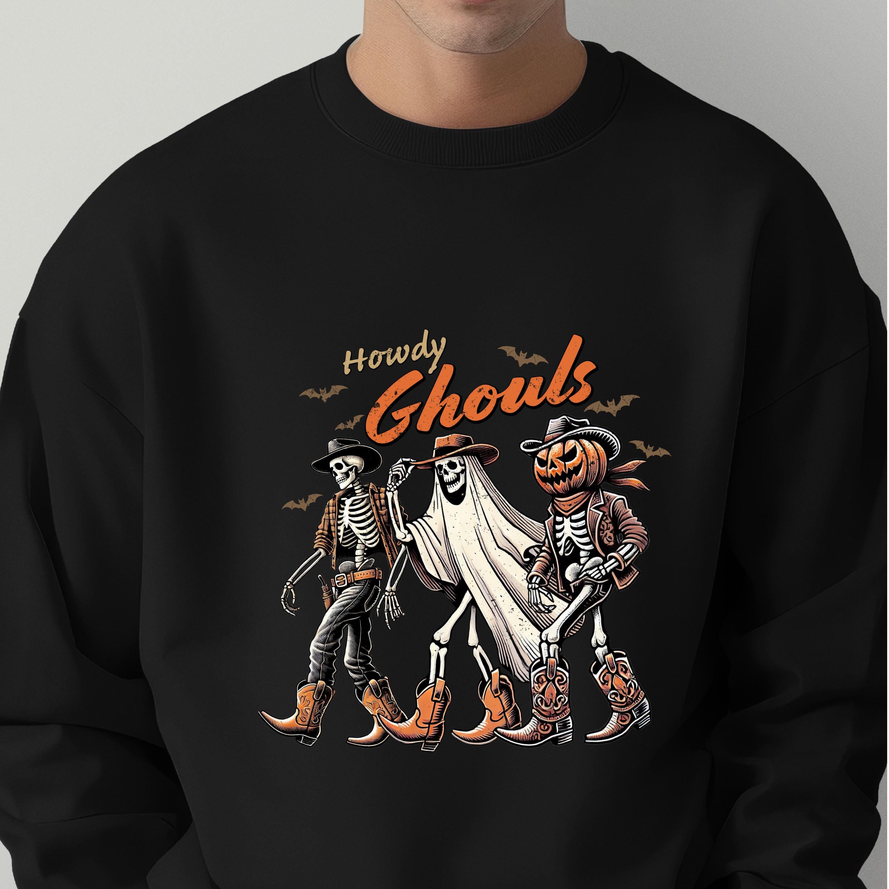 Western Halloween Unisex Sweatshirt: Howdy Ghouls T shirts, Cowboy Ghouls Team Hoodies 🧵 Product Features Comfort Colors 1717 : -The Comfort Colors 1717 tee is made with medium fabric (6.1 oz/yd² (206.8 g/m²)) consisting of high quality, 100% ring-spun US cotton for long-lasting comfort. - The relaxed fit keeps the wearer comfy in both casual and semi-formal settings while the crew neckline delivers that classic, neat style which makes it perfect for accessorizing. -All Comfort Colors 1717 shirts feature pre-shrunk cotton for size retention and a signature sewn-in twill label. -Made using 100% US cotton that is ethically grown and harvested.