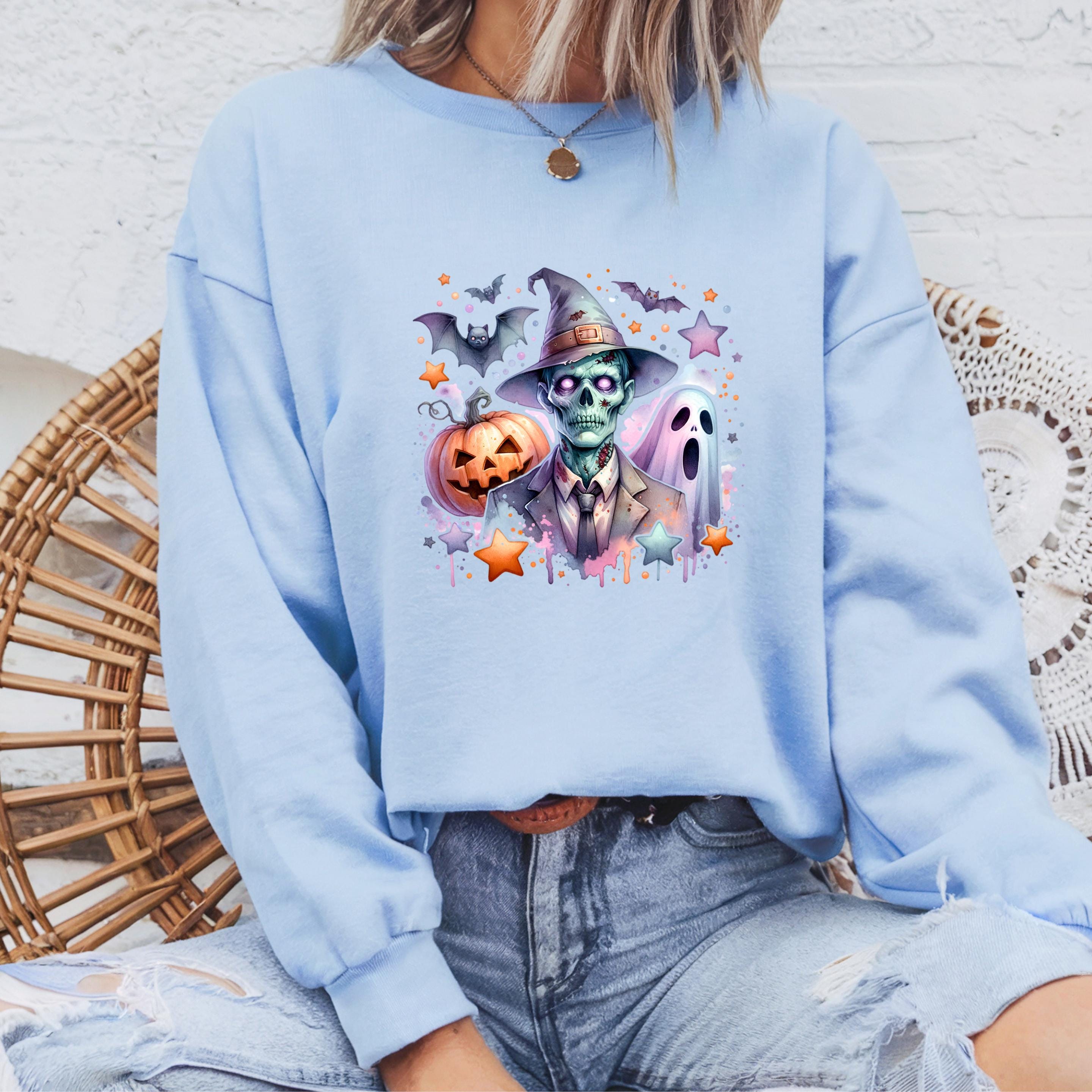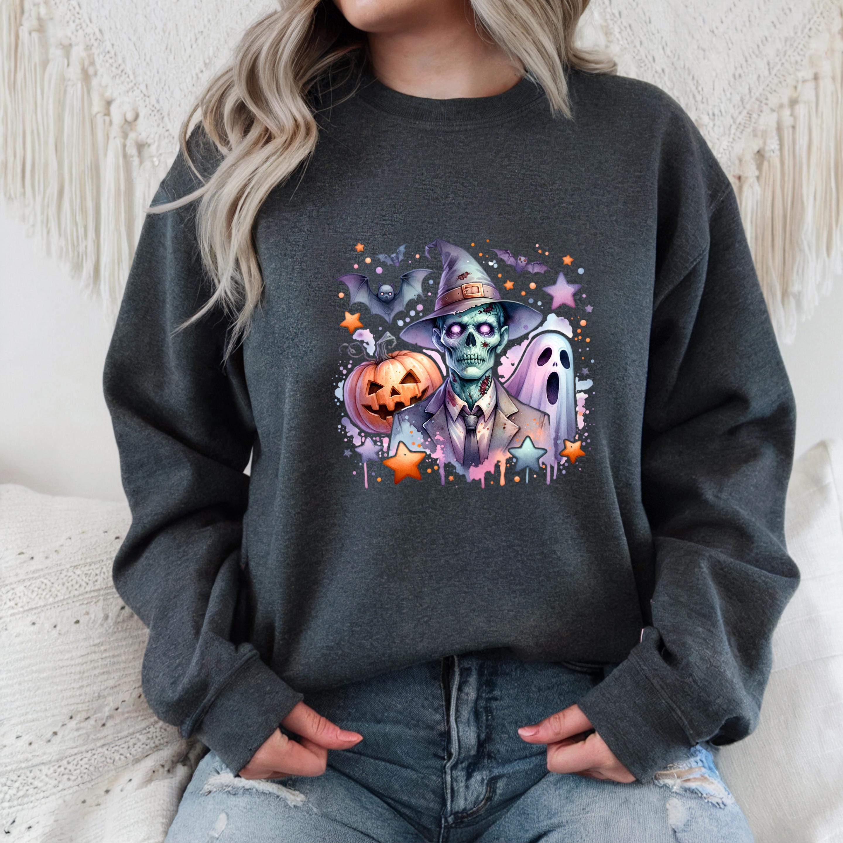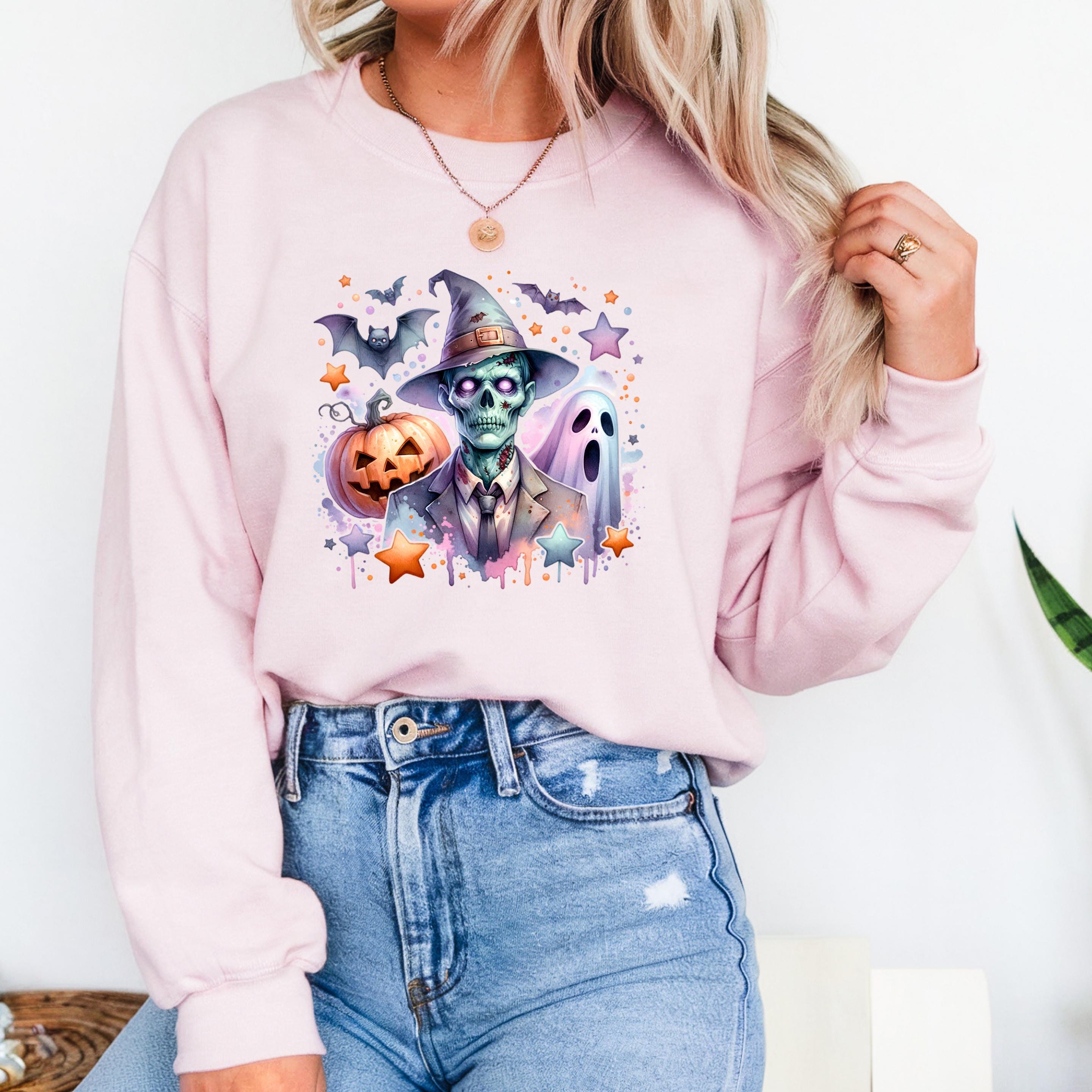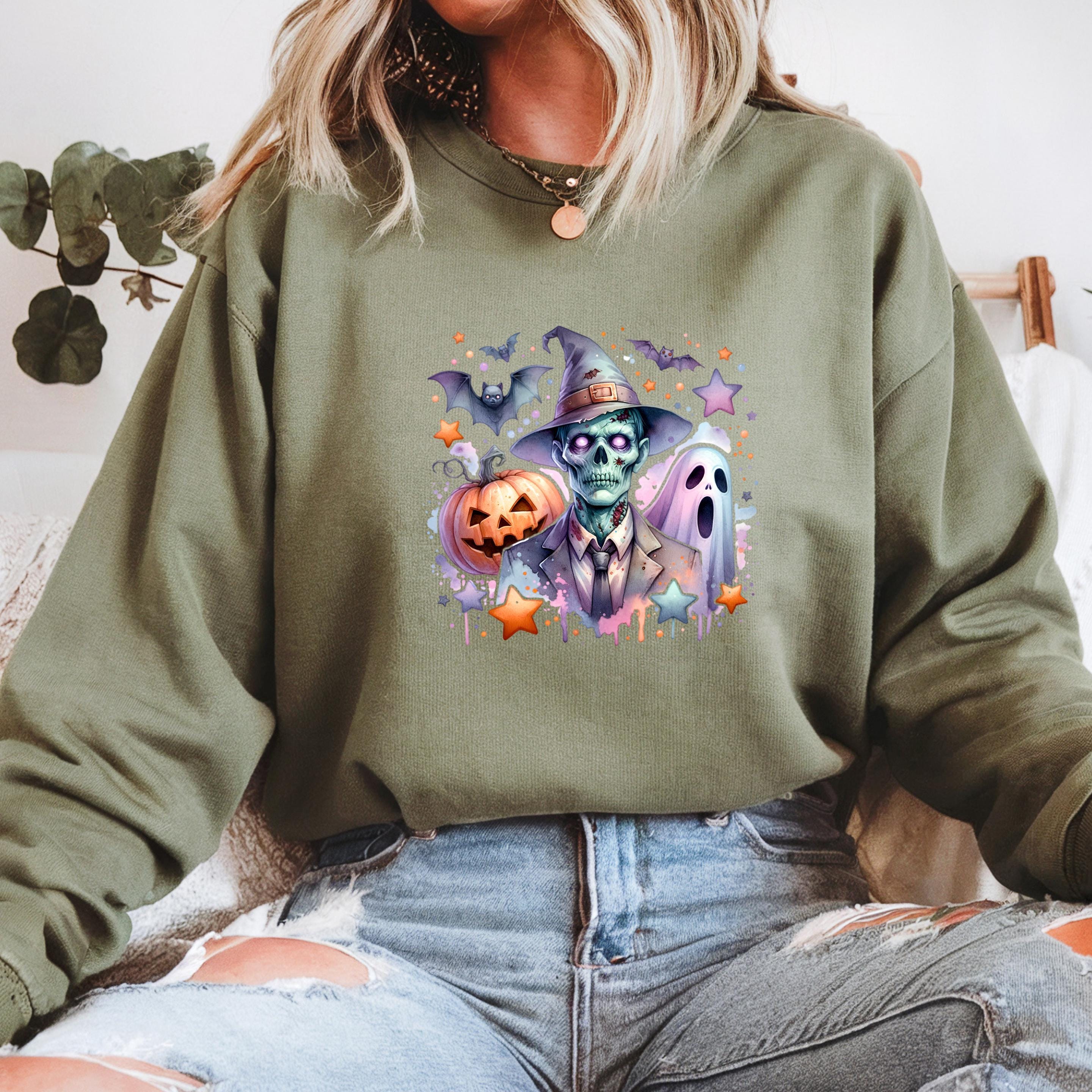 Coquette Halloween Sweatshirt: Iridescent Zombie- Ghost-Pumpkin Hoodie 🧵 Product Features: This high-quality unisex t-shirt is made from 100% ring-spun cotton. It’s soft, breathable, and built to last – perfect for everyday wear or special occasions. Printed using eco-friendly, water-based inks that are skin-safe and vibrant for long-term use.