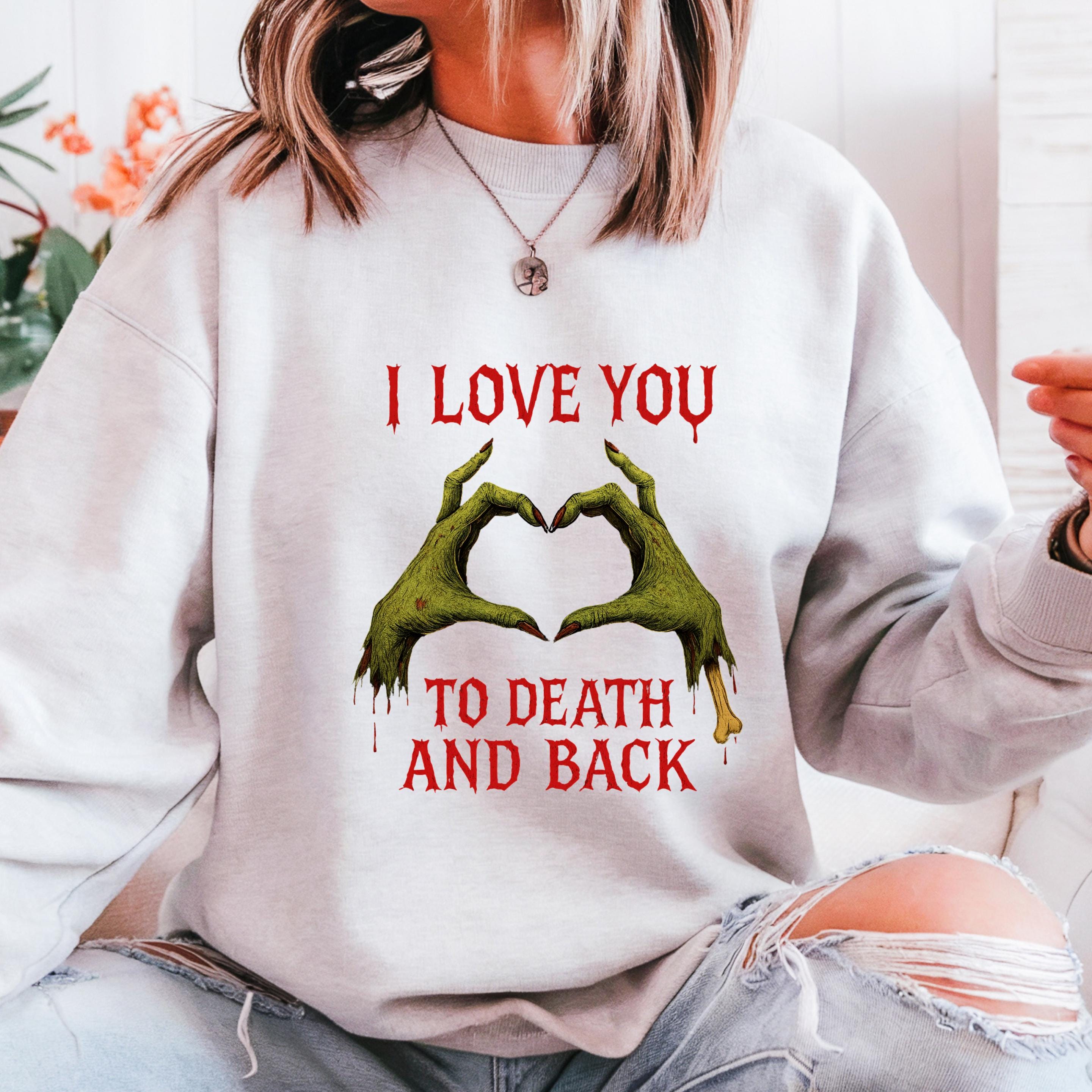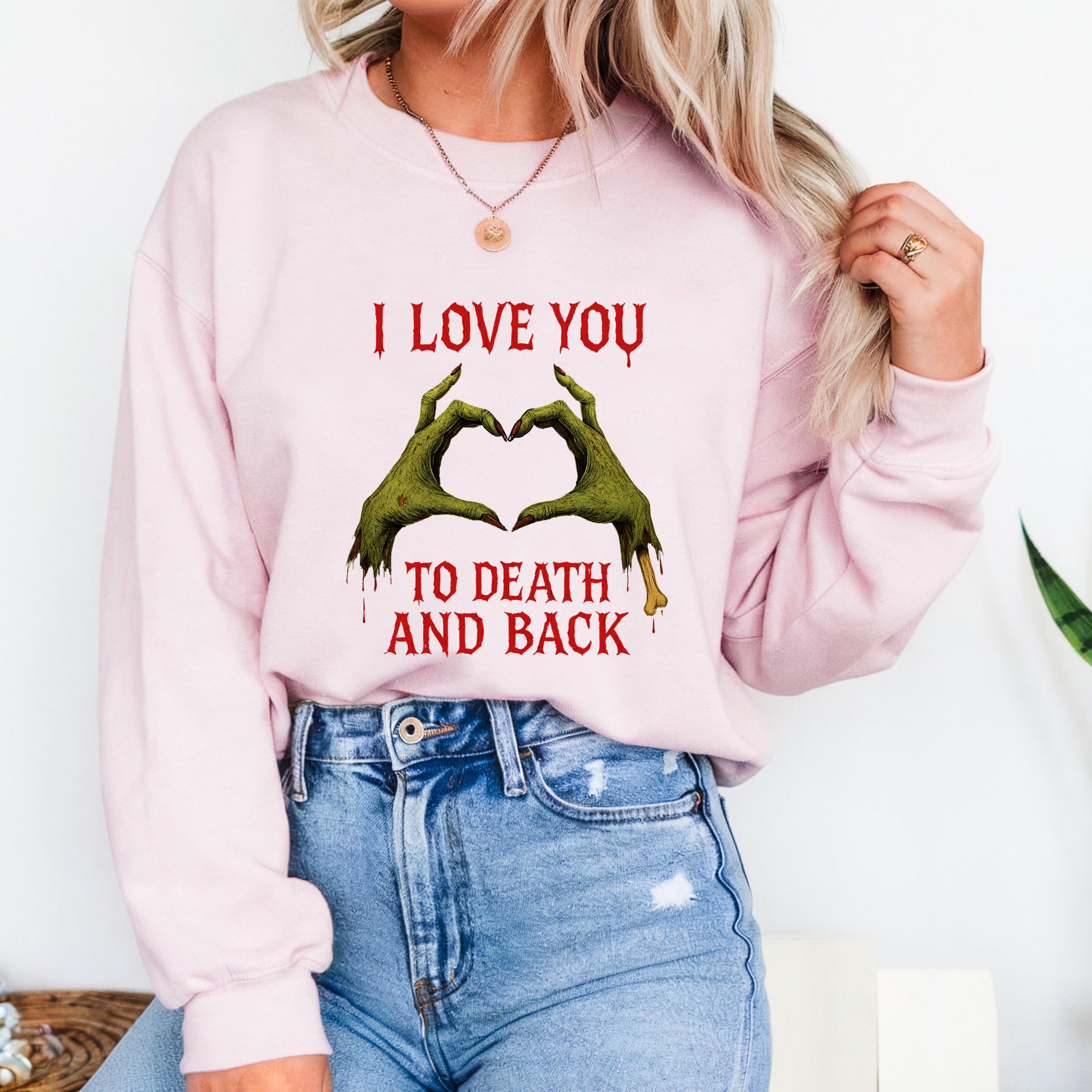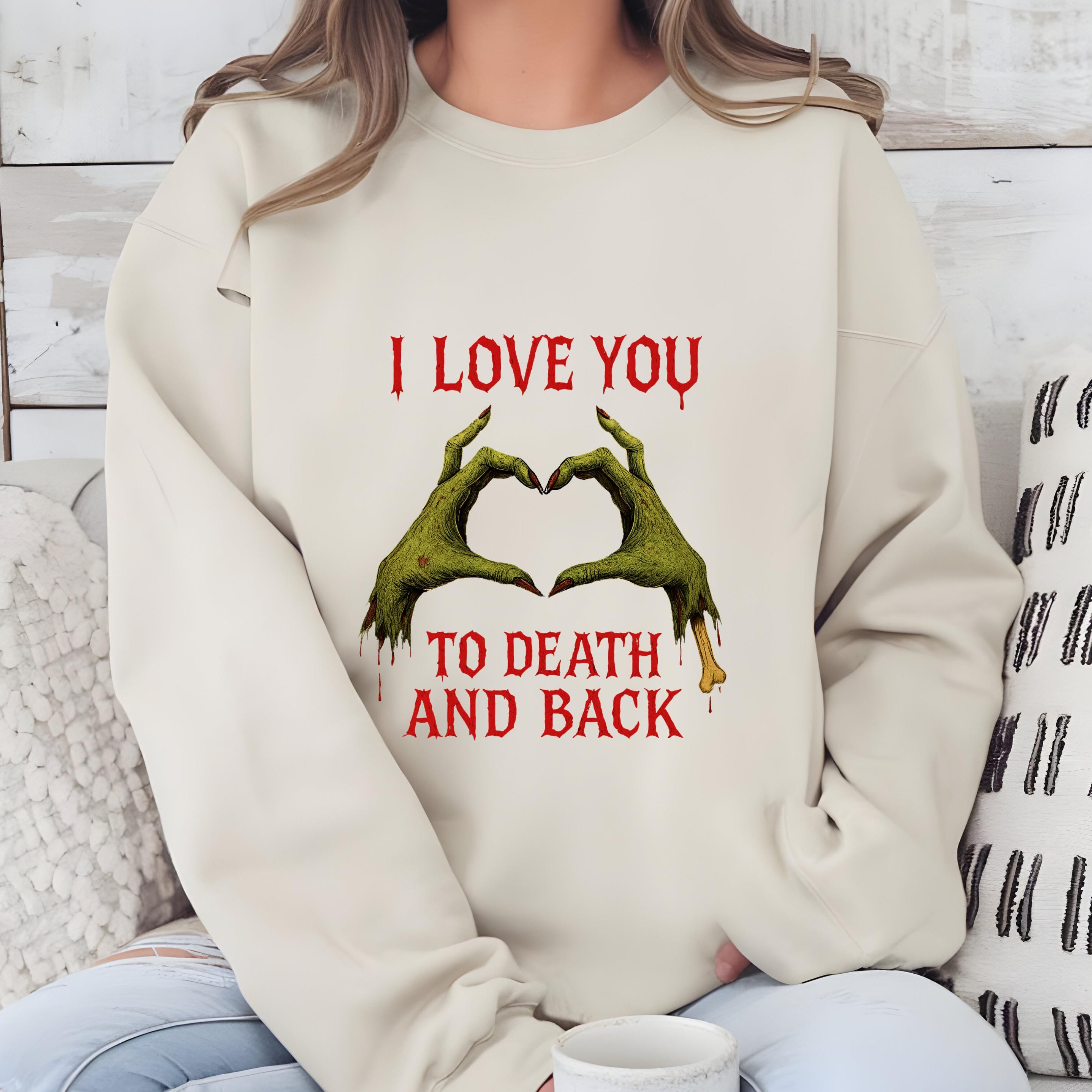 Zombie Puns One Liners Sweatshirt: Love u to death and back shirt 🧵 Product Features Comfort Colors 1717 : -The Comfort Colors 1717 tee is made with medium fabric (6.1 oz/yd² (206.8 g/m²)) consisting of high quality, 100% ring-spun US cotton for long-lasting comfort. - The relaxed fit keeps the wearer comfy in both casual and semi-formal settings while the crew neckline delivers that classic, neat style which makes it perfect for accessorizing. -All Comfort Colors 1717 shirts feature pre-shrunk cotton for size retention and a signature sewn-in twill label. -Made using 100% US cotton that is ethically grown and harvested.