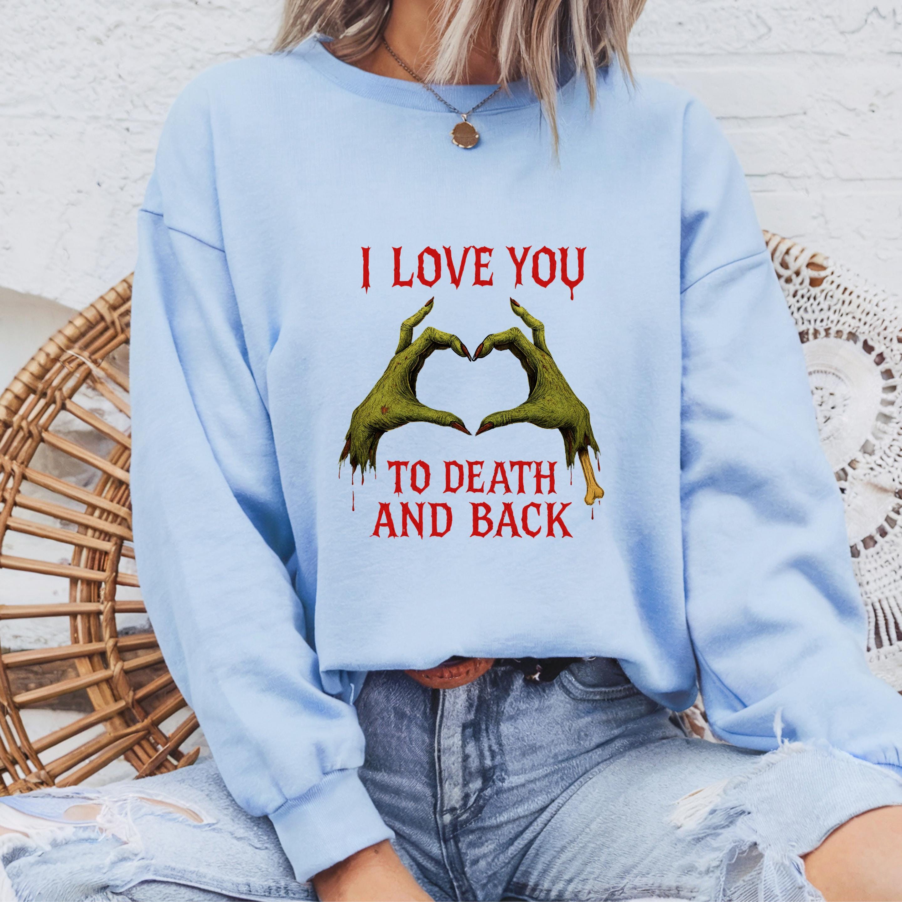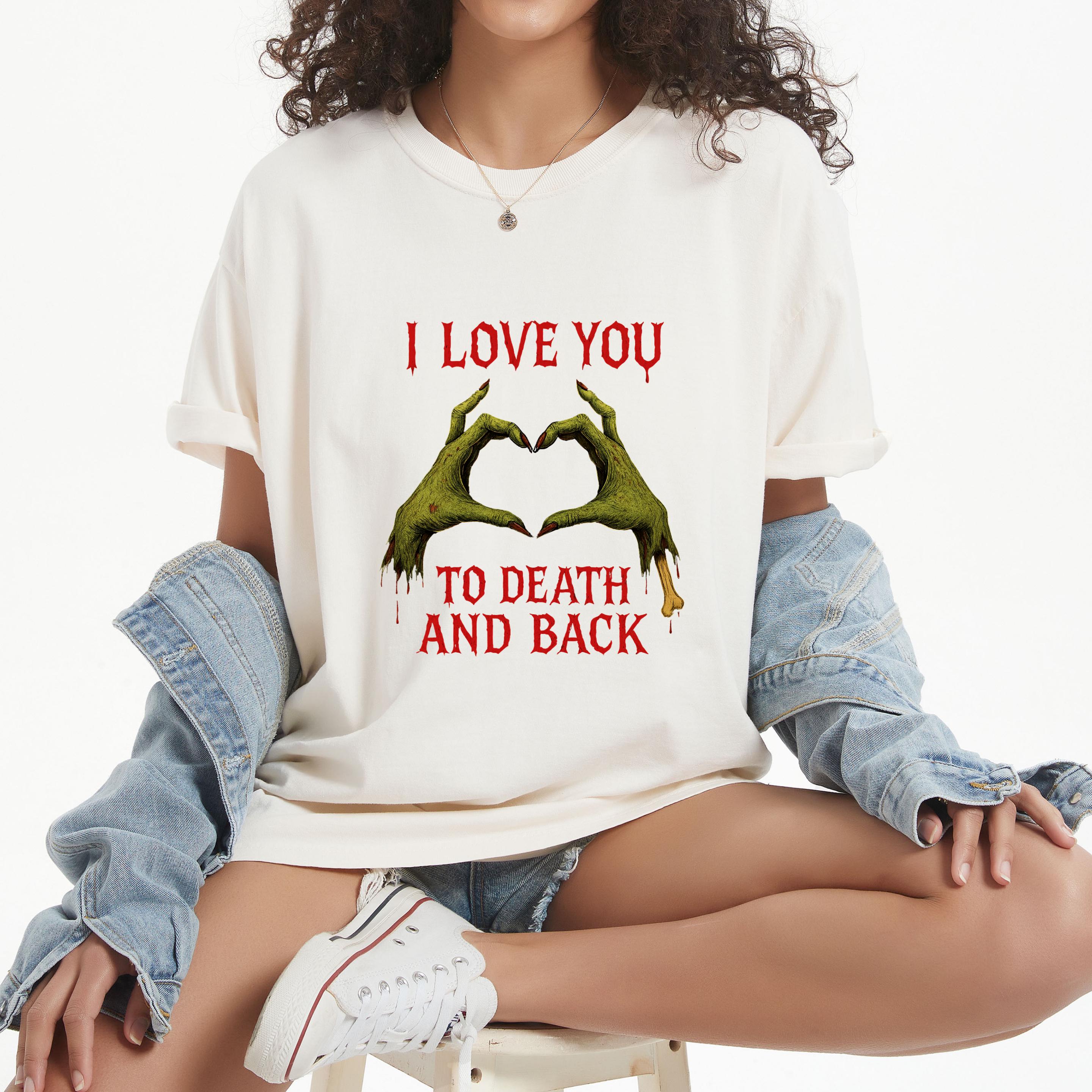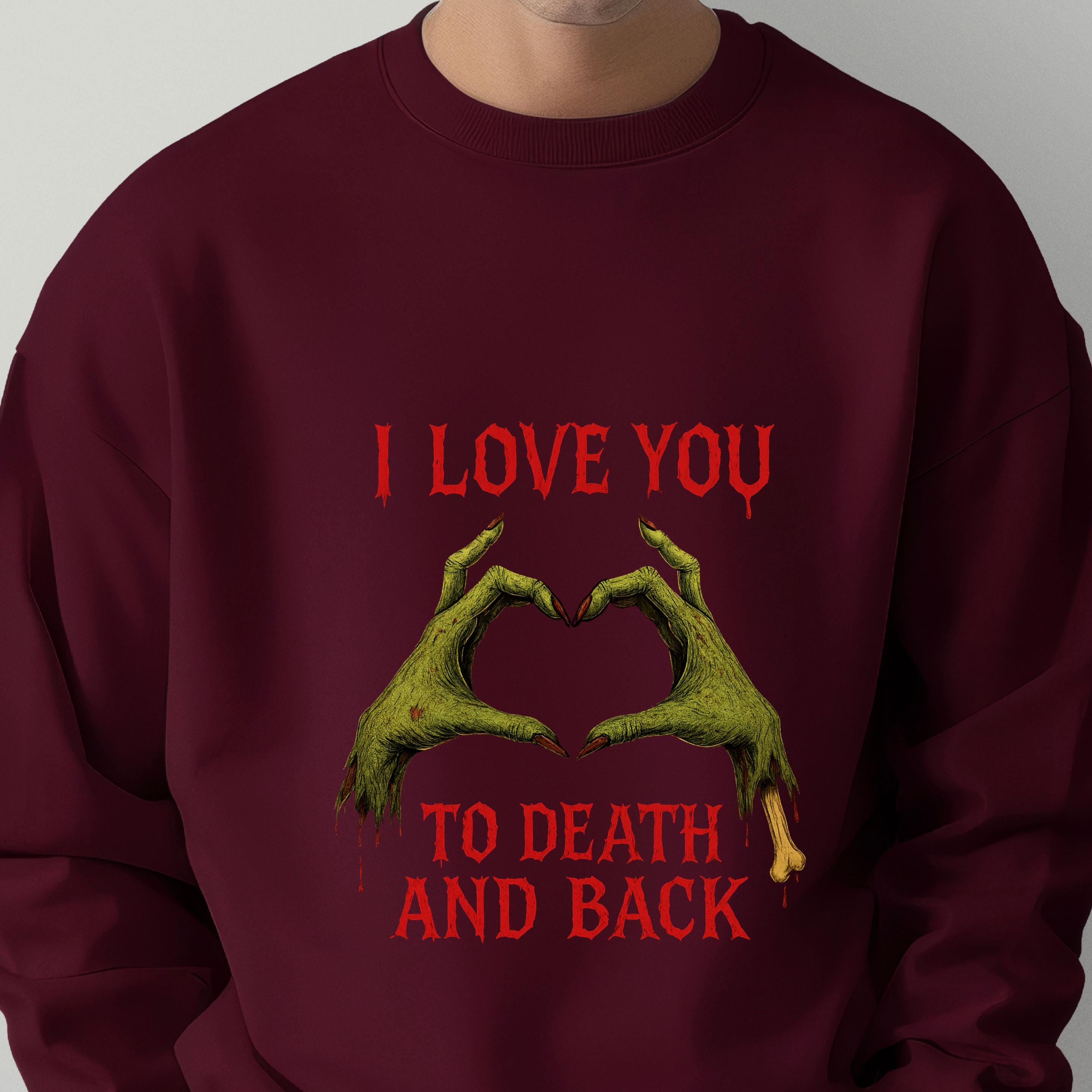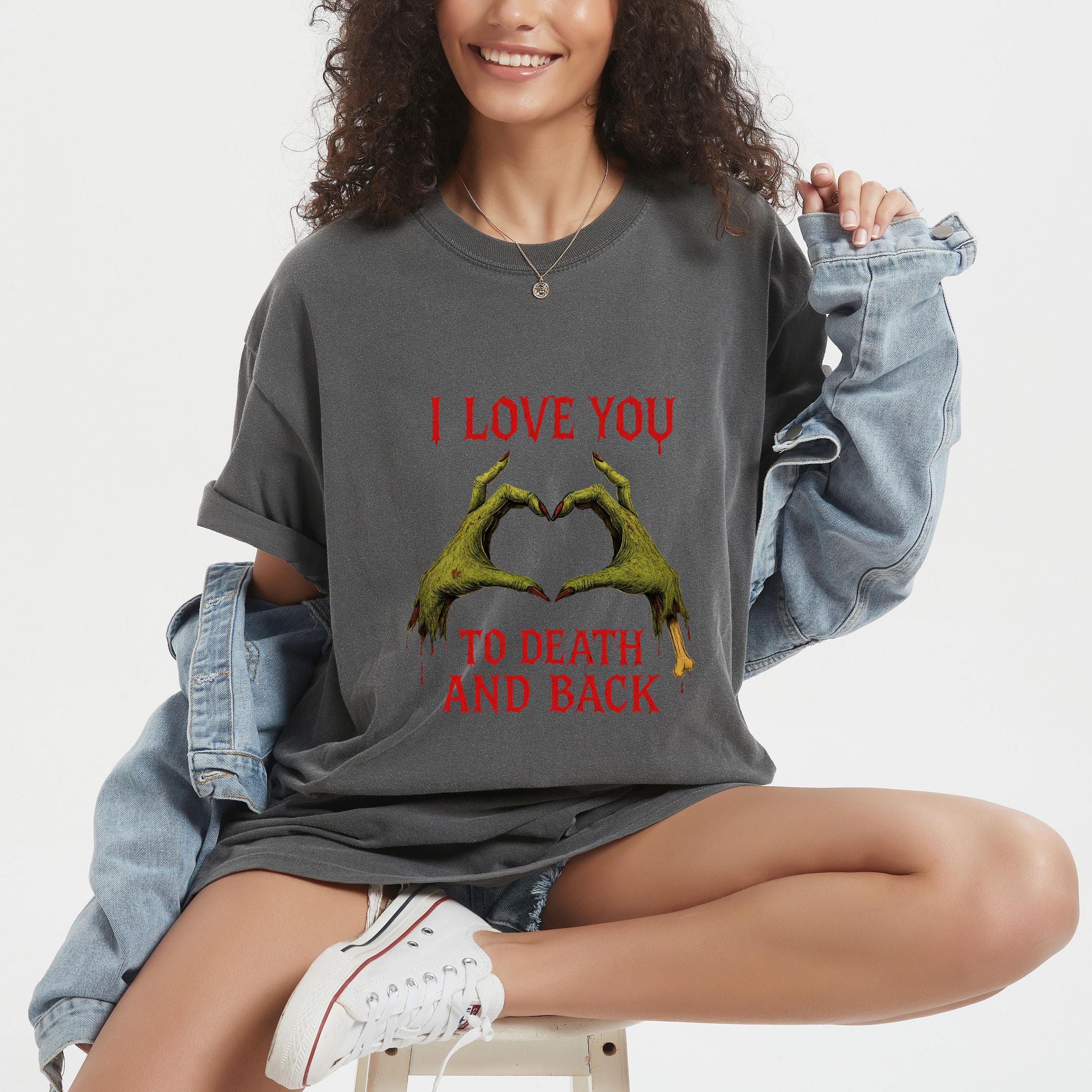 Zombie Puns One Liners Sweatshirt: Love u to death and back shirt 🧵 Product Features Comfort Colors 1717 : -The Comfort Colors 1717 tee is made with medium fabric (6.1 oz/yd² (206.8 g/m²)) consisting of high quality, 100% ring-spun US cotton for long-lasting comfort. - The relaxed fit keeps the wearer comfy in both casual and semi-formal settings while the crew neckline delivers that classic, neat style which makes it perfect for accessorizing. -All Comfort Colors 1717 shirts feature pre-shrunk cotton for size retention and a signature sewn-in twill label. -Made using 100% US cotton that is ethically grown and harvested.