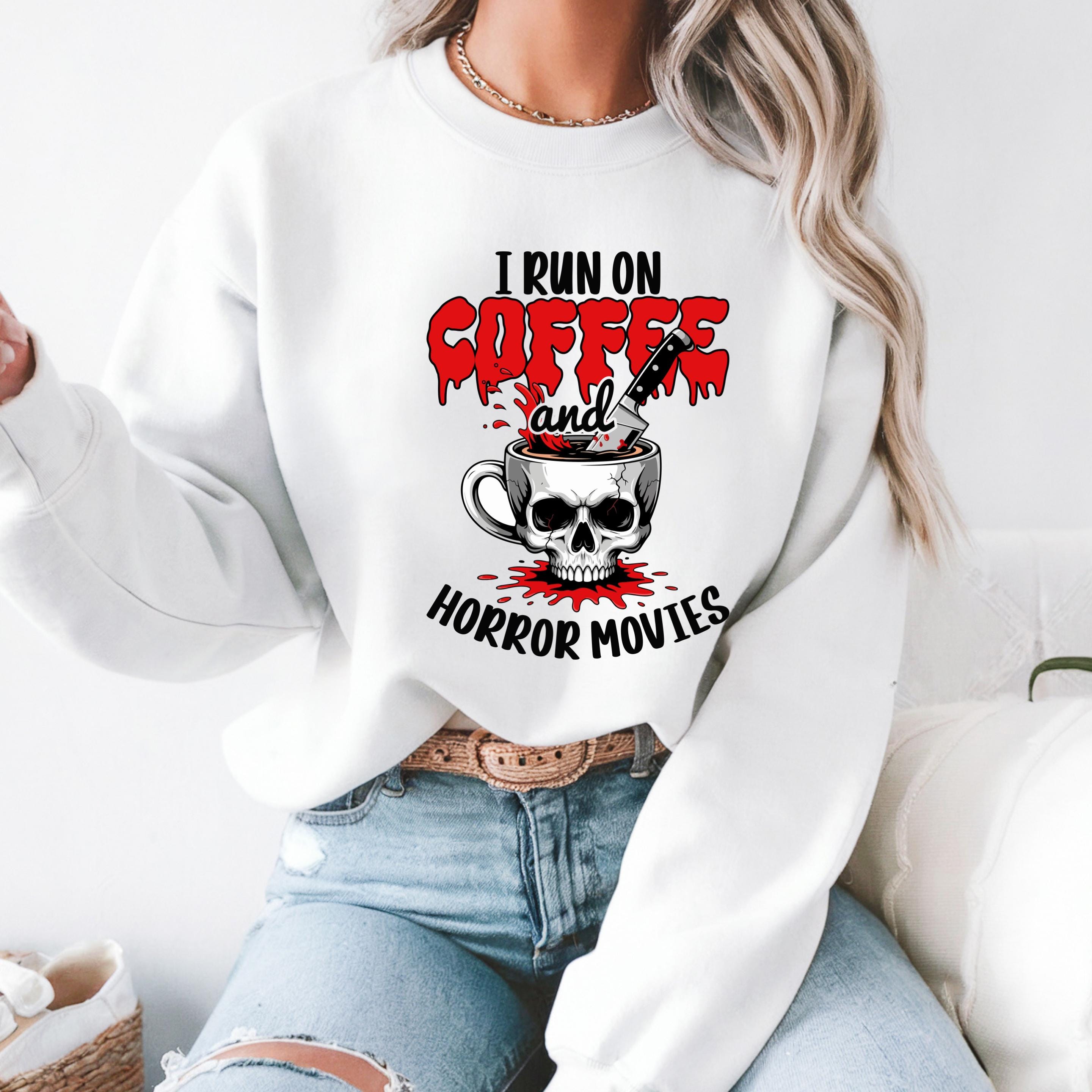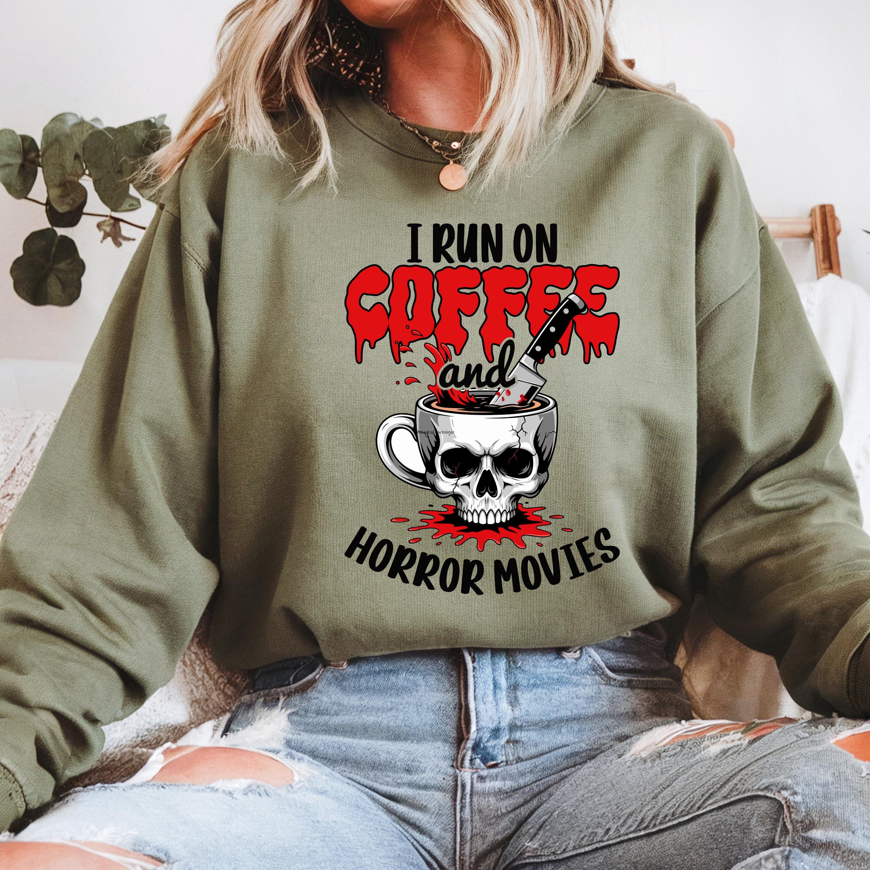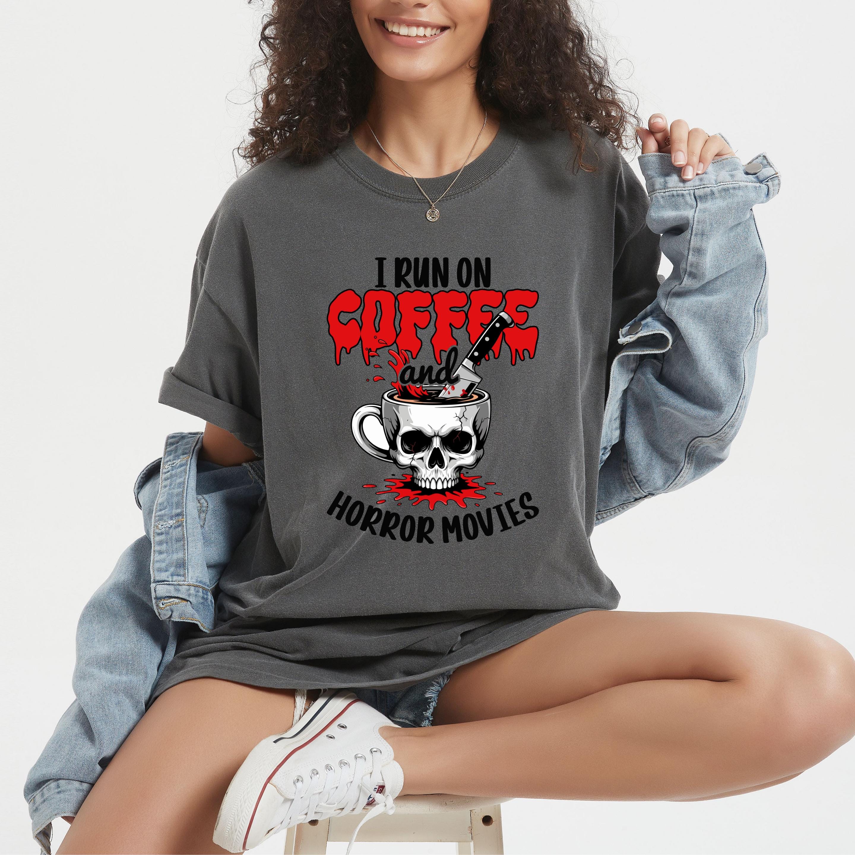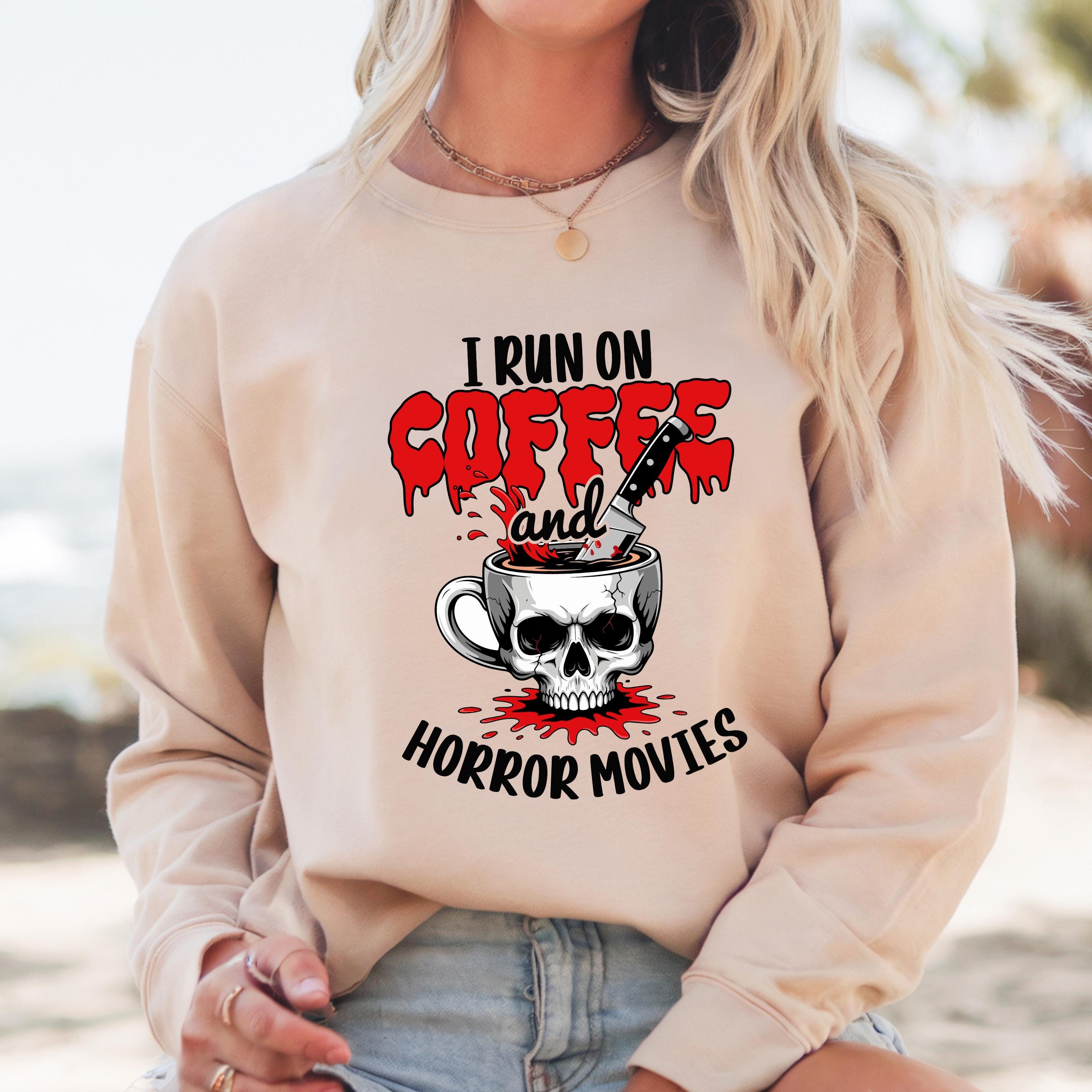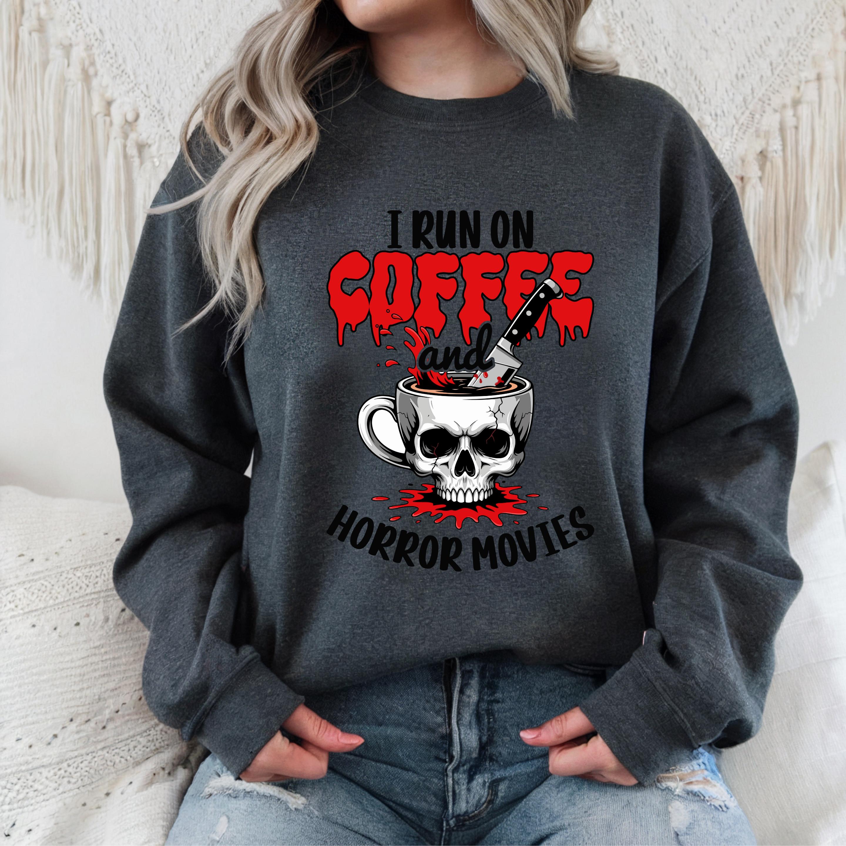 Run On Coffee and Horror Movies Sweatshirt: Halloween Skull Tee, Halloween Graphic Hoodies 🧵 Product Features Comfort Colors 1717 : -The Comfort Colors 1717 tee is made with medium fabric (6.1 oz/yd² (206.8 g/m²)) consisting of high quality, 100% ring-spun US cotton for long-lasting comfort. - The relaxed fit keeps the wearer comfy in both casual and semi-formal settings while the crew neckline delivers that classic, neat style which makes it perfect for accessorizing. -All Comfort Colors 1717 shirts feature pre-shrunk cotton for size retention and a signature sewn-in twill label. -Made using 100% US cotton that is ethically grown and harvested.