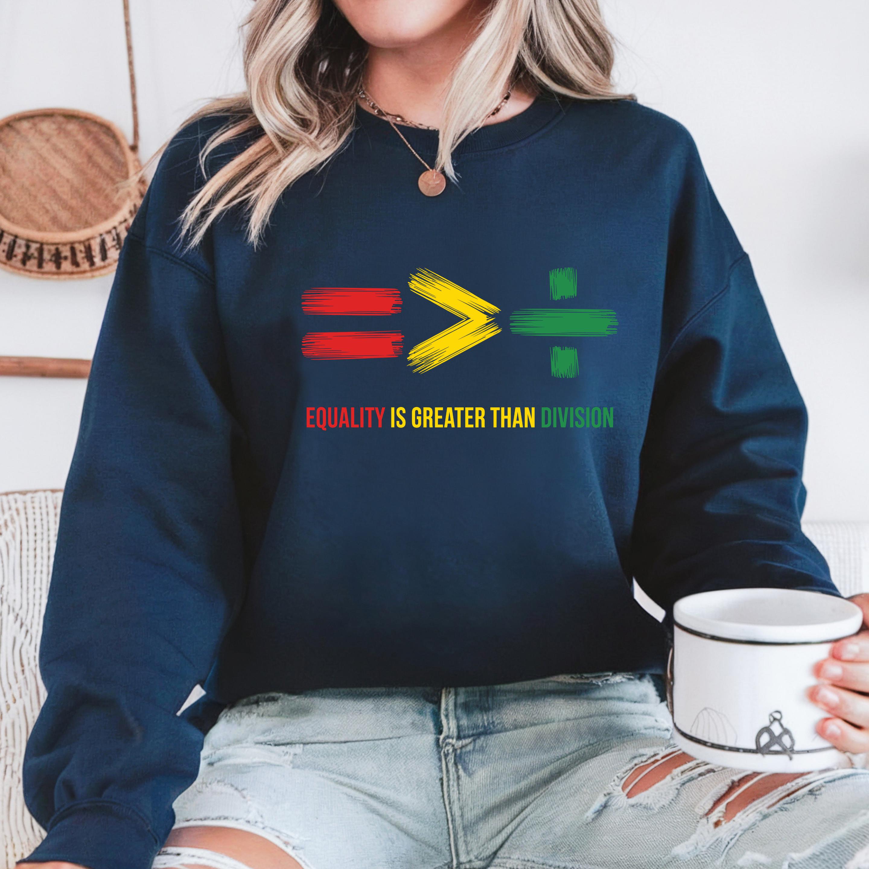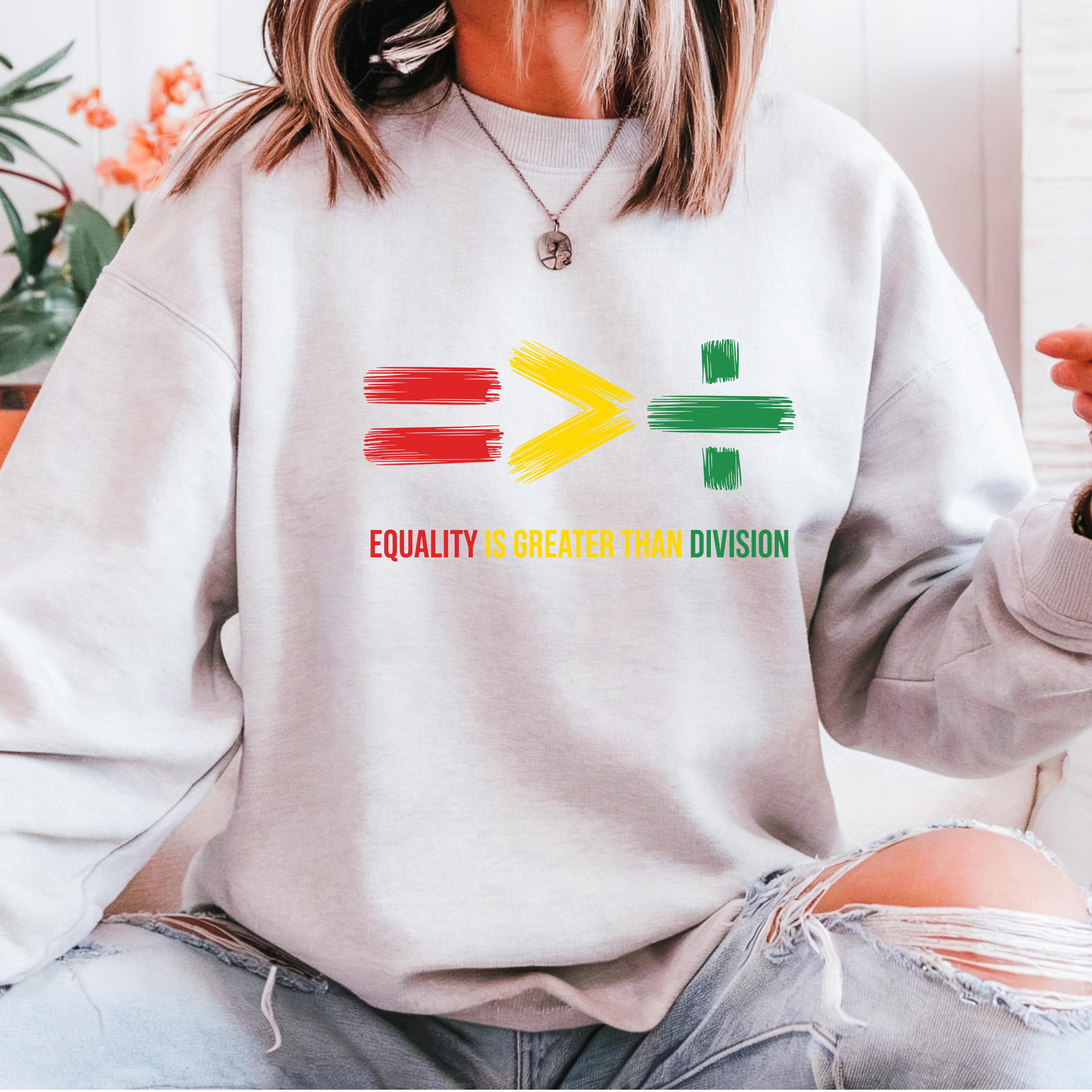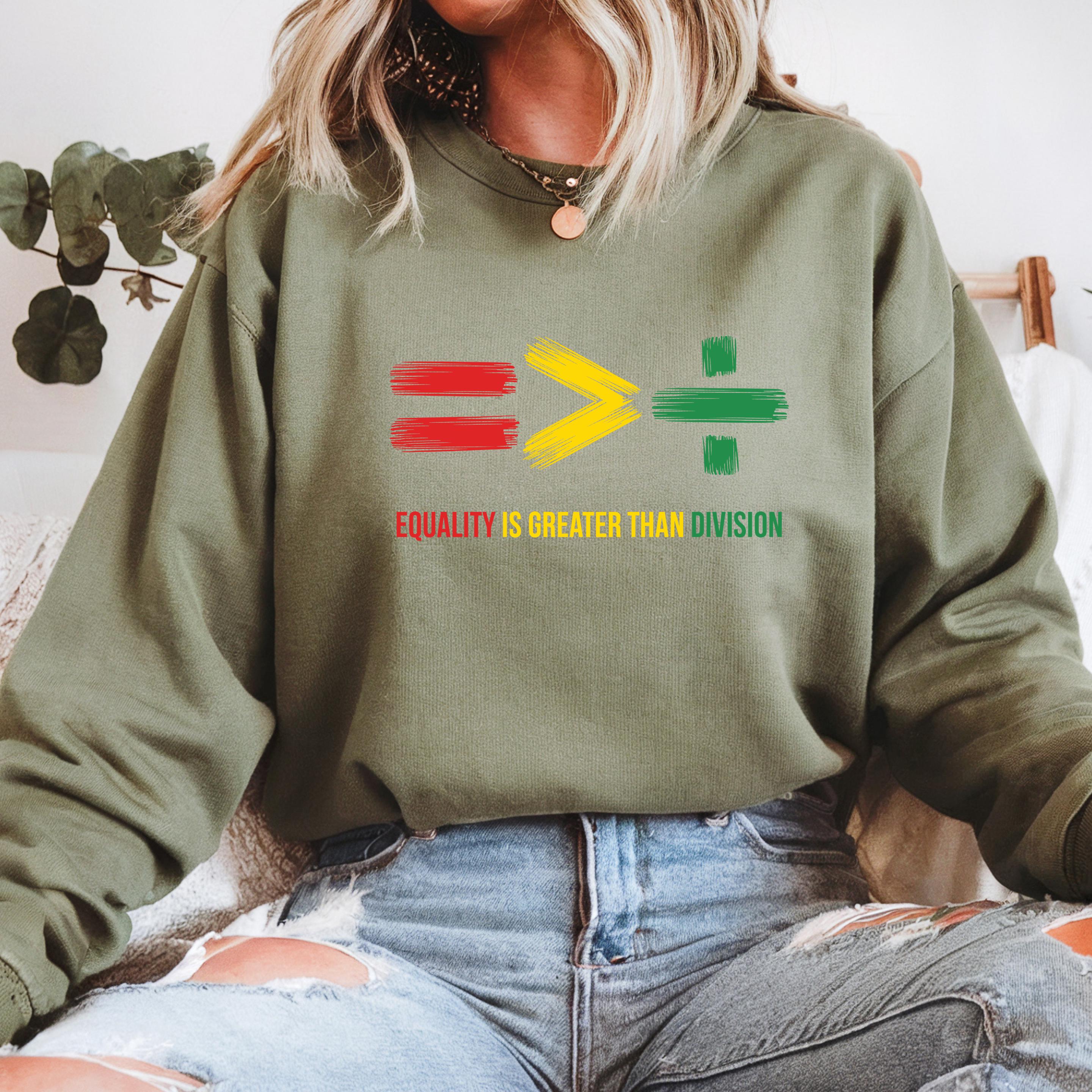 Equality Is Greater Than Division Sweatshirt: Human Rights Hoodie and Comfort Colors T-shirt 🧵 Product Features Comfort Colors 1717 : -The Comfort Colors 1717 tee is made with medium fabric (6.1 oz/yd² (206.8 g/m²)) consisting of high quality, 100% ring-spun US cotton for long-lasting comfort. - The relaxed fit keeps the wearer comfy in both casual and semi-formal settings while the crew neckline delivers that classic, neat style which makes it perfect for accessorizing. -All Comfort Colors 1717 shirts feature pre-shrunk cotton for size retention and a signature sewn-in twill label. -Made using 100% US cotton that is ethically grown and harvested.