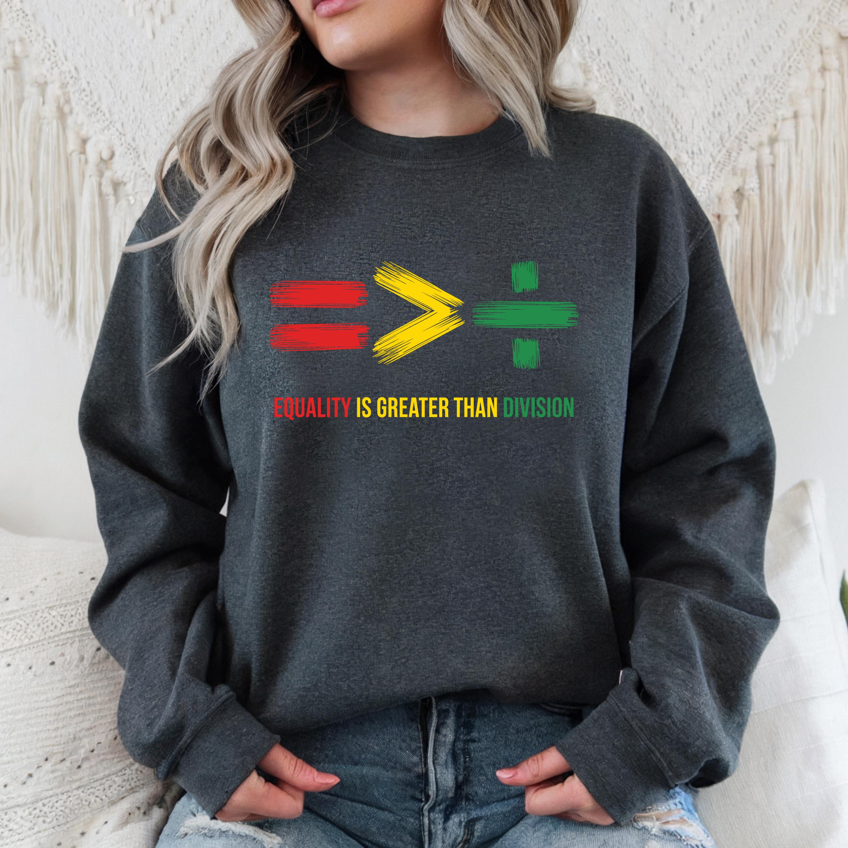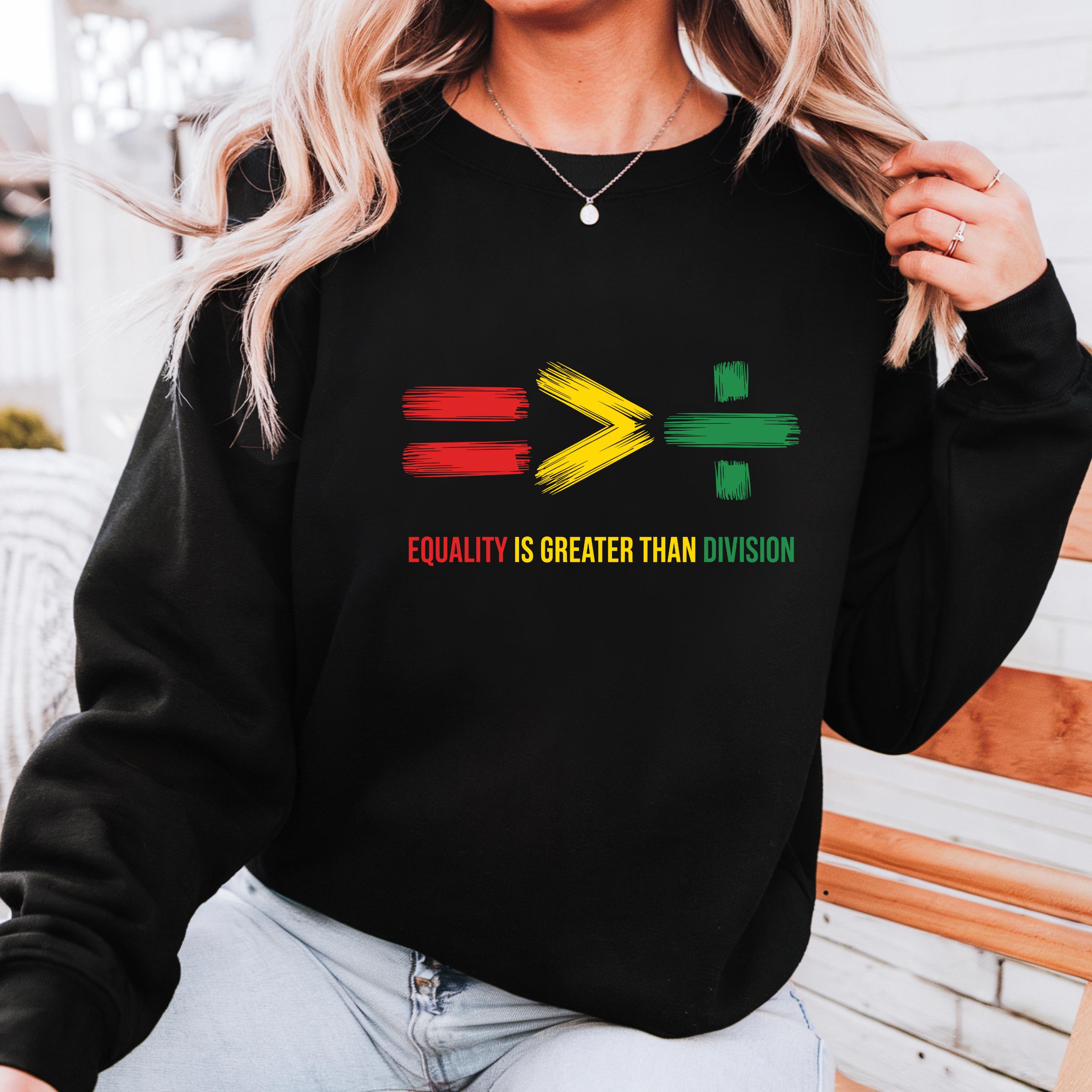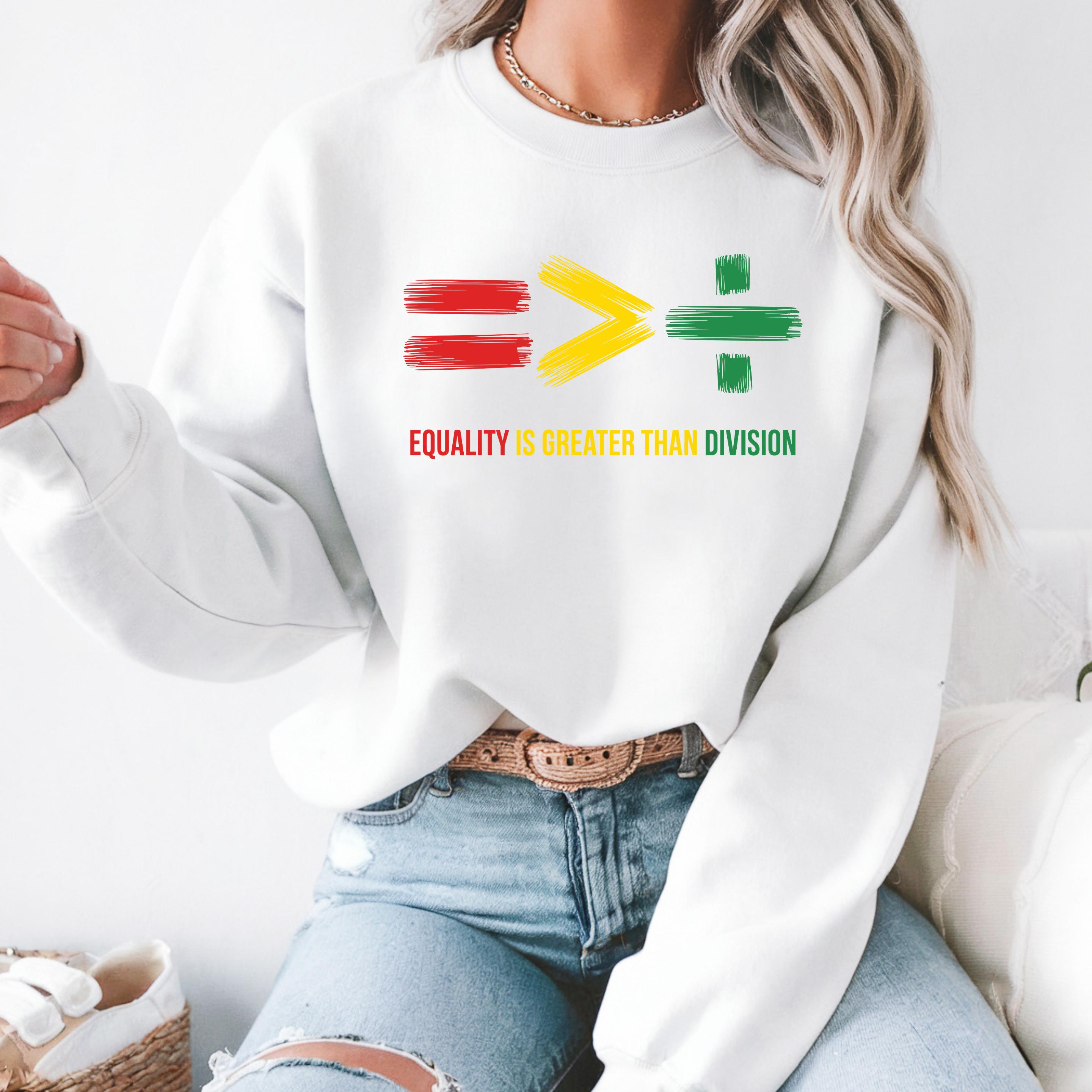 Equality Is Greater Than Division Sweatshirt: Human Rights Hoodie and Comfort Colors T-shirt 🧵 Product Features Comfort Colors 1717 : -The Comfort Colors 1717 tee is made with medium fabric (6.1 oz/yd² (206.8 g/m²)) consisting of high quality, 100% ring-spun US cotton for long-lasting comfort. - The relaxed fit keeps the wearer comfy in both casual and semi-formal settings while the crew neckline delivers that classic, neat style which makes it perfect for accessorizing. -All Comfort Colors 1717 shirts feature pre-shrunk cotton for size retention and a signature sewn-in twill label. -Made using 100% US cotton that is ethically grown and harvested.