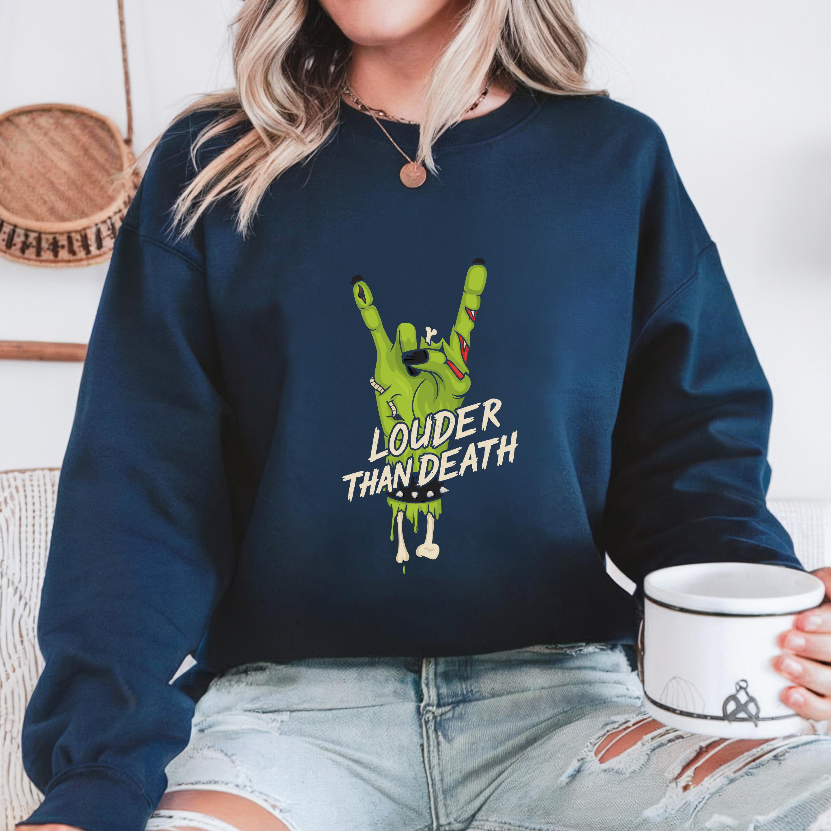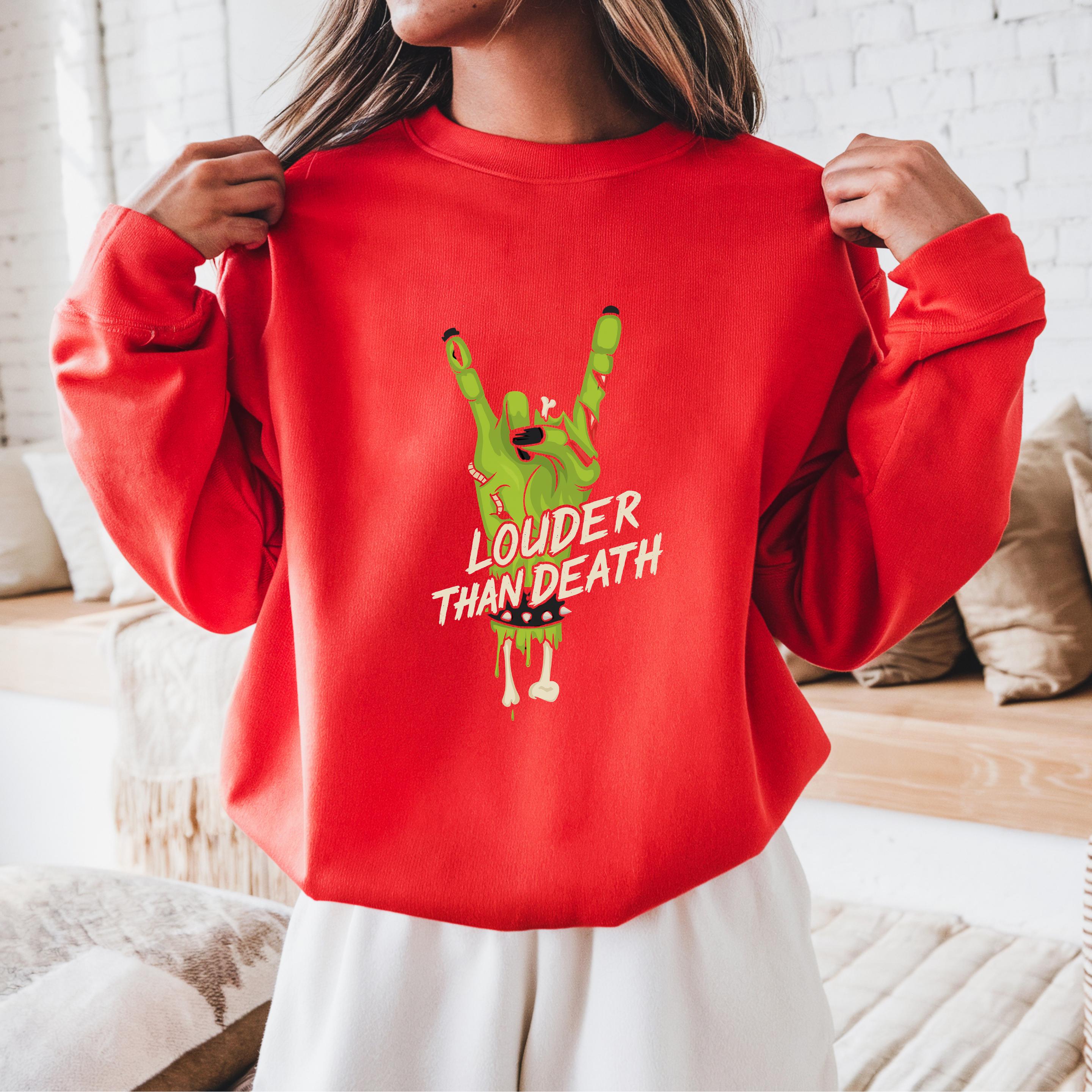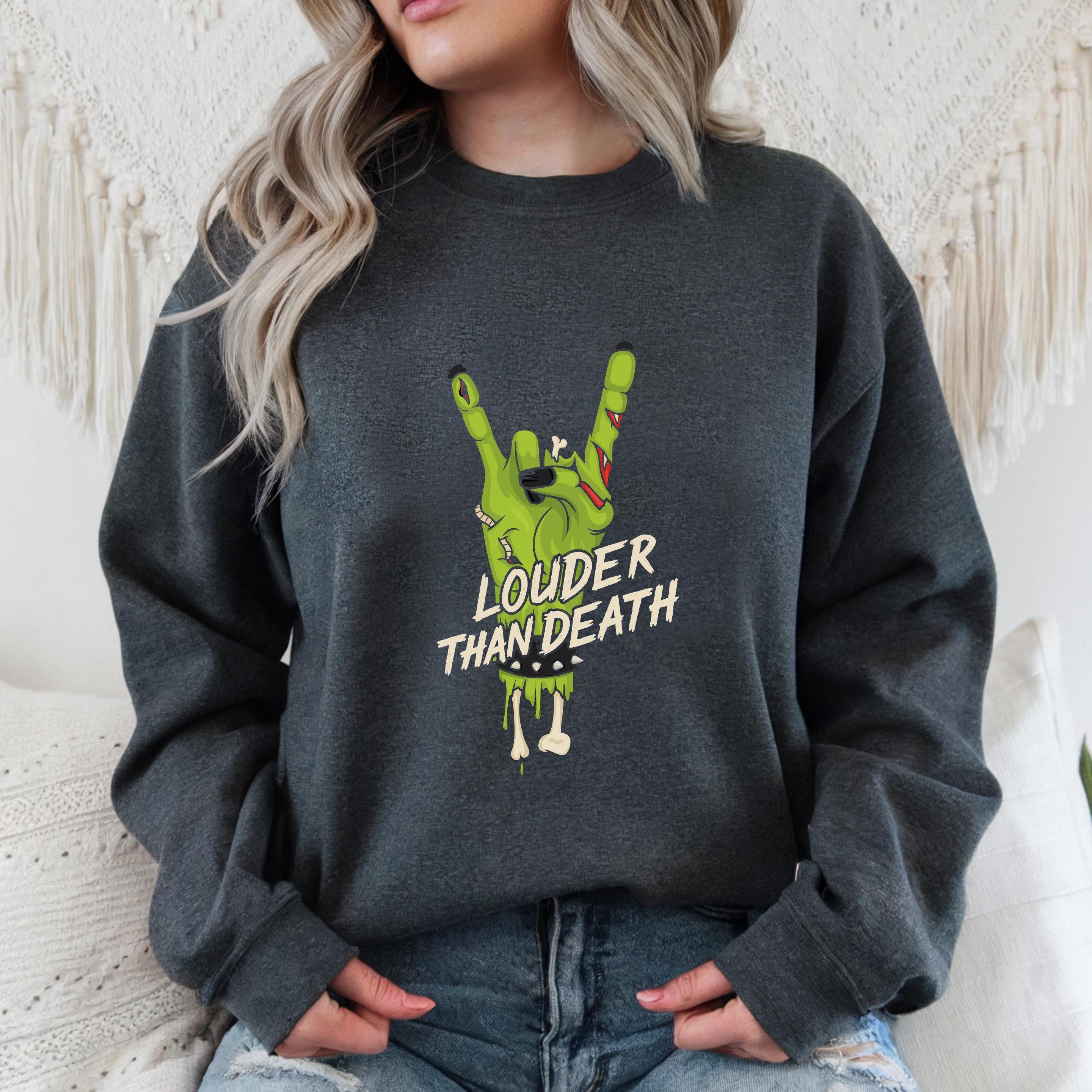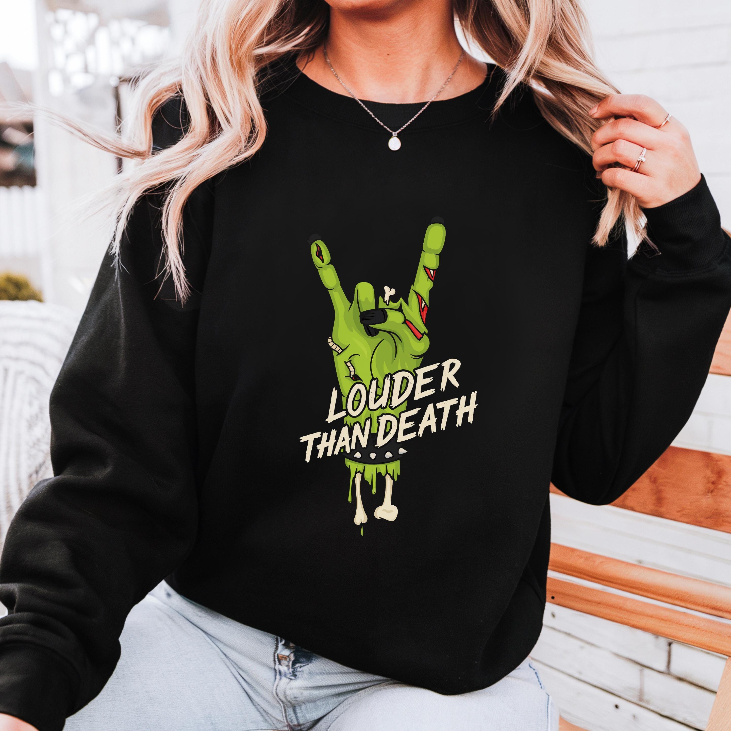 Zombie Hand Halloween Sweatshirt: Louder Than Death Unisex Hoodie and T-shirt 🧵 Product Features Comfort Colors 1717 : -The Comfort Colors 1717 tee is made with medium fabric (6.1 oz/yd² (206.8 g/m²)) consisting of high quality, 100% ring-spun US cotton for long-lasting comfort. - The relaxed fit keeps the wearer comfy in both casual and semi-formal settings while the crew neckline delivers that classic, neat style which makes it perfect for accessorizing. -All Comfort Colors 1717 shirts feature pre-shrunk cotton for size retention and a signature sewn-in twill label. -Made using 100% US cotton that is ethically grown and harvested.