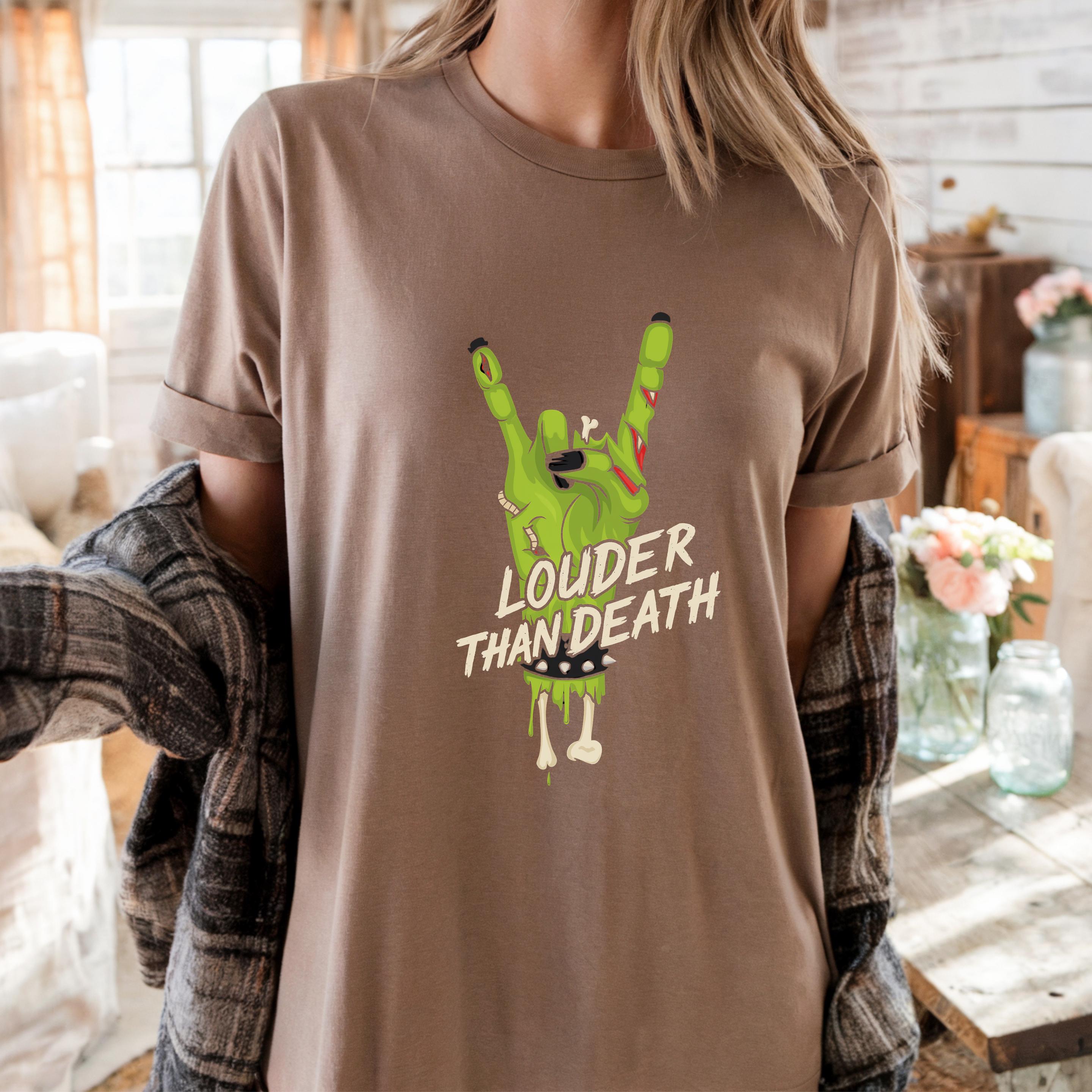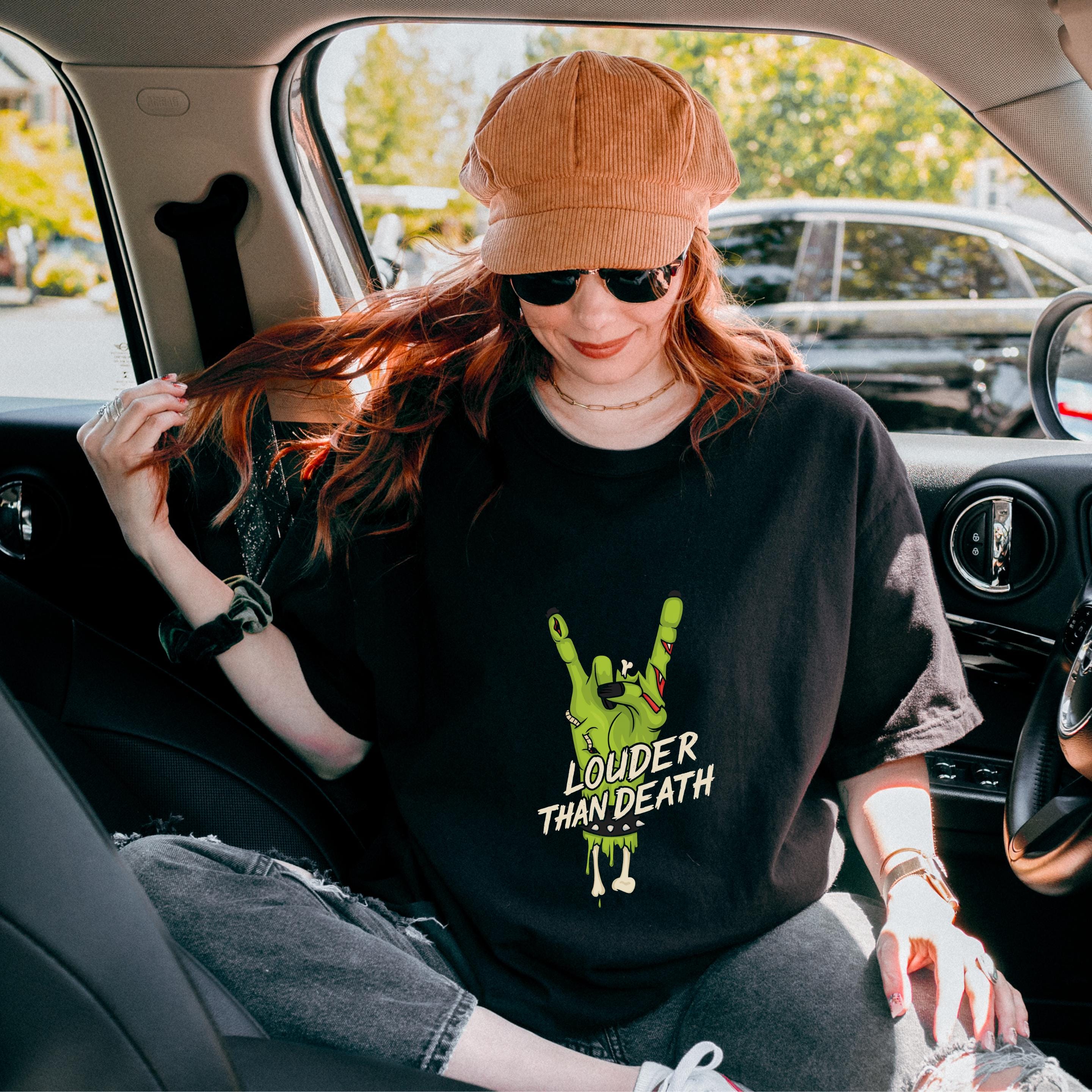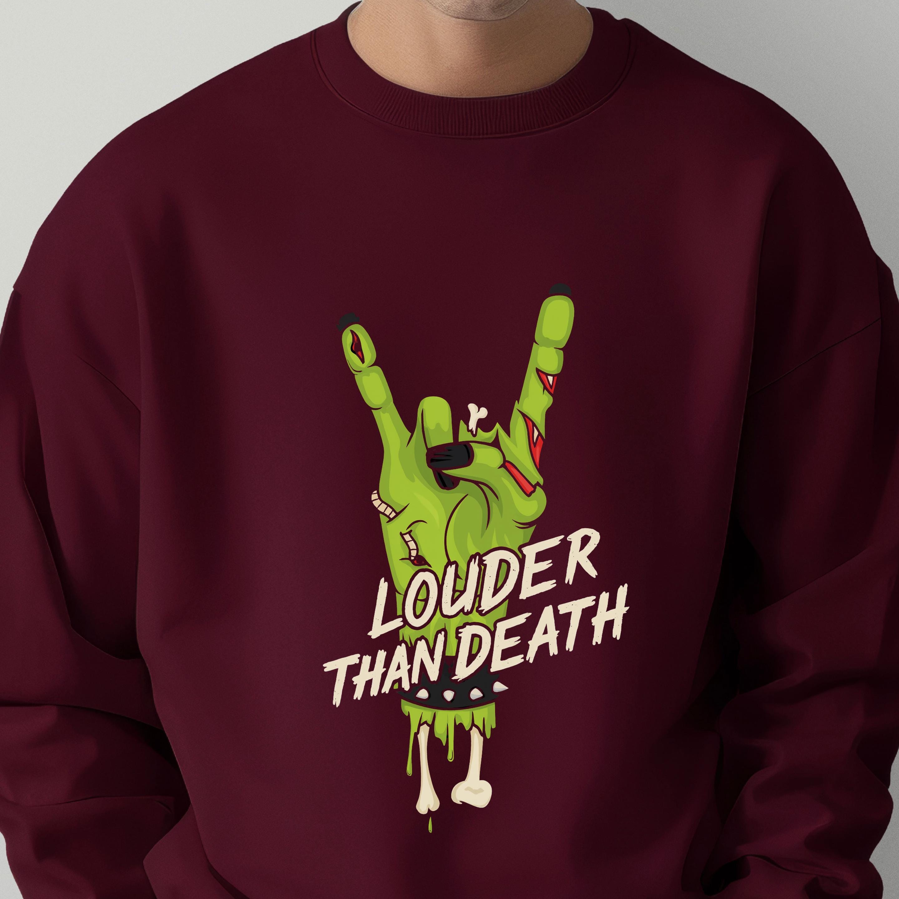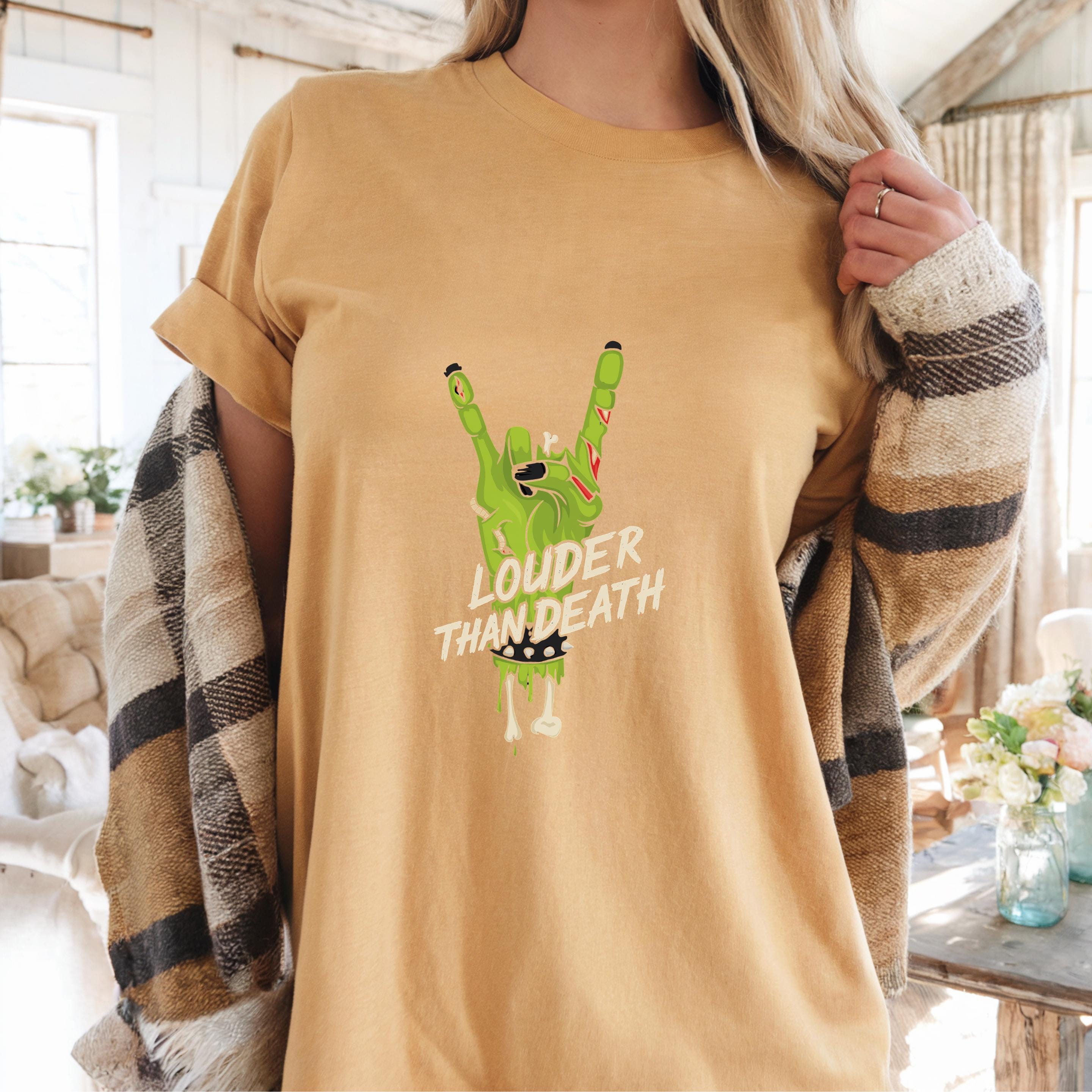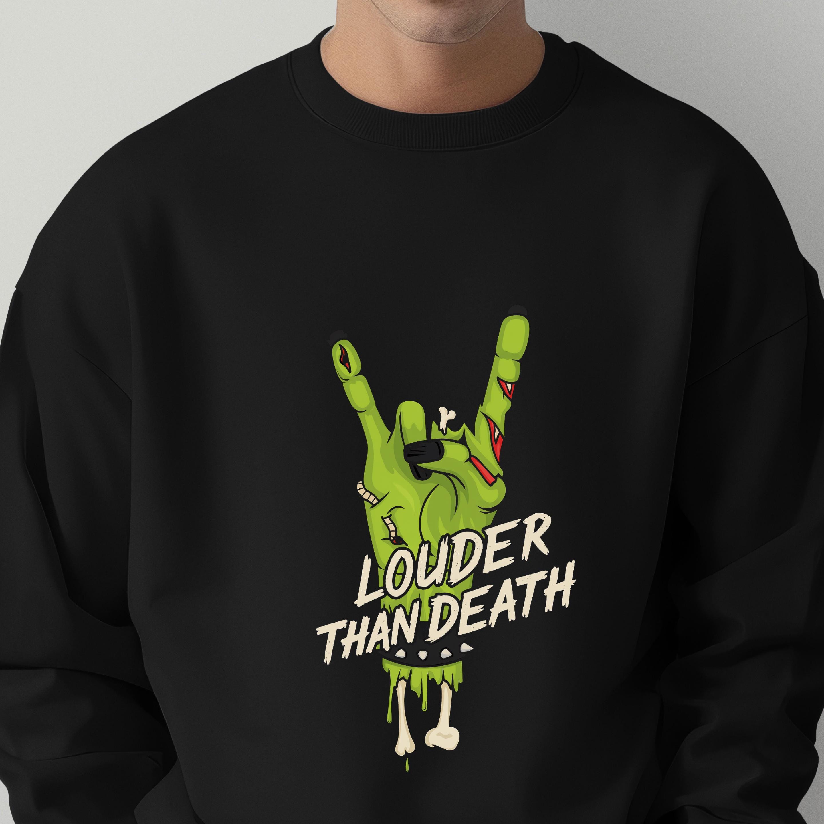 Zombie Hand Halloween Sweatshirt: Louder Than Death Unisex Hoodie and T-shirt 🧵 Product Features Comfort Colors 1717 : -The Comfort Colors 1717 tee is made with medium fabric (6.1 oz/yd² (206.8 g/m²)) consisting of high quality, 100% ring-spun US cotton for long-lasting comfort. - The relaxed fit keeps the wearer comfy in both casual and semi-formal settings while the crew neckline delivers that classic, neat style which makes it perfect for accessorizing. -All Comfort Colors 1717 shirts feature pre-shrunk cotton for size retention and a signature sewn-in twill label. -Made using 100% US cotton that is ethically grown and harvested.
