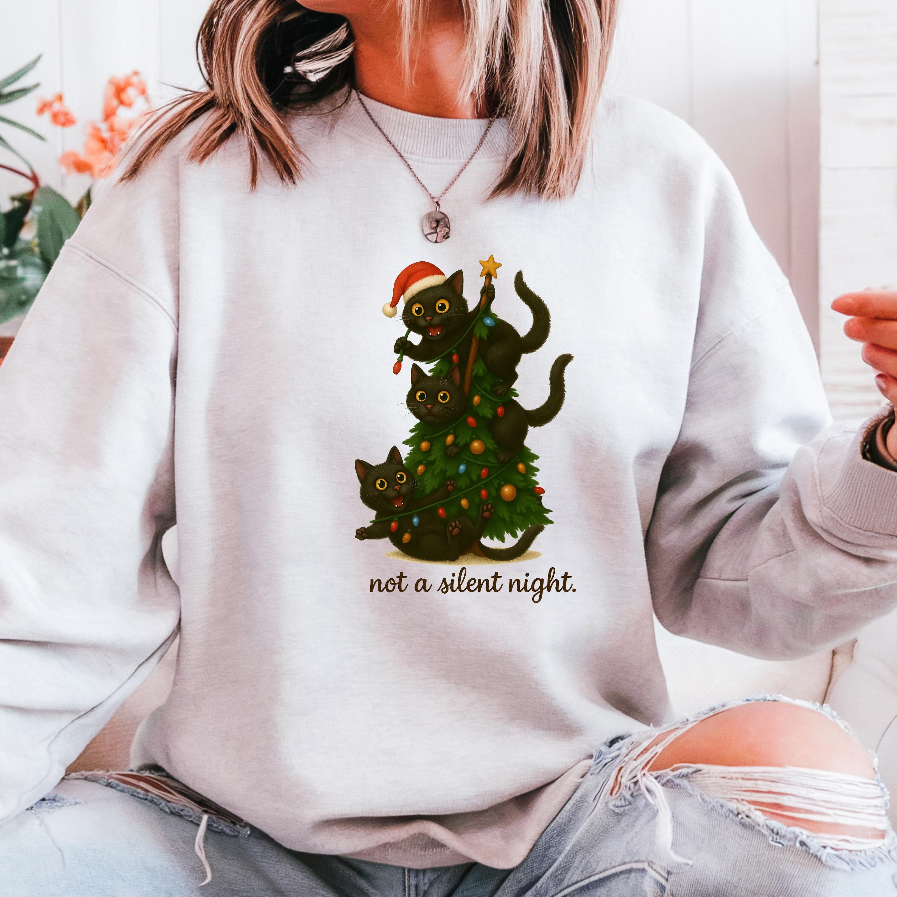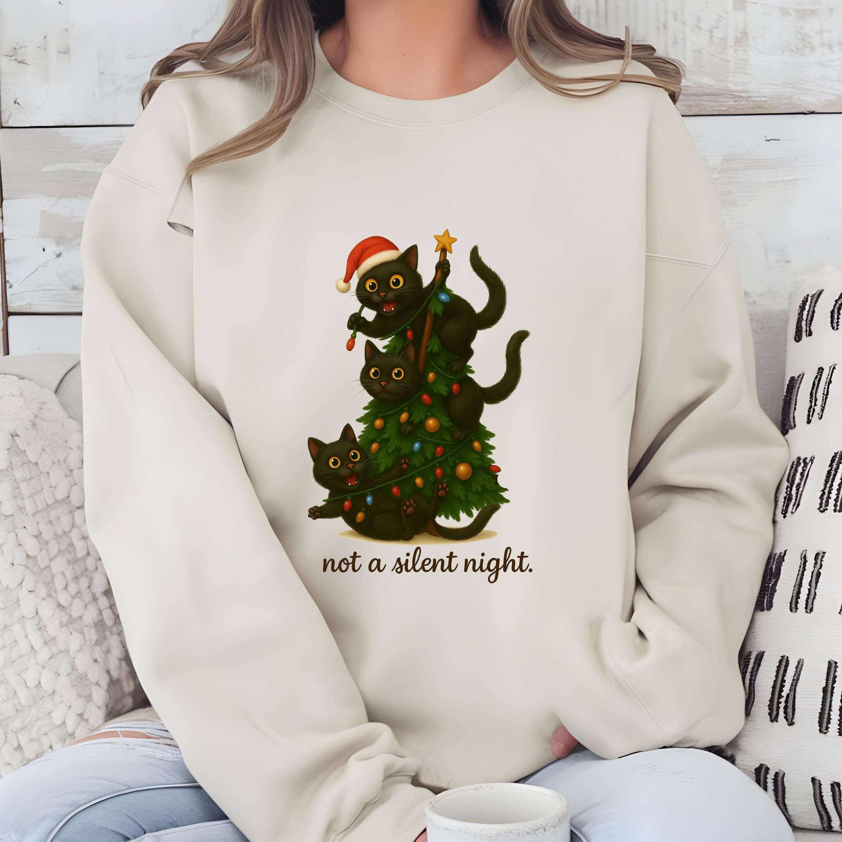 Three Black Cats Playing with Christmas Tree Sweatshirt, Funny Black Cats Comfort Colors Shirt, Festive Cat Lover Gift