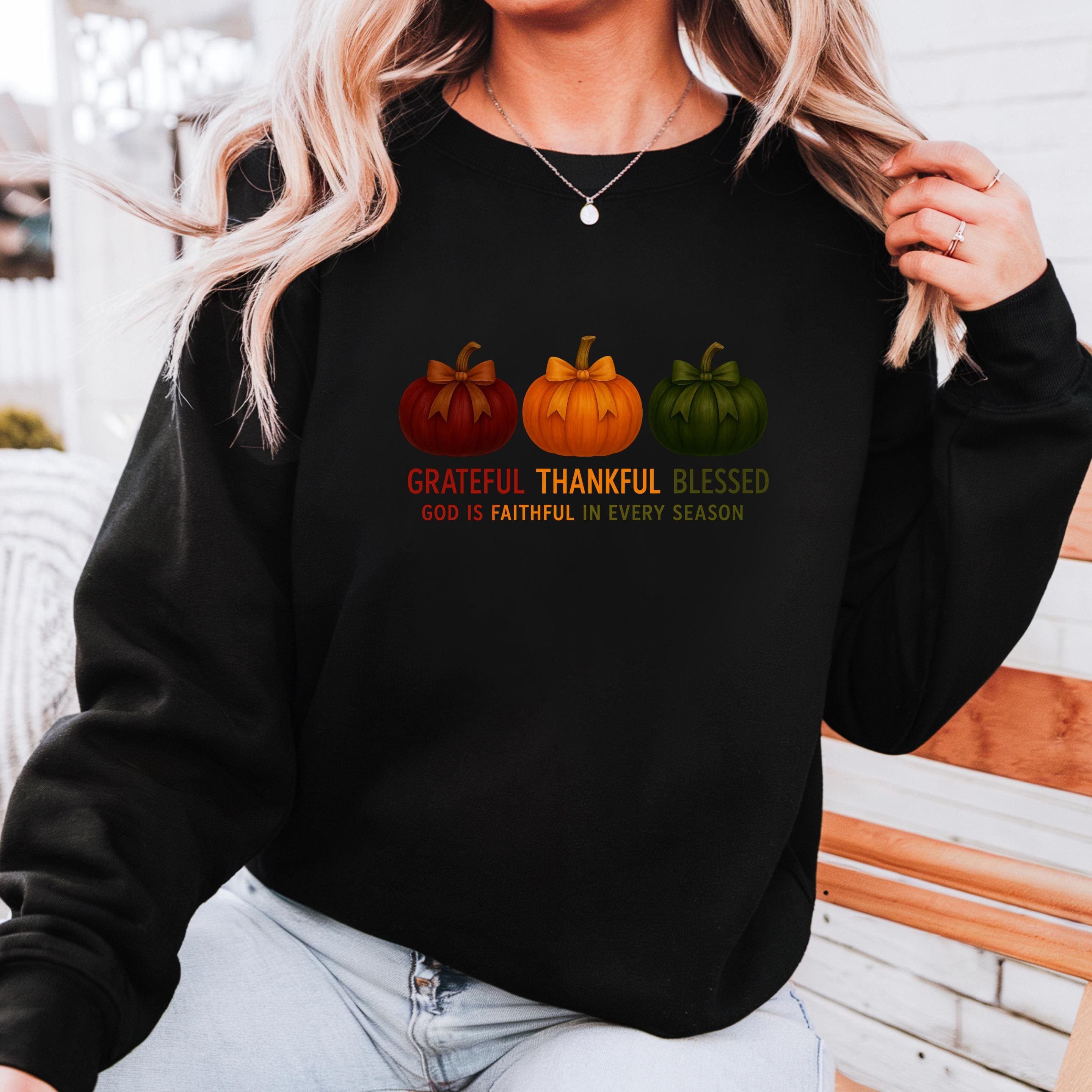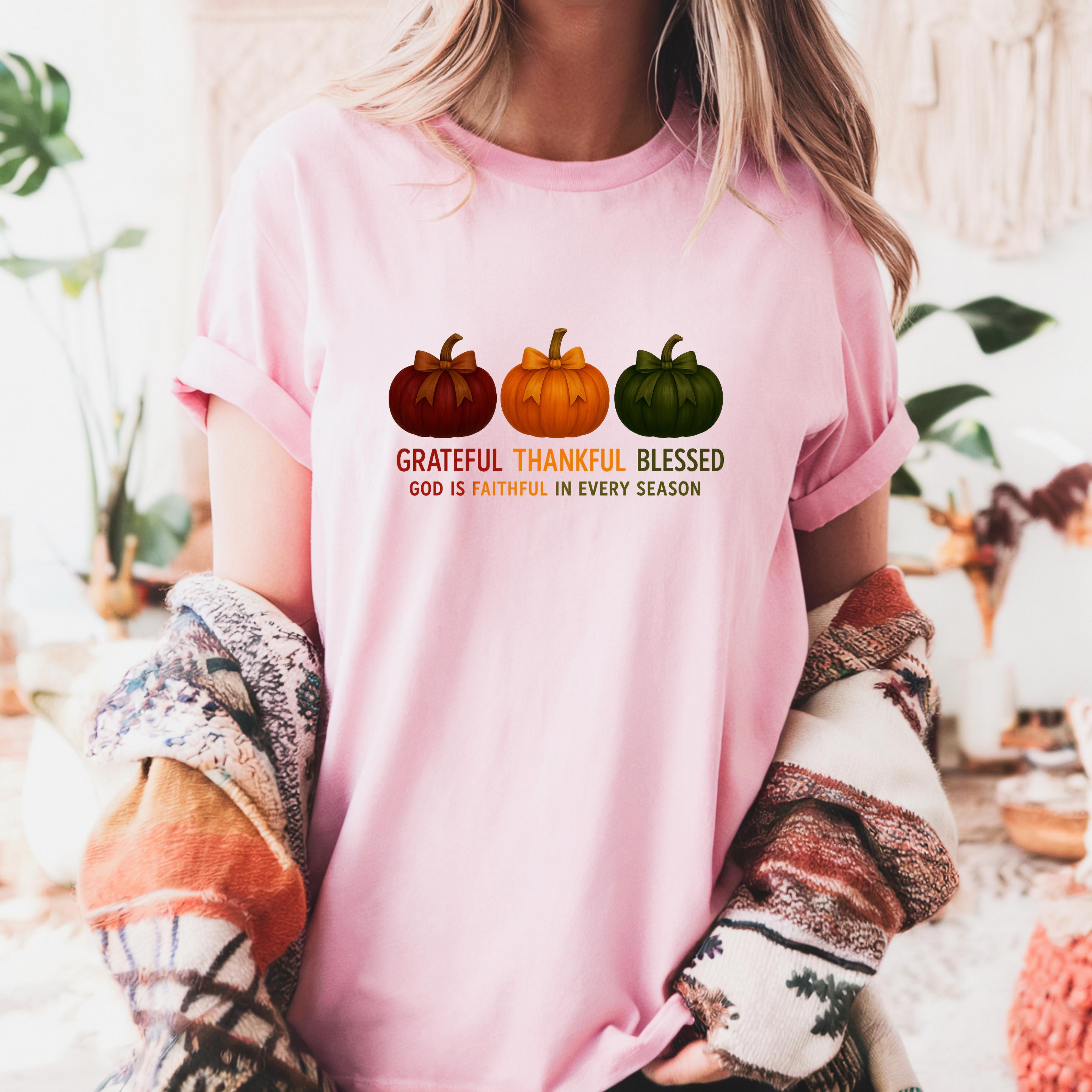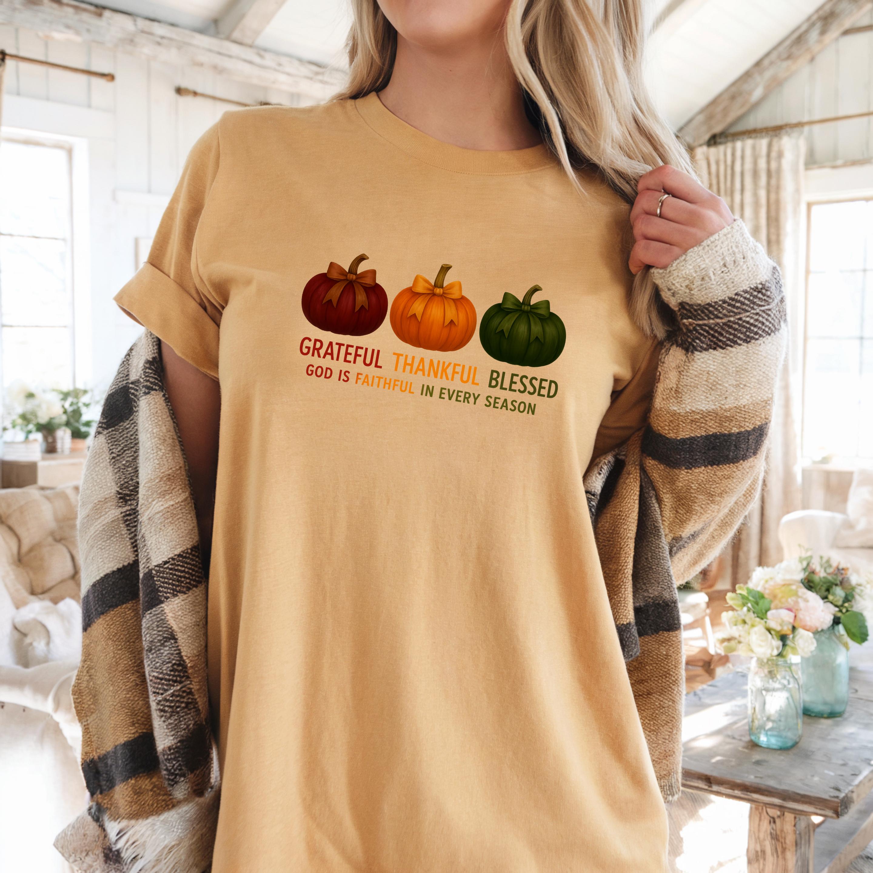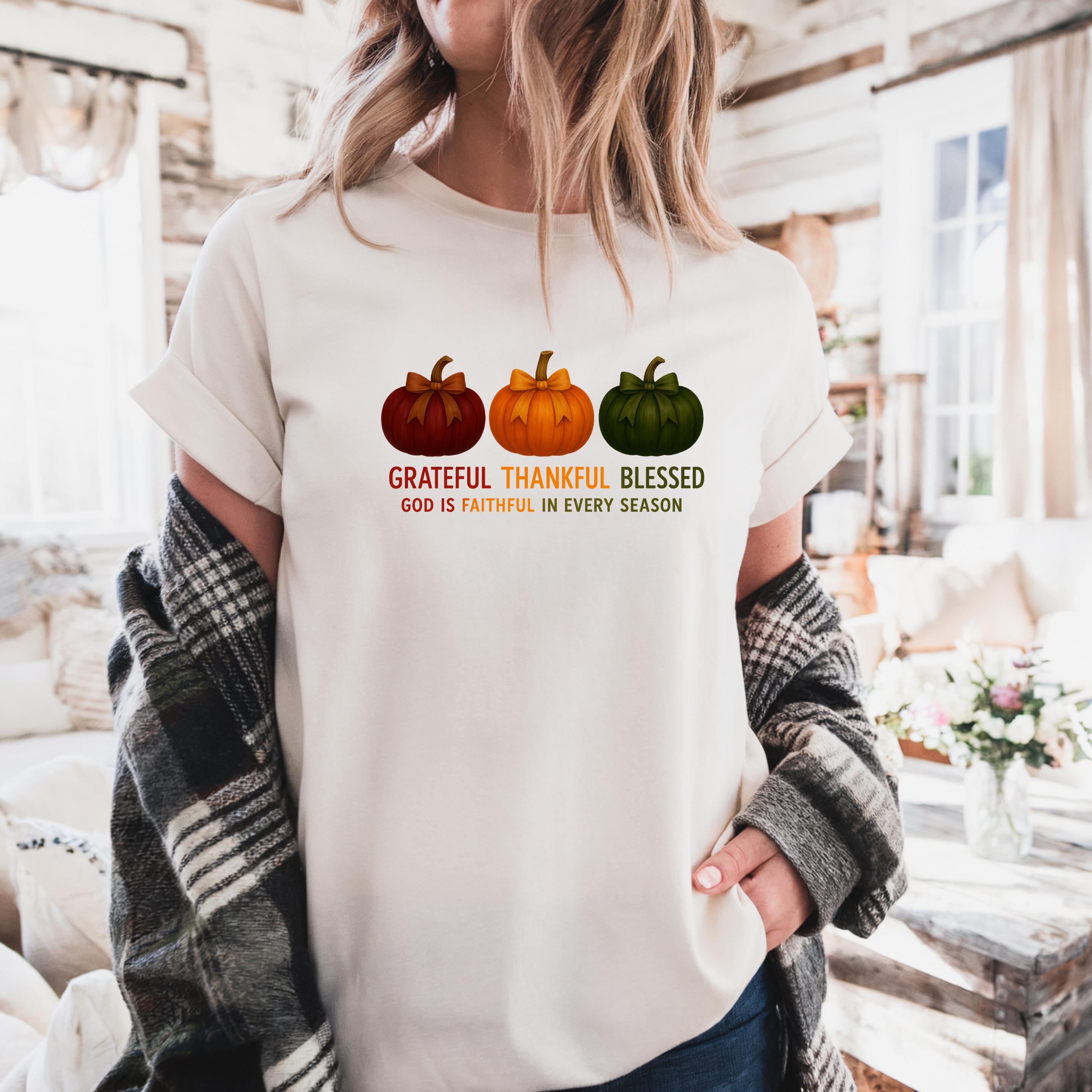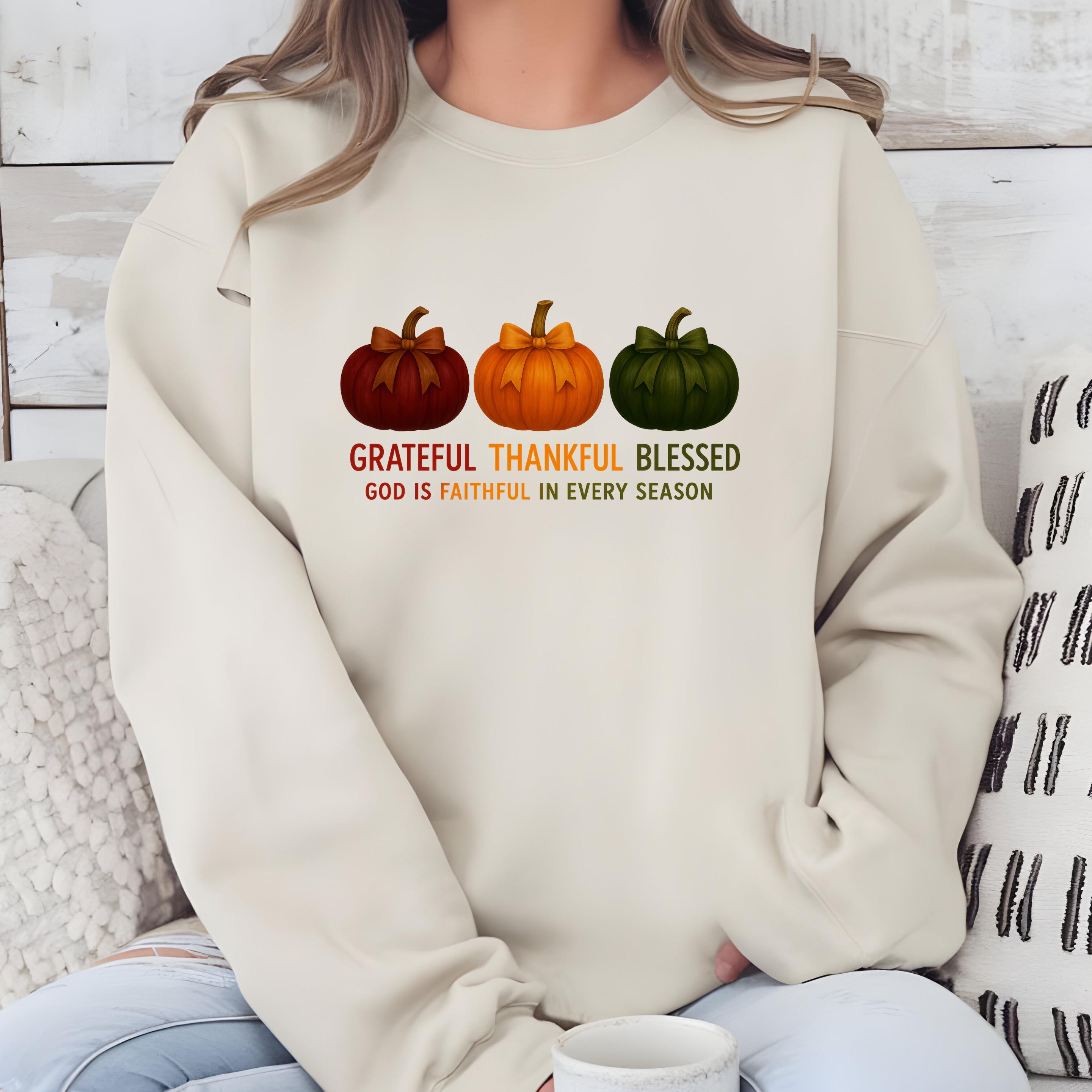 Grateful Thankful Blessed Pumpkin Shirt – Fall Christian Shirt – Faith God Is Faithful In Every Season Tee – Autumn Thanksgiving Sweatshirt