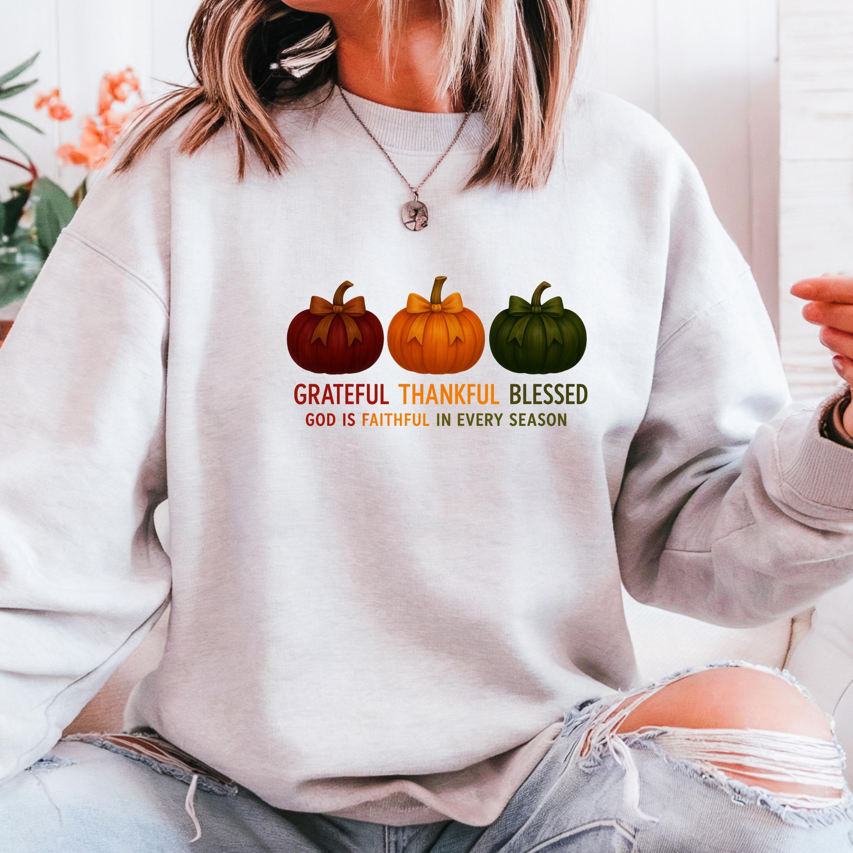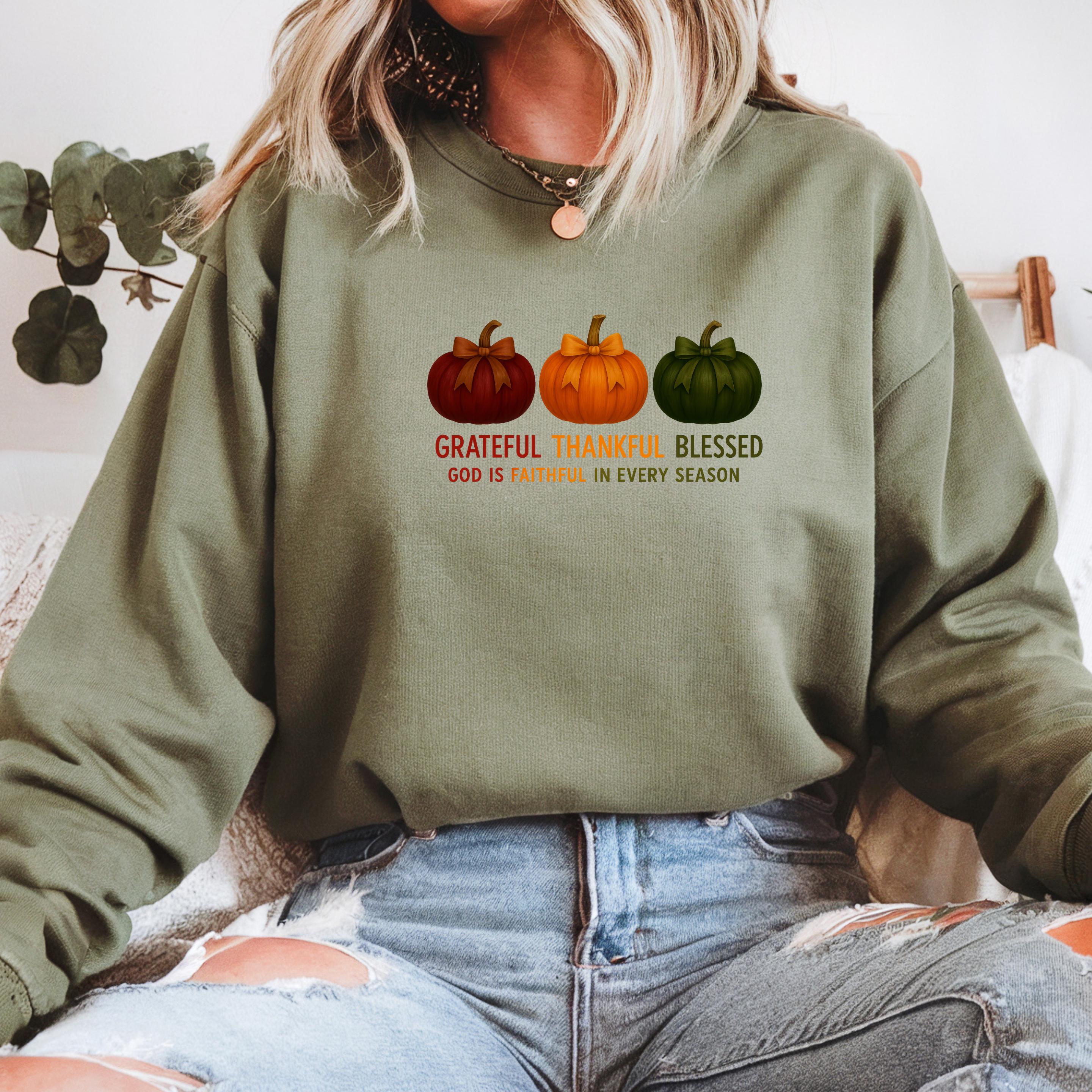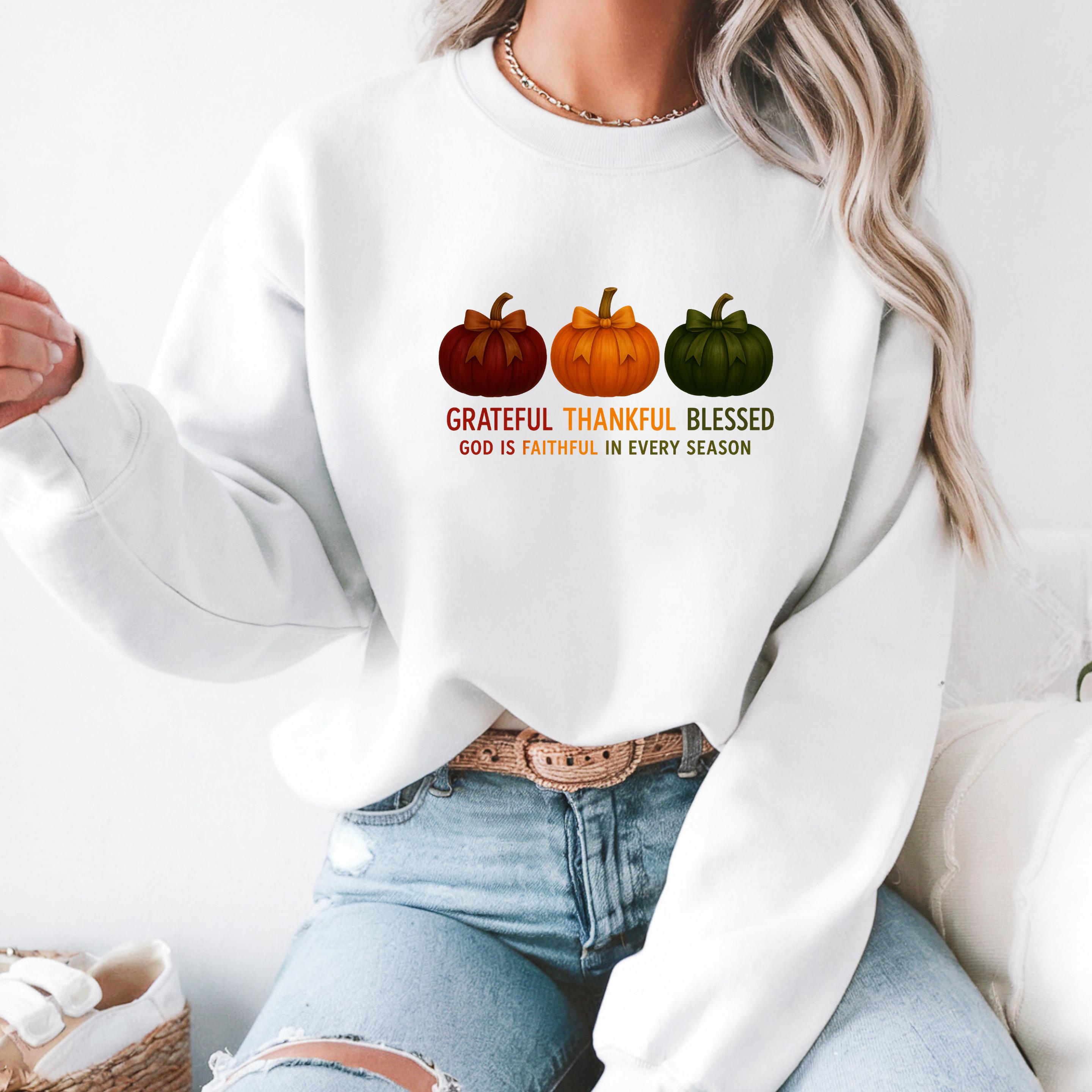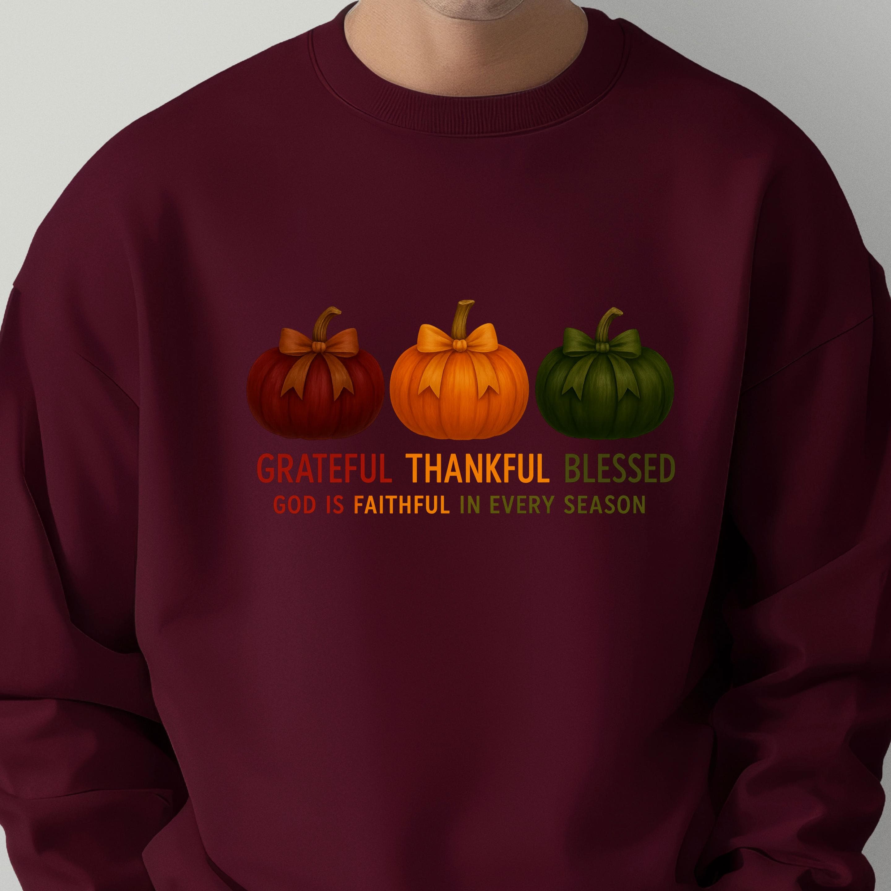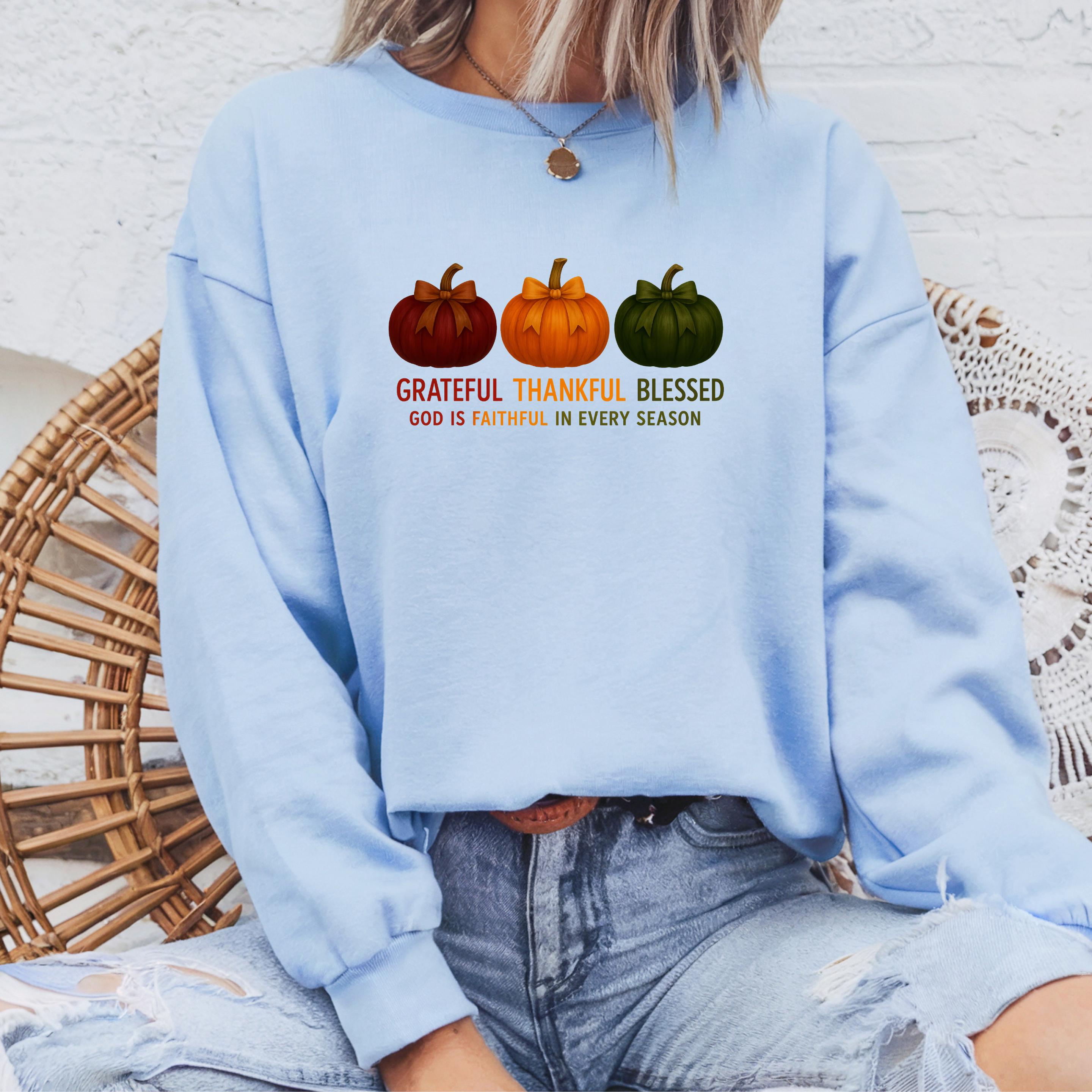 Grateful Thankful Blessed Pumpkin Shirt – Fall Christian Shirt – Faith God Is Faithful In Every Season Tee – Autumn Thanksgiving Sweatshirt