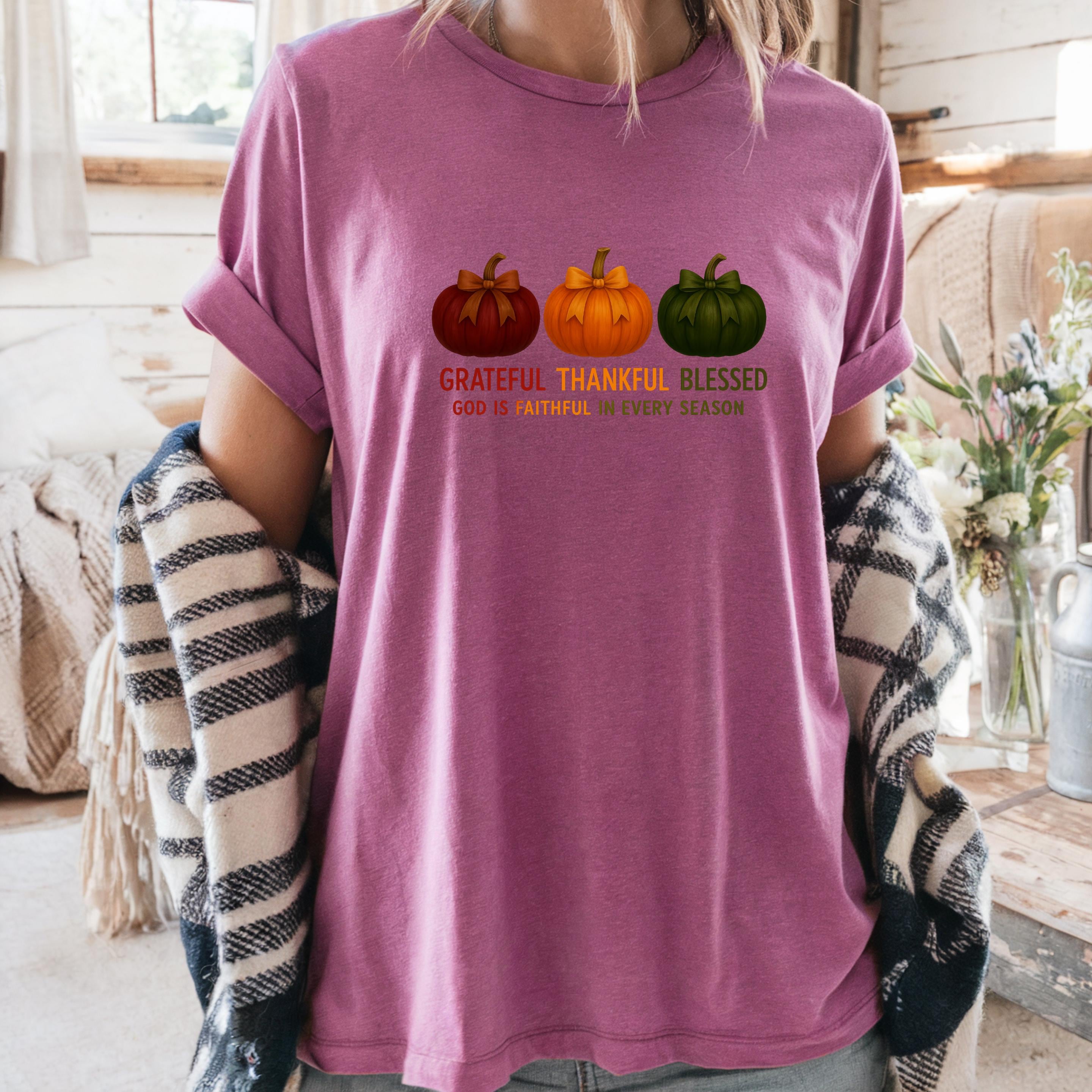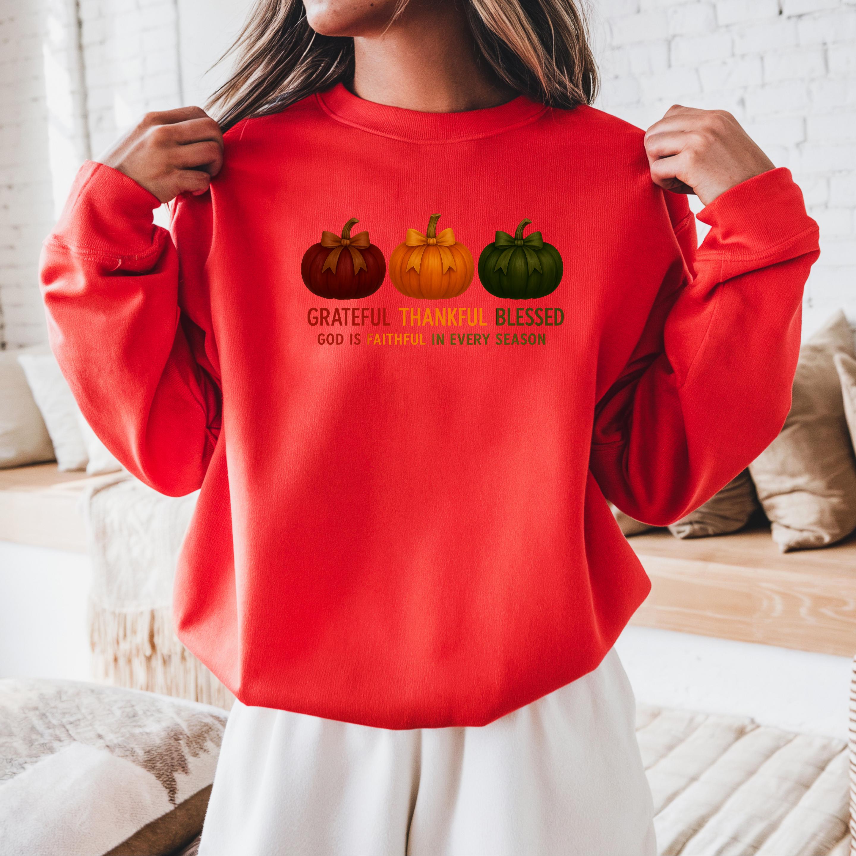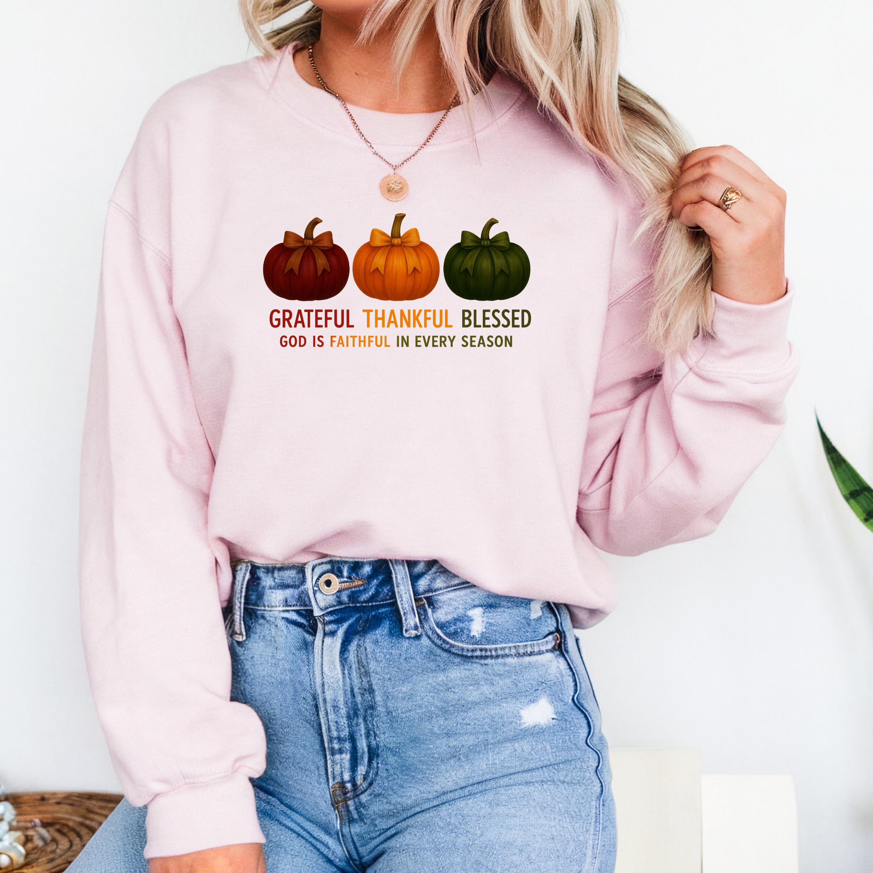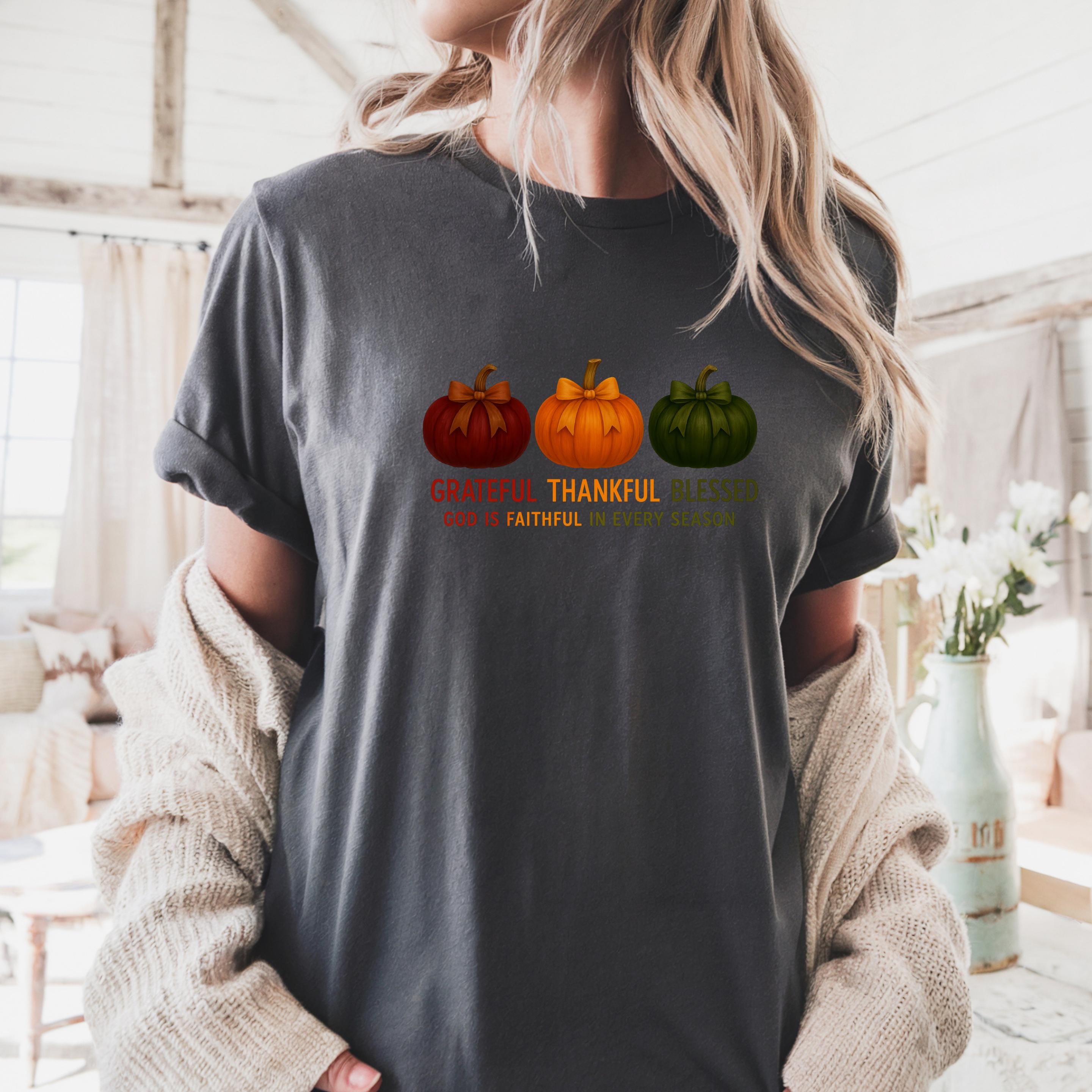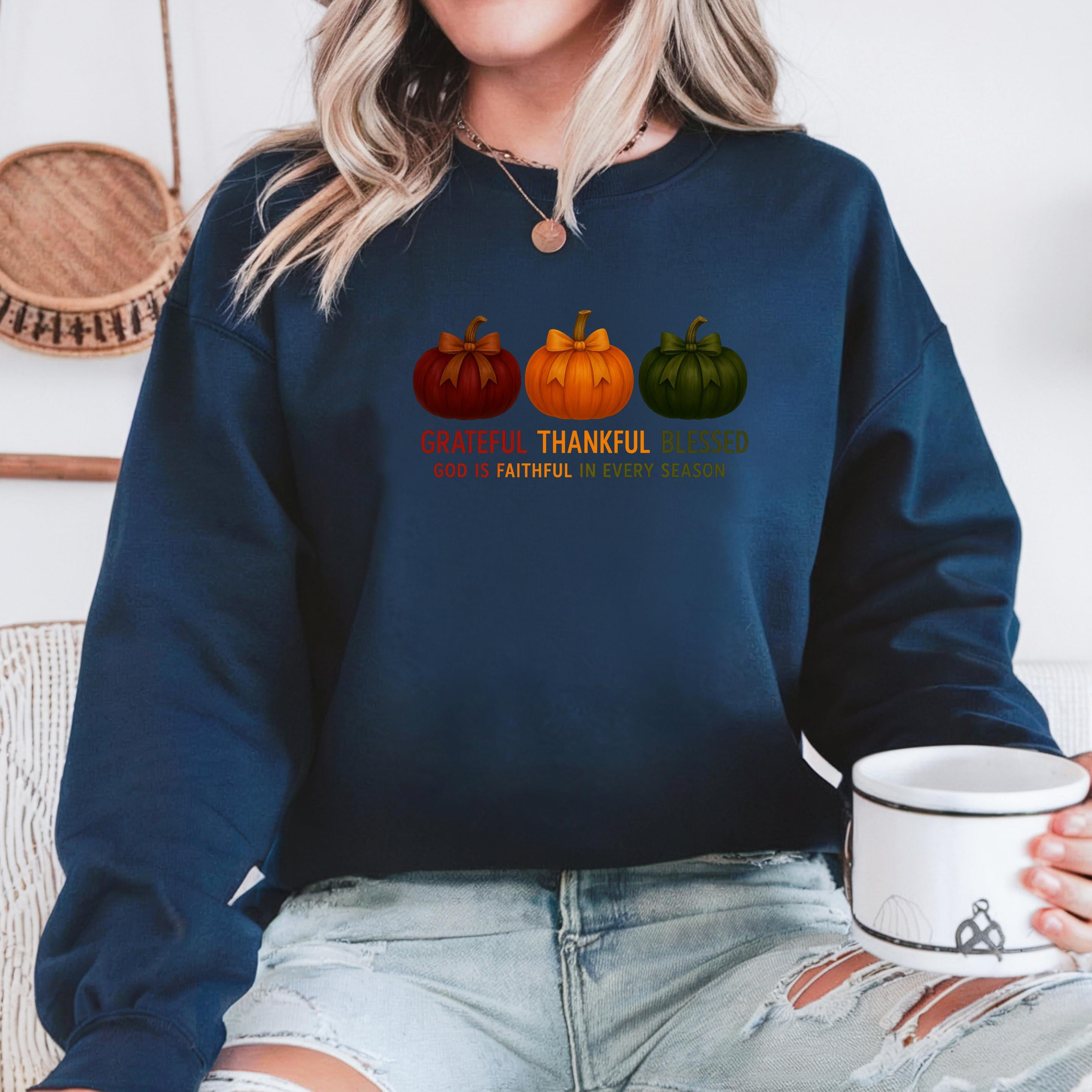Grateful Thankful Blessed Pumpkin Shirt – Fall Christian Shirt – Faith God Is Faithful In Every Season Tee – Autumn Thanksgiving Sweatshirt
