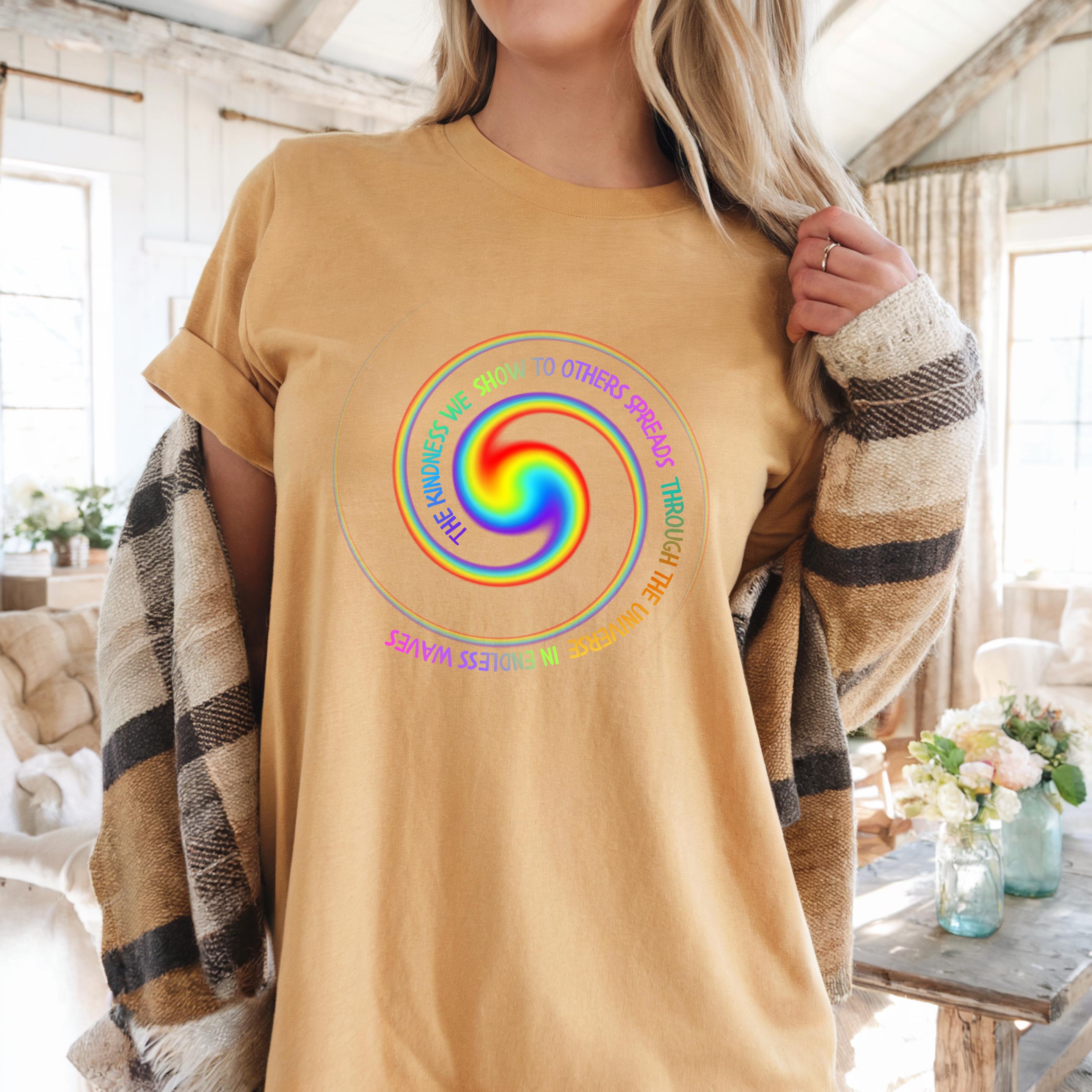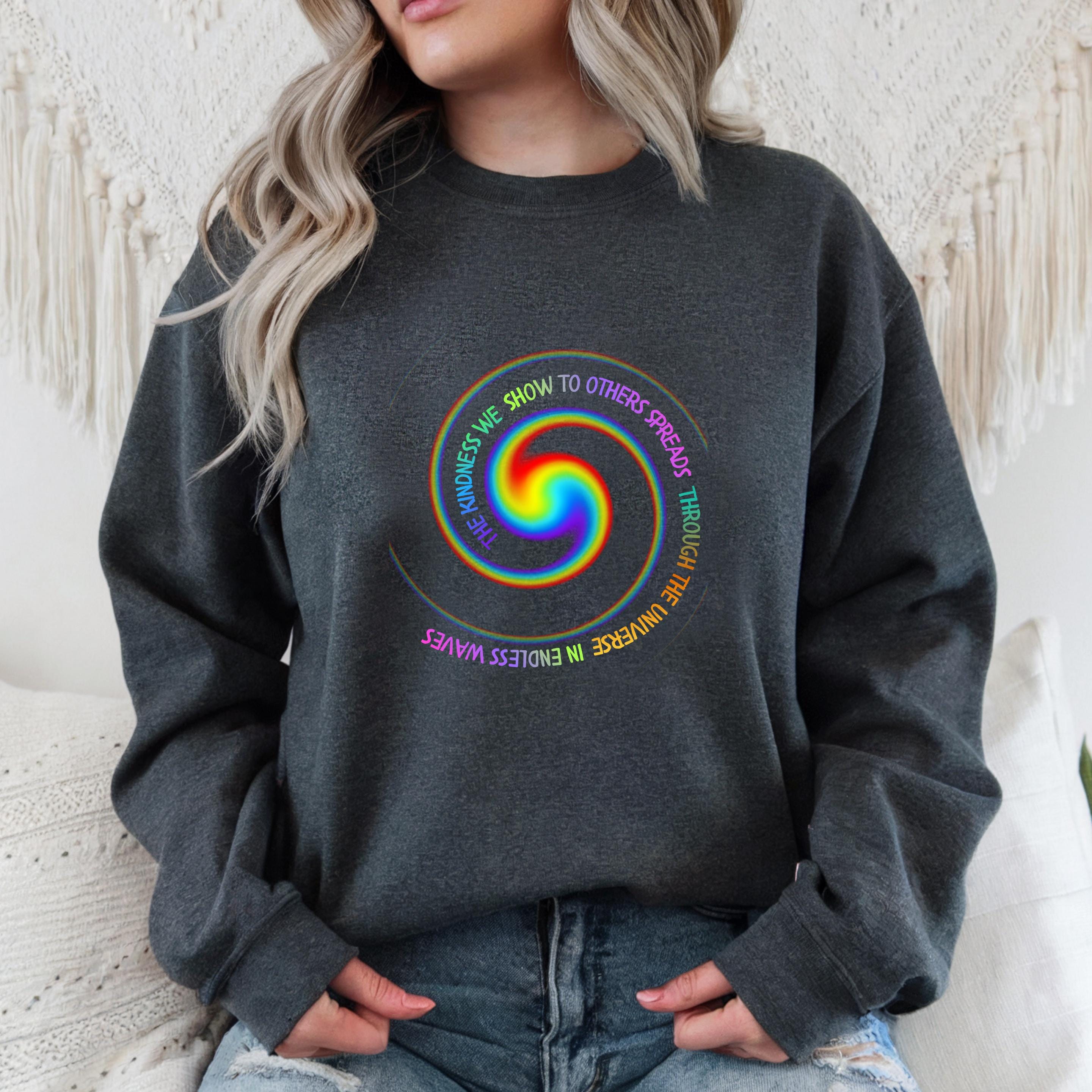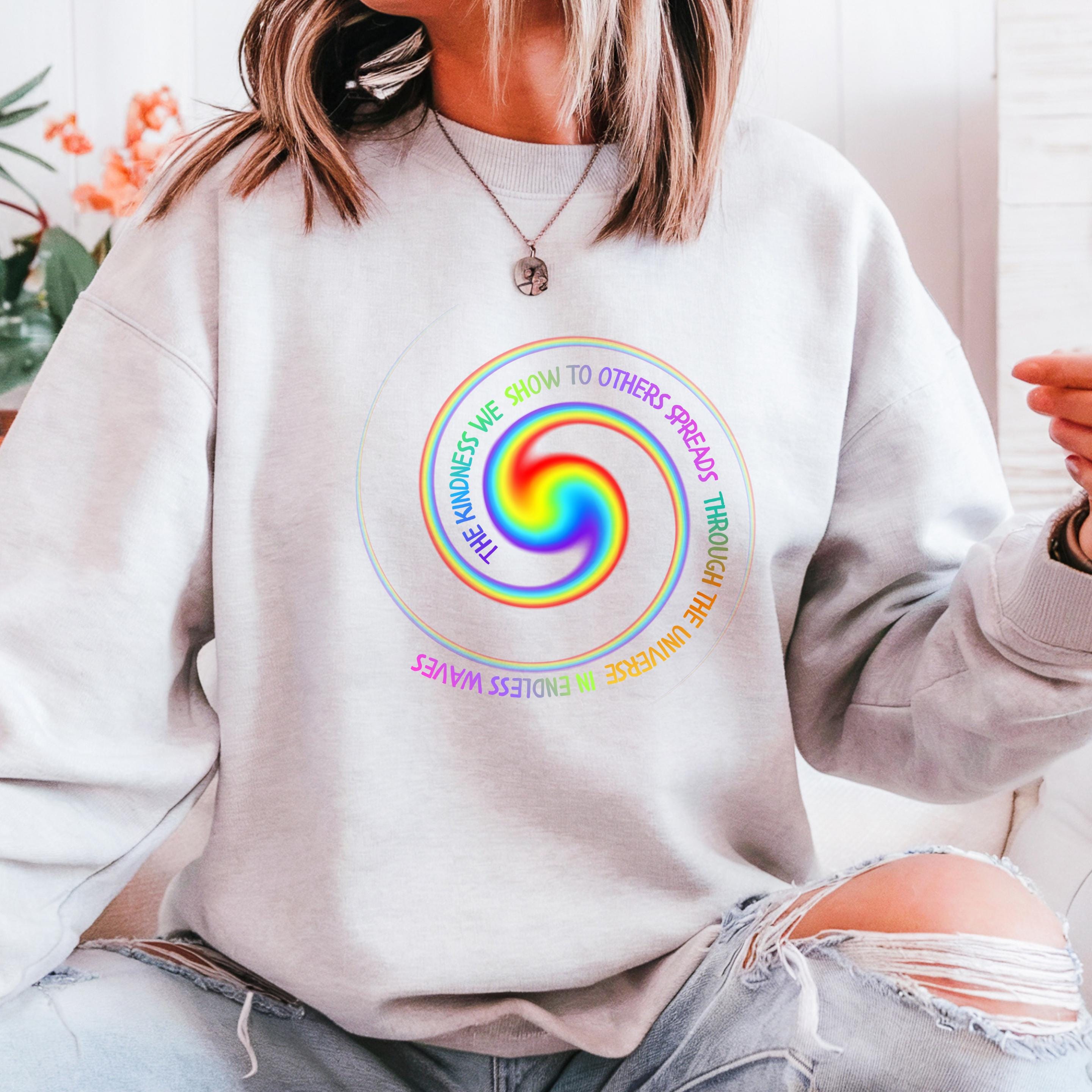 This inspiring sweatshirt features a vibrant rainbow spiral with the uplifting message: