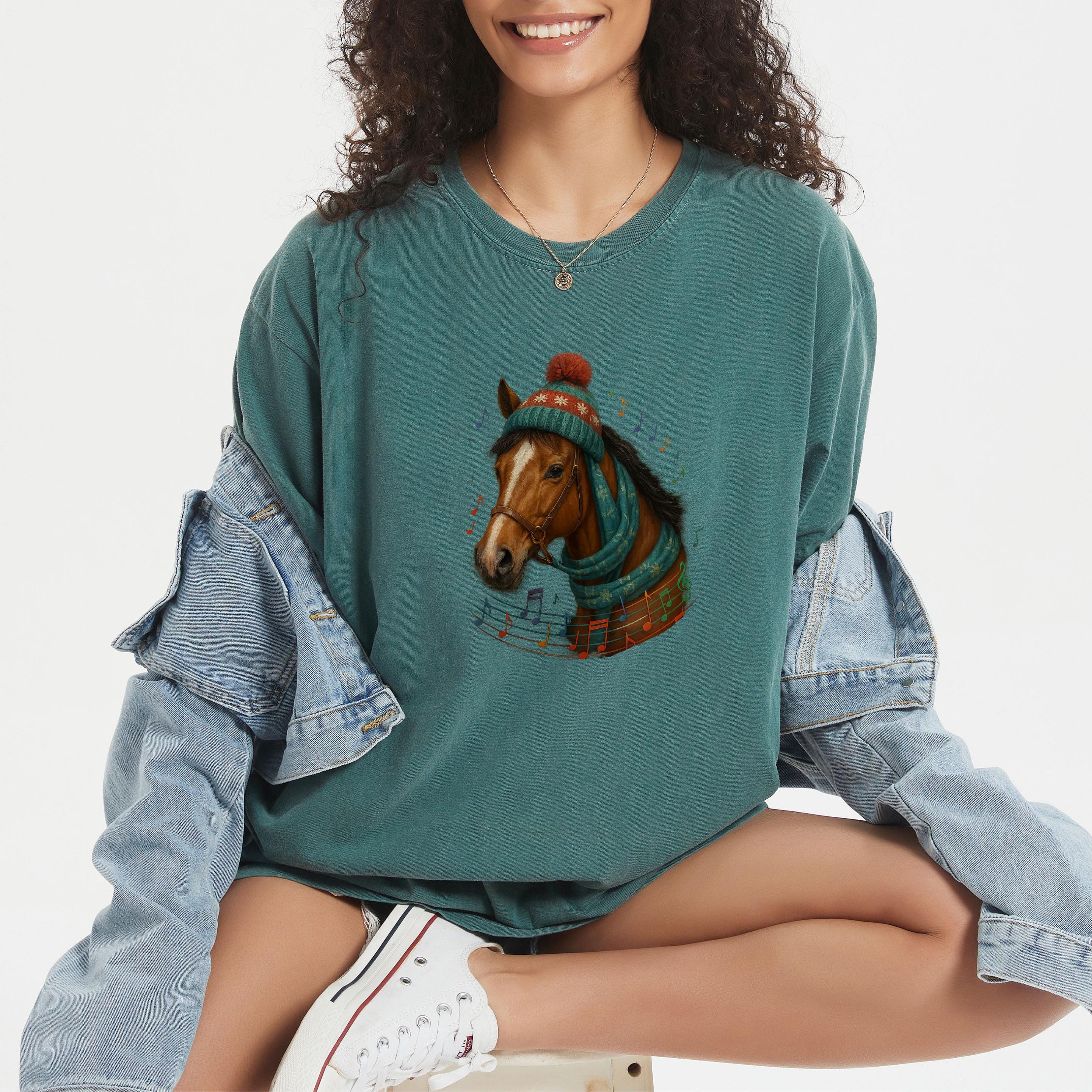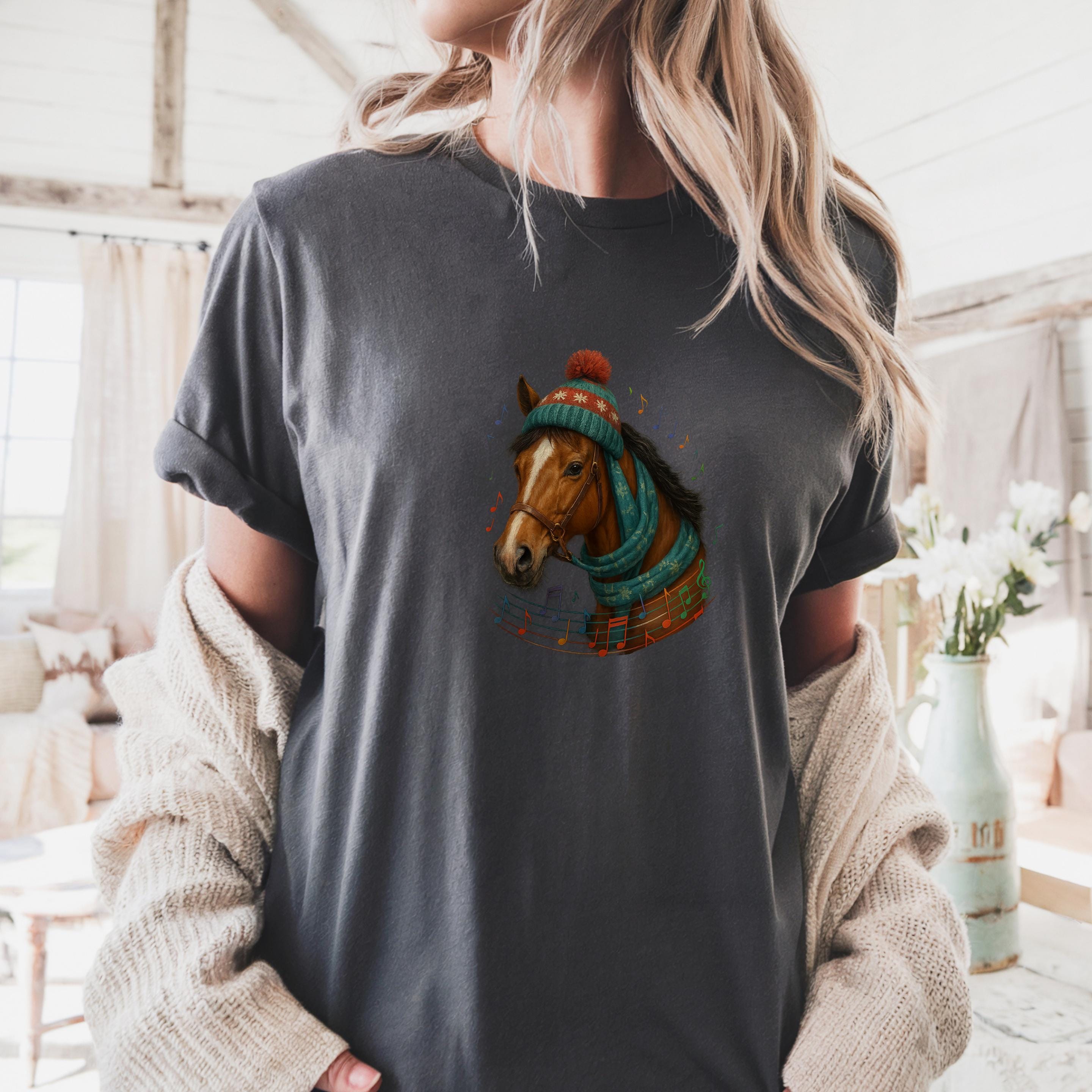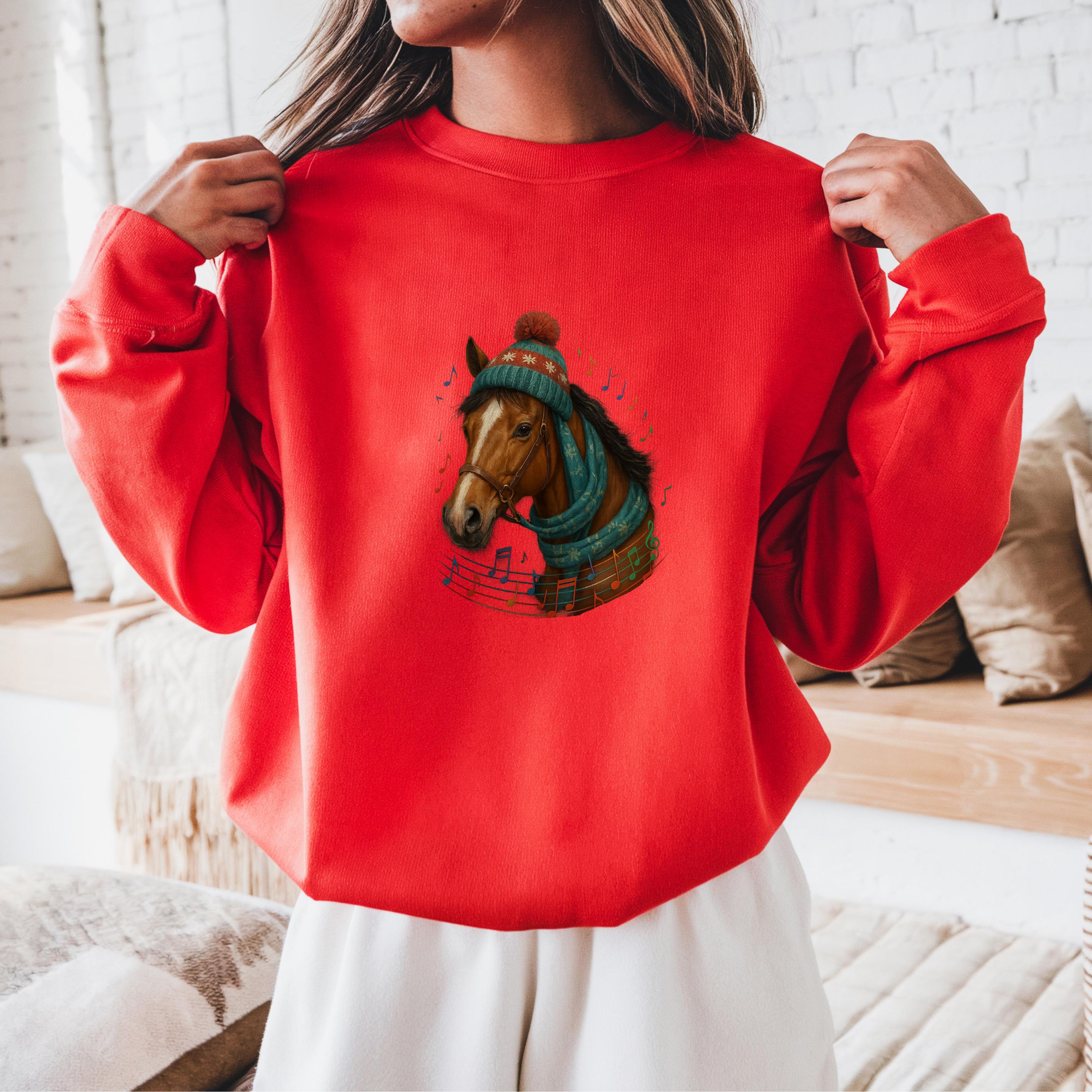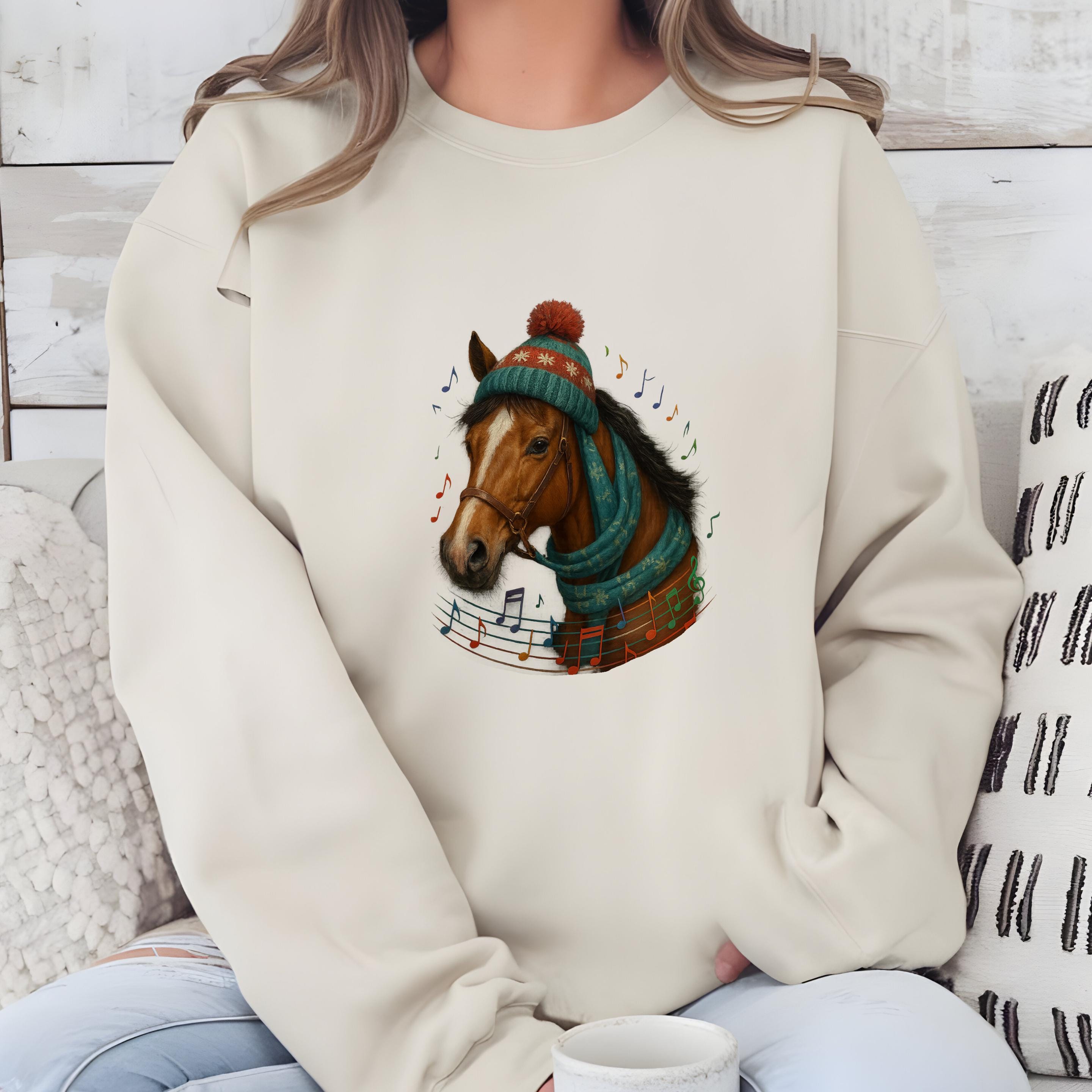 Perfect for horse lovers, equestrians, music enthusiasts, and anyone who enjoys unique holiday apparel, this design adds a joyful and elegant touch to every winter outfit.