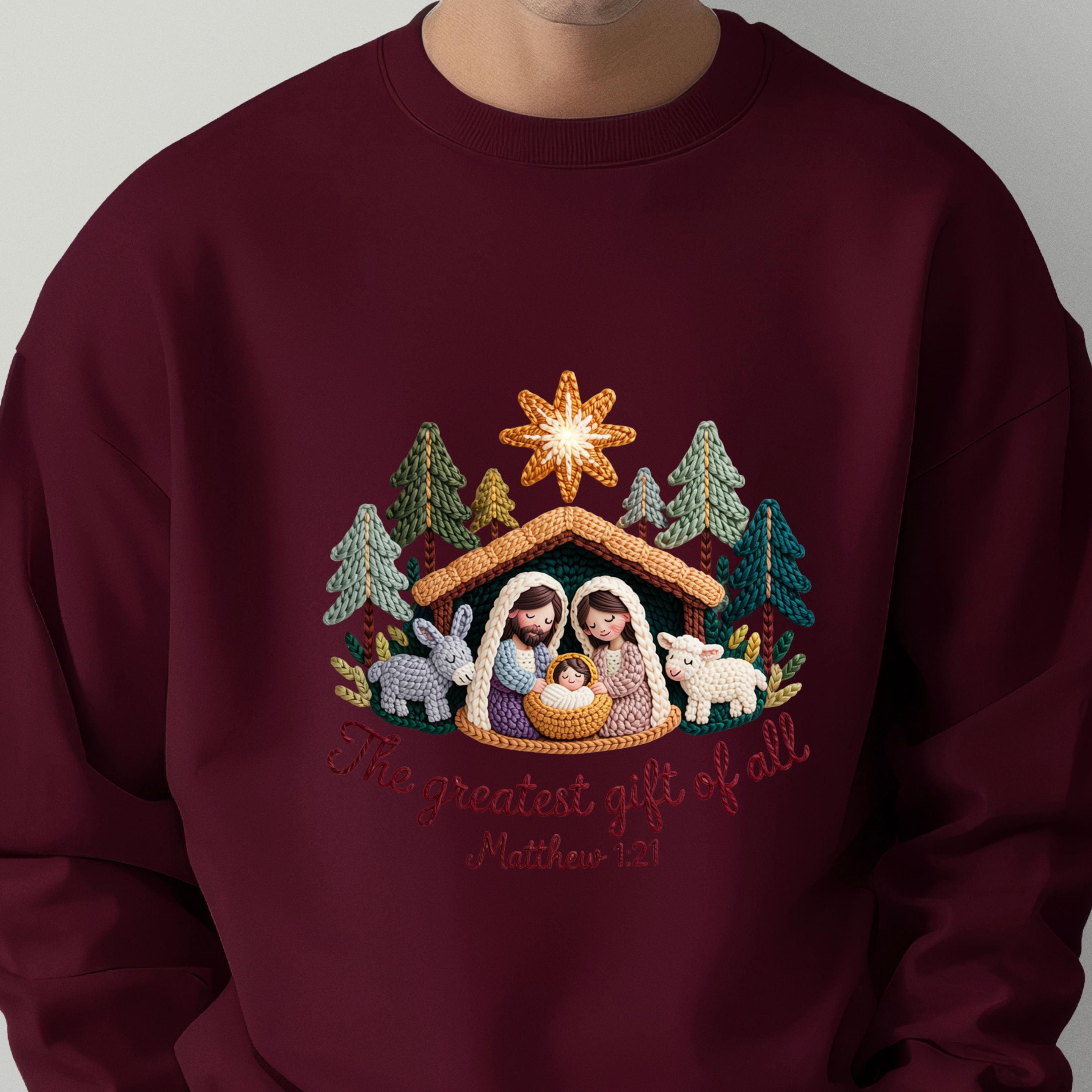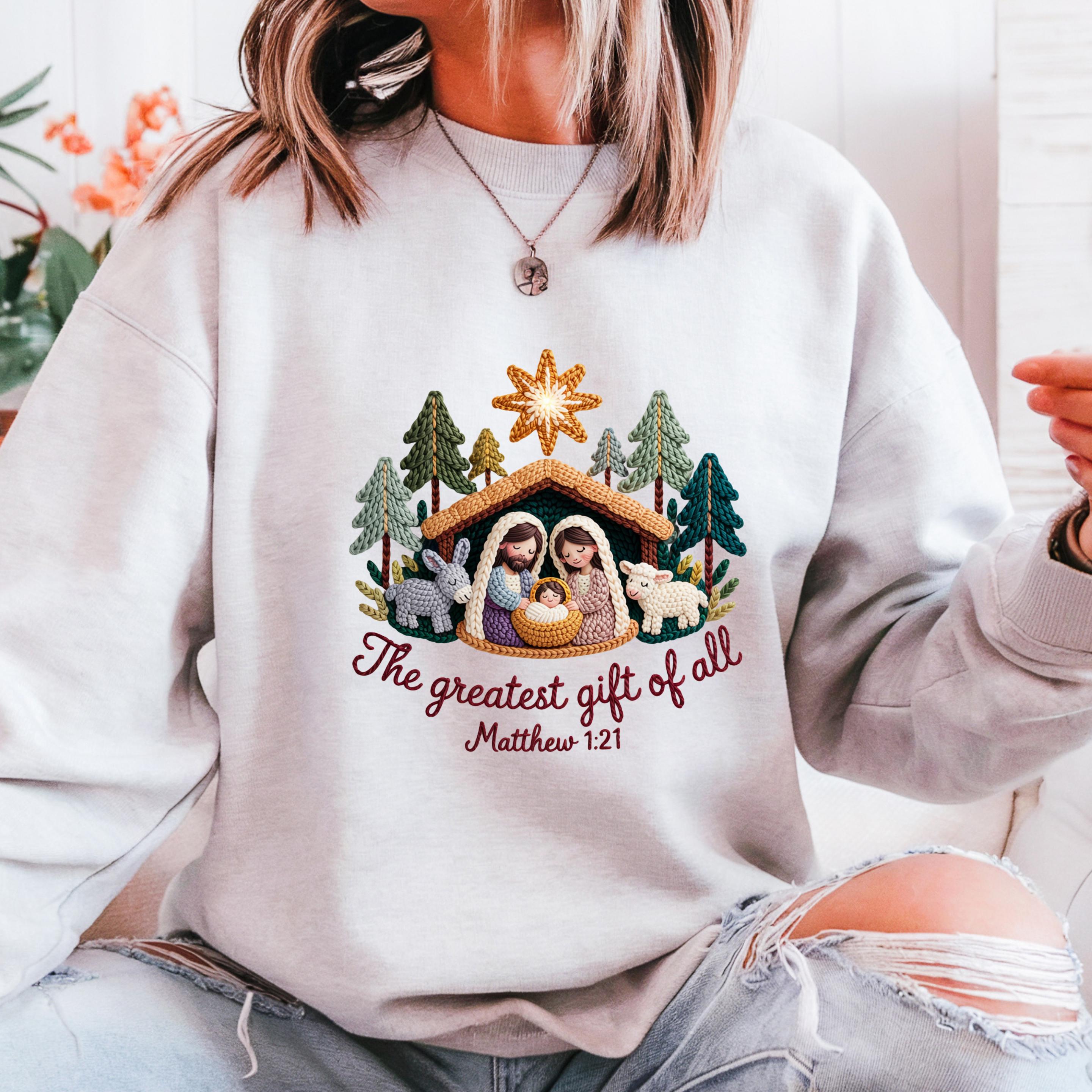 Celebrate the true meaning of Christmas with this beautifully illustrated nativity sweatshirt, inspired by Matthew 1:21 and the message that the greatest gift of all is love, faith, and hope.
