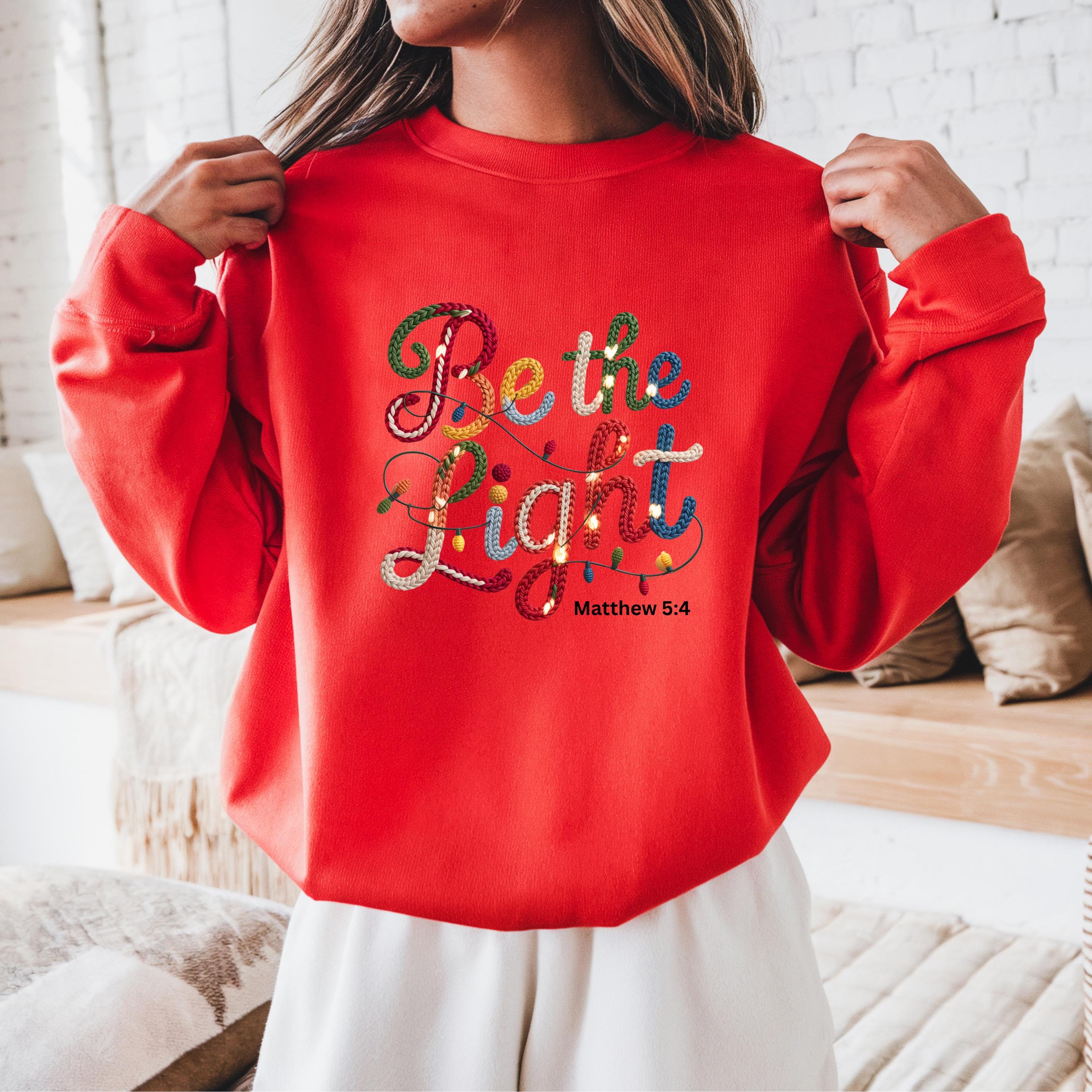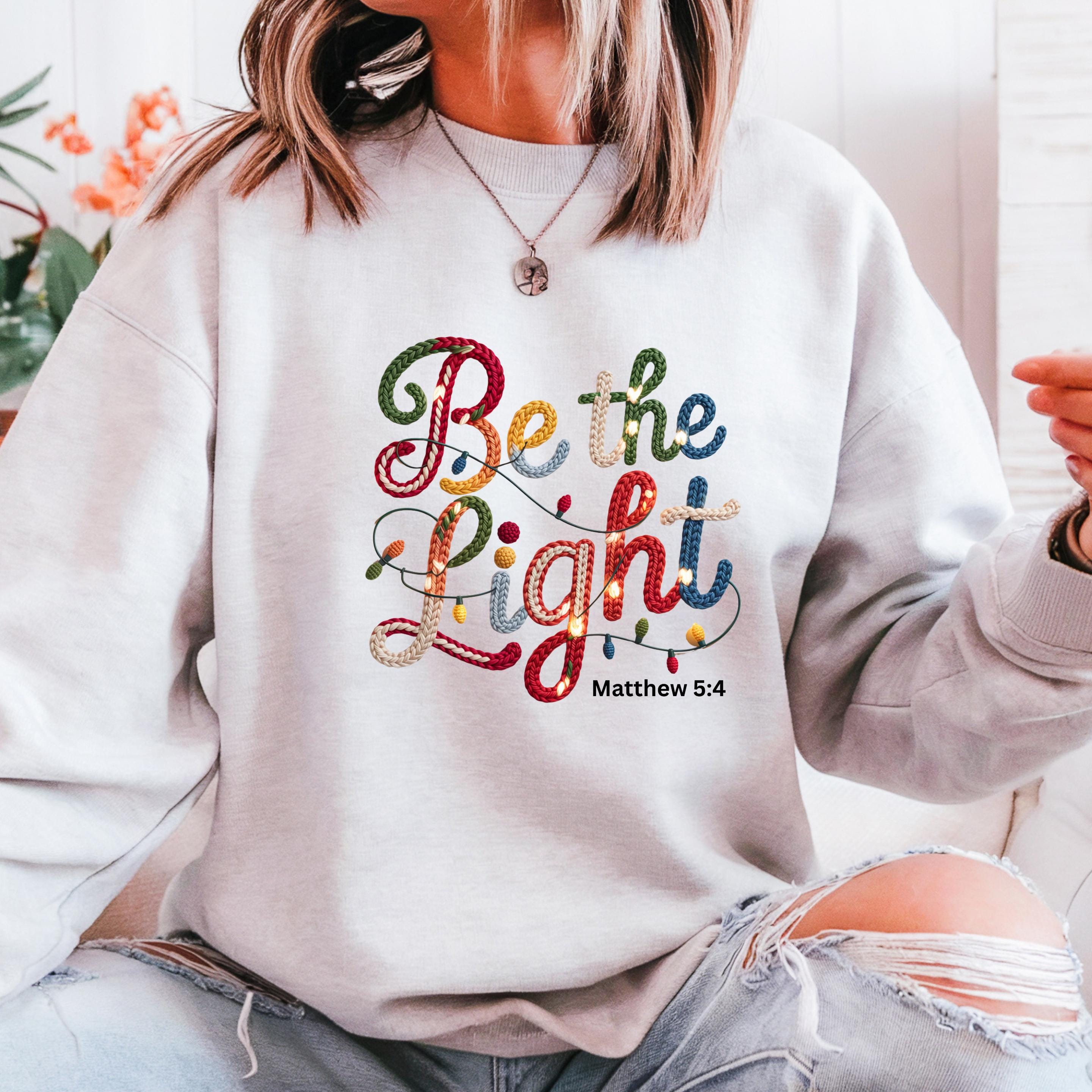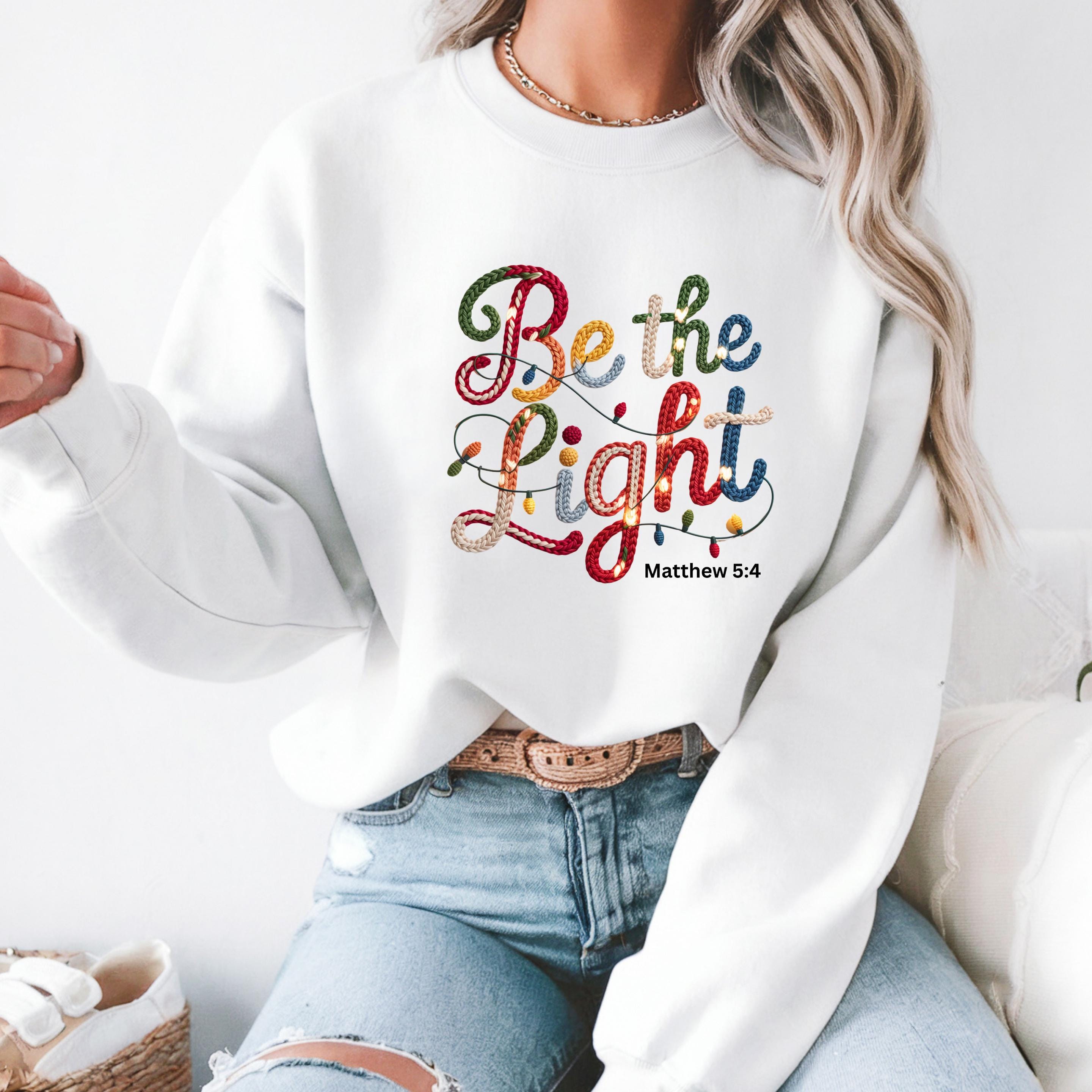 Shine with faith and hope this season with this beautifully designed “Be the Light” Christian sweatshirt, inspired by Matthew 5:4. Featuring a cozy, handcrafted-style lettering design with festive colors and delicate Christmas light details, this piece is a meaningful reminder to live with love, compassion, and light—especially during the holiday season.