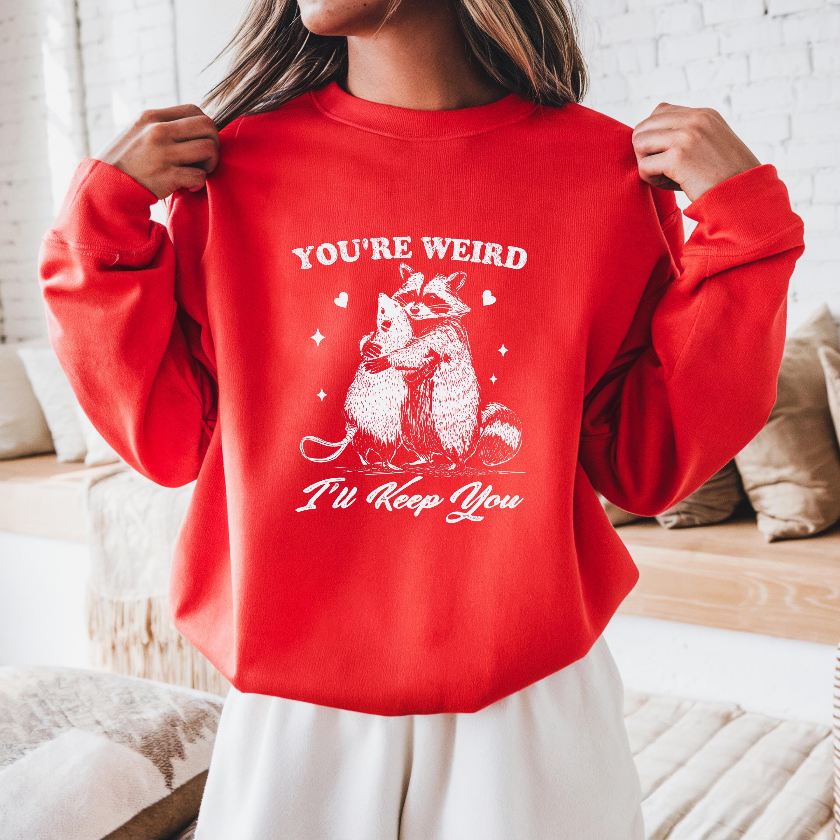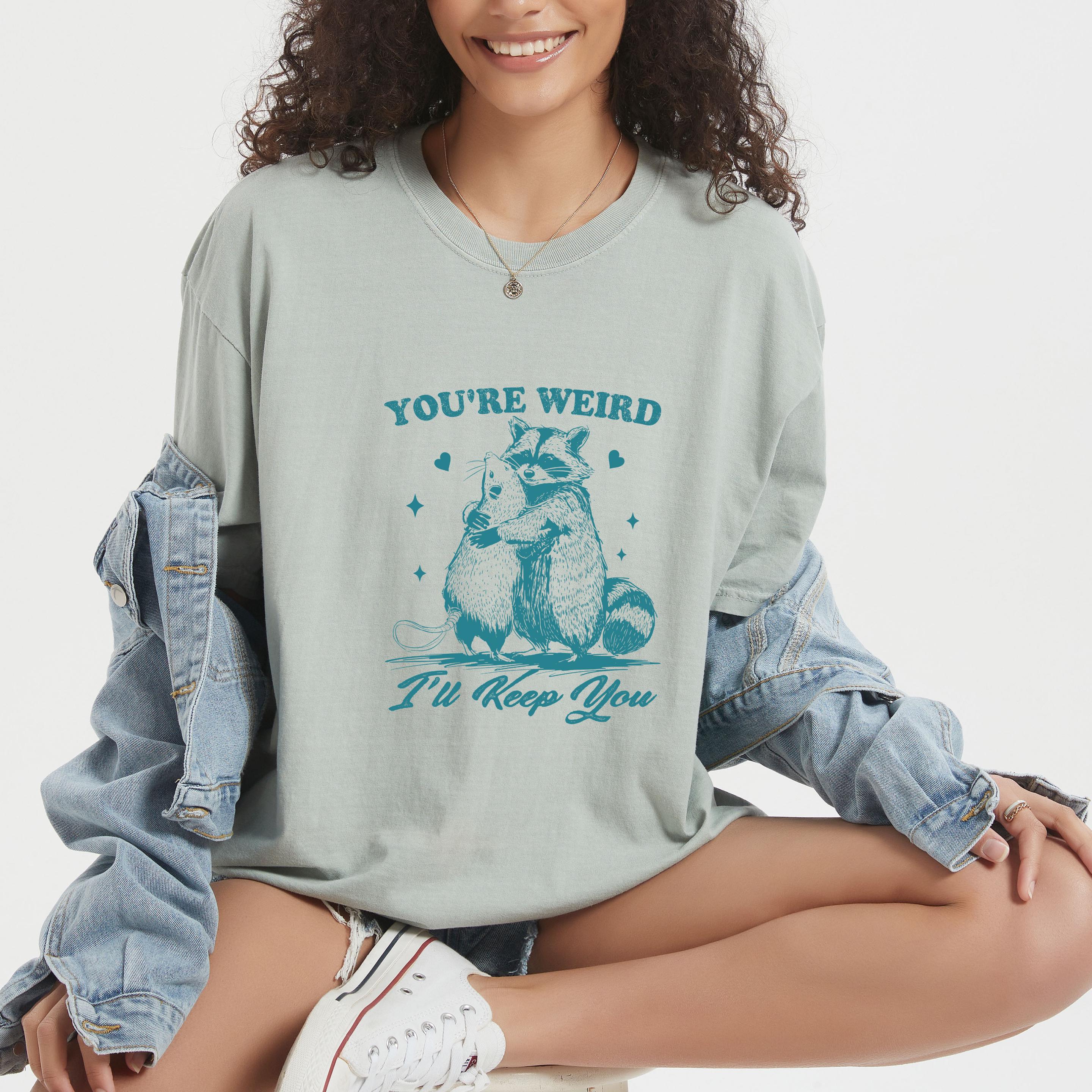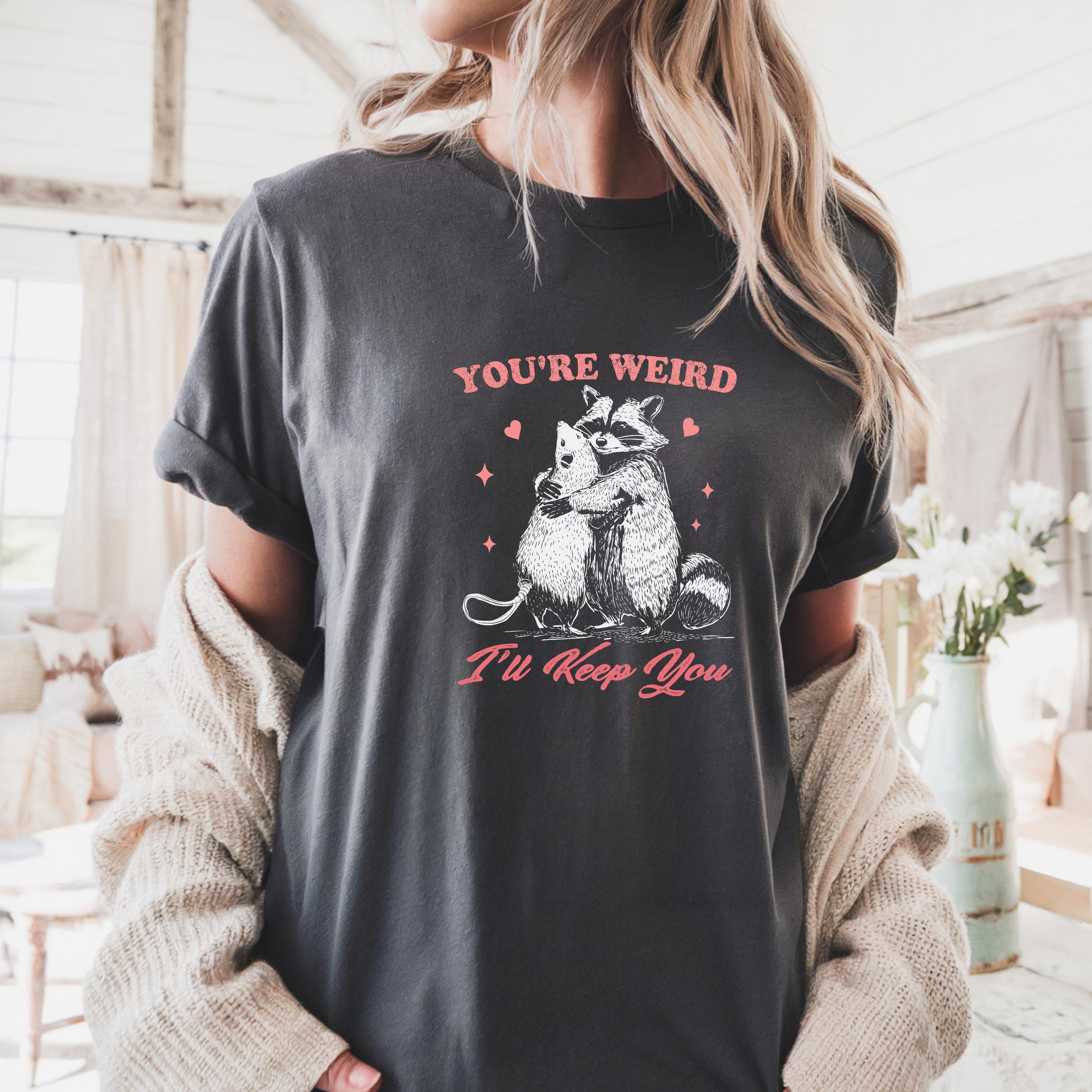 This adorable yet slightly sarcastic design features a raccoon hugging a mouse with the quote “You’re Weird, I’ll Keep You” — perfect for couples, best friends, or anyone who proudly embraces their weirdness.
