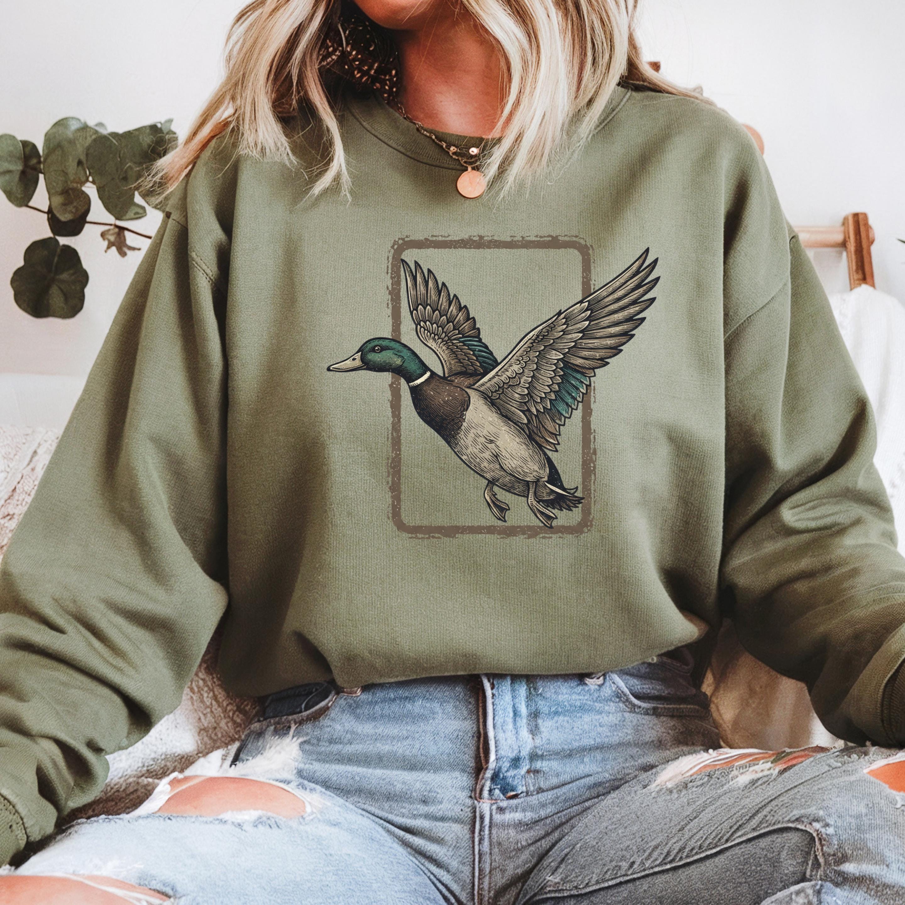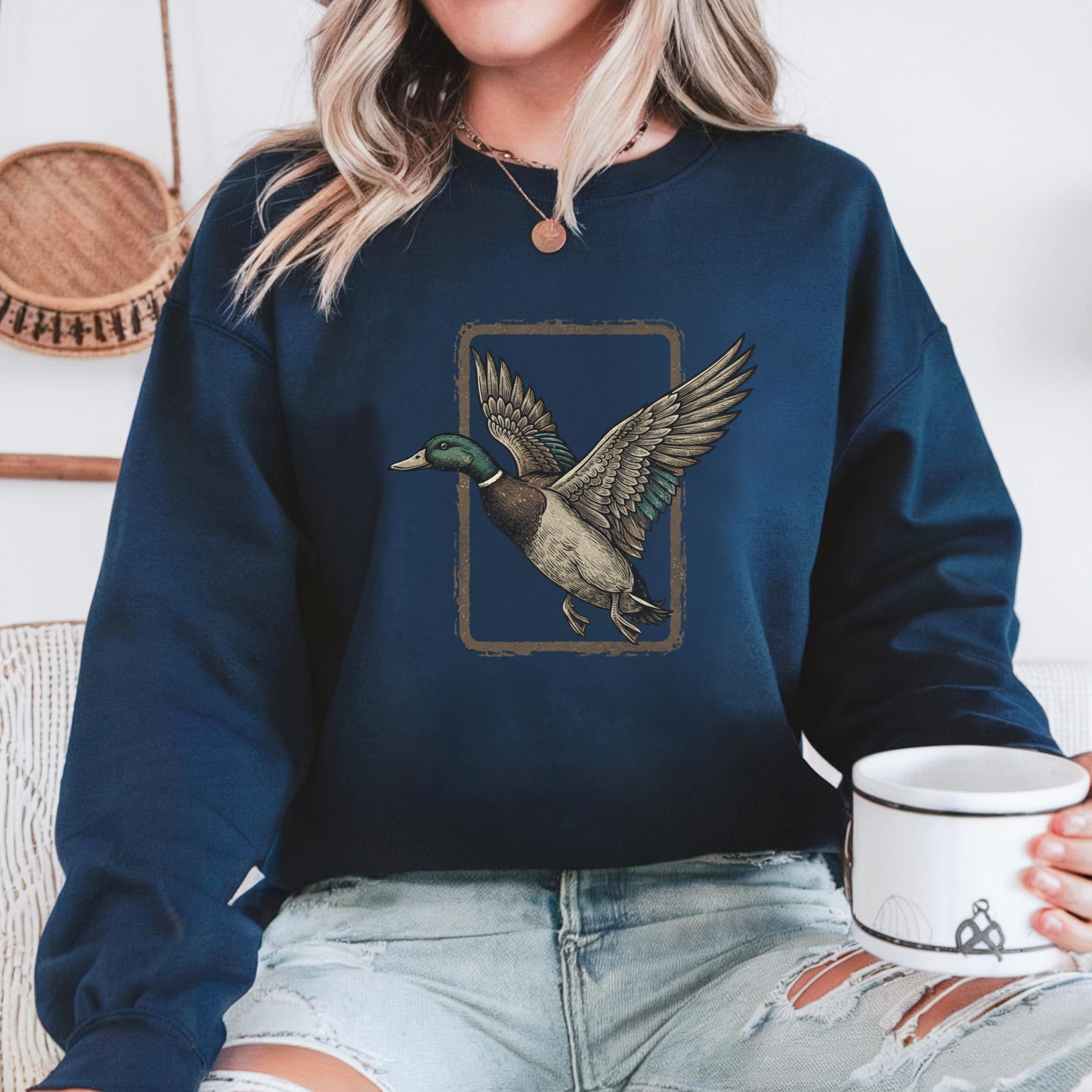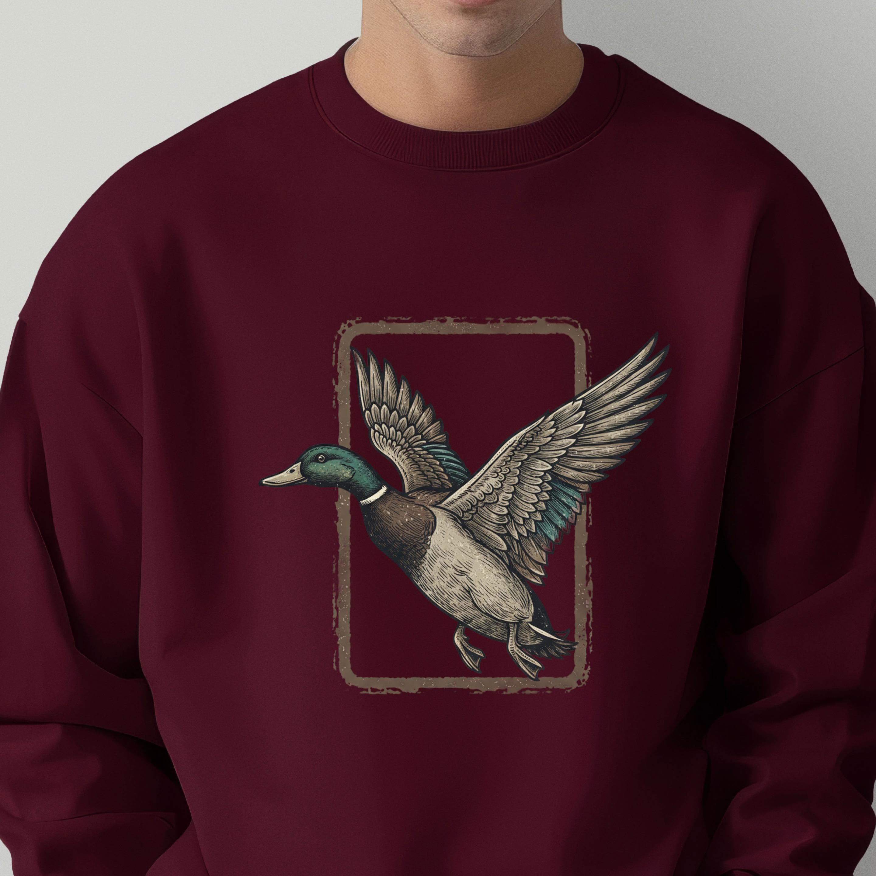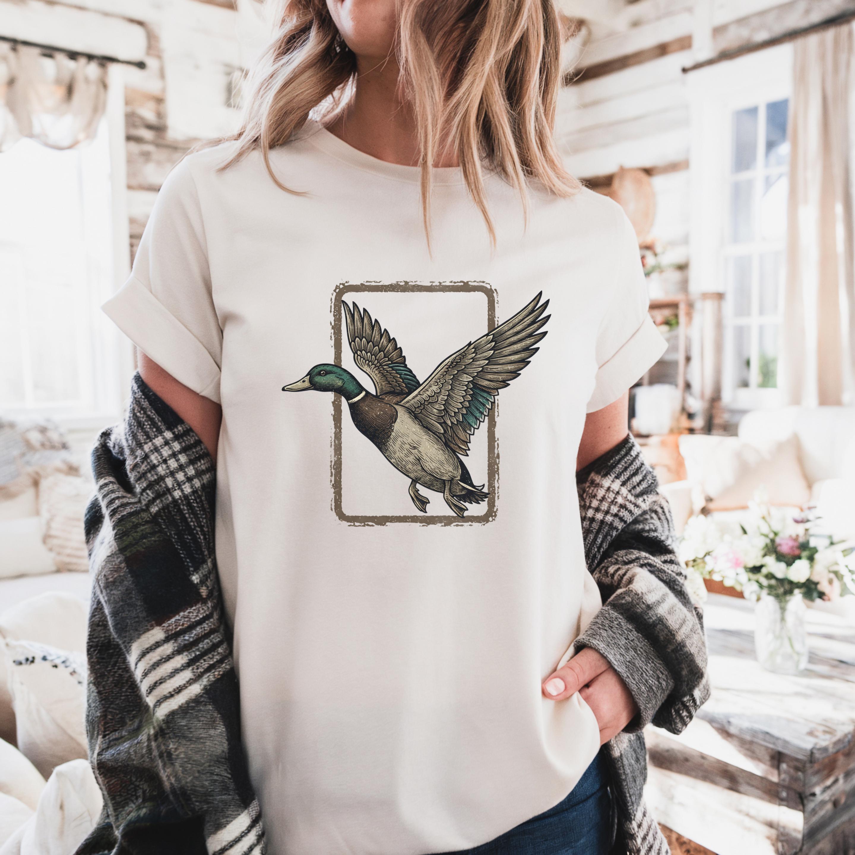 This elegant design features a beautifully illustrated flying mallard duck framed in a subtle vintage-style border. With its calm earth tones and detailed line work, this piece is perfect for anyone who appreciates nature, birds, and rustic aesthetics.