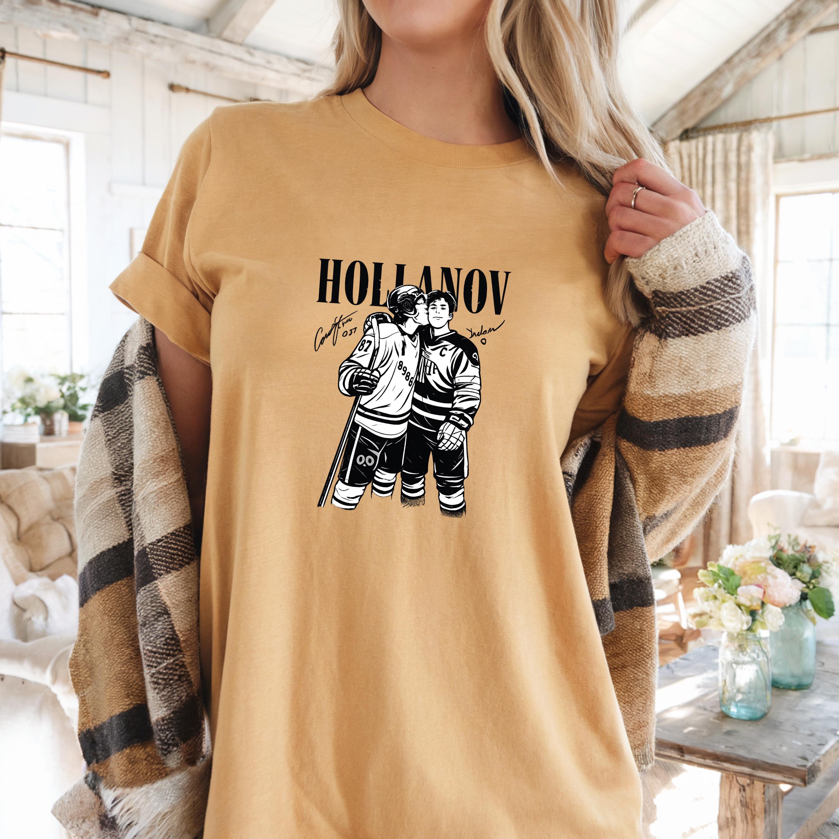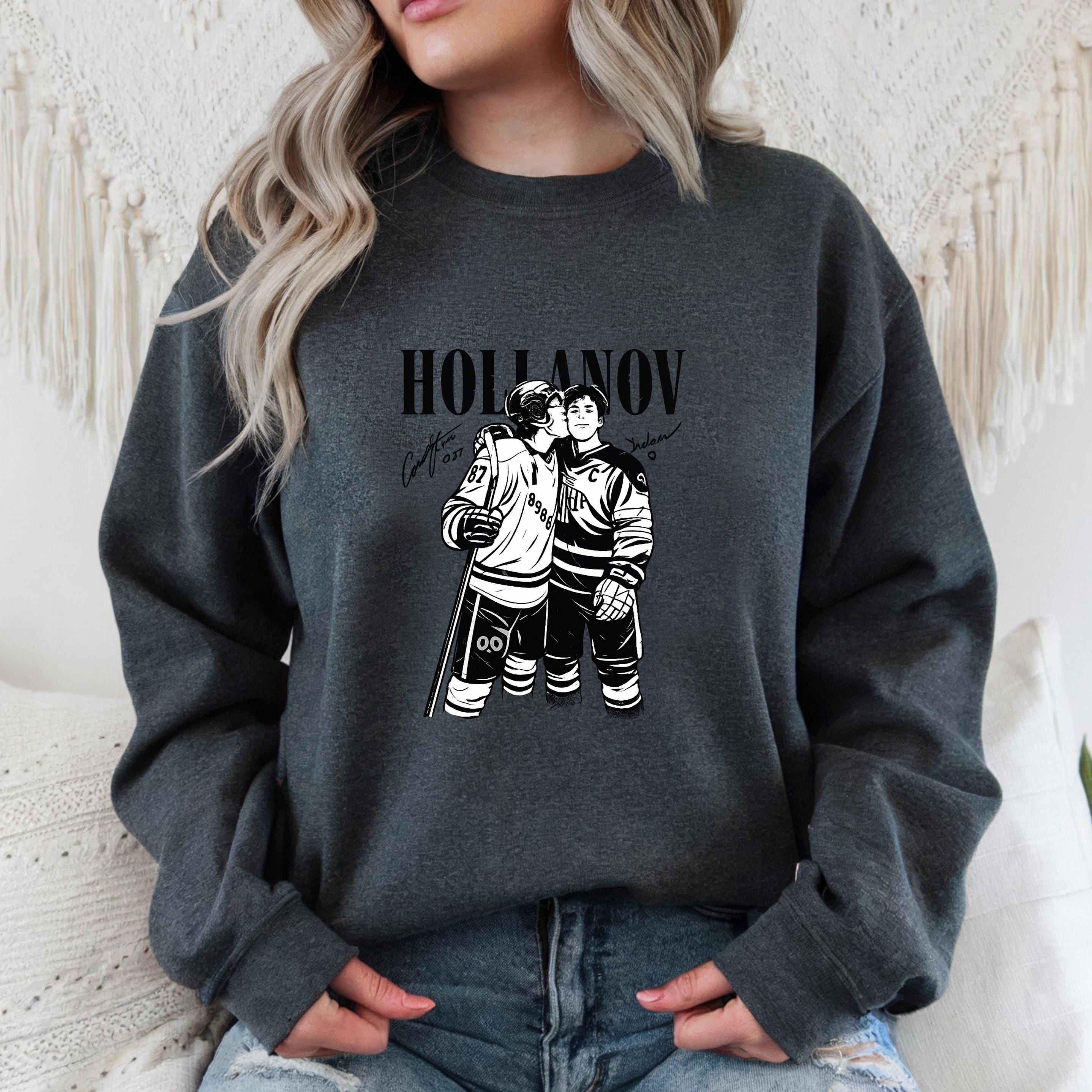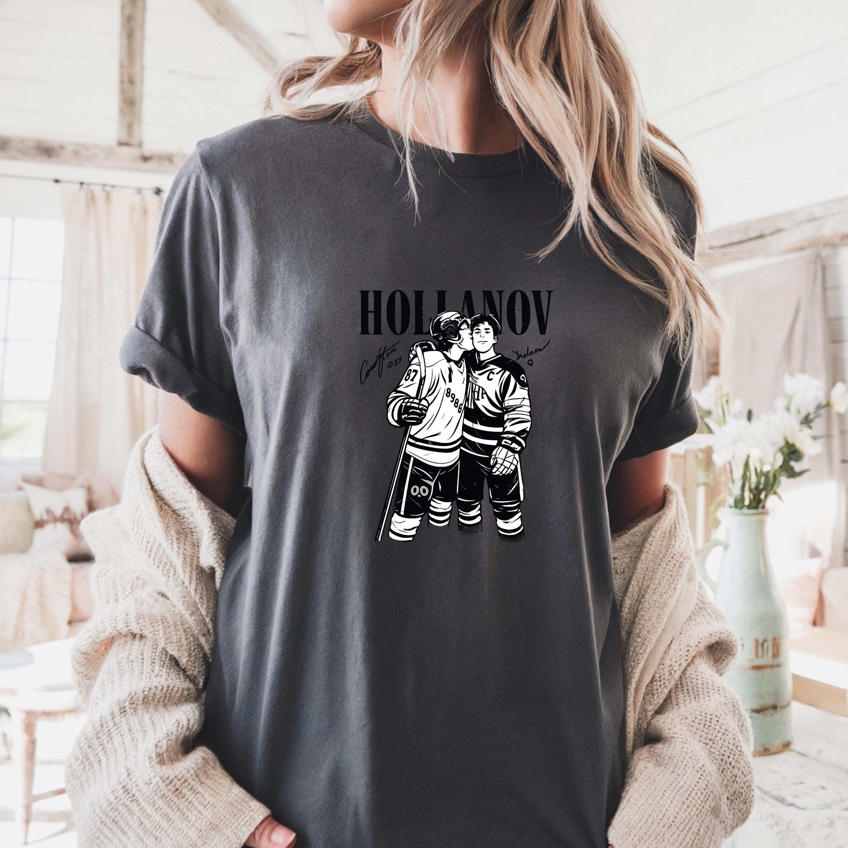 This Hollanov-inspired hockey design captures a tender moment between two players, illustrated in bold black and white with a clean, high-contrast style. The intimate pose speaks to trust, love, and the emotional side of competitive sports, making it perfect for fans of hockey romance and MM love stories.