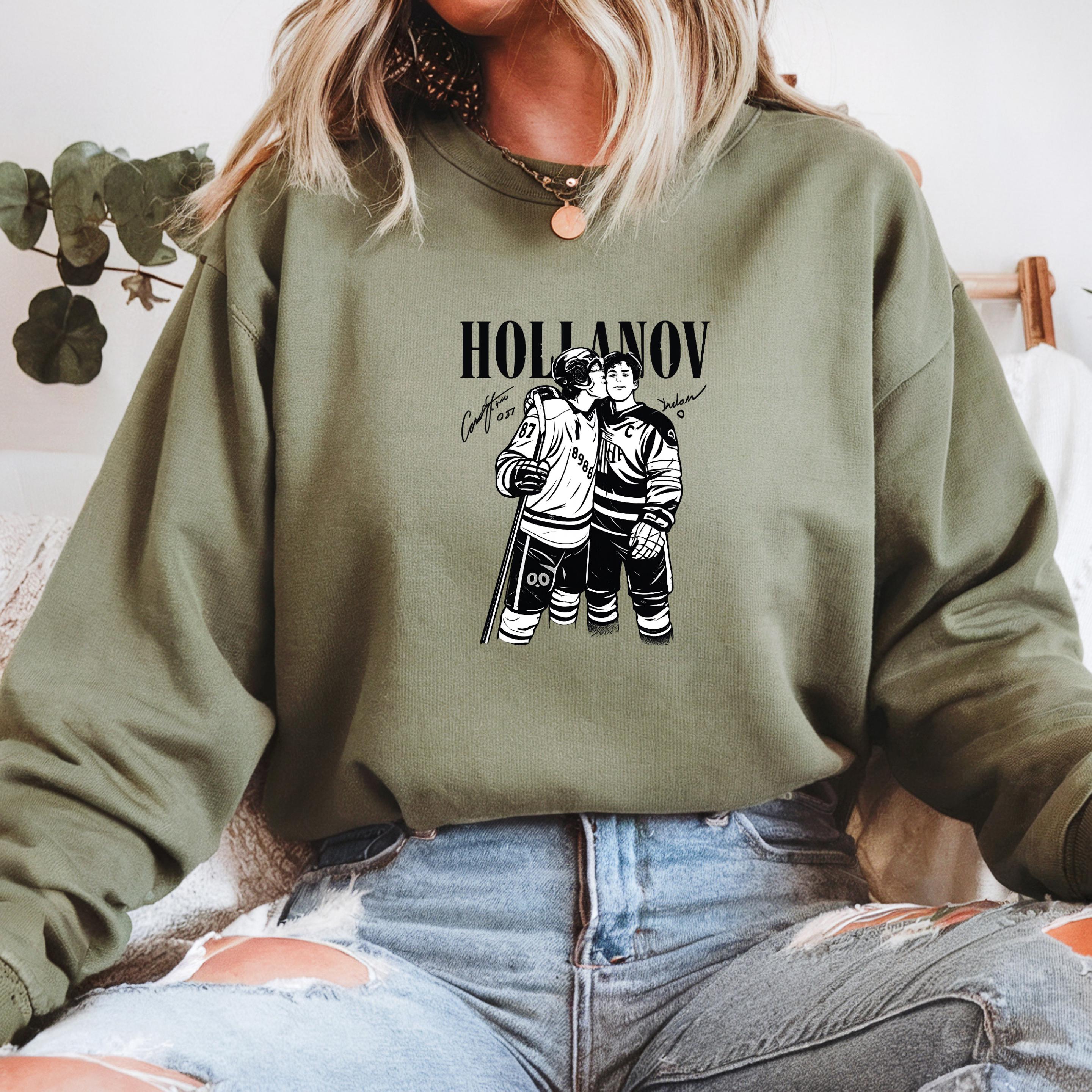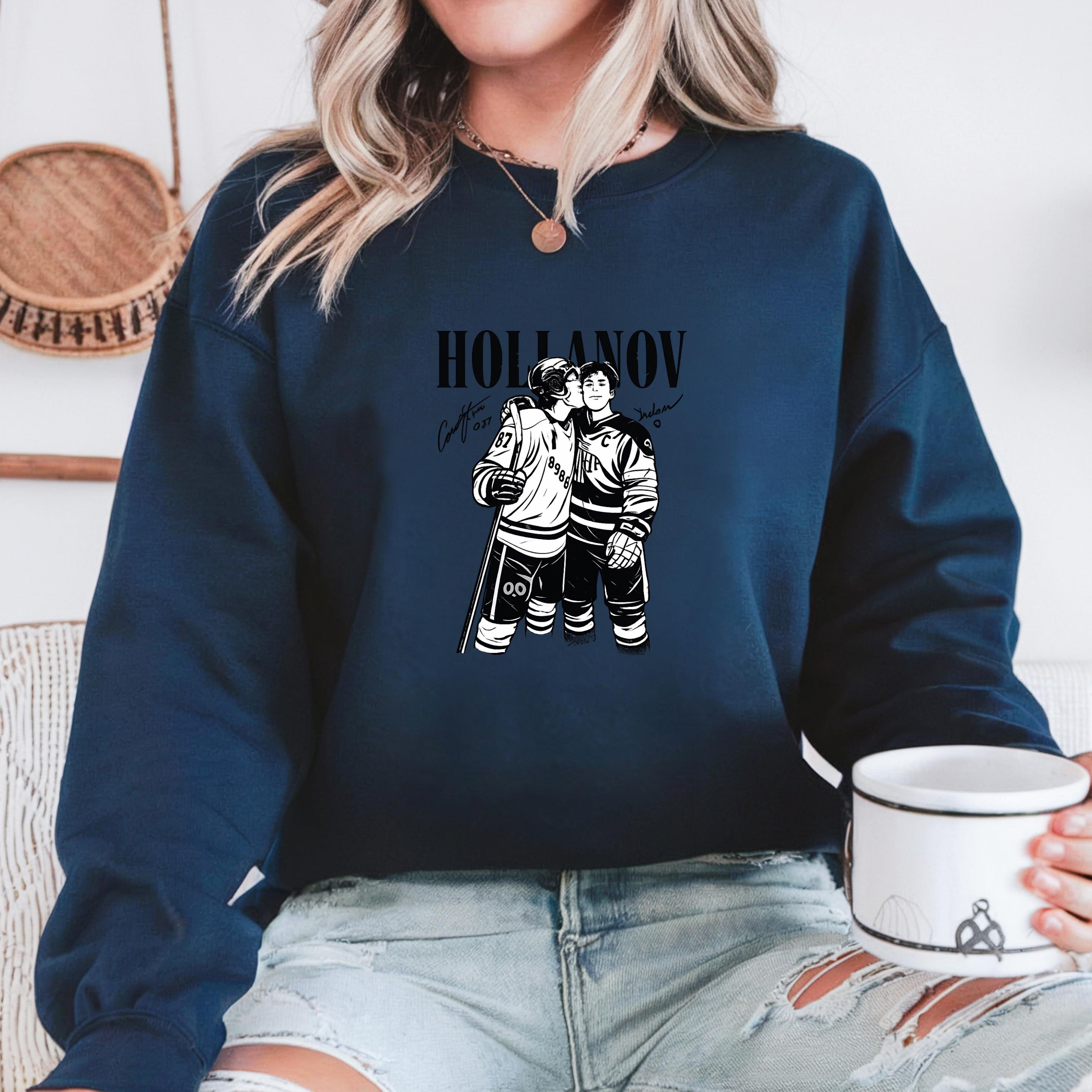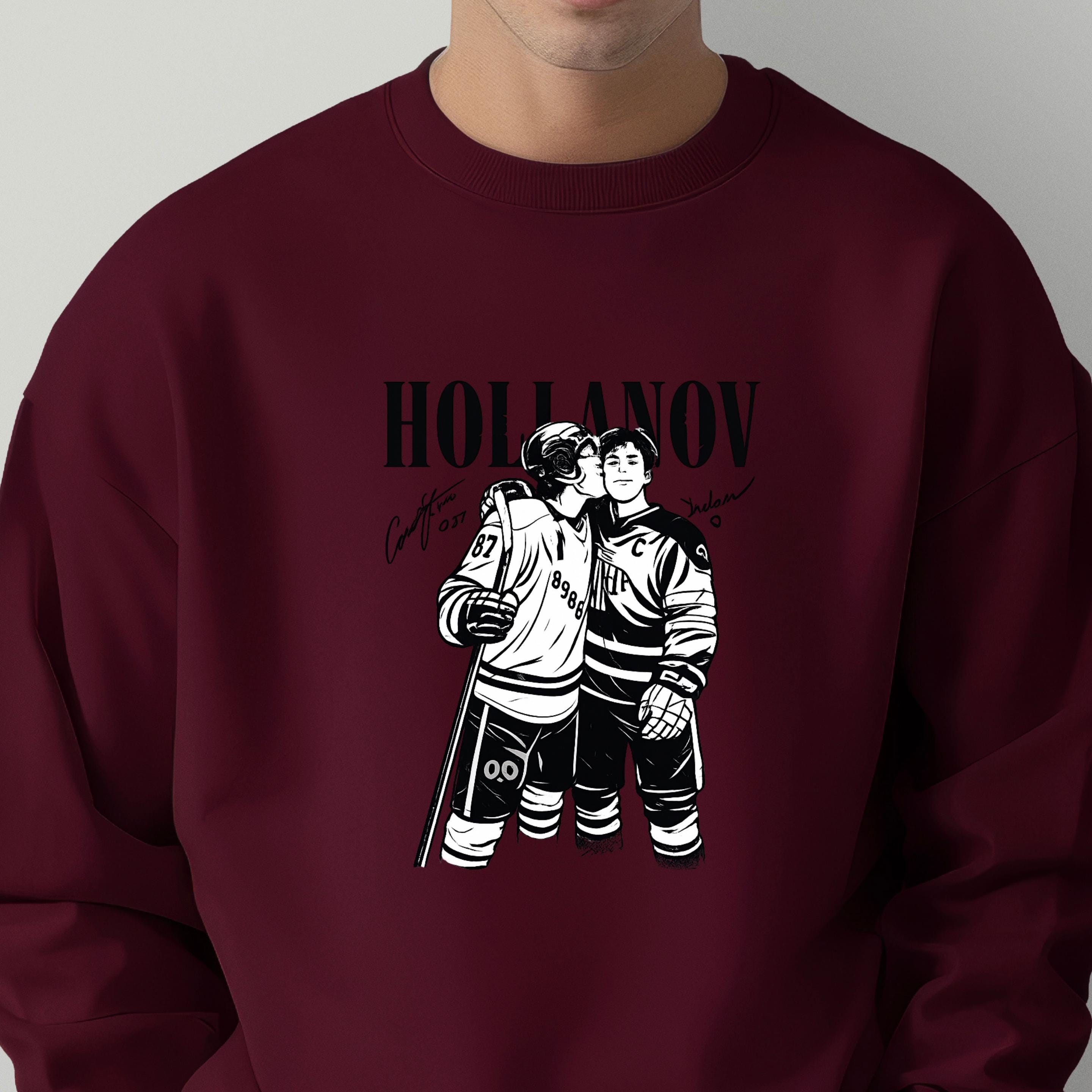 This Hollanov-inspired hockey design captures a tender moment between two players, illustrated in bold black and white with a clean, high-contrast style. The intimate pose speaks to trust, love, and the emotional side of competitive sports, making it perfect for fans of hockey romance and MM love stories.