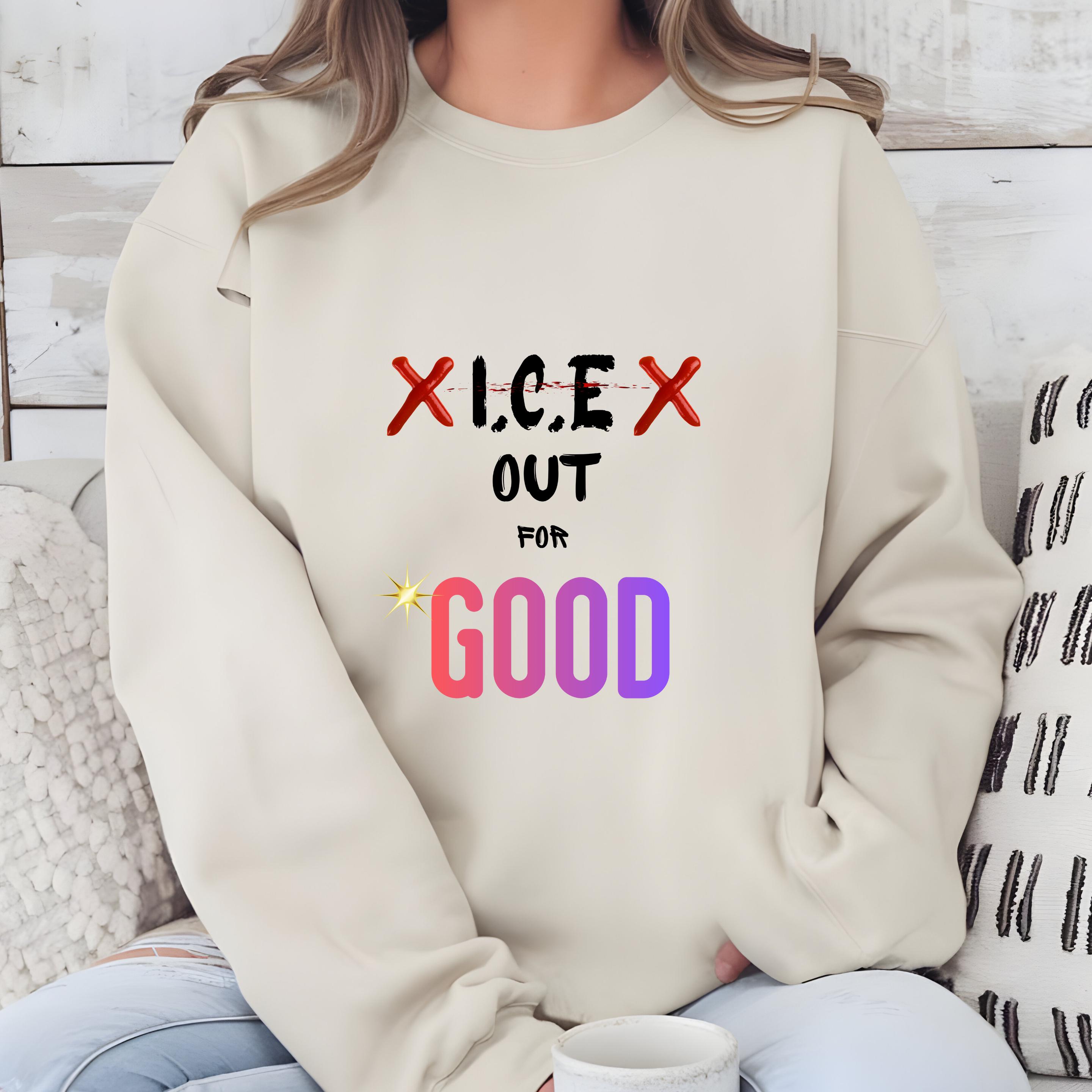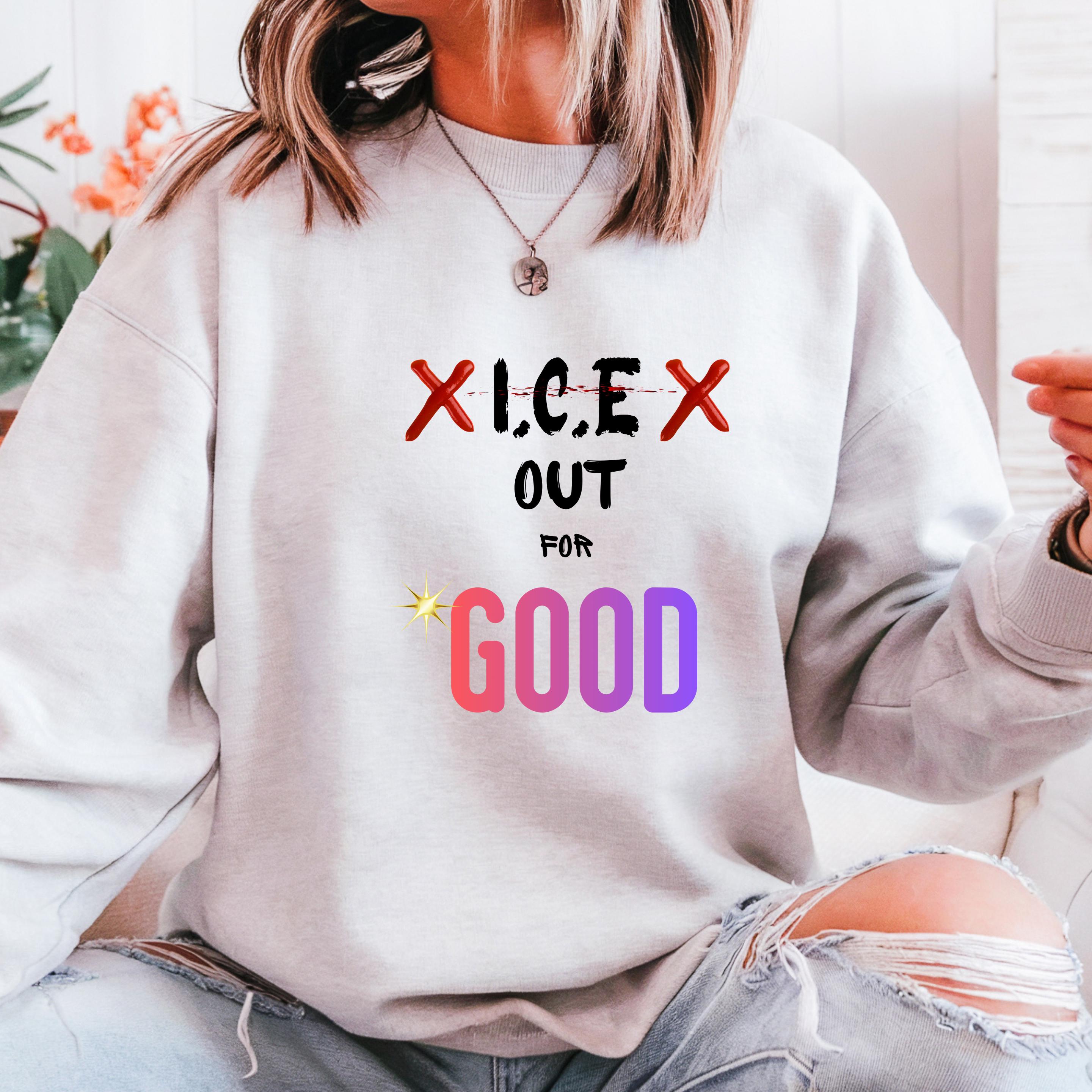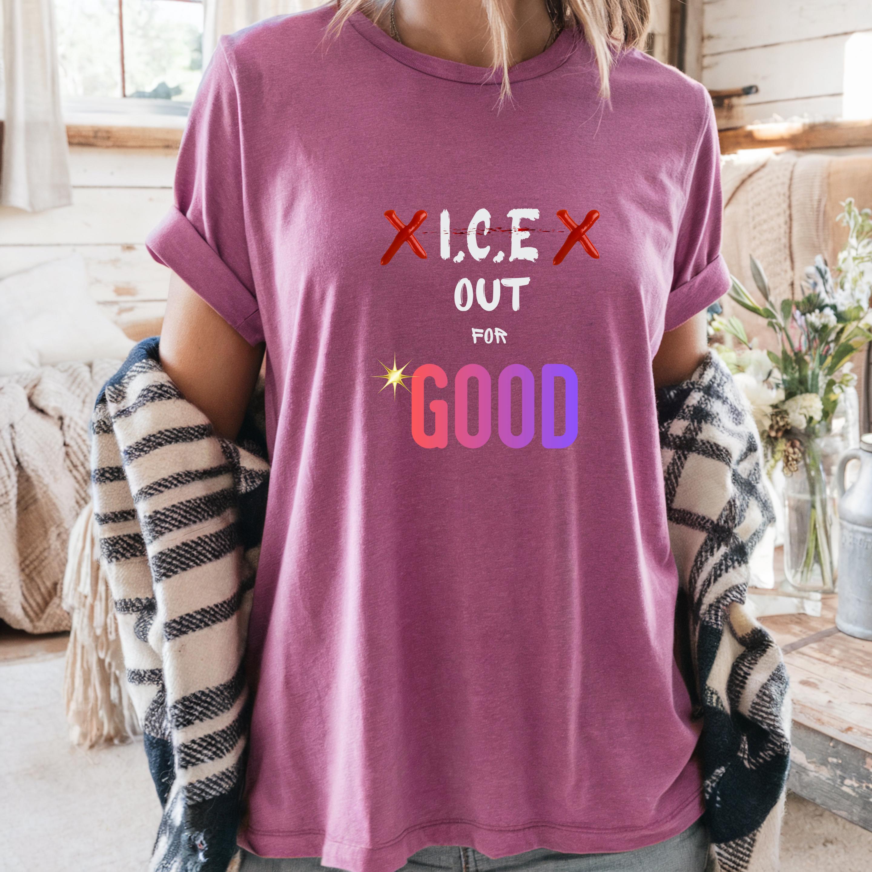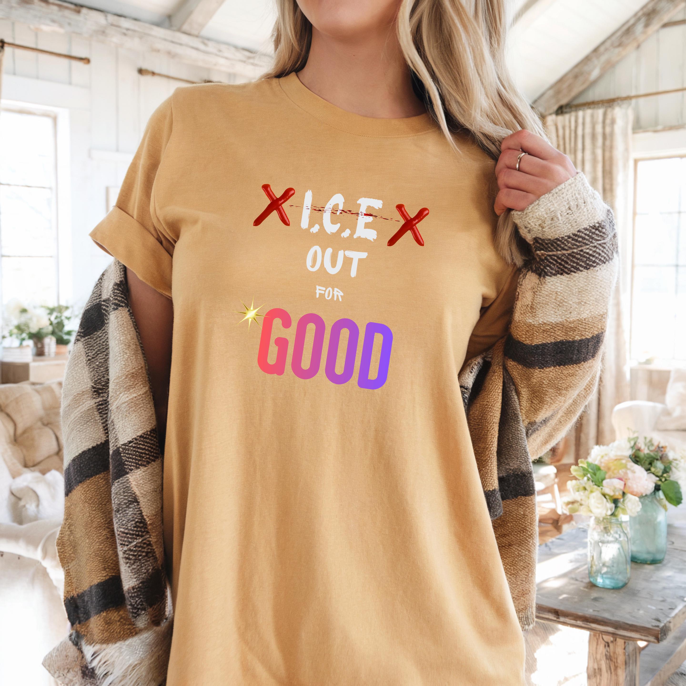 Featuring the bold phrase “ICE Out For Good” along with Renee Nicole Good’s name, this design honors a life lost and stands in solidarity with families and communities affected by injustice. The powerful typography and striking colors turn this piece into a wearable form of protest and love.