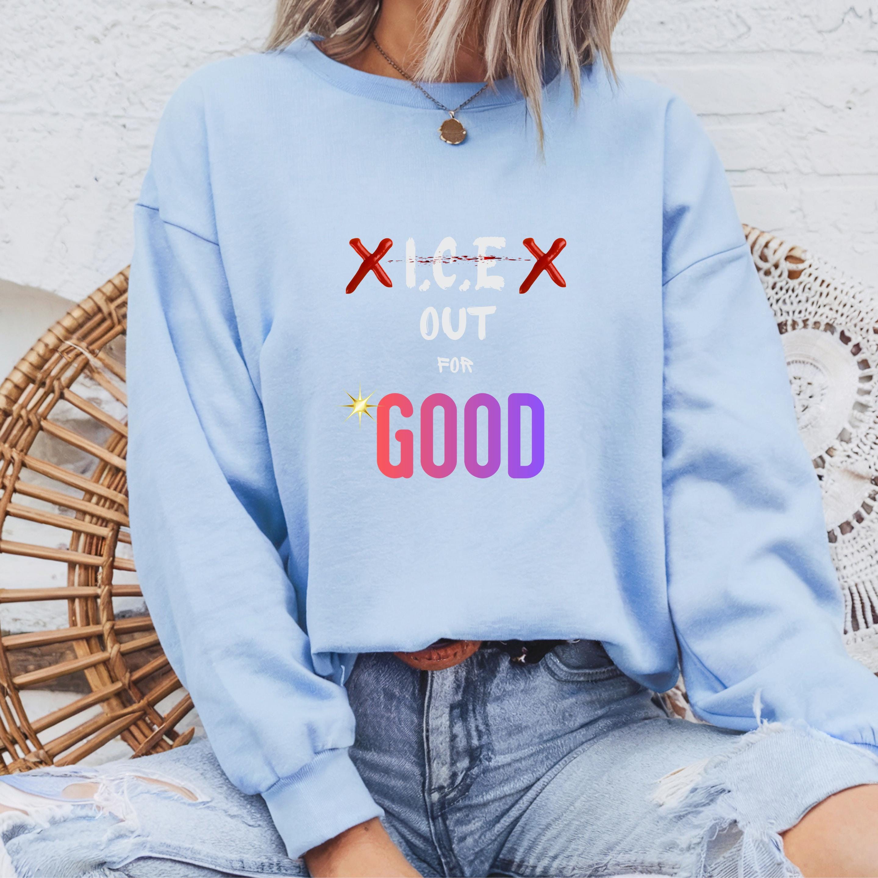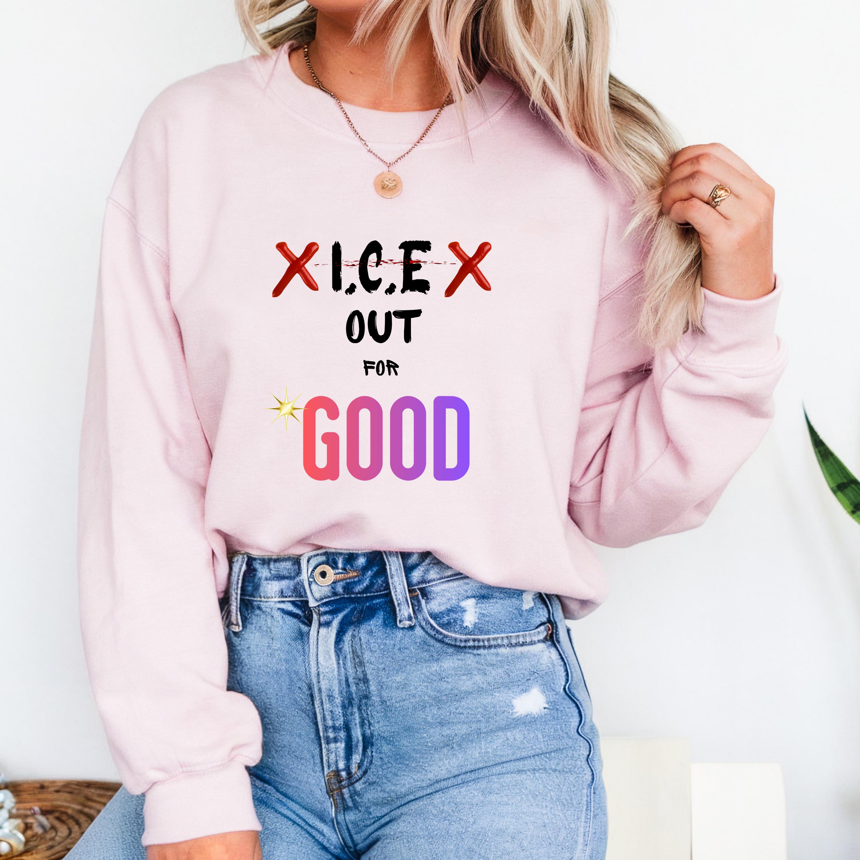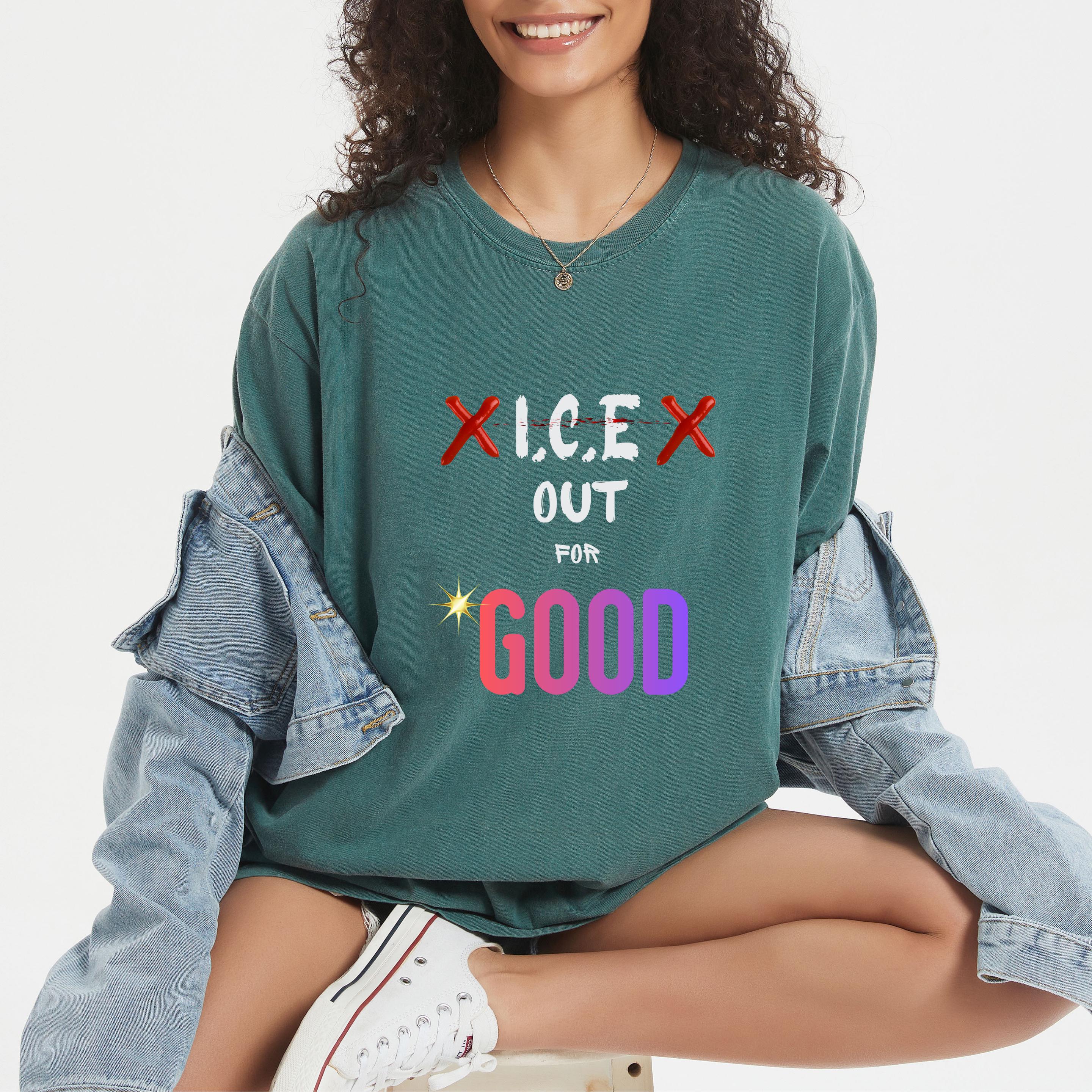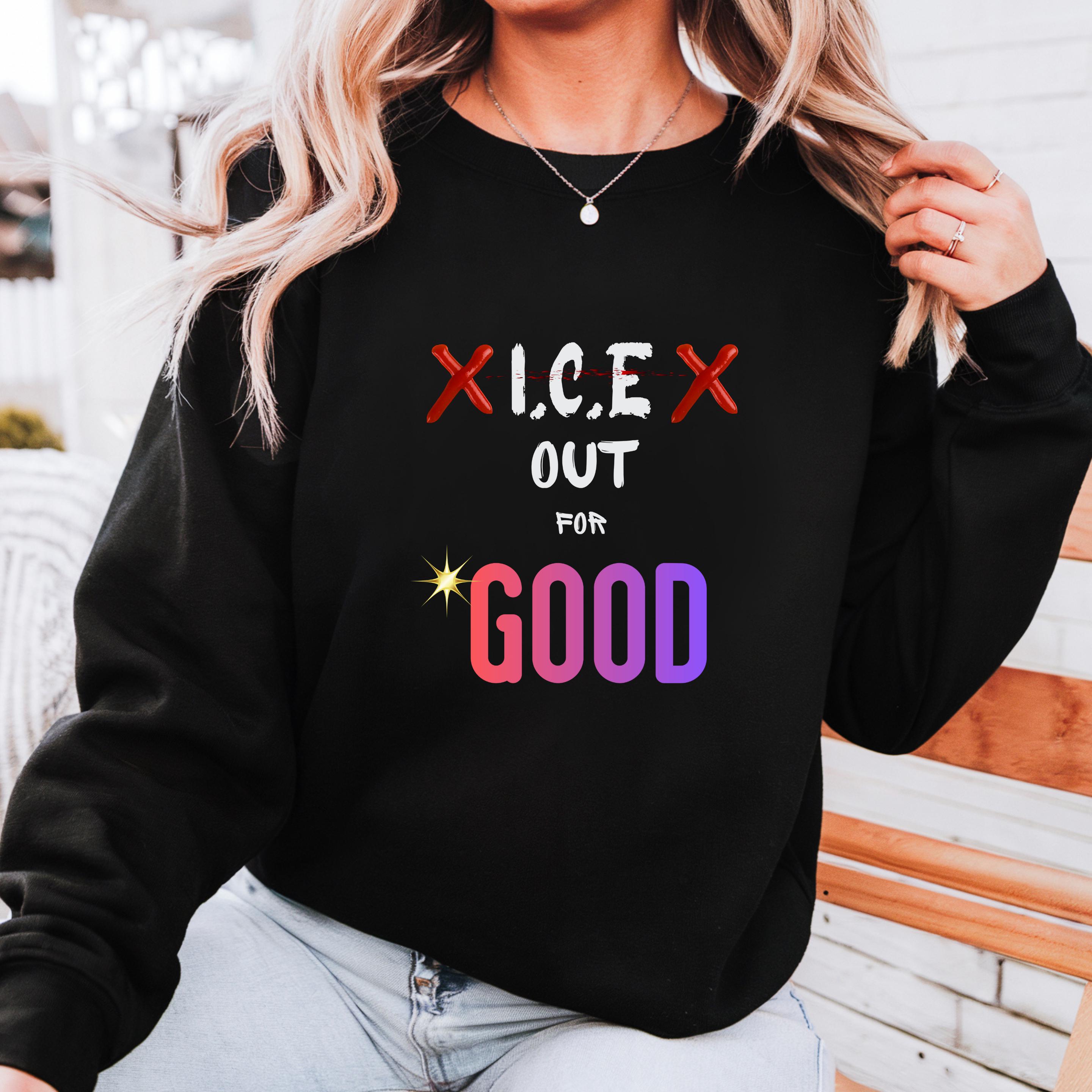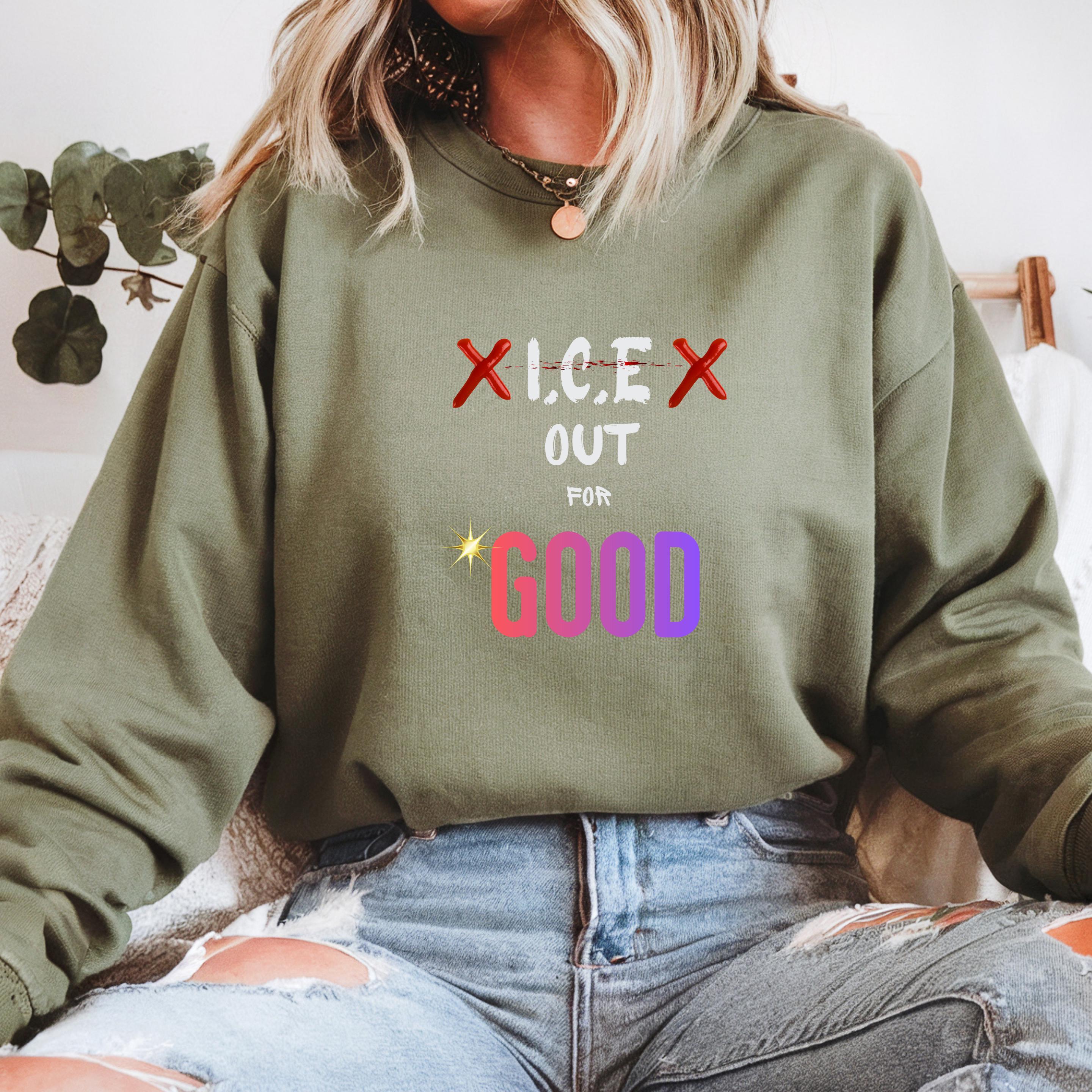 Featuring the bold phrase “ICE Out For Good” along with Renee Nicole Good’s name, this design honors a life lost and stands in solidarity with families and communities affected by injustice. The powerful typography and striking colors turn this piece into a wearable form of protest and love.