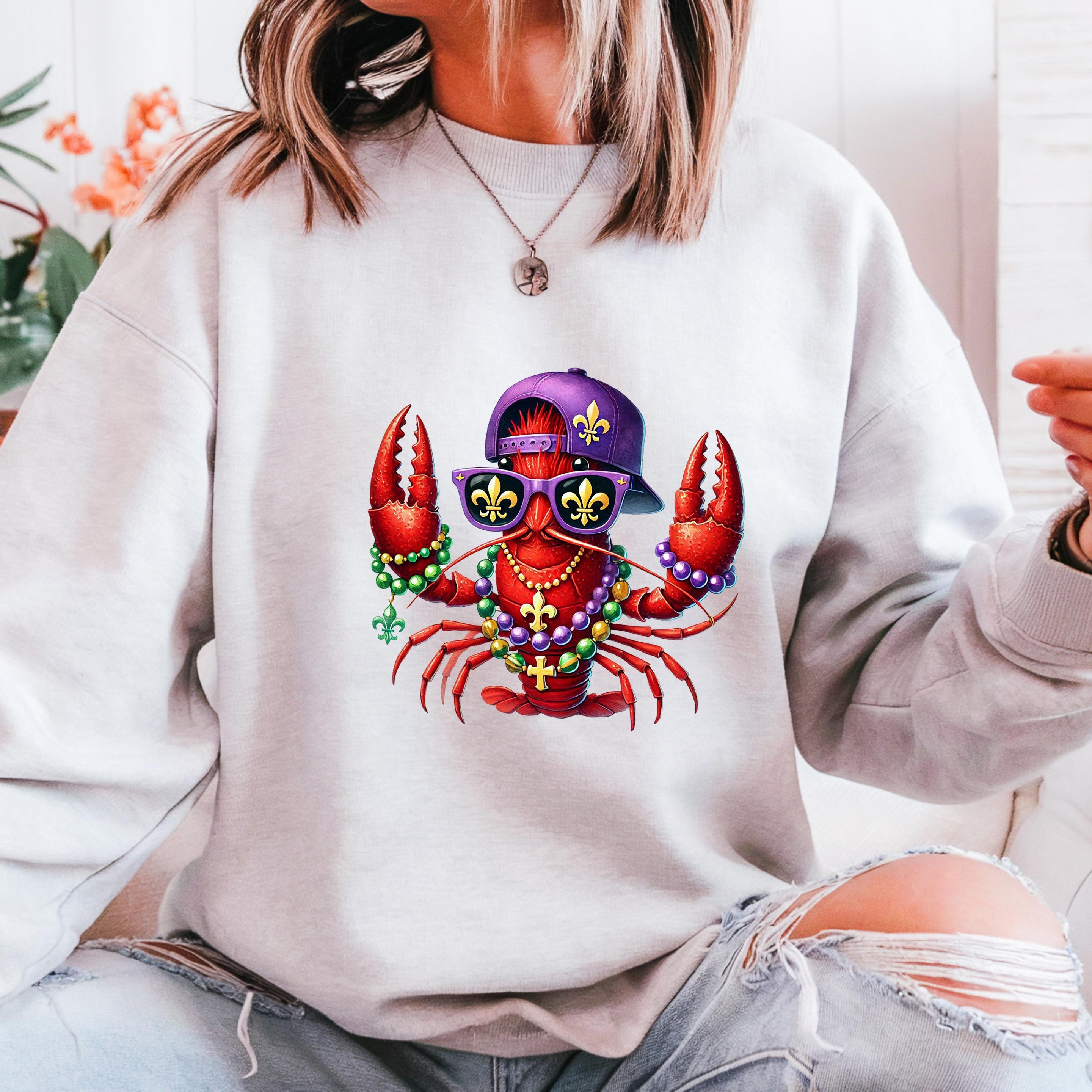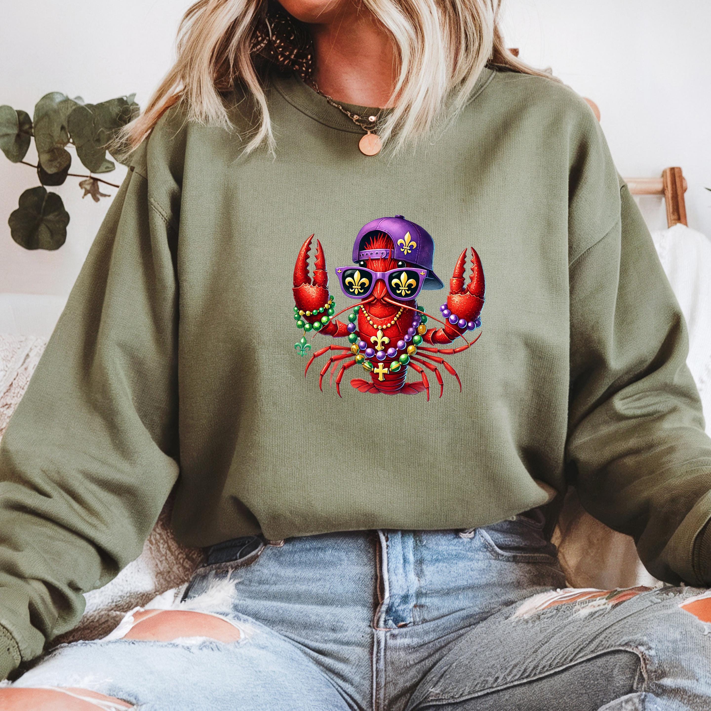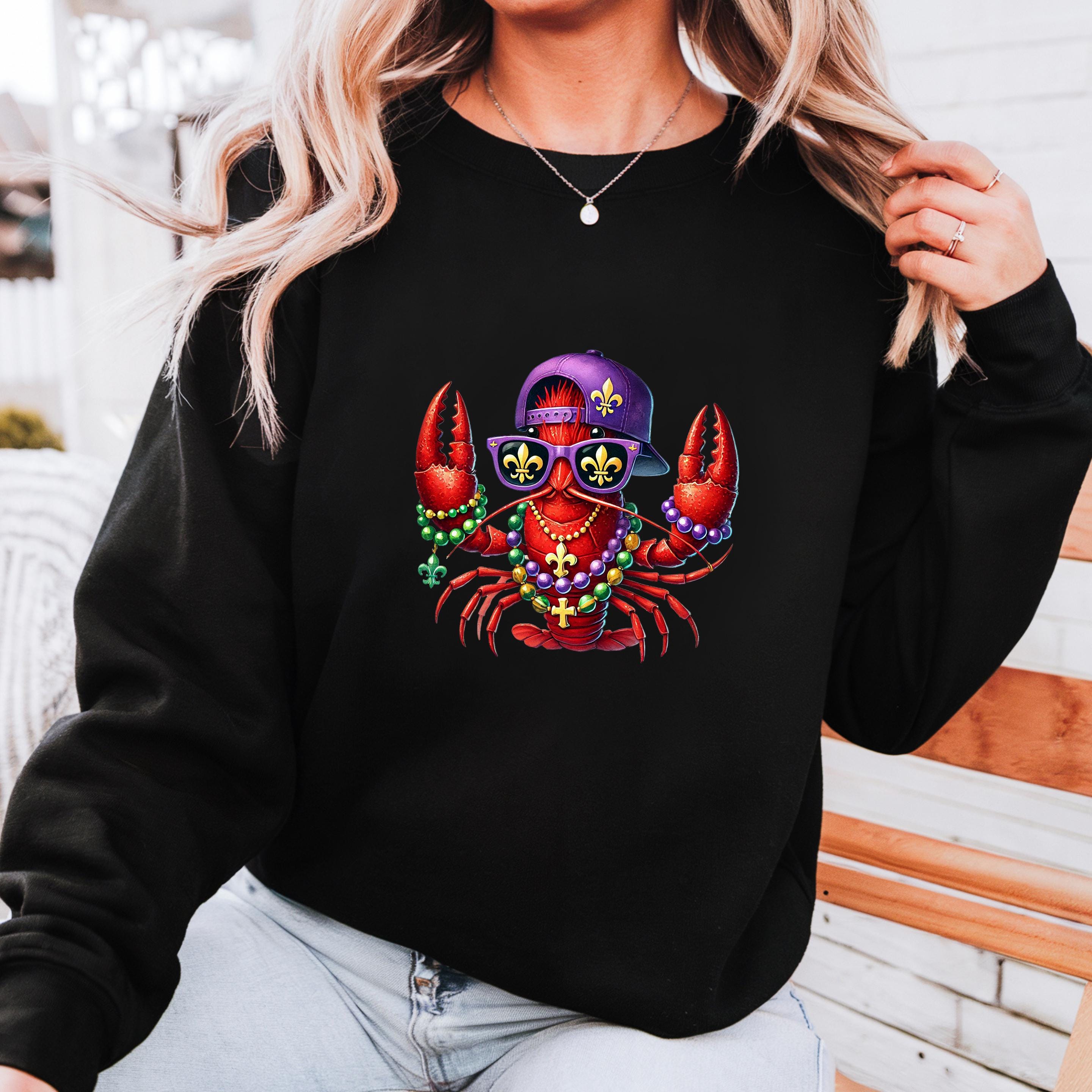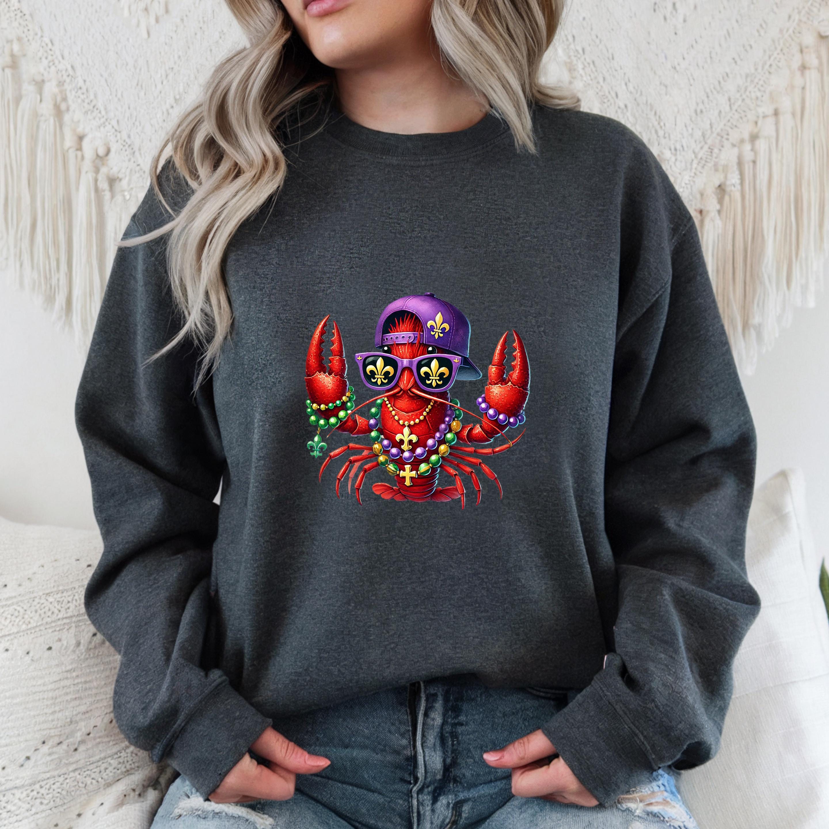 This fun Mardi Gras crawfish sweatshirt features a vibrant printed illustration of a cool crawfish wearing sunglasses, a cap, and classic Mardi Gras beads. Designed with playful details and rich purple, green, and gold accents, this graphic instantly captures the joyful spirit of carnival season.