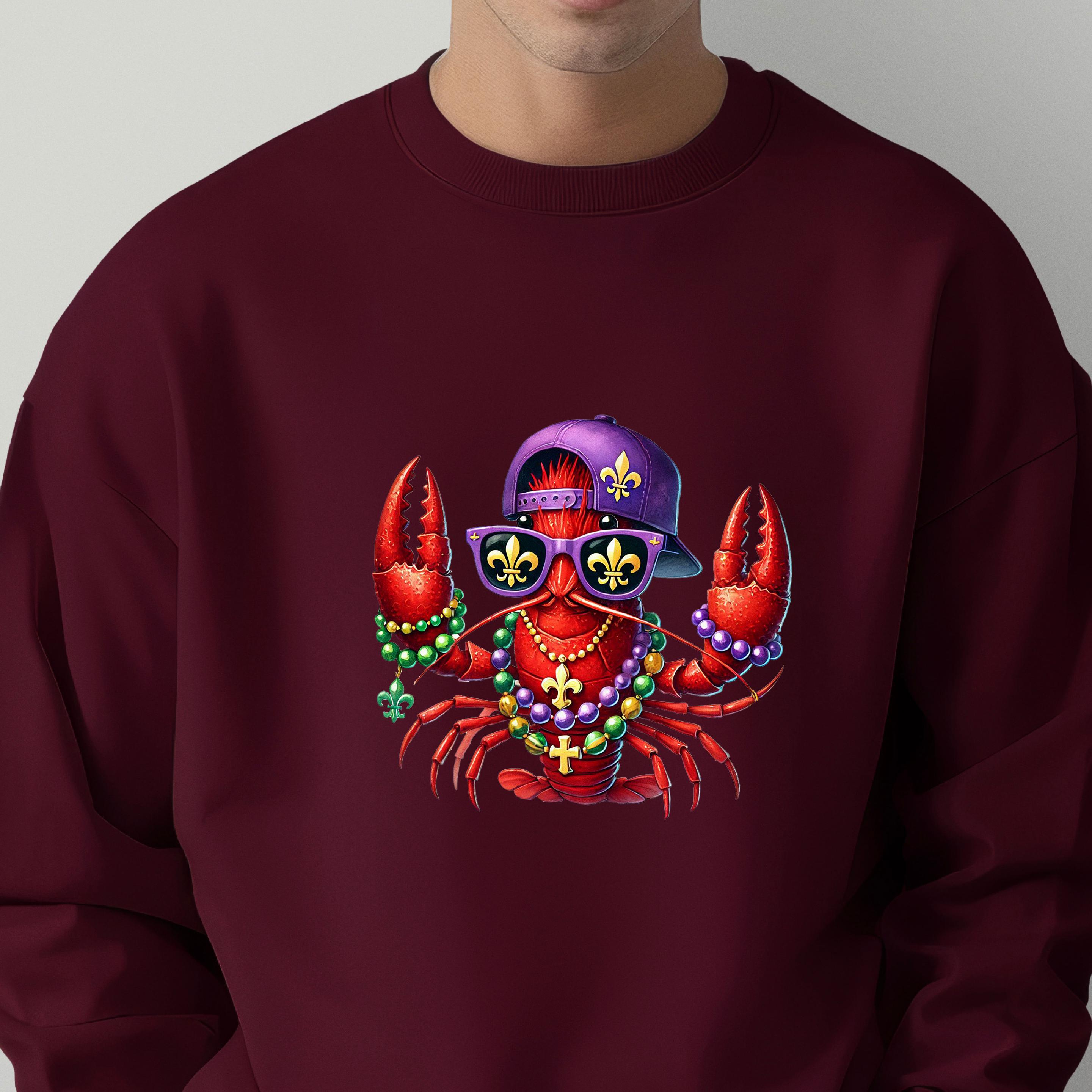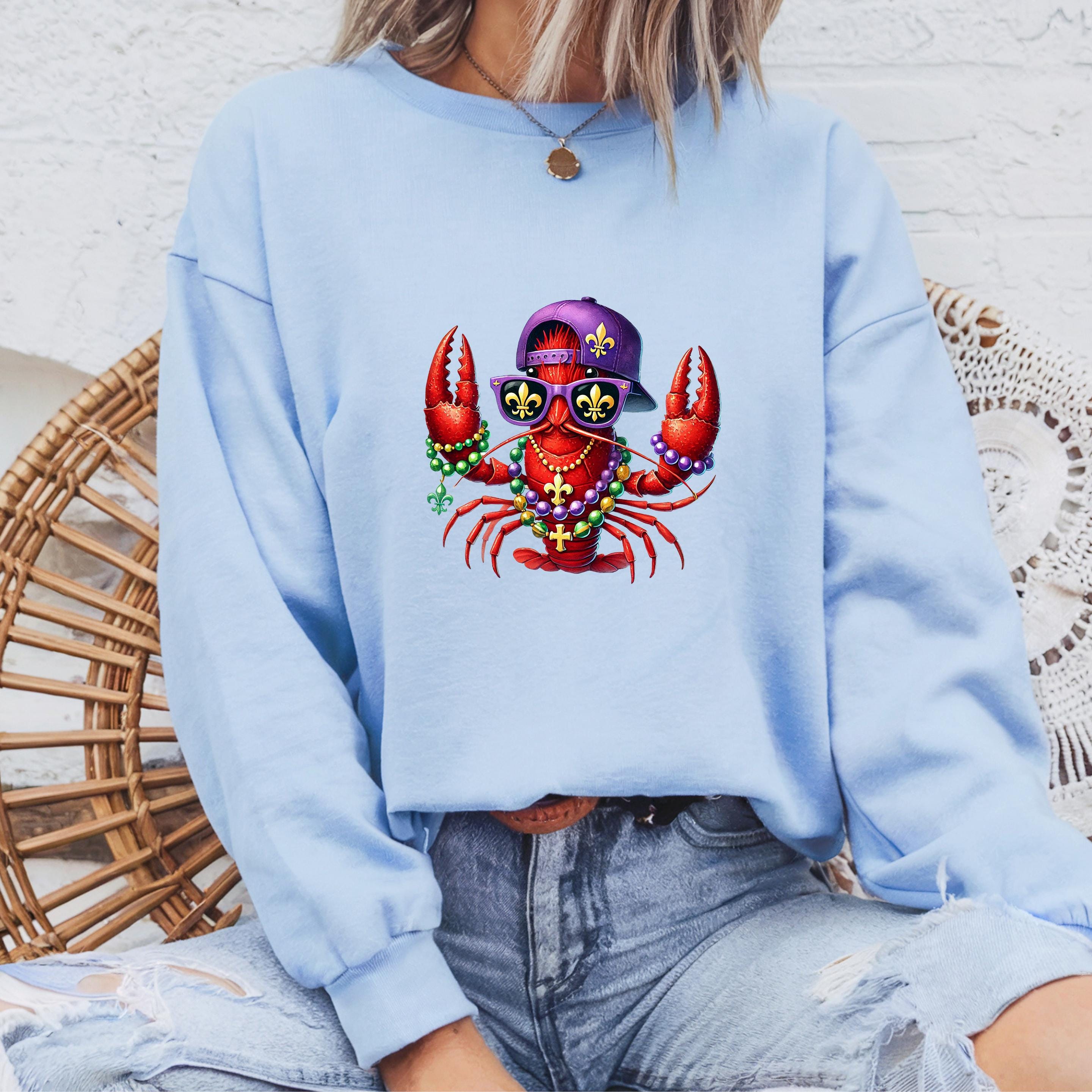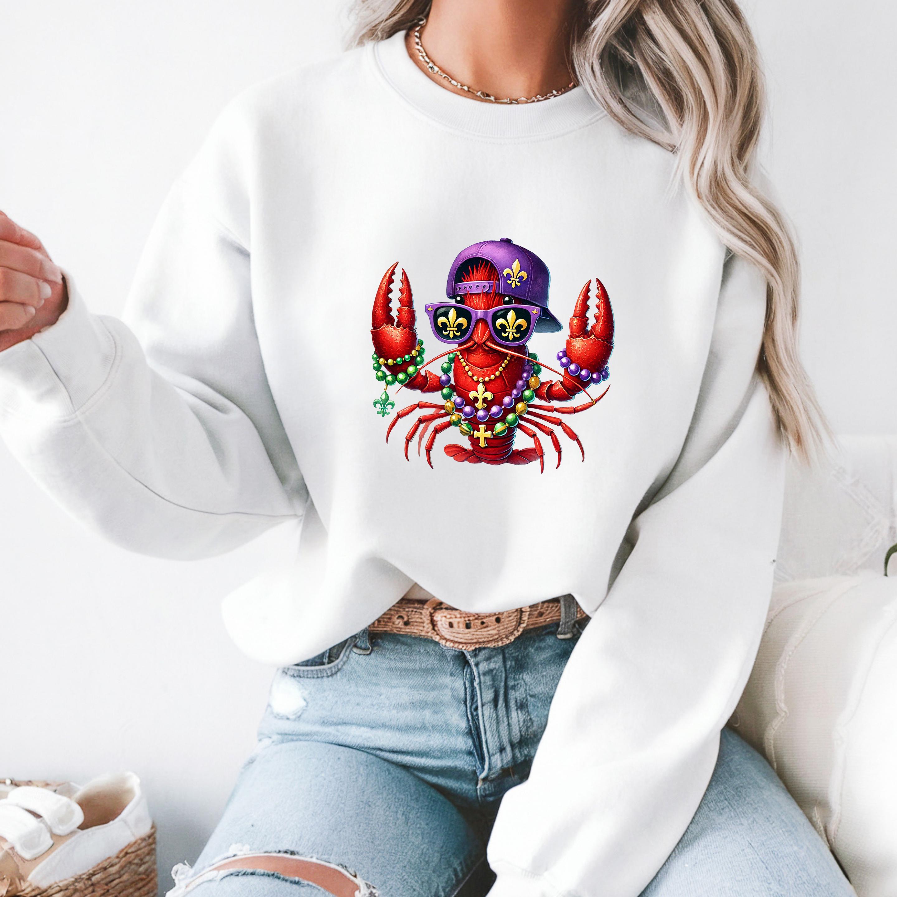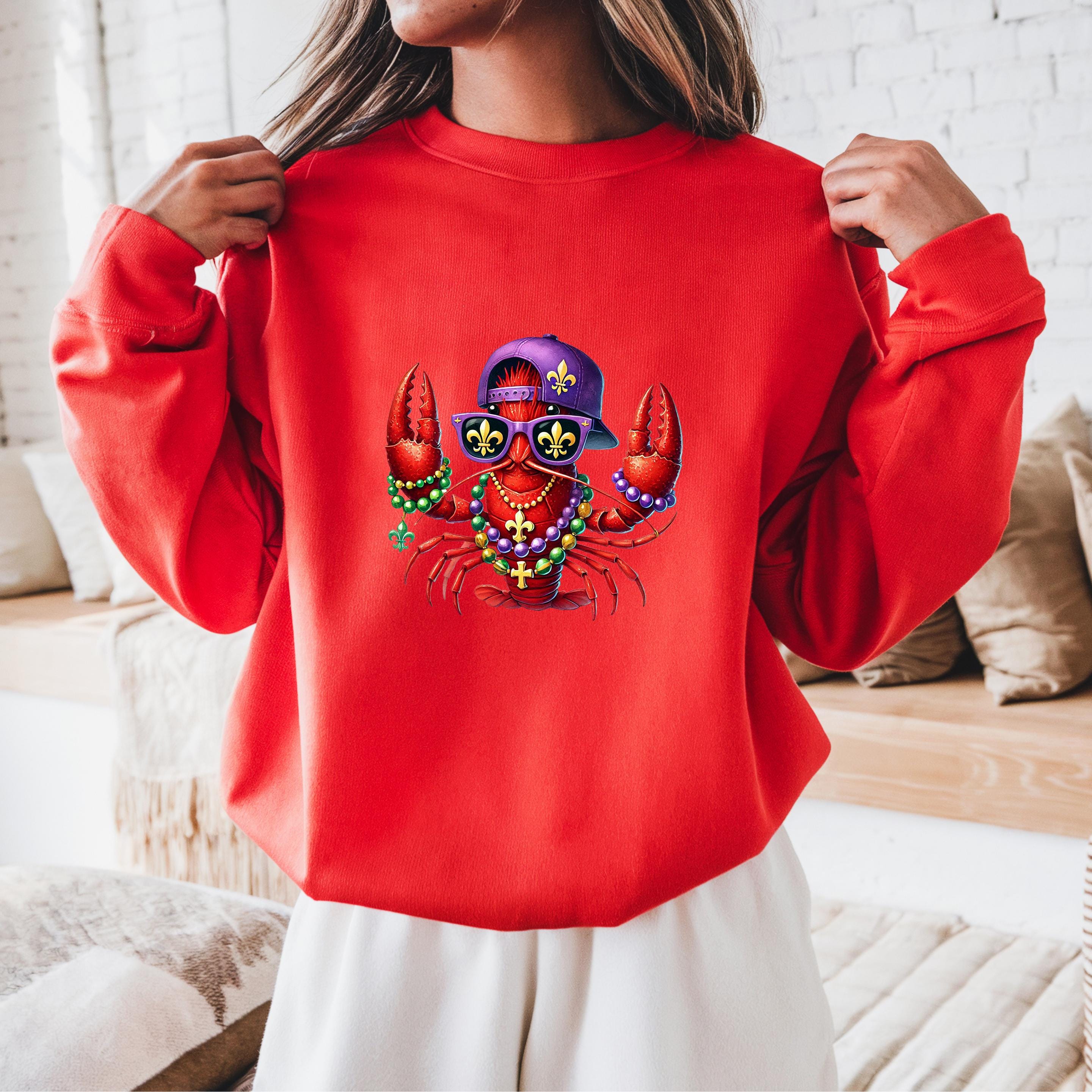 This fun Mardi Gras crawfish sweatshirt features a vibrant printed illustration of a cool crawfish wearing sunglasses, a cap, and classic Mardi Gras beads. Designed with playful details and rich purple, green, and gold accents, this graphic instantly captures the joyful spirit of carnival season.