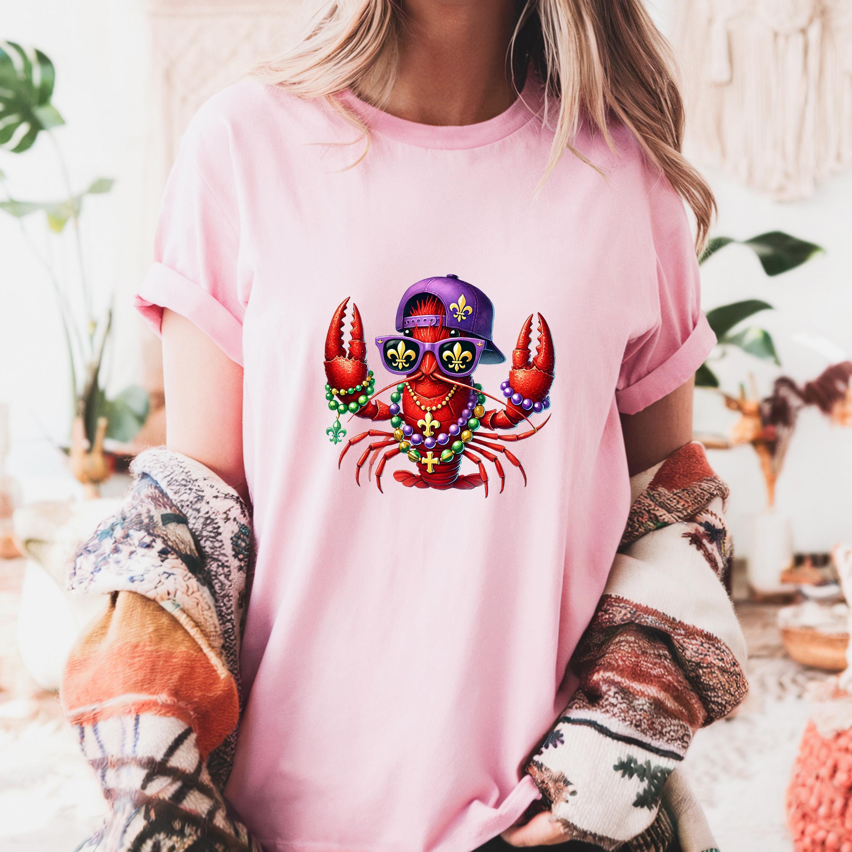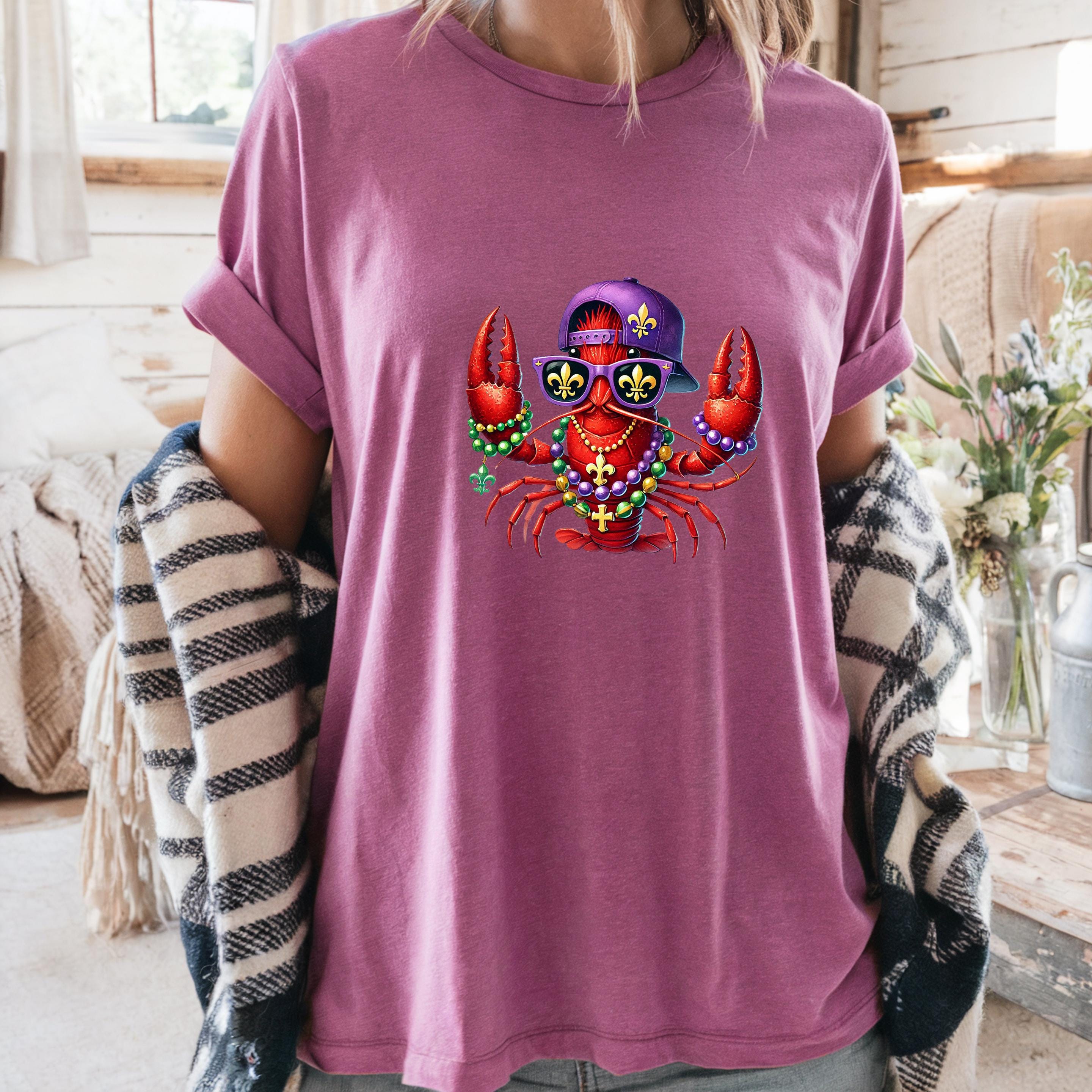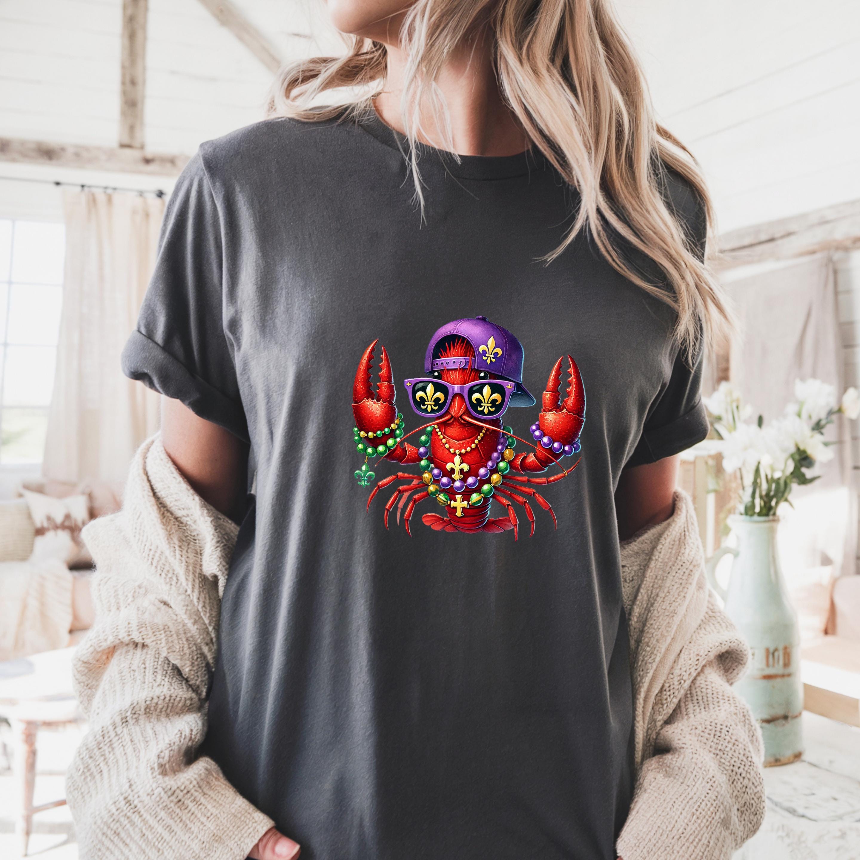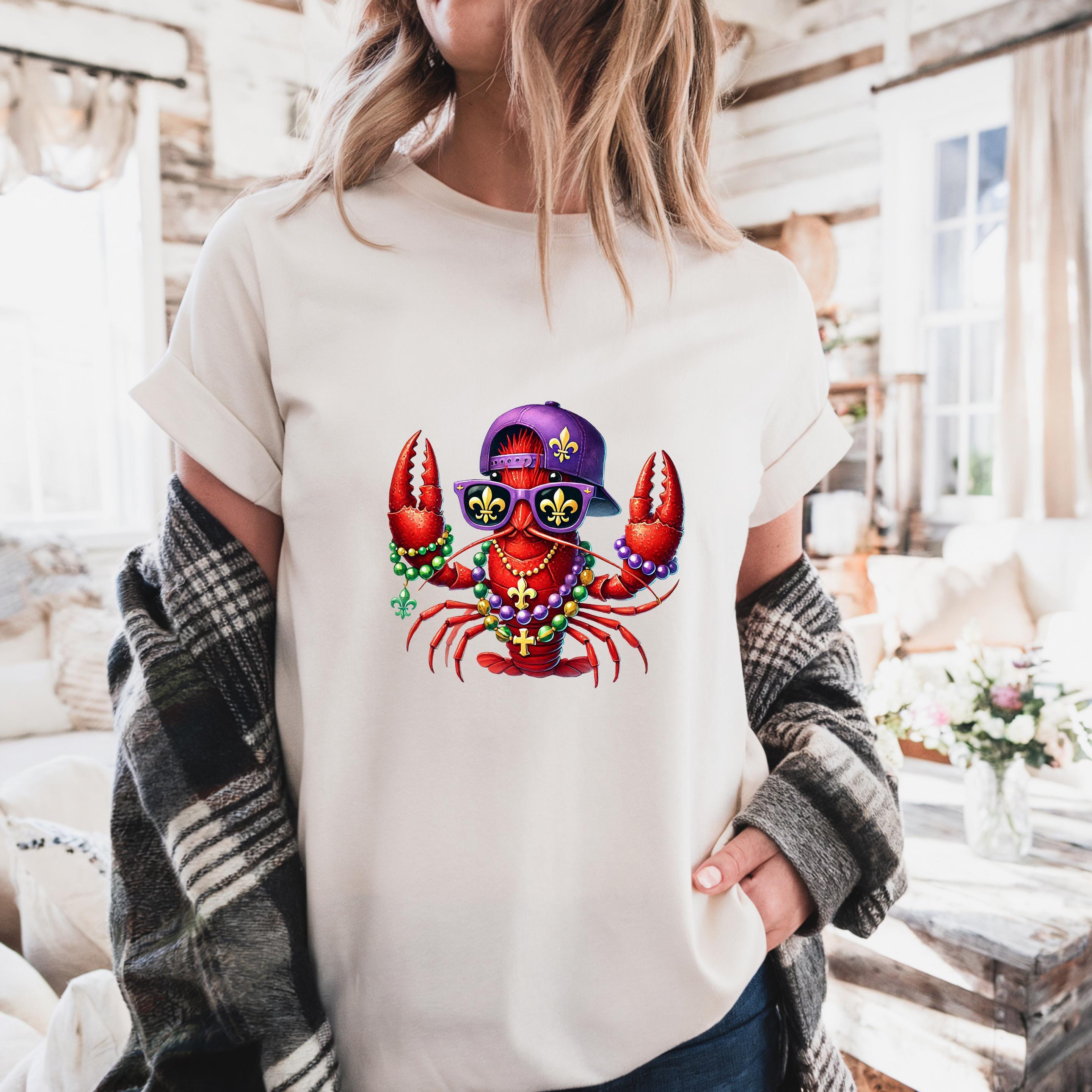 This fun Mardi Gras crawfish sweatshirt features a vibrant printed illustration of a cool crawfish wearing sunglasses, a cap, and classic Mardi Gras beads. Designed with playful details and rich purple, green, and gold accents, this graphic instantly captures the joyful spirit of carnival season.