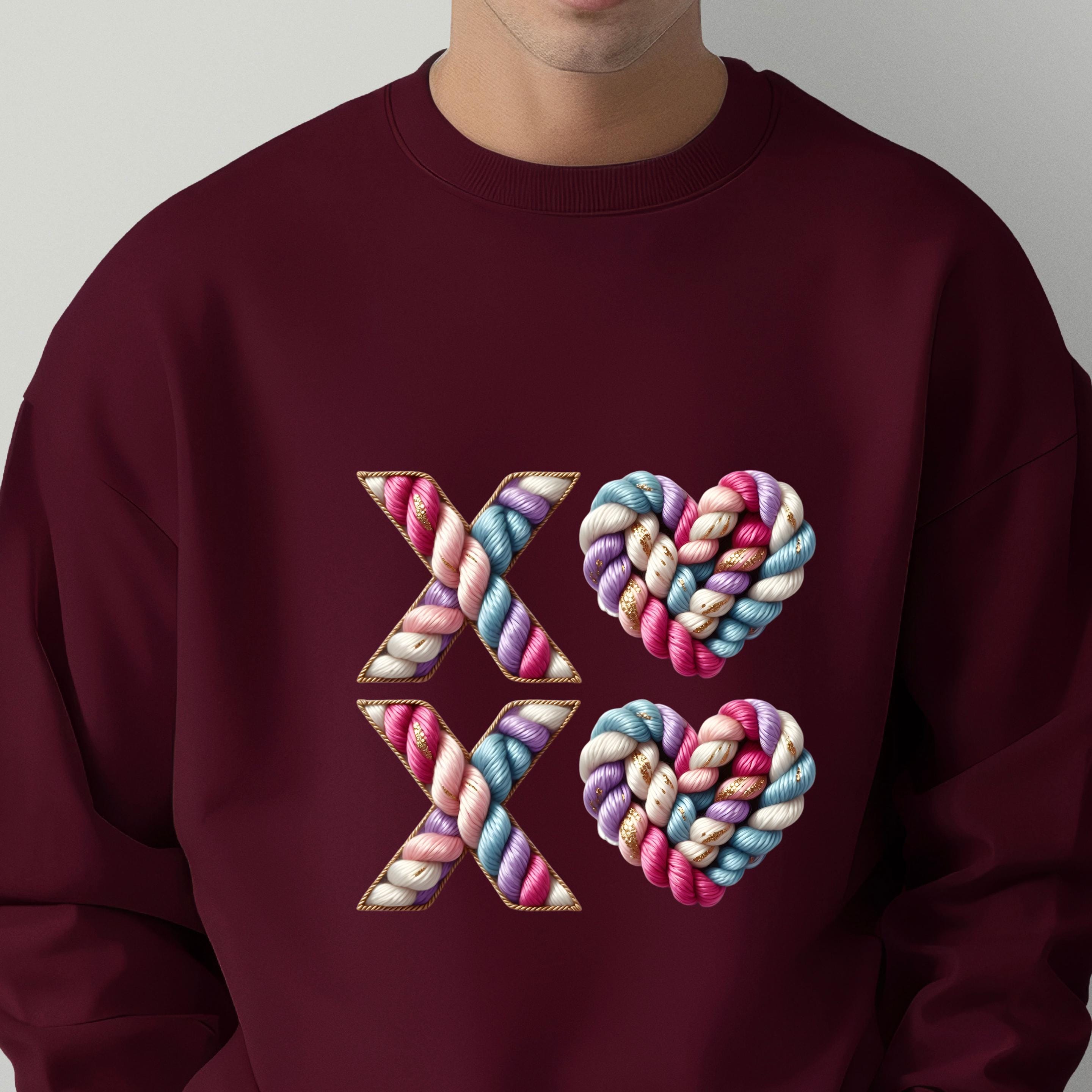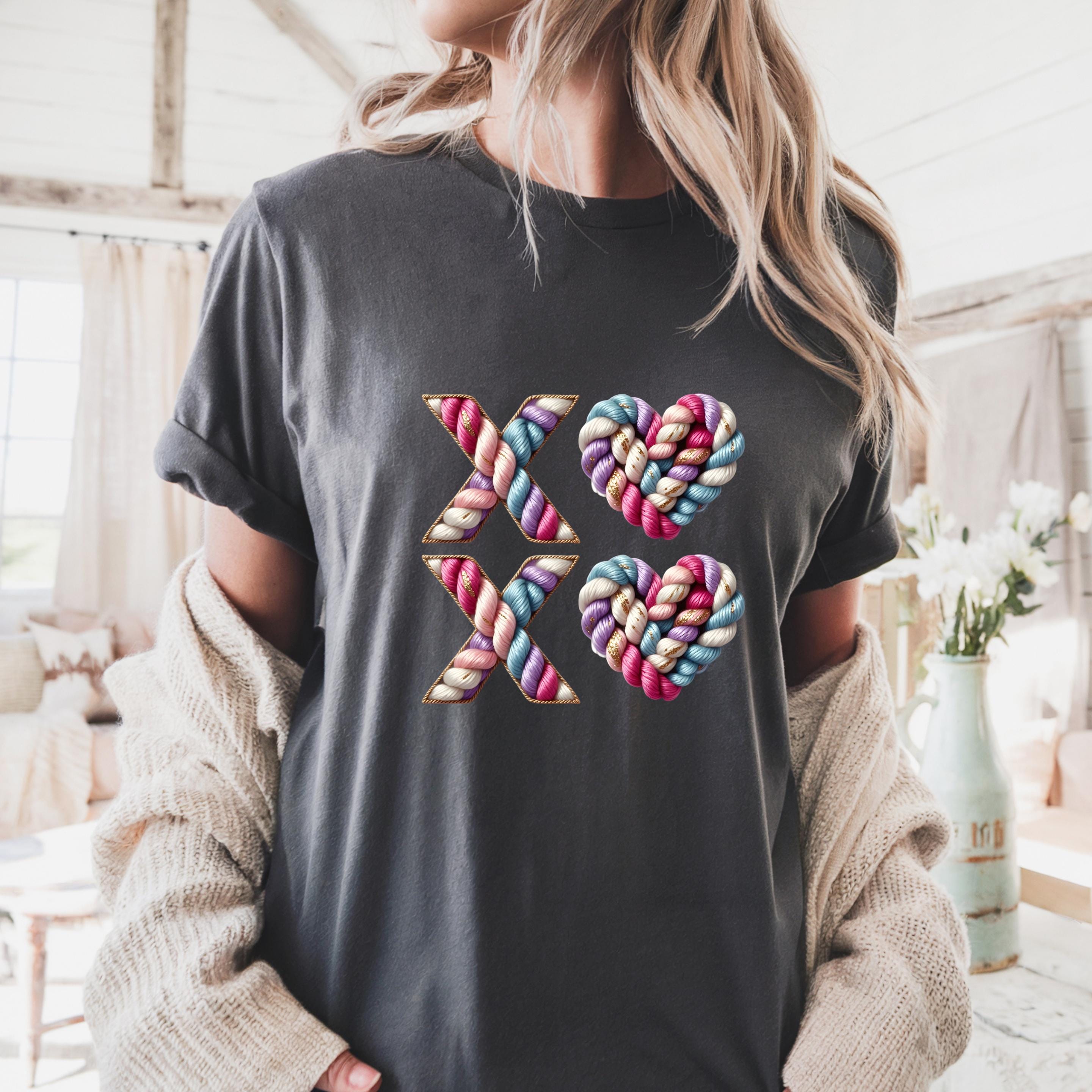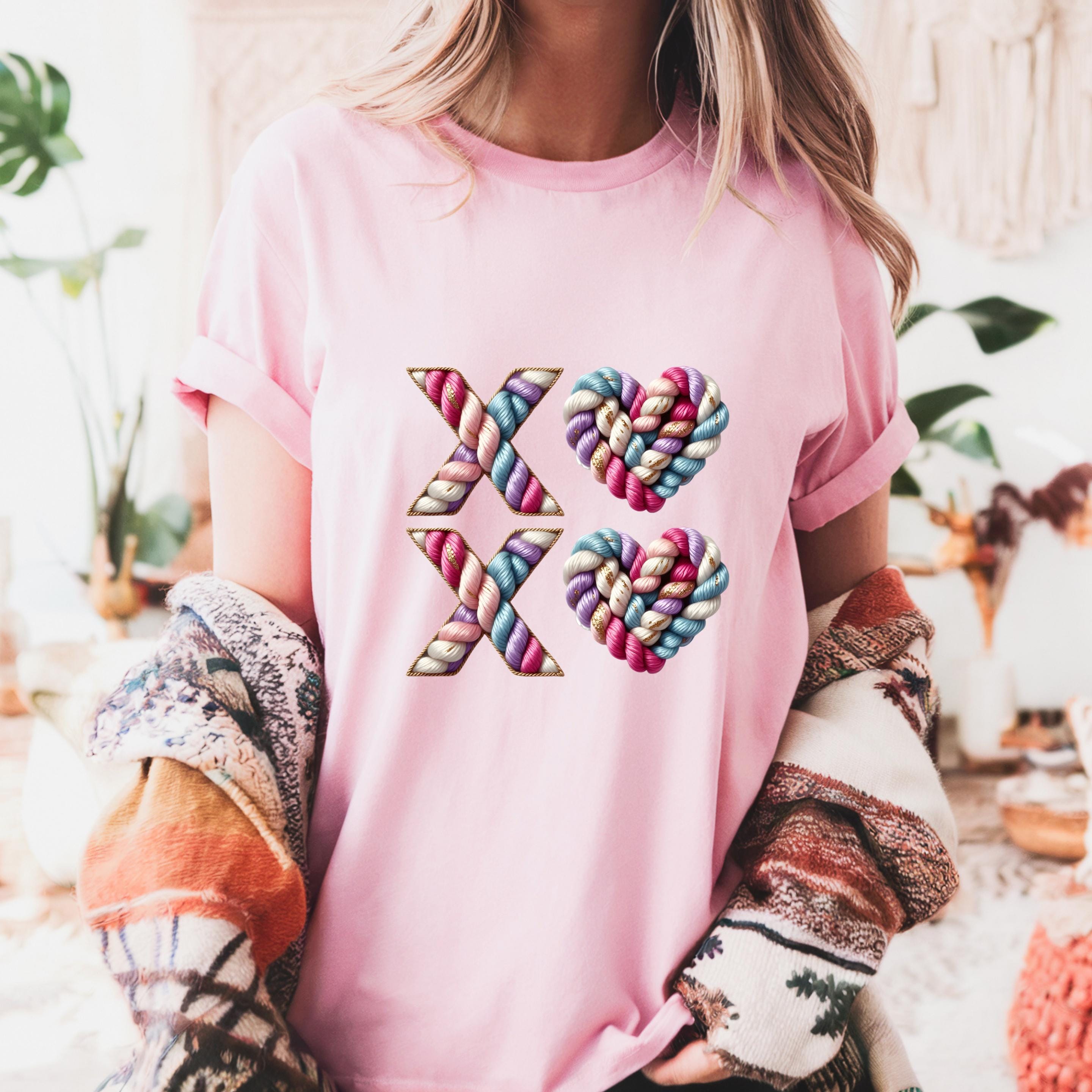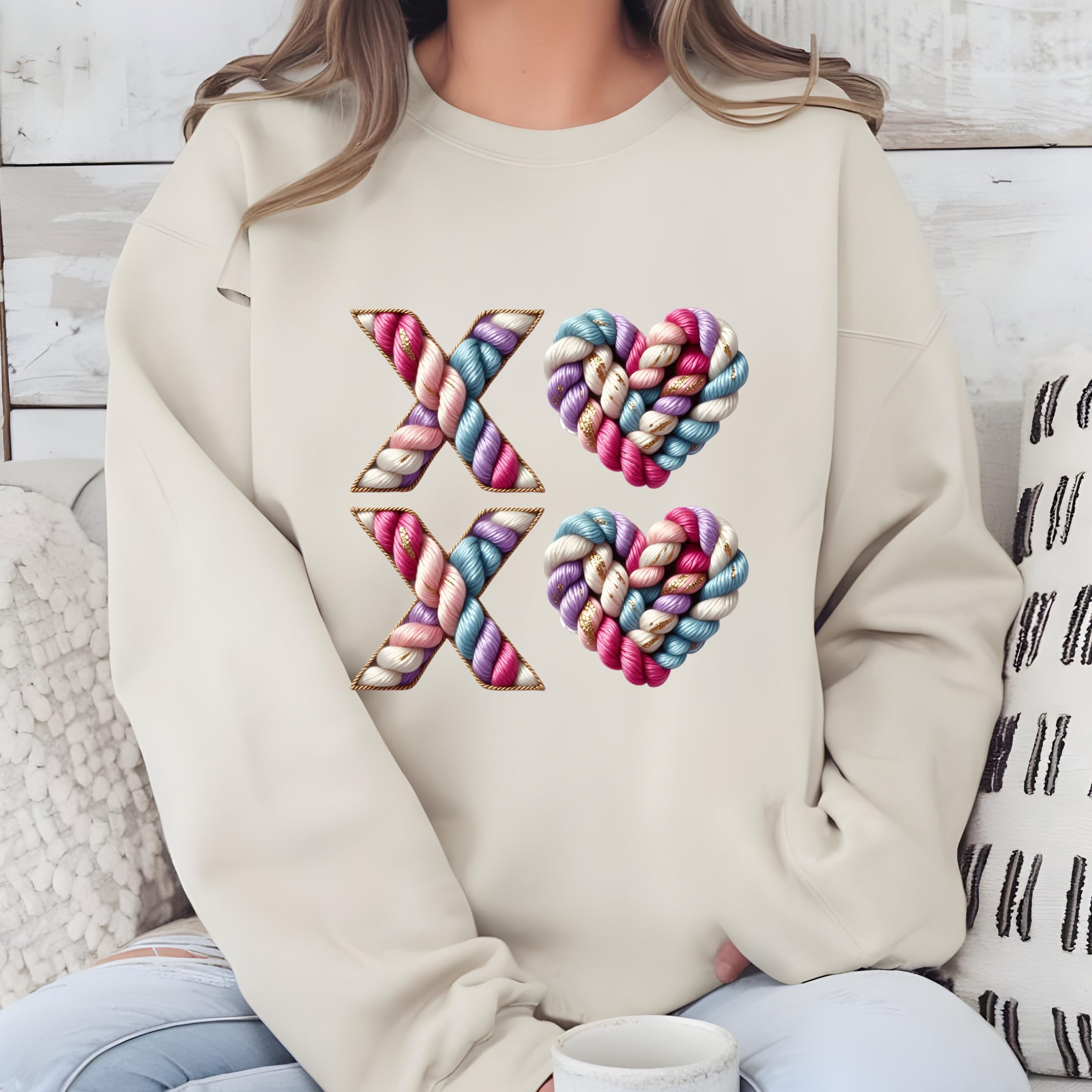 Celebrate love with texture, color, and warmth. This XO crochet-style design features beautifully twisted yarn letters and heart shapes, giving the look of a handmade knit artwork stitched with care.