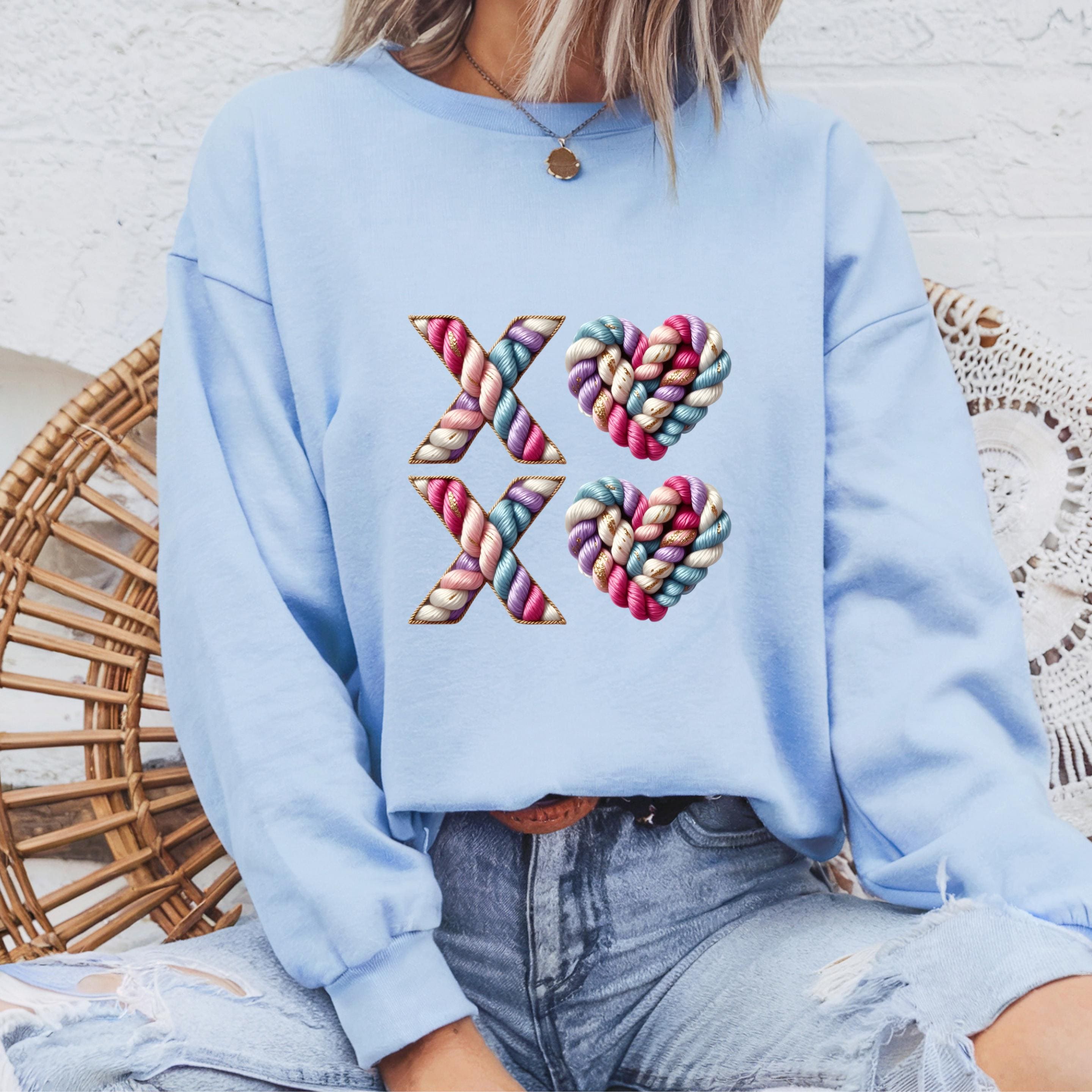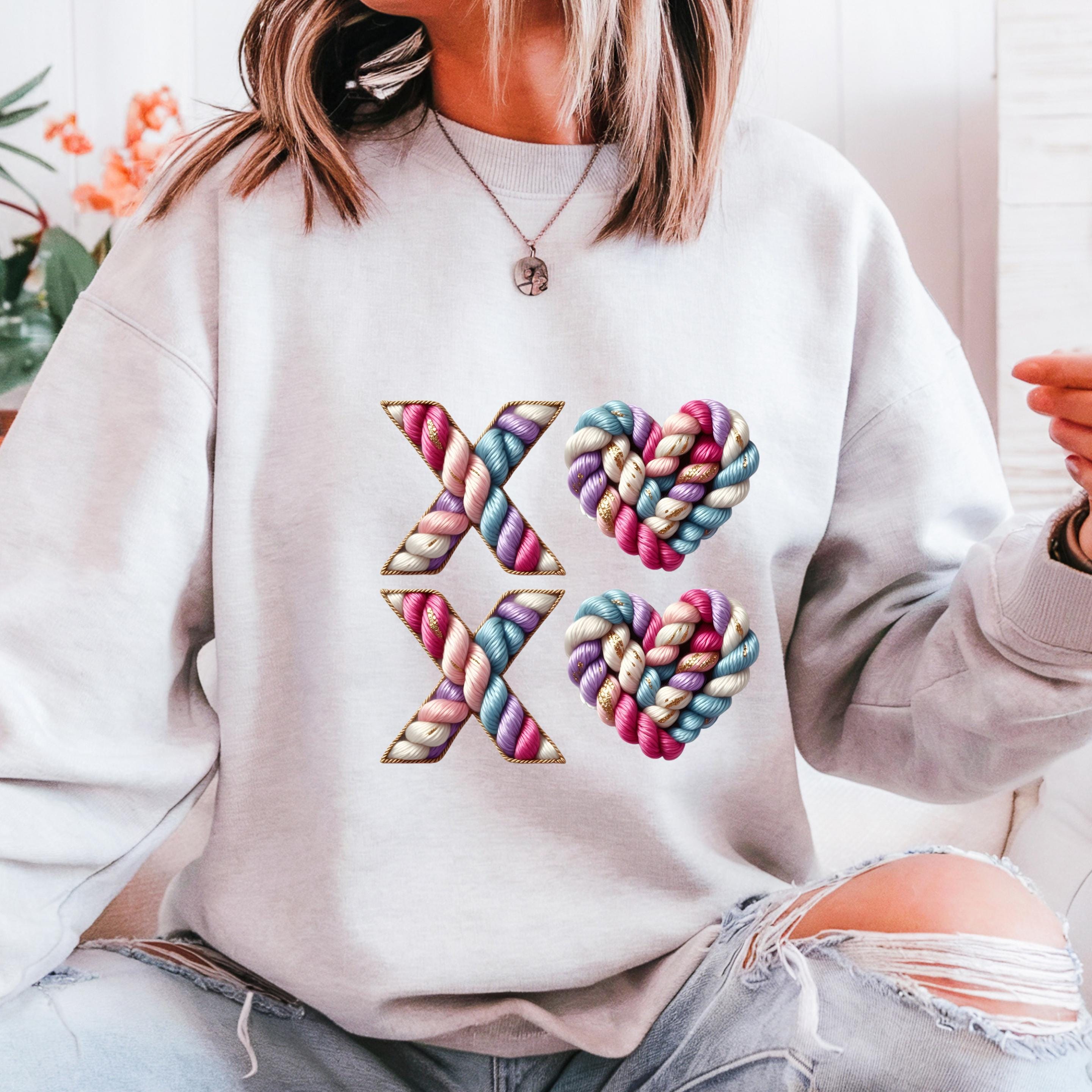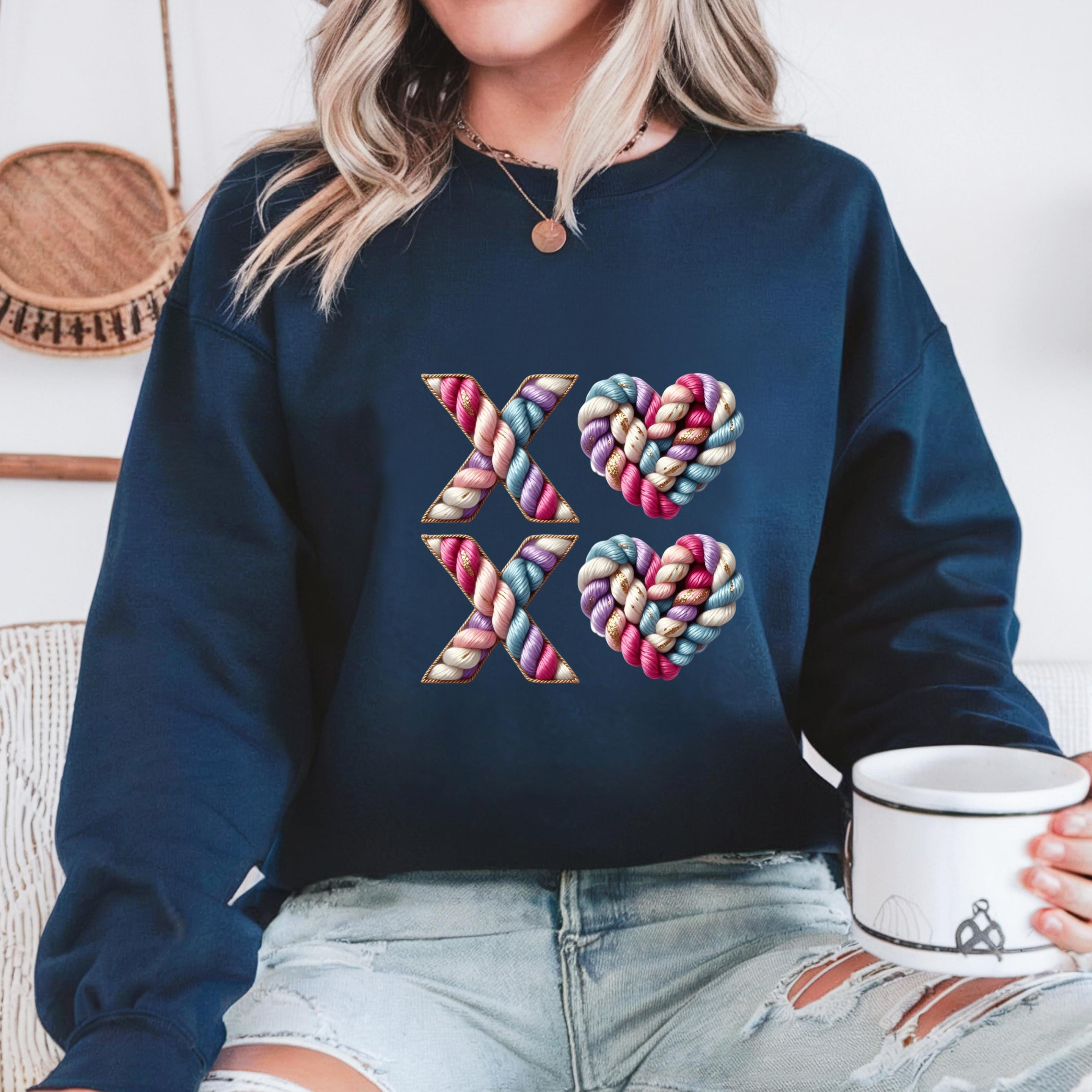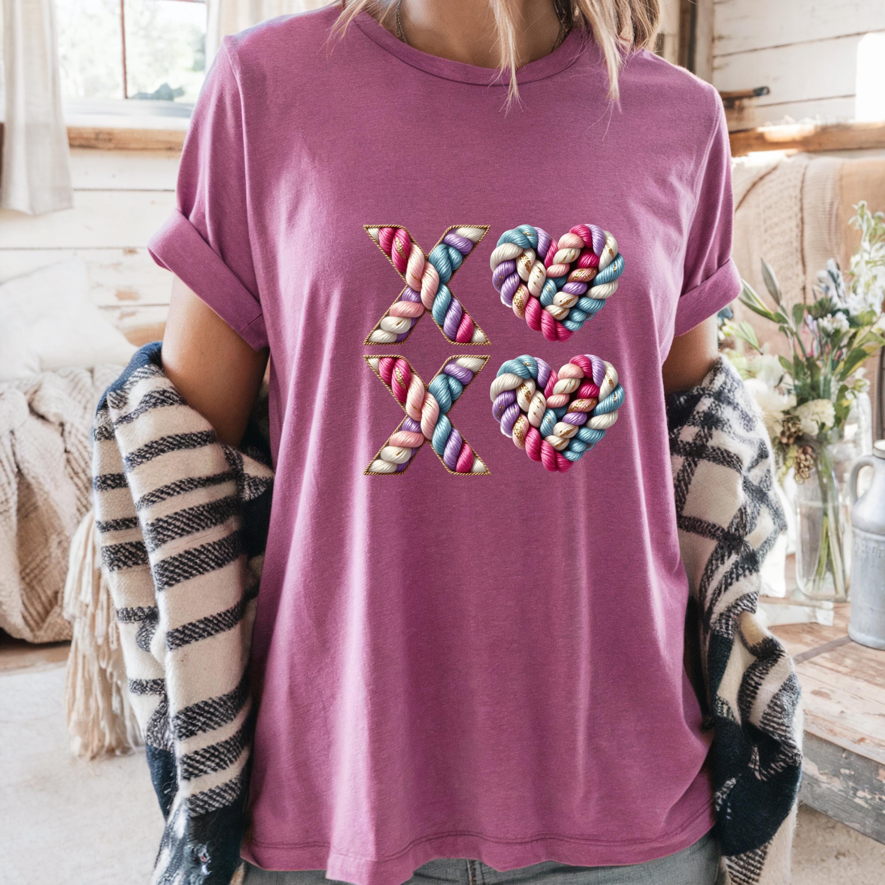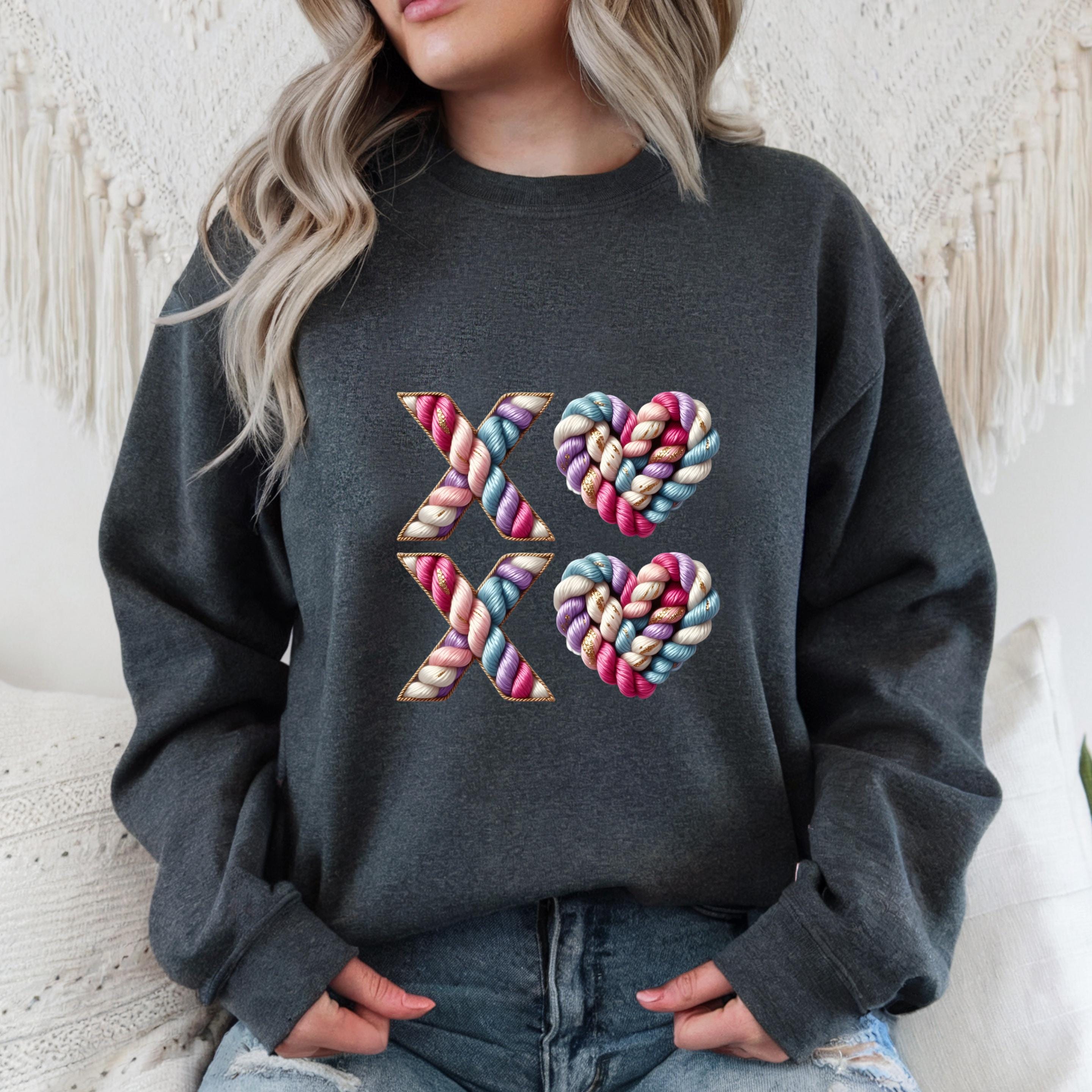Celebrate love with texture, color, and warmth. This XO crochet-style design features beautifully twisted yarn letters and heart shapes, giving the look of a handmade knit artwork stitched with care.