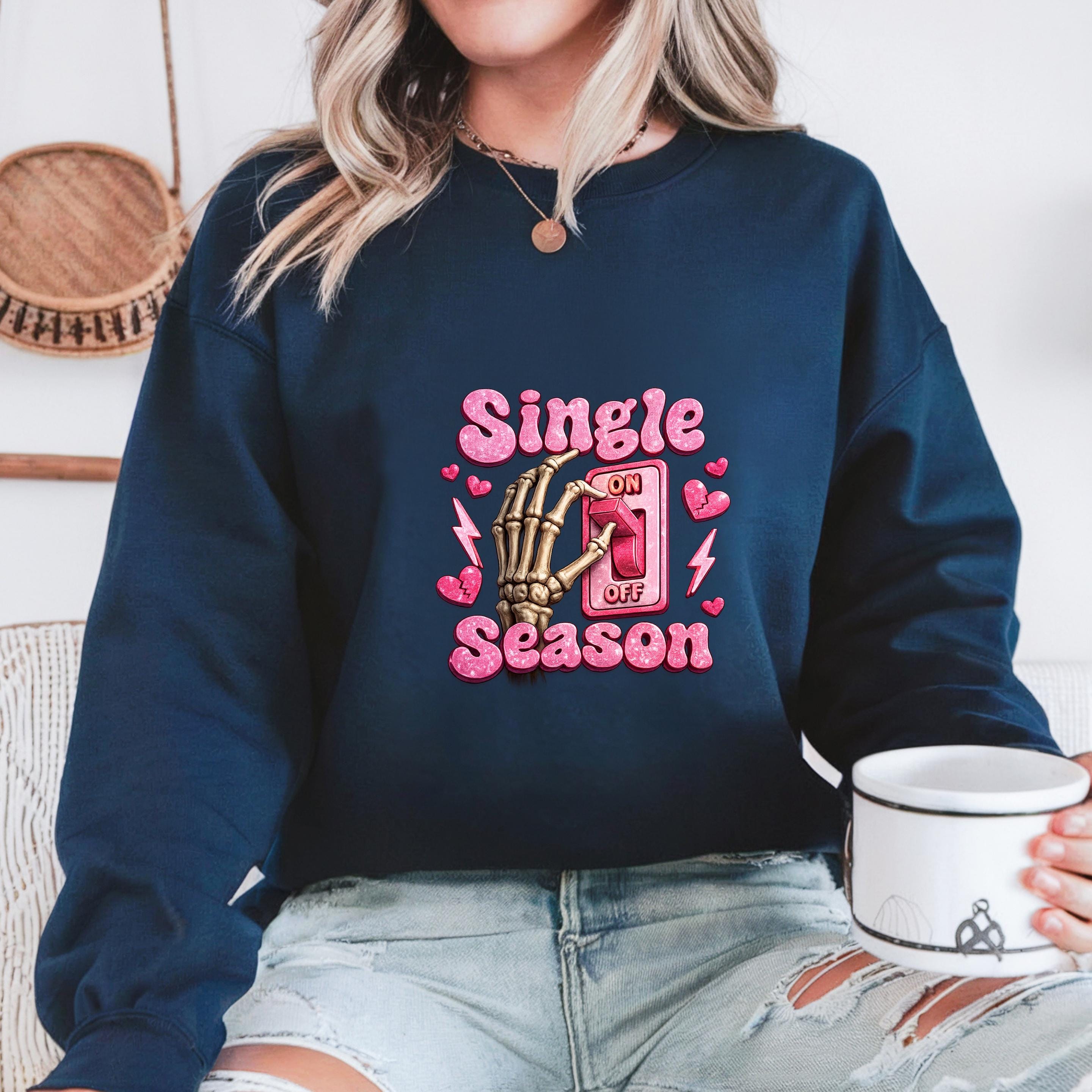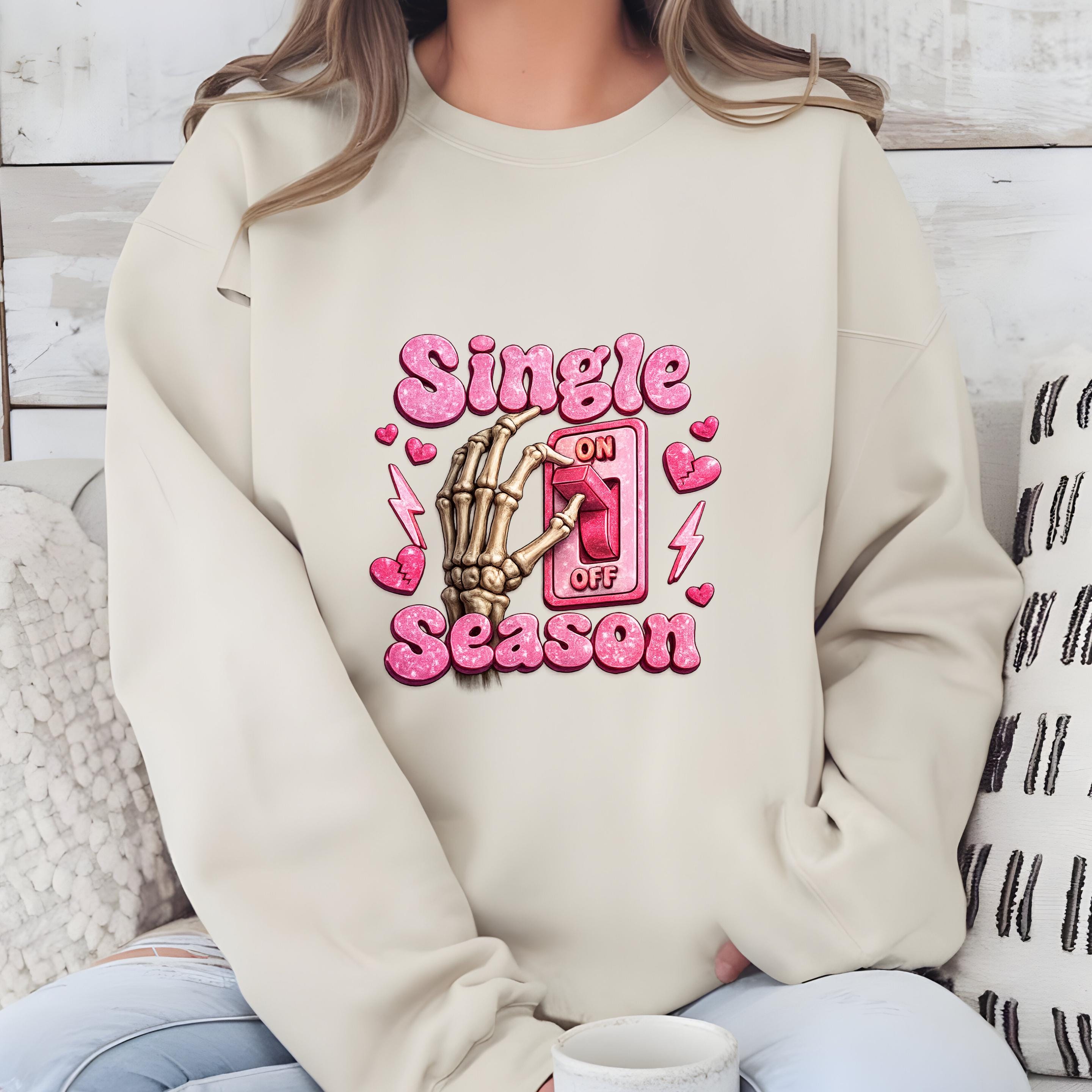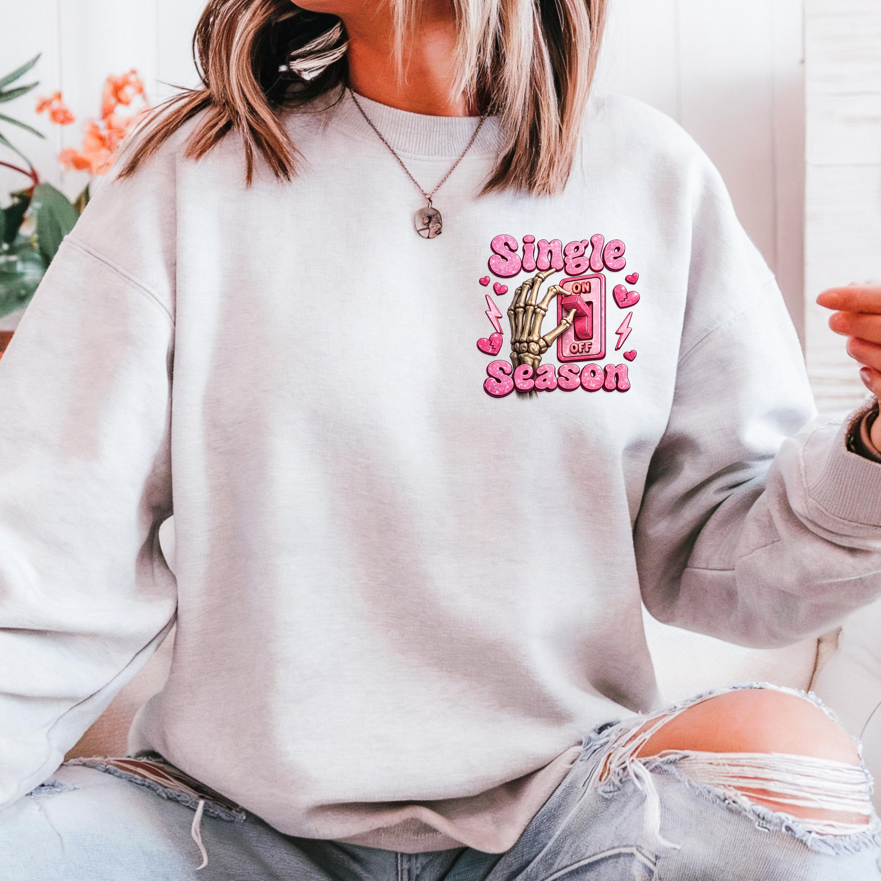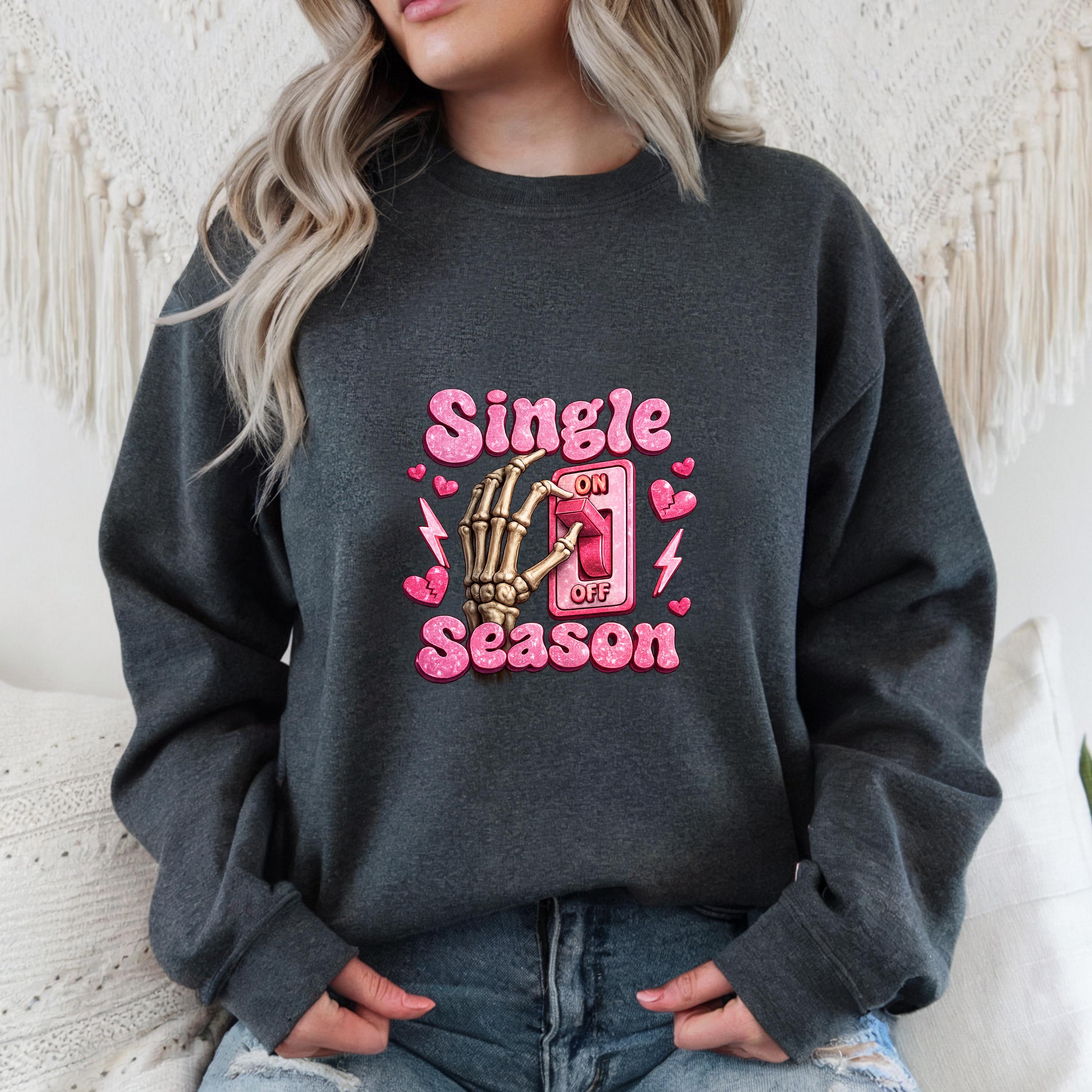 Turn your relationship status into a statement This fun and bold “Single Season” sweatshirt design features a playful skeleton hand flipping the love switch on and off — because sometimes, being single is absolutely a season.