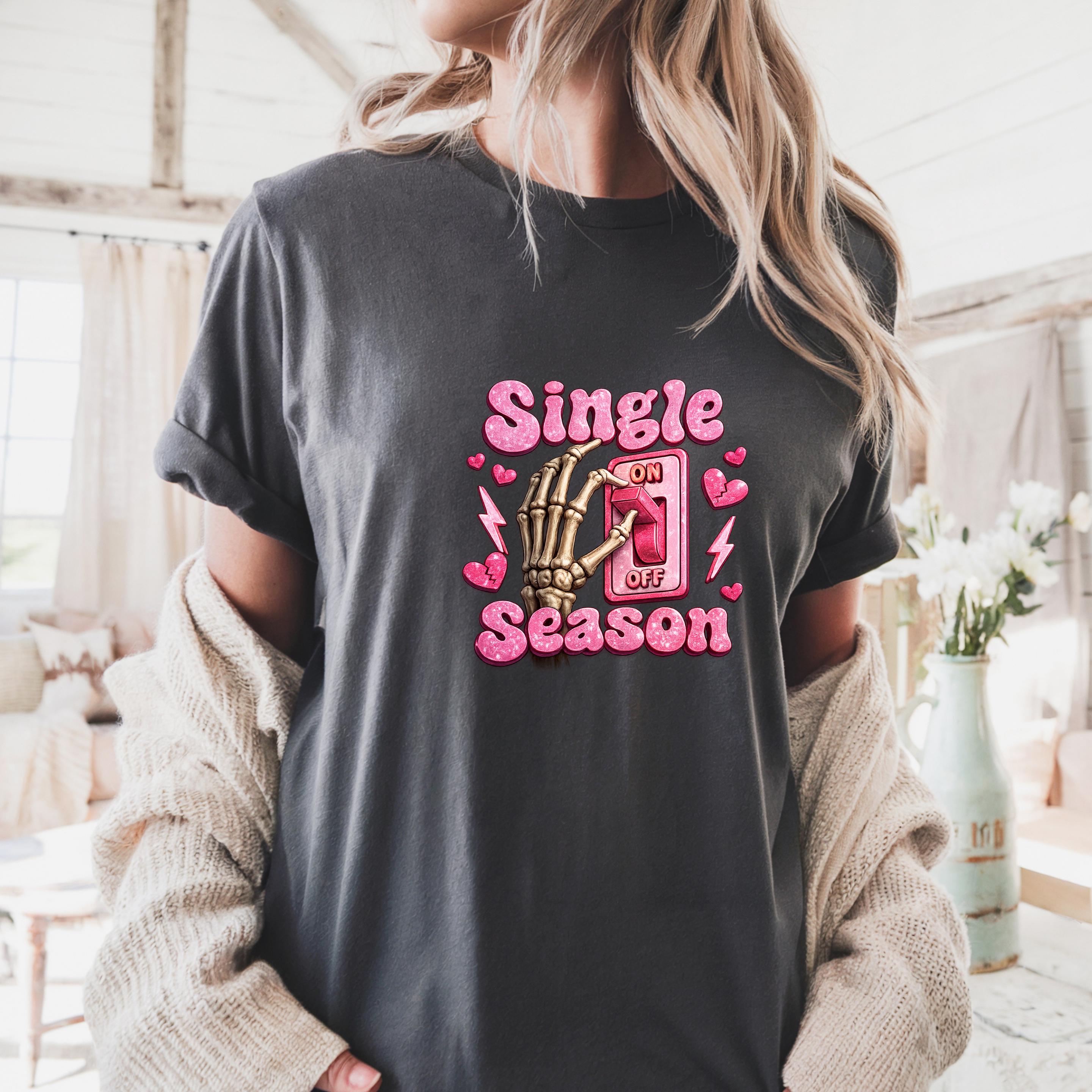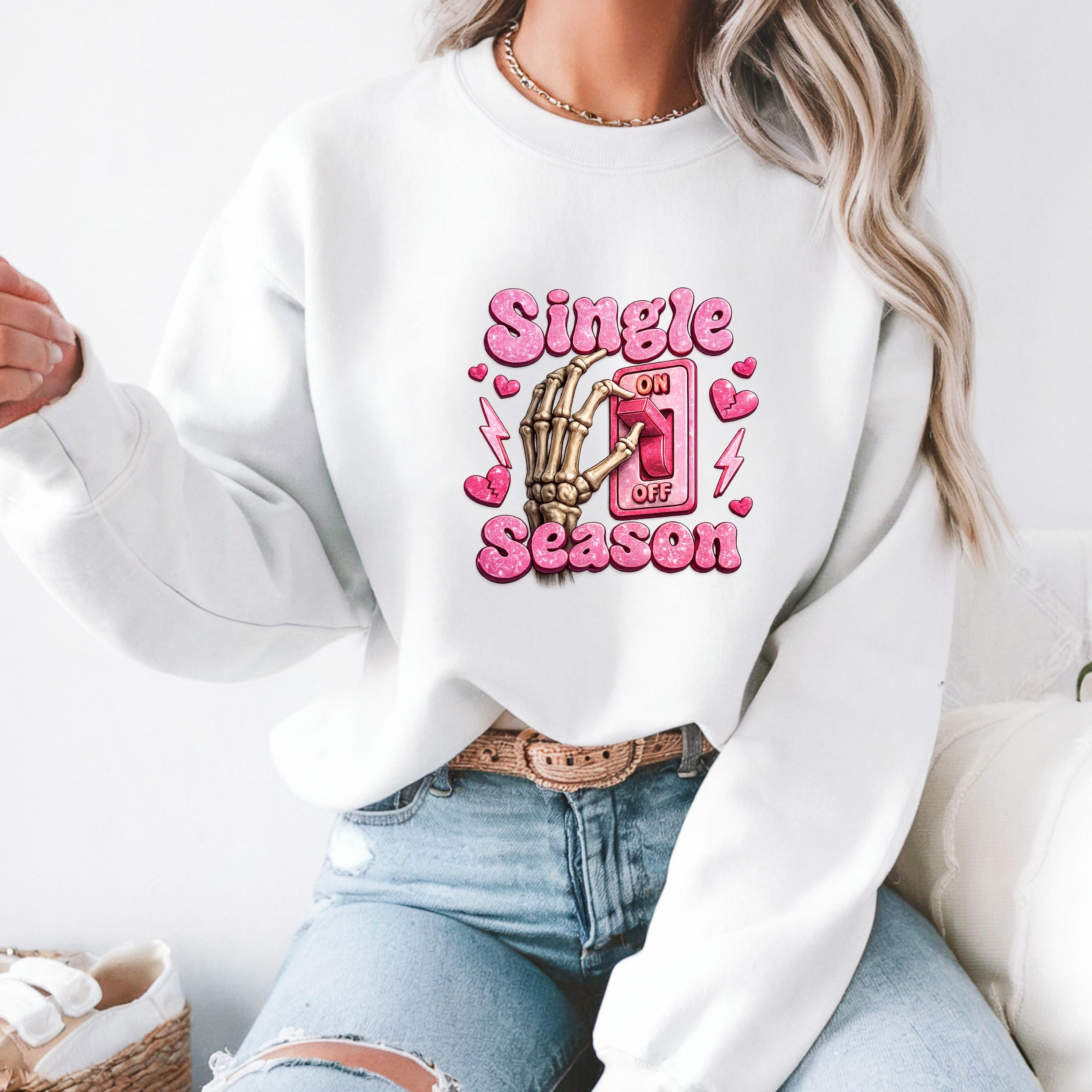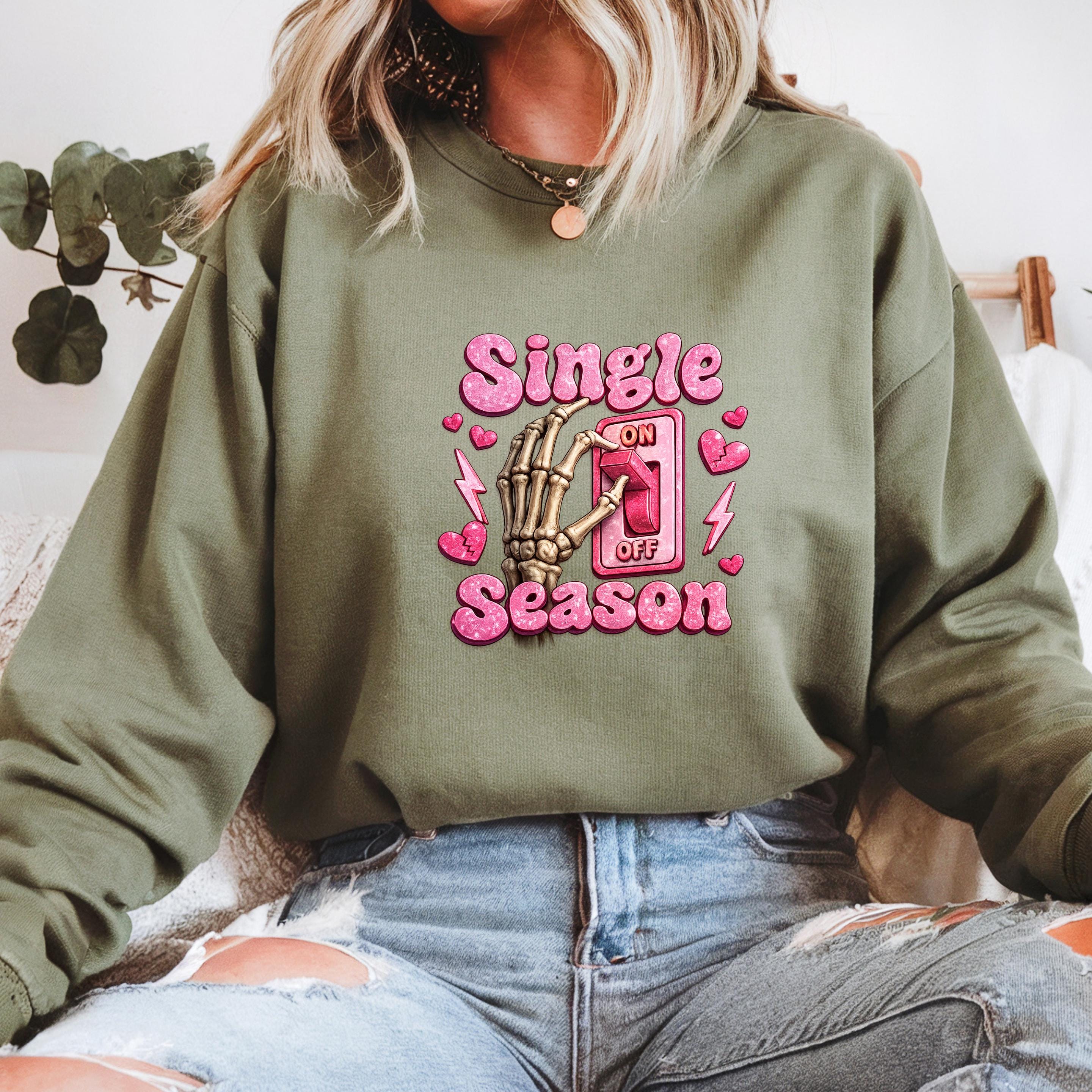 Turn your relationship status into a statement This fun and bold “Single Season” sweatshirt design features a playful skeleton hand flipping the love switch on and off — because sometimes, being single is absolutely a season.