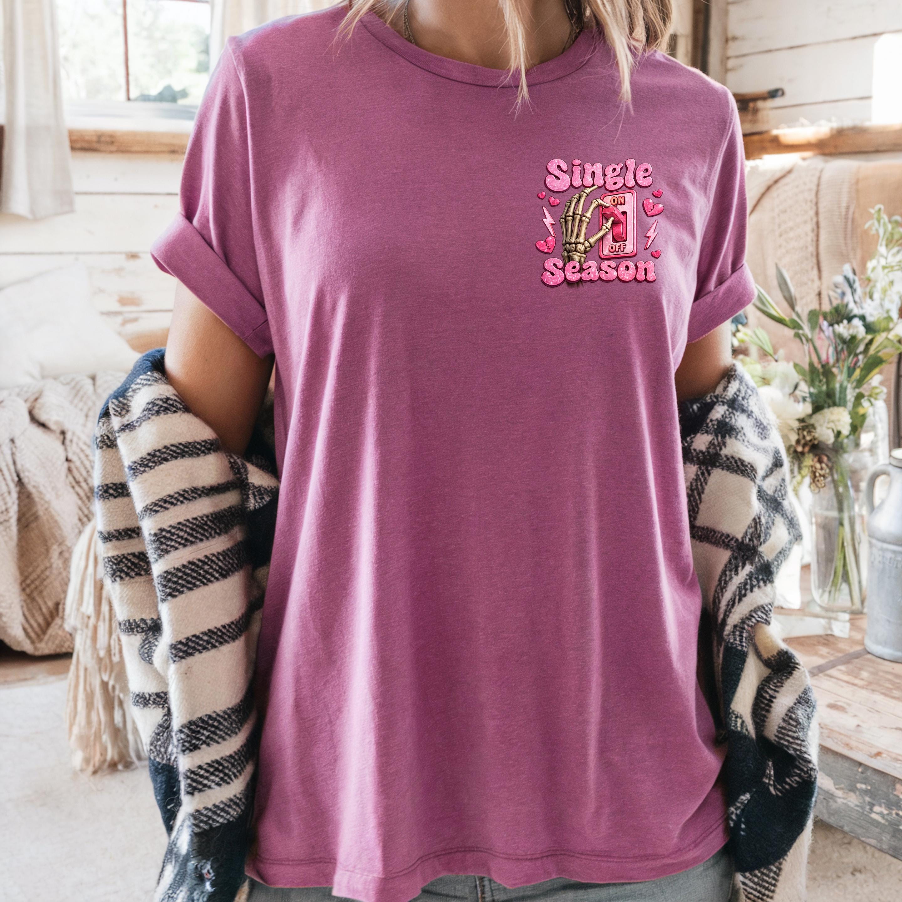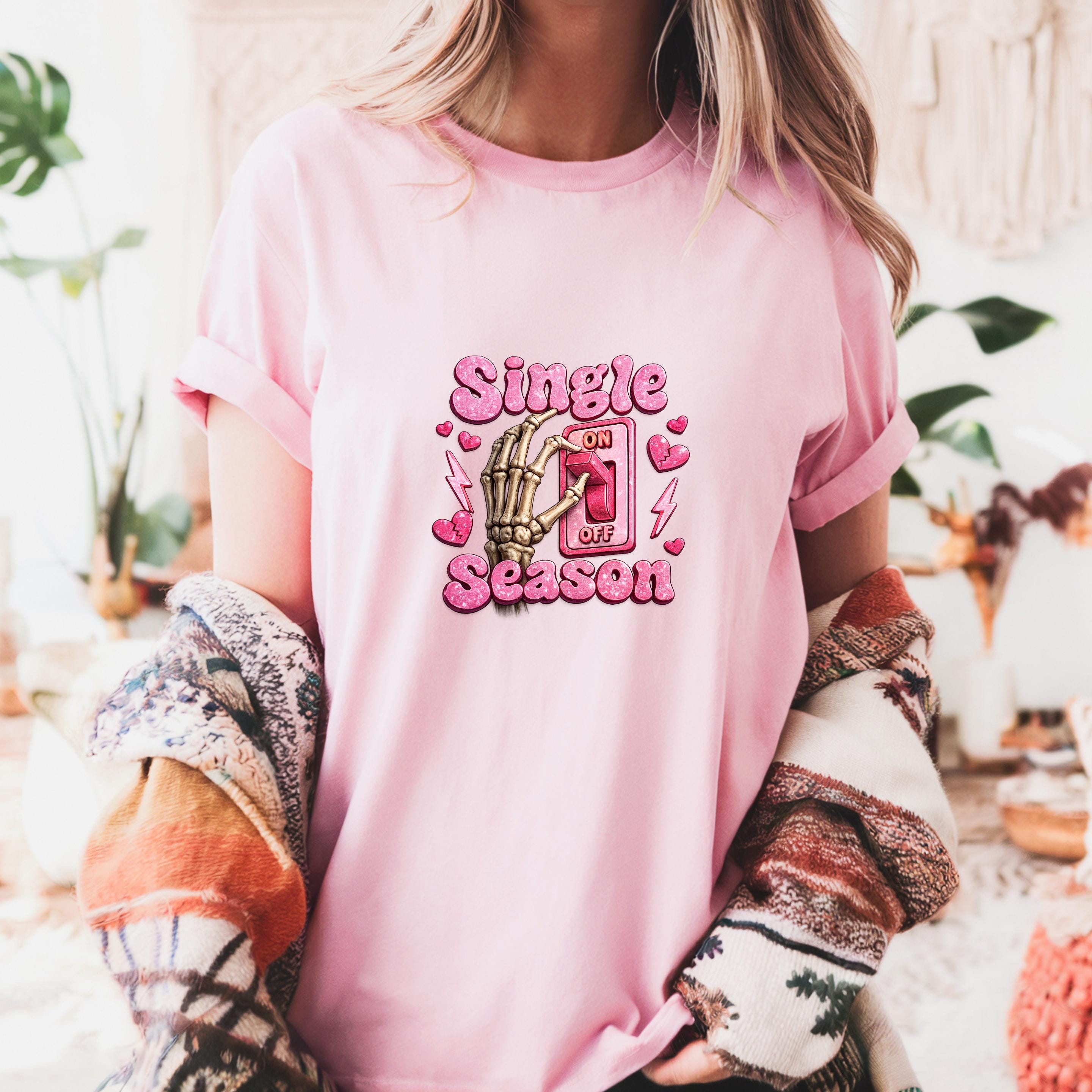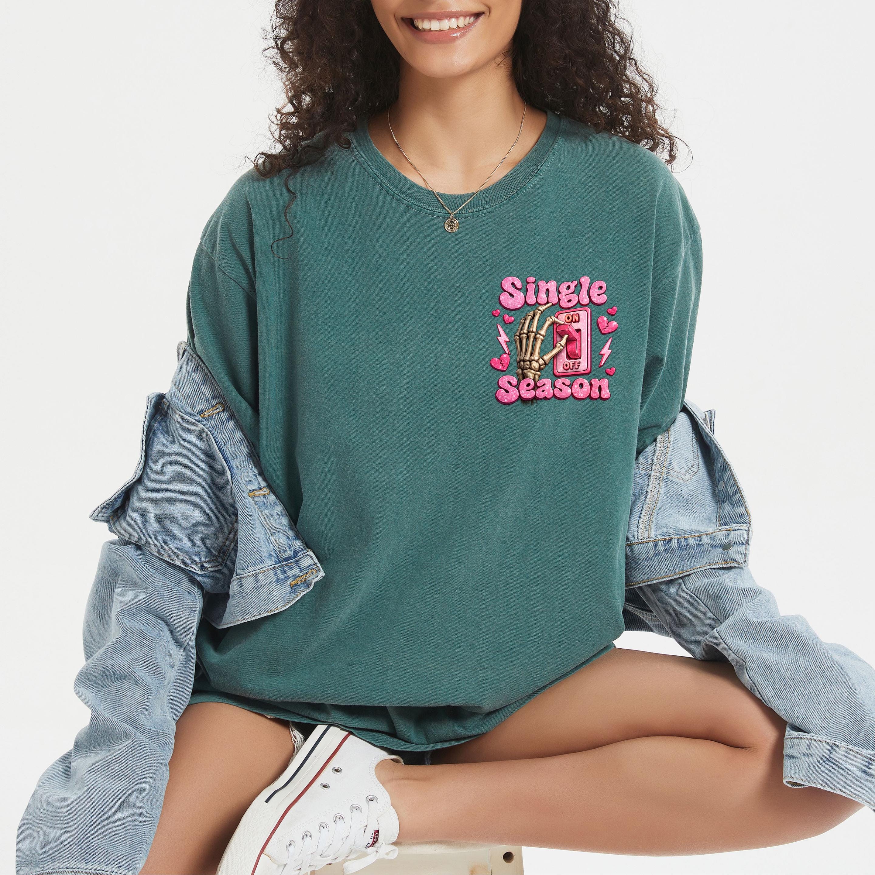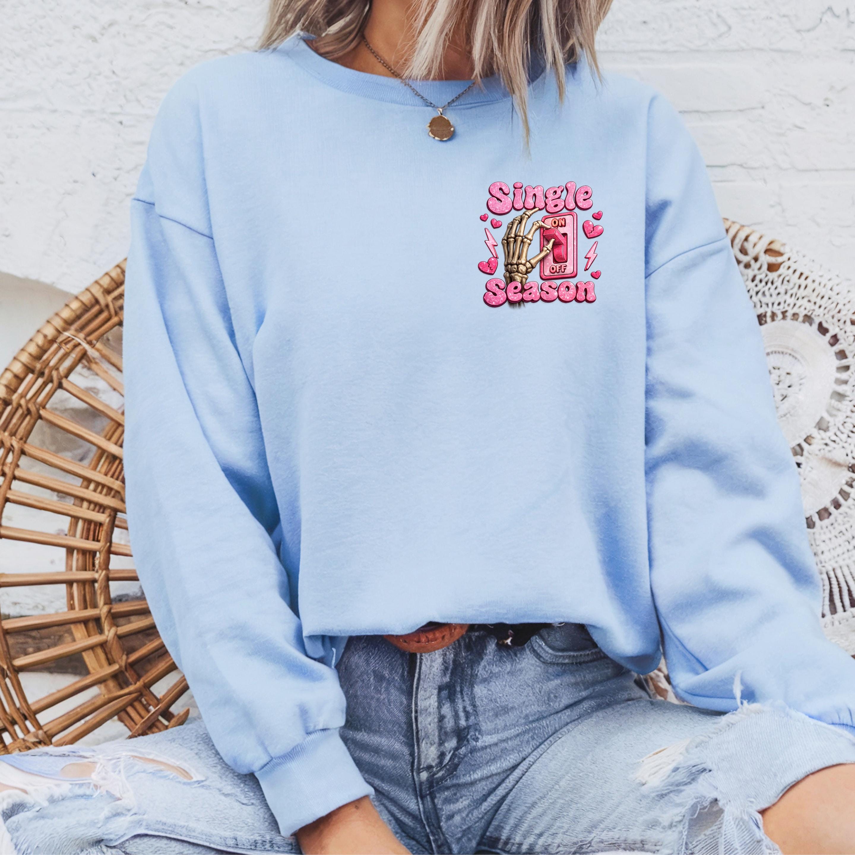 Turn your relationship status into a statement This fun and bold “Single Season” sweatshirt design features a playful skeleton hand flipping the love switch on and off — because sometimes, being single is absolutely a season.