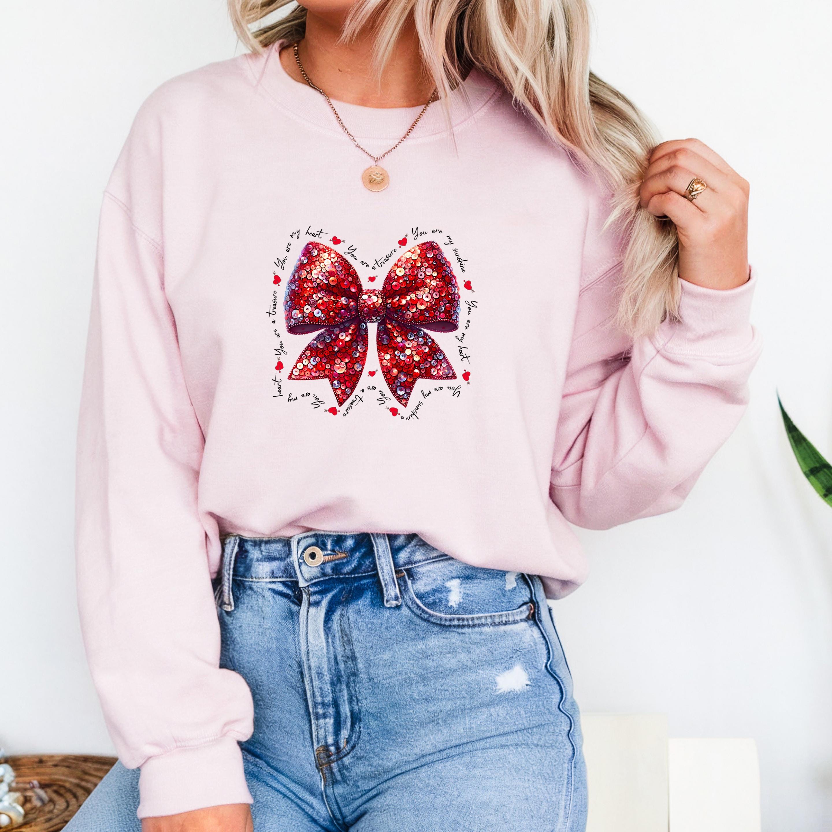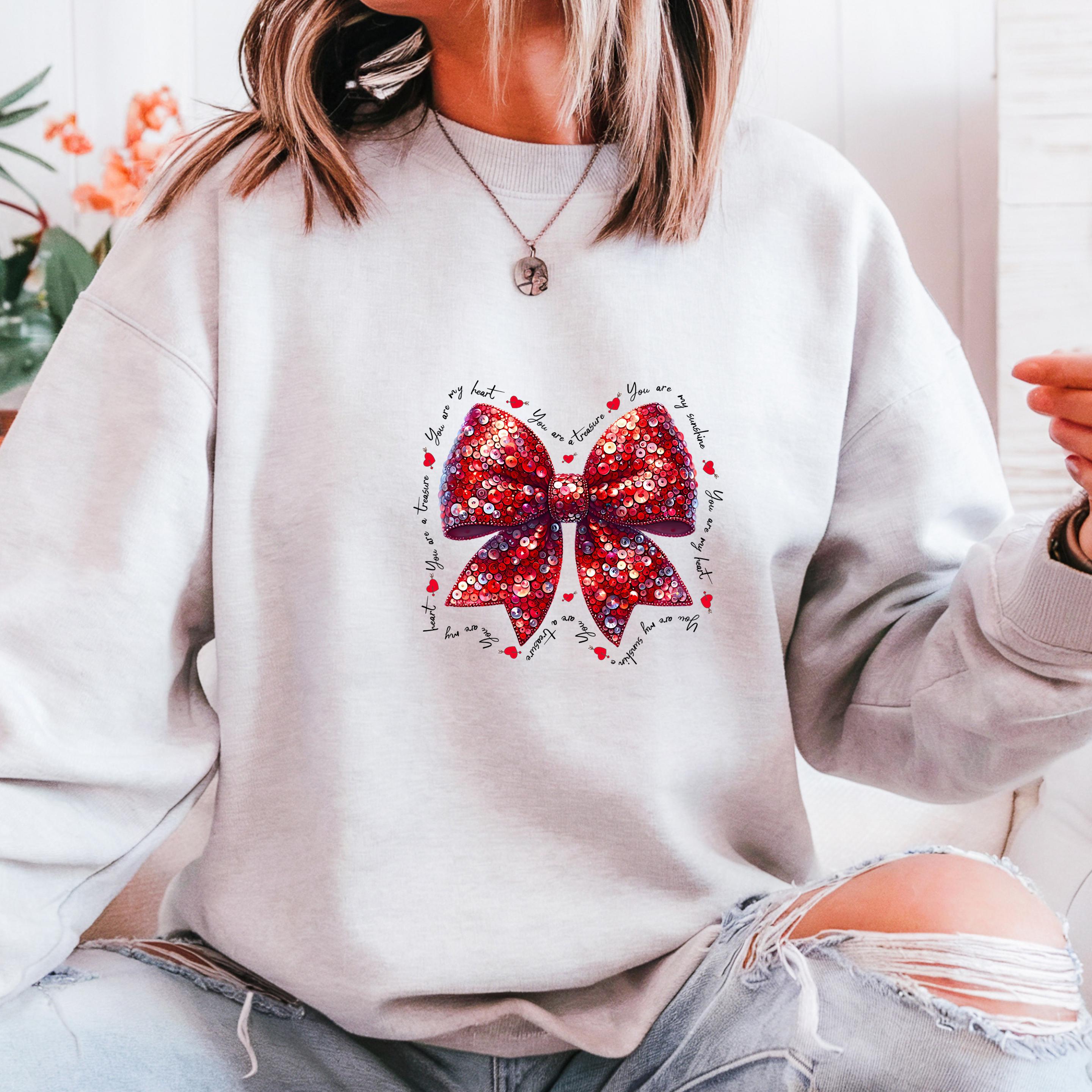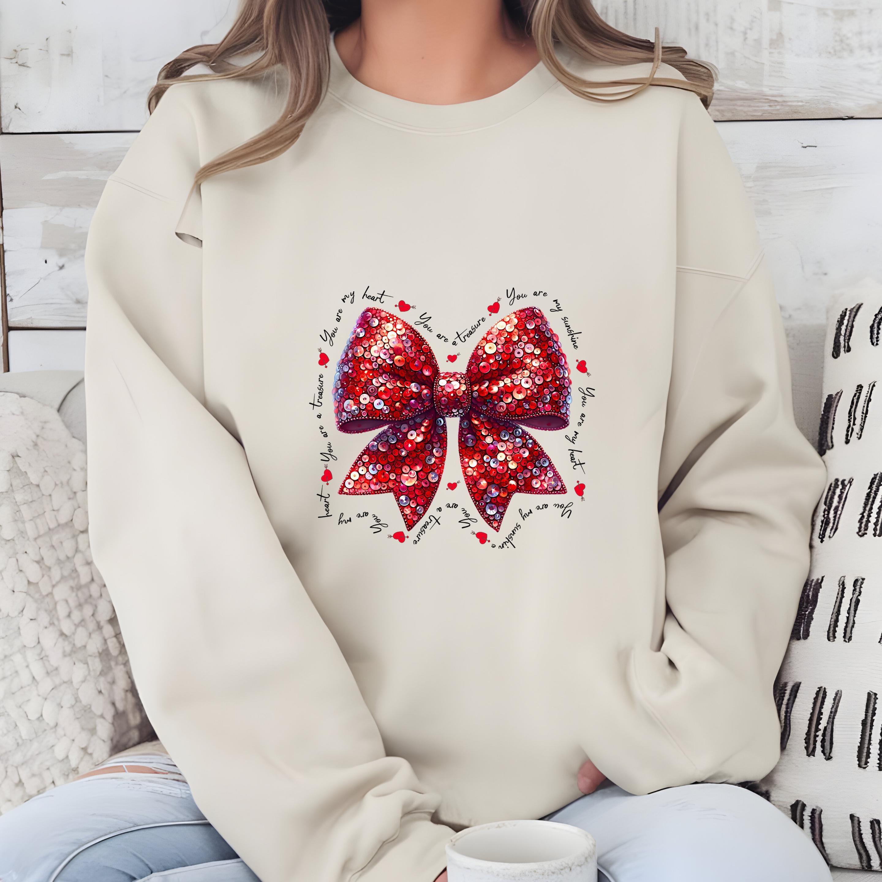This beautiful Valentine-inspired design features a shimmering red sequin-style bow, surrounded by delicate handwritten love phrases and tiny heart accents.