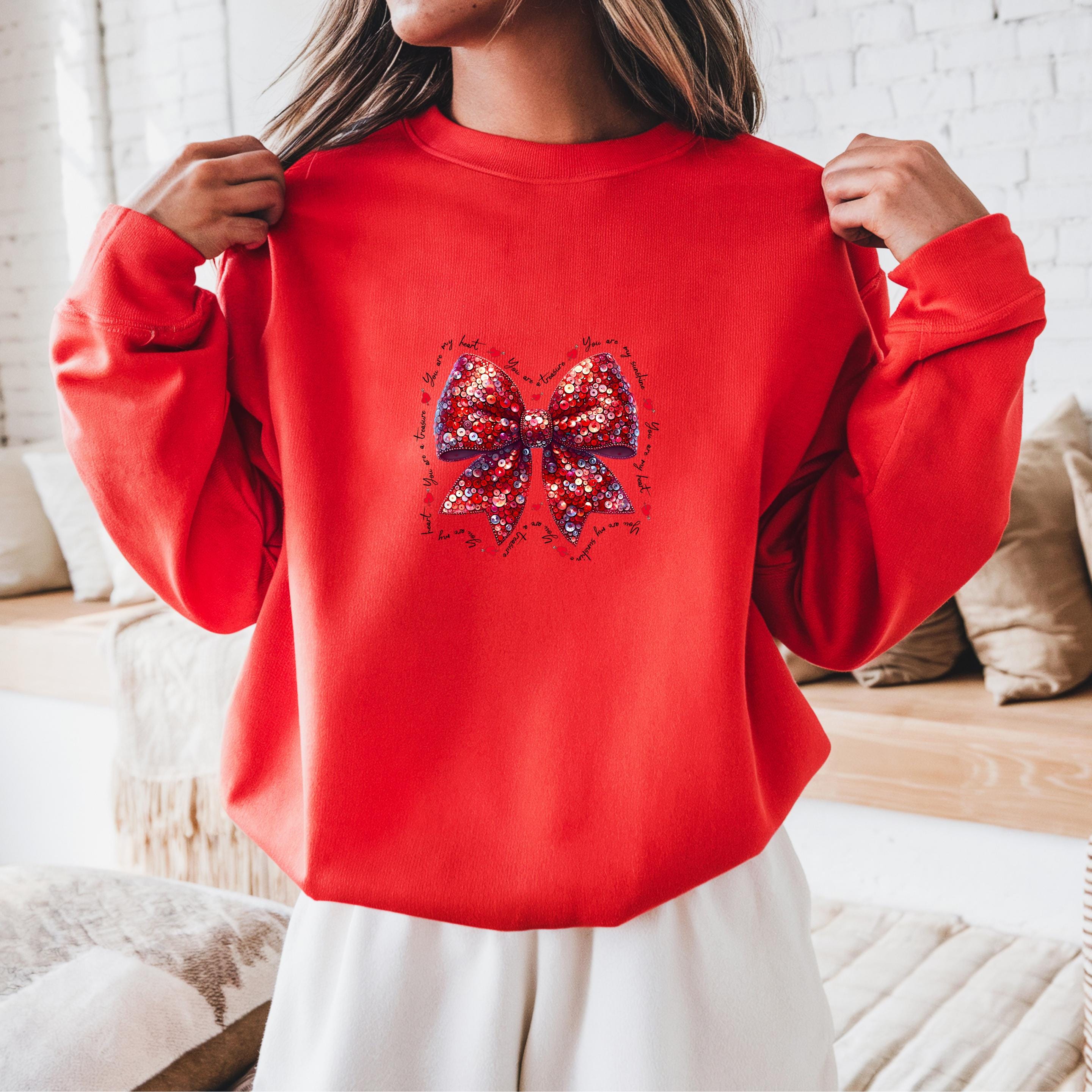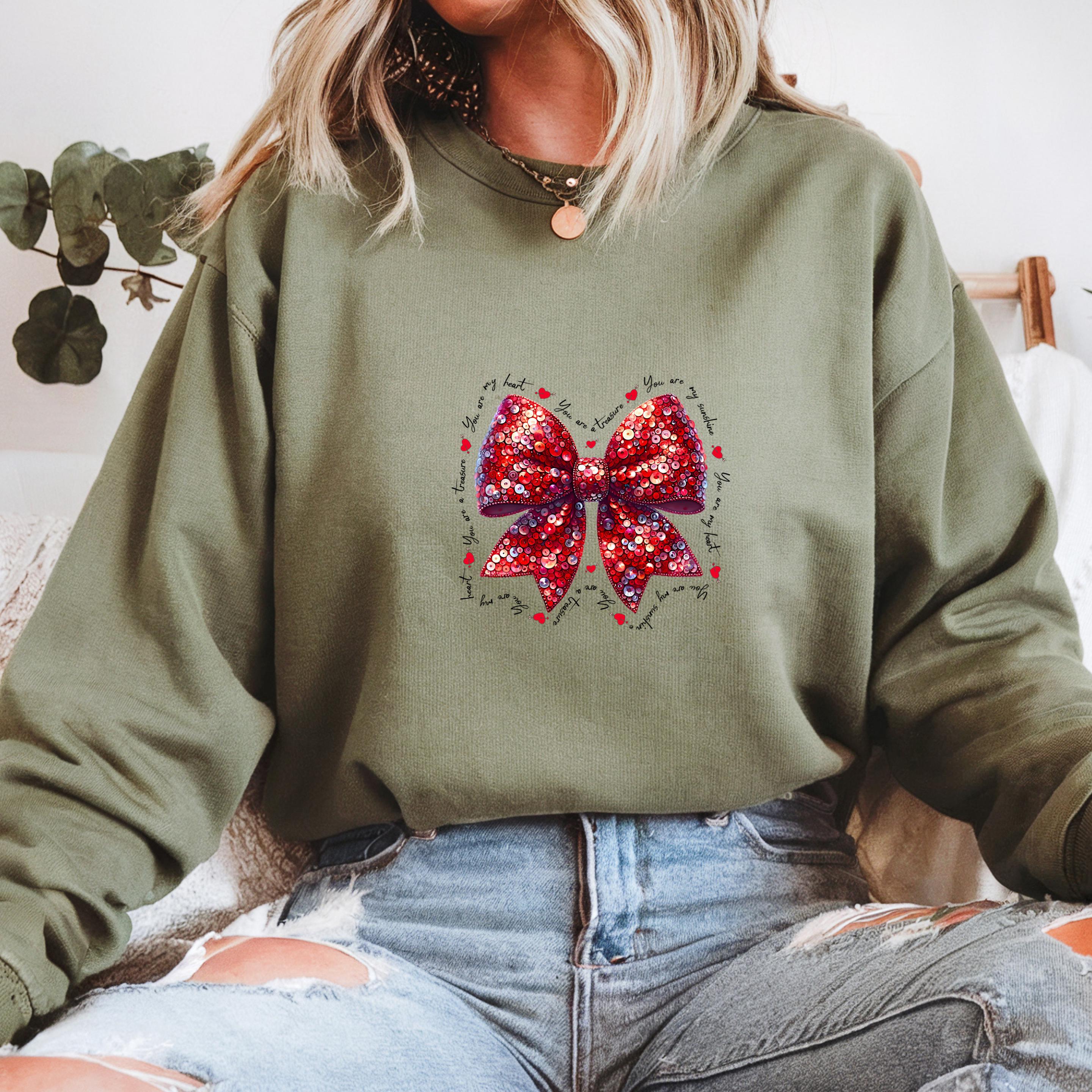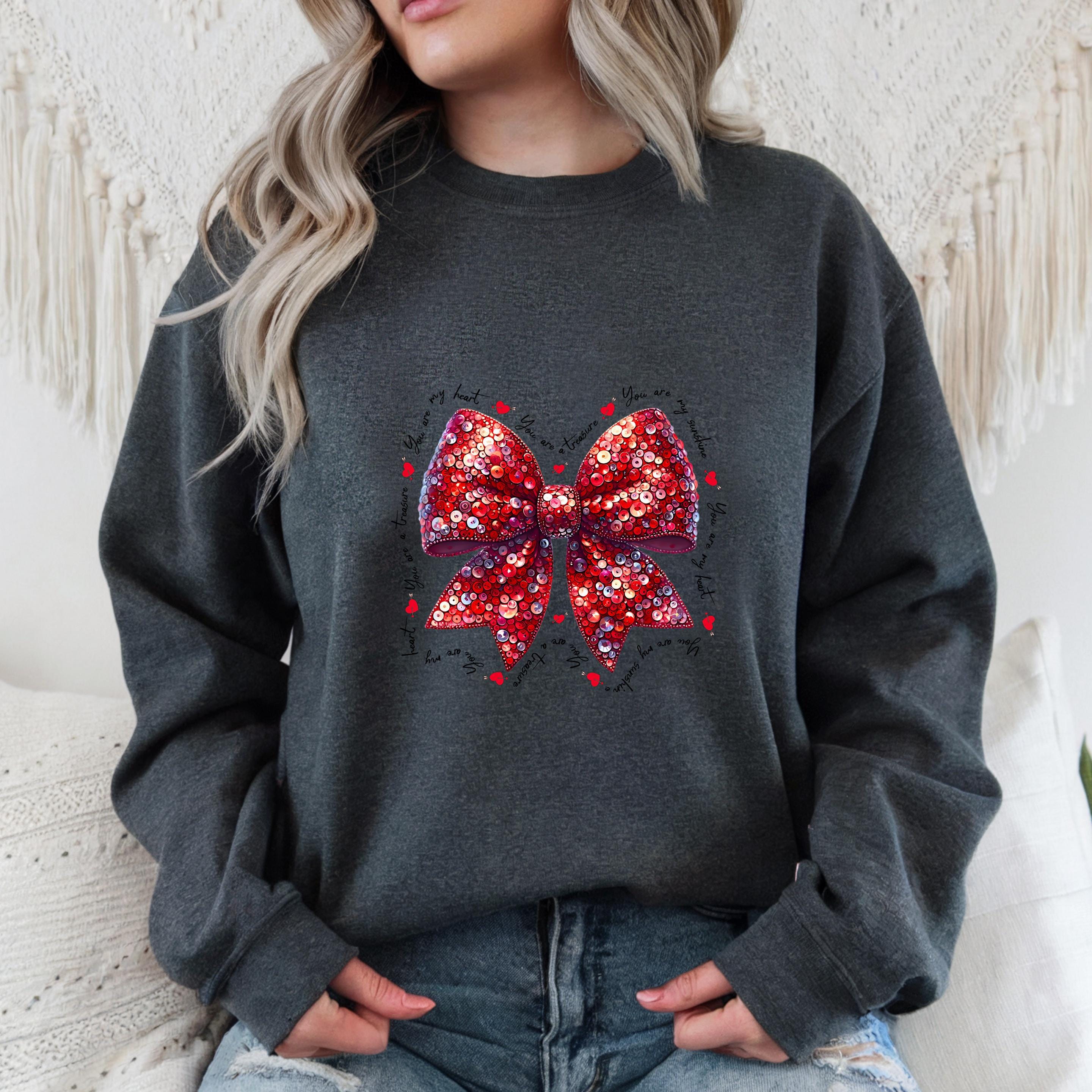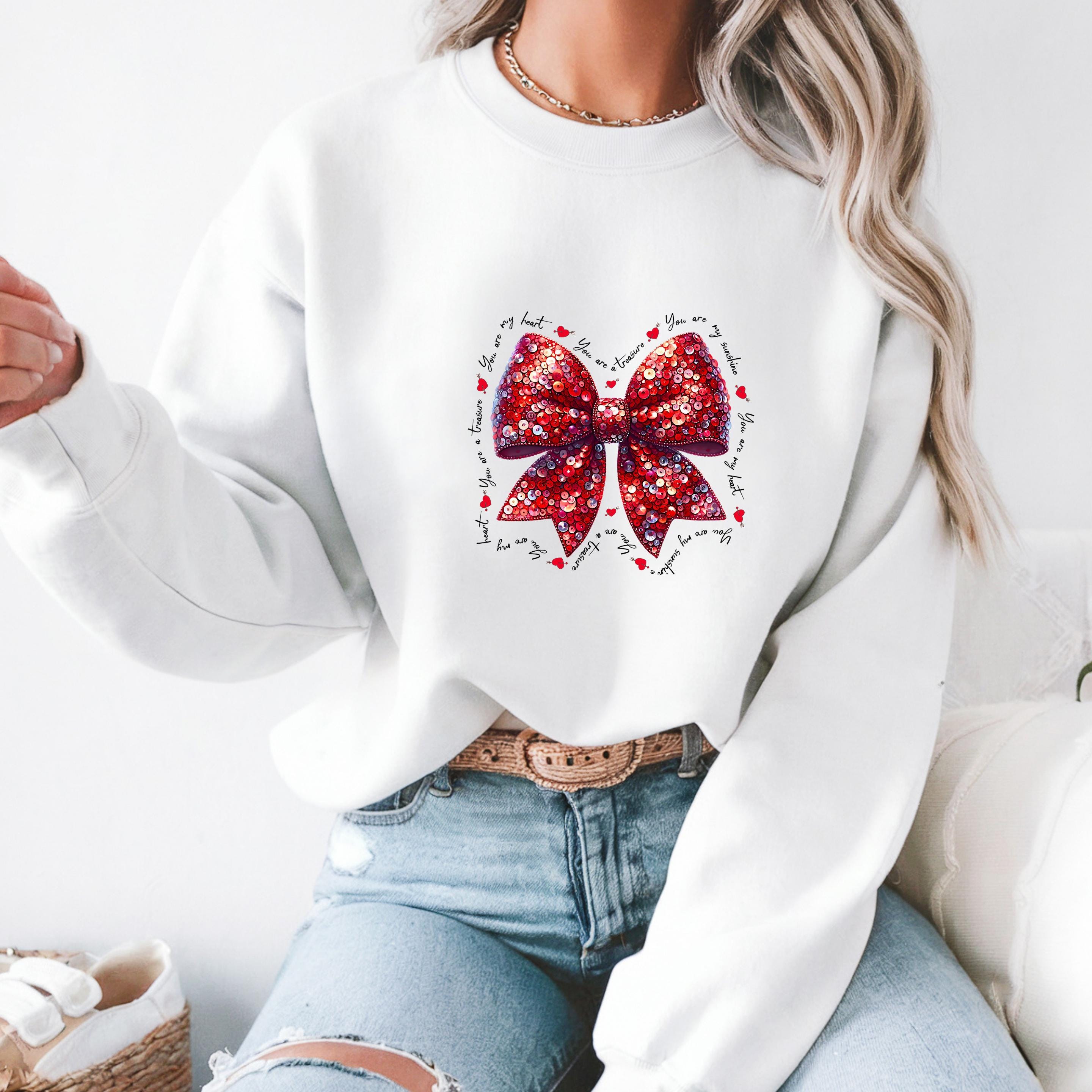 This beautiful Valentine-inspired design features a shimmering red sequin-style bow, surrounded by delicate handwritten love phrases and tiny heart accents.