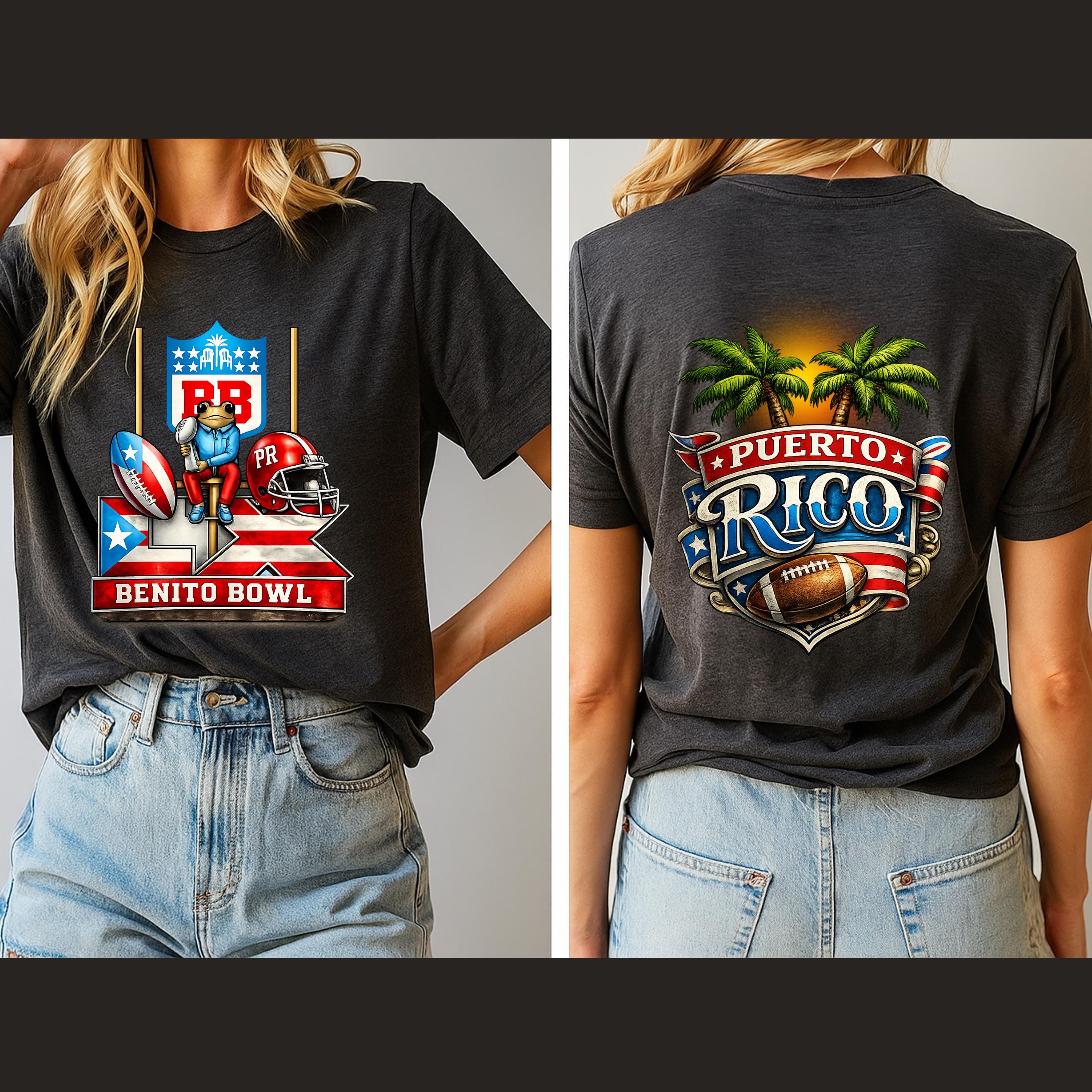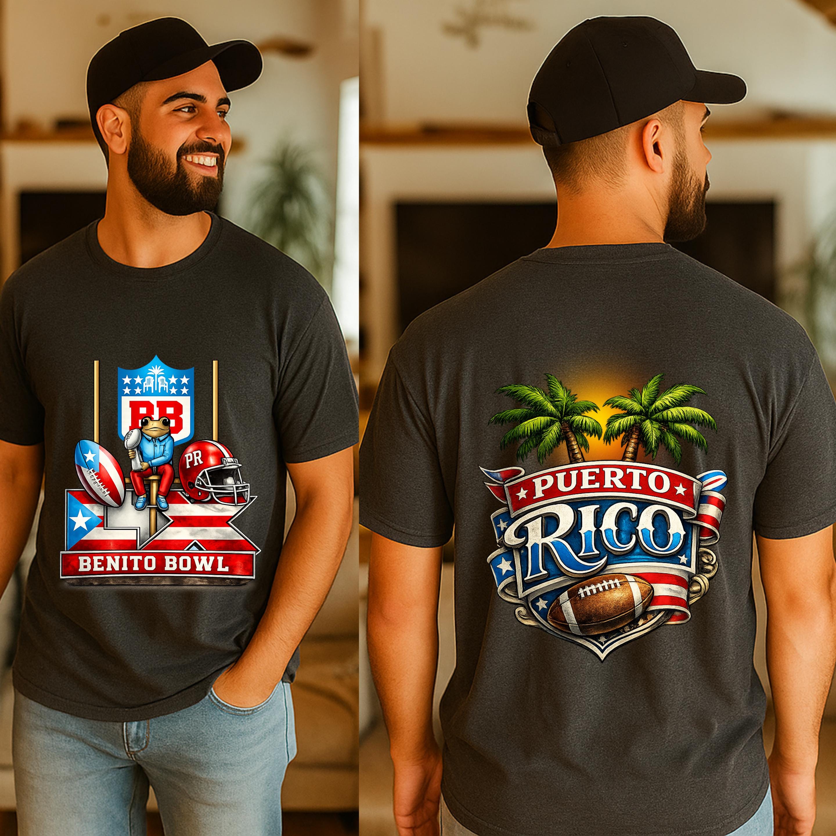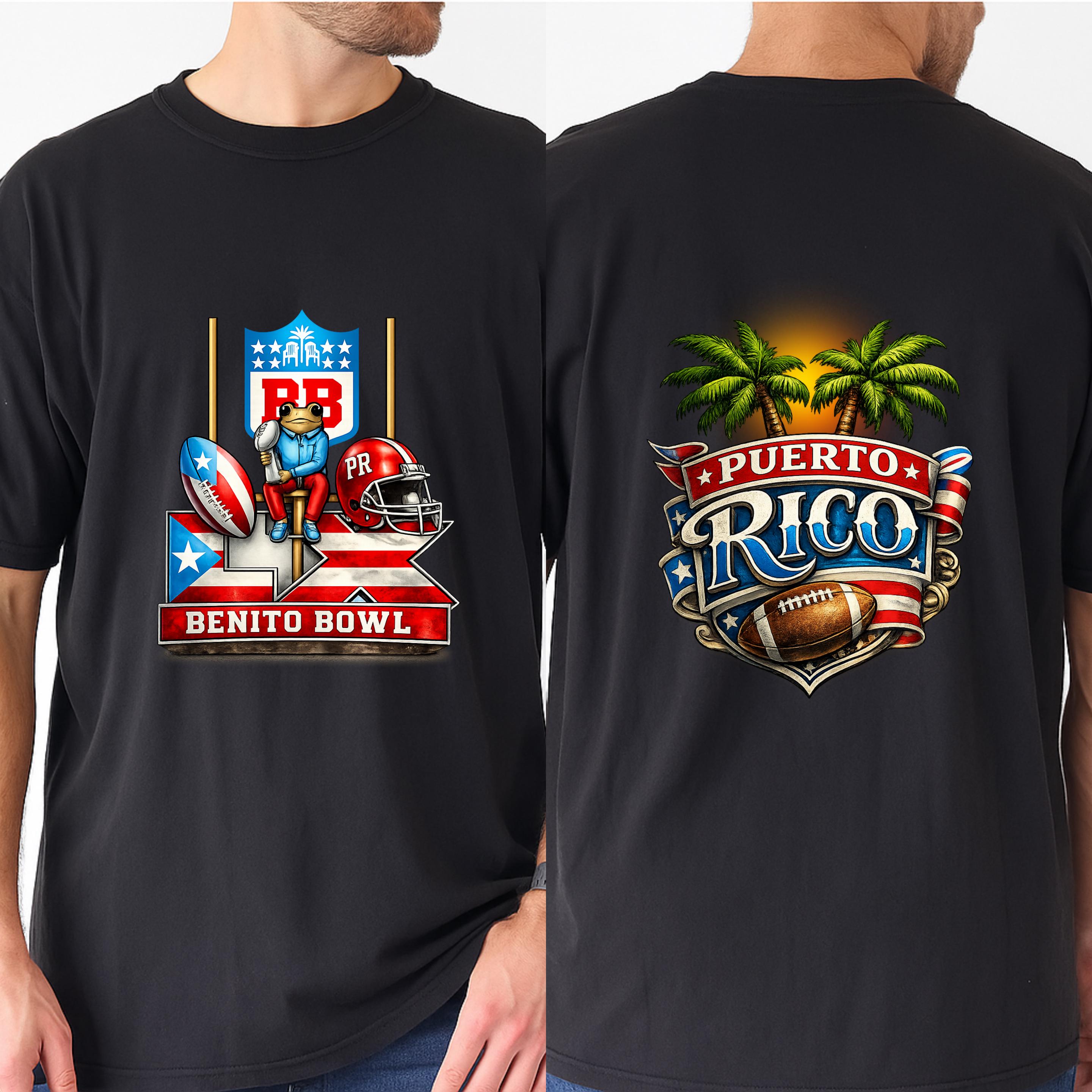 The front design features the iconic Benito Bowl graphic with a playful frog mascot, goalposts, football elements, and Puerto Rico flag colors.