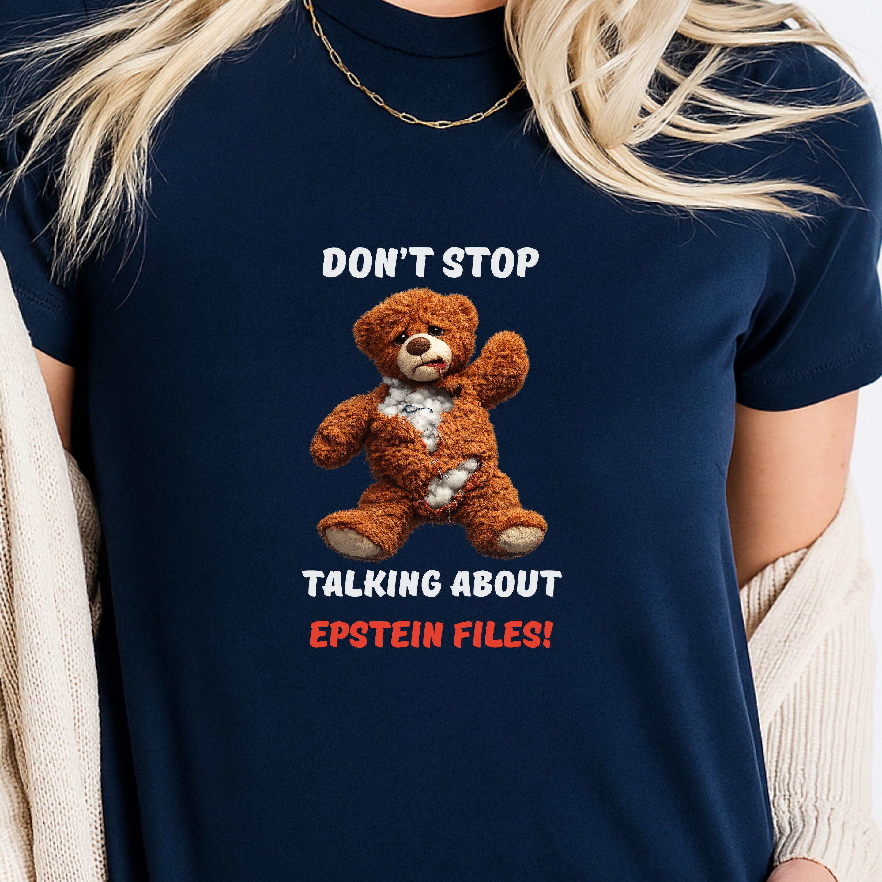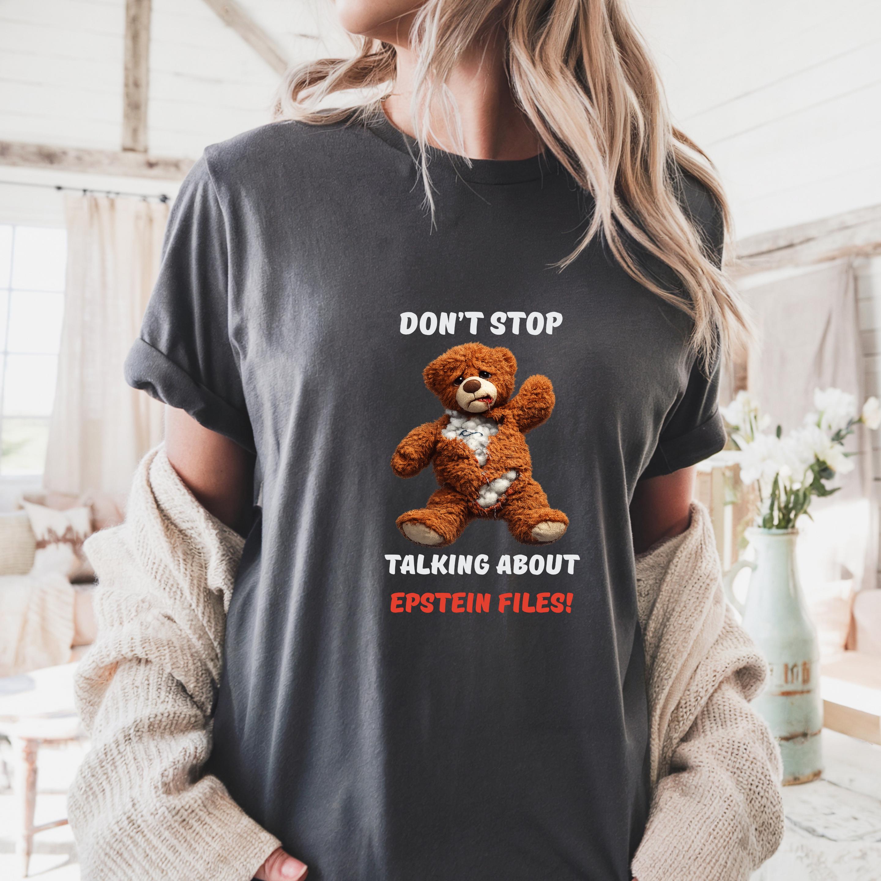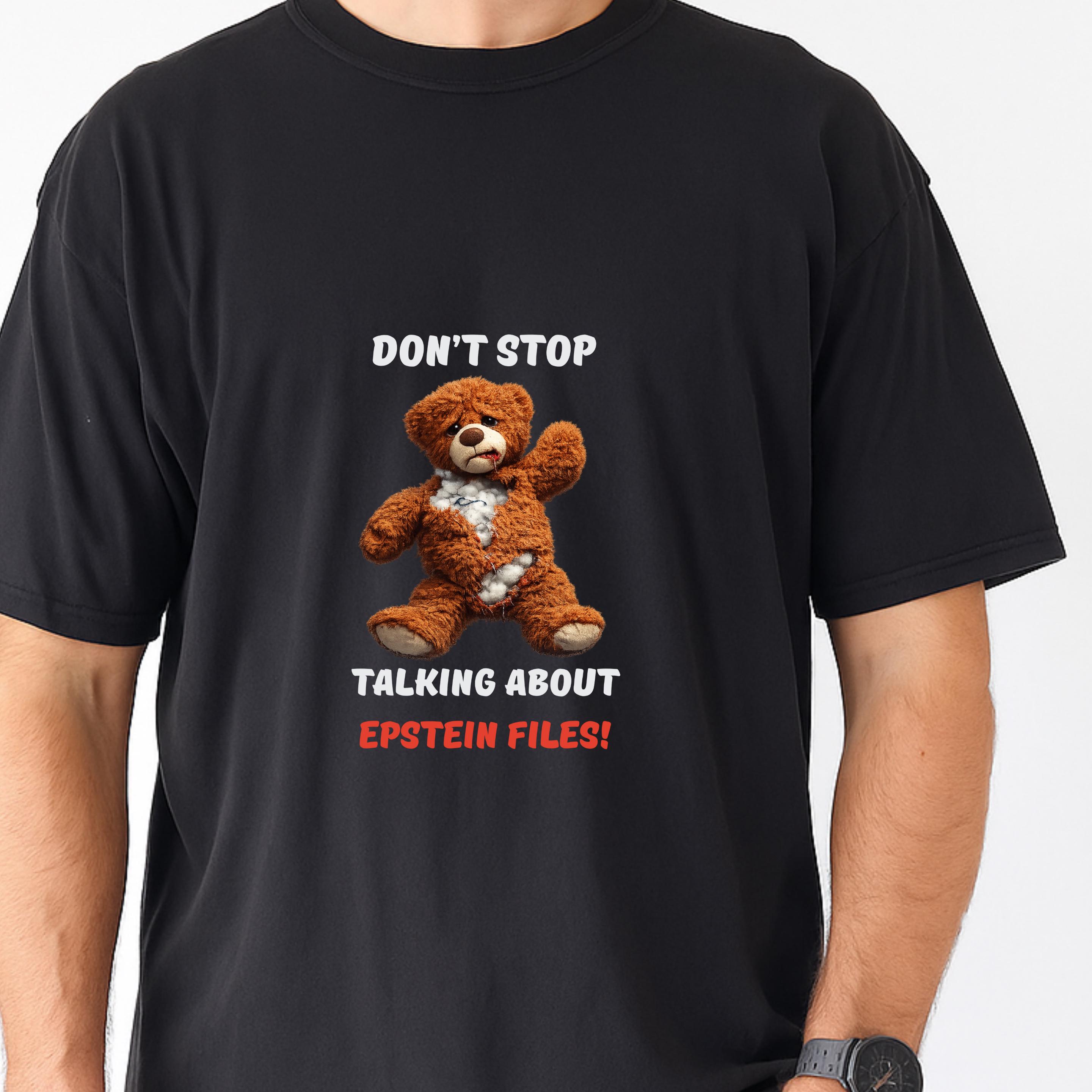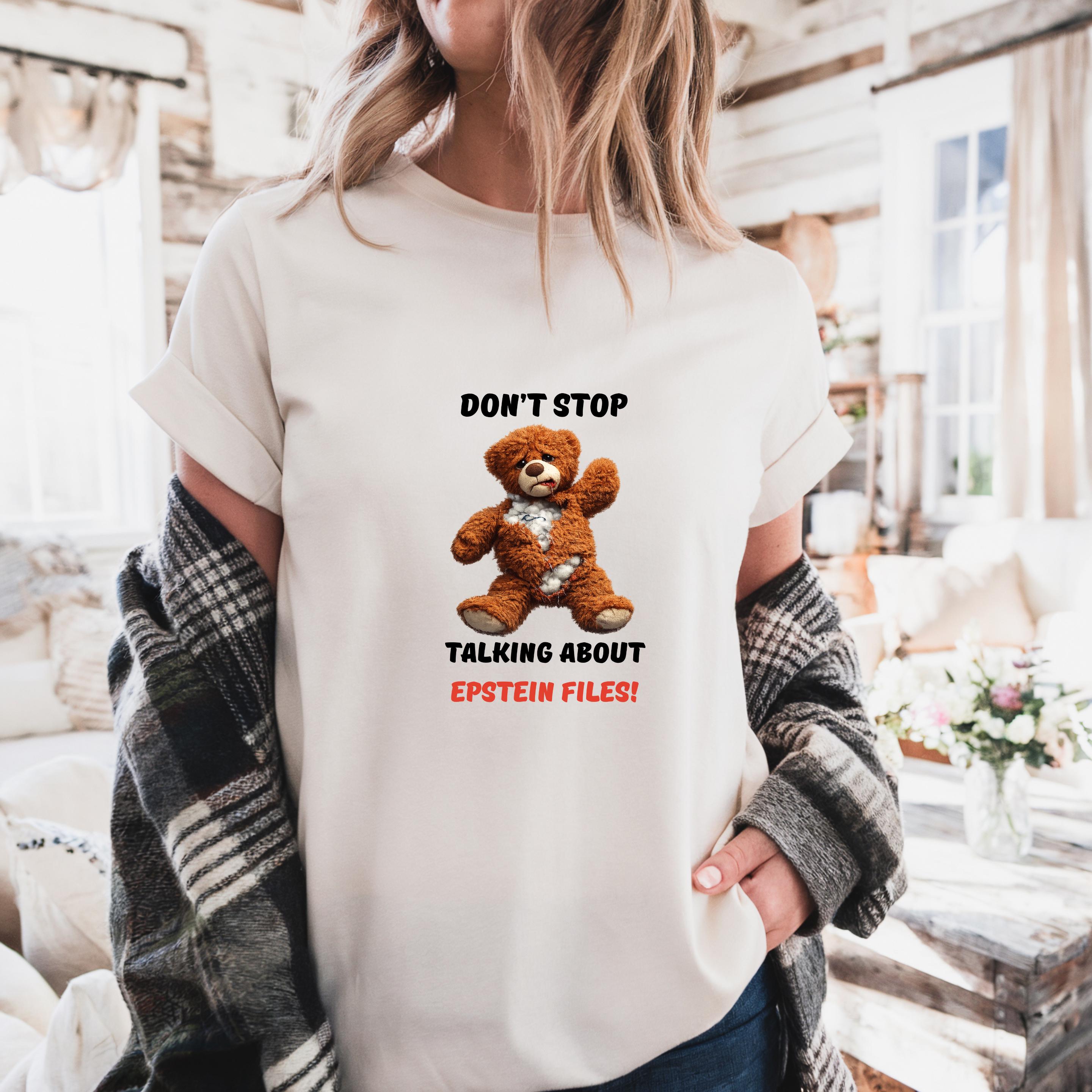 This striking design features a distressed teddy bear with visible stuffing alongside the bold message “Don’t Stop Talking About Epstein Files!” The image serves as a powerful metaphor for hidden truths being exposed, urging viewers not to look away from uncomfortable realities.
