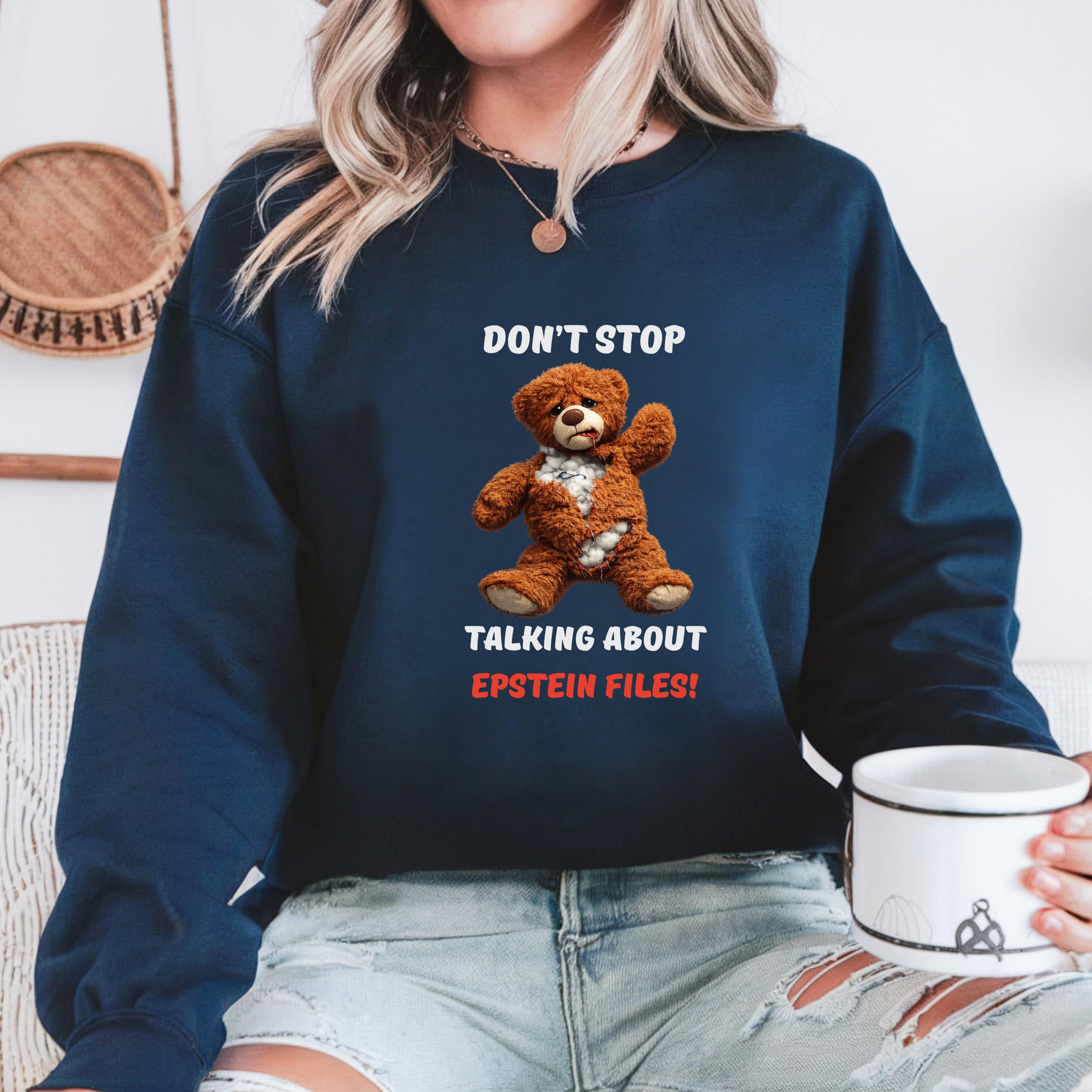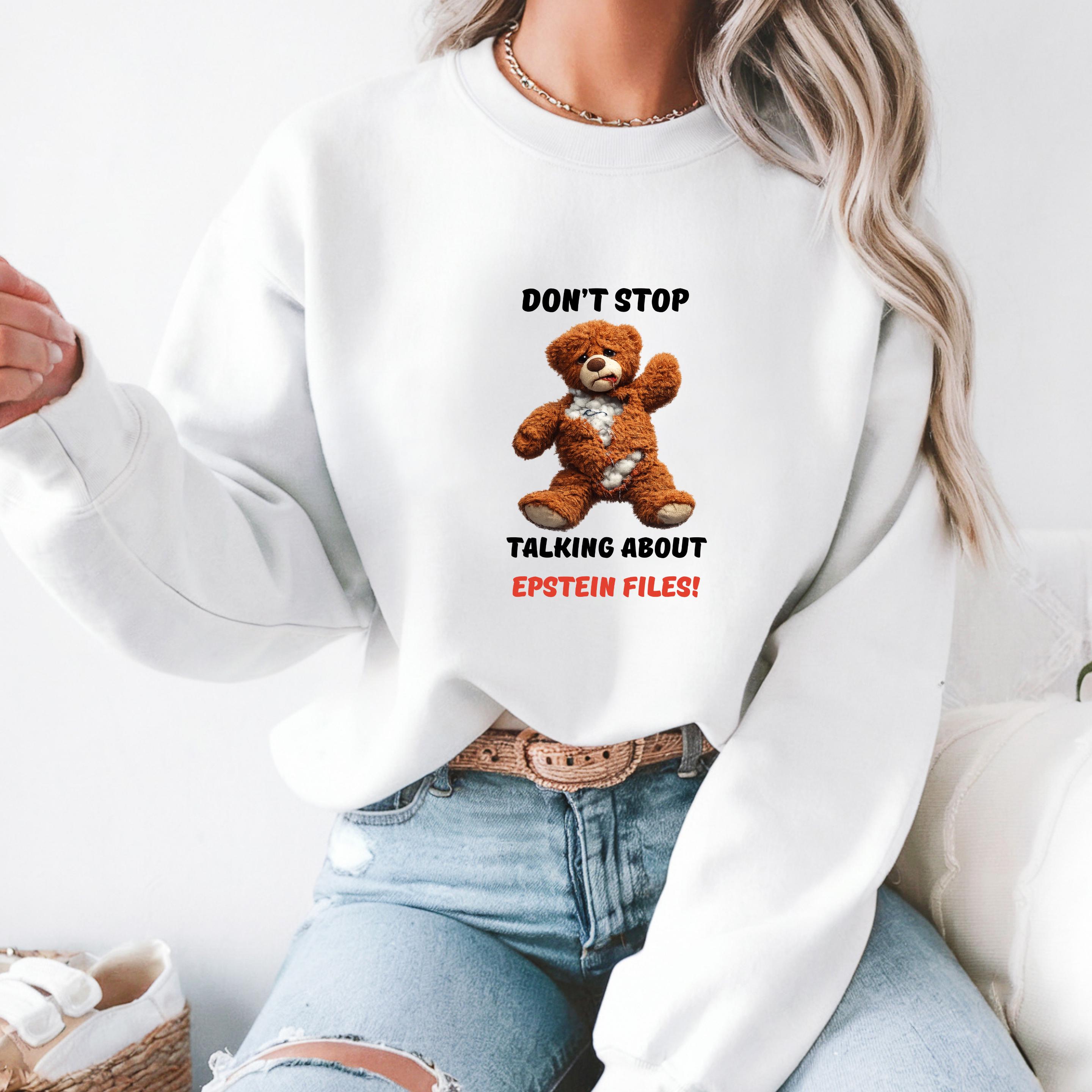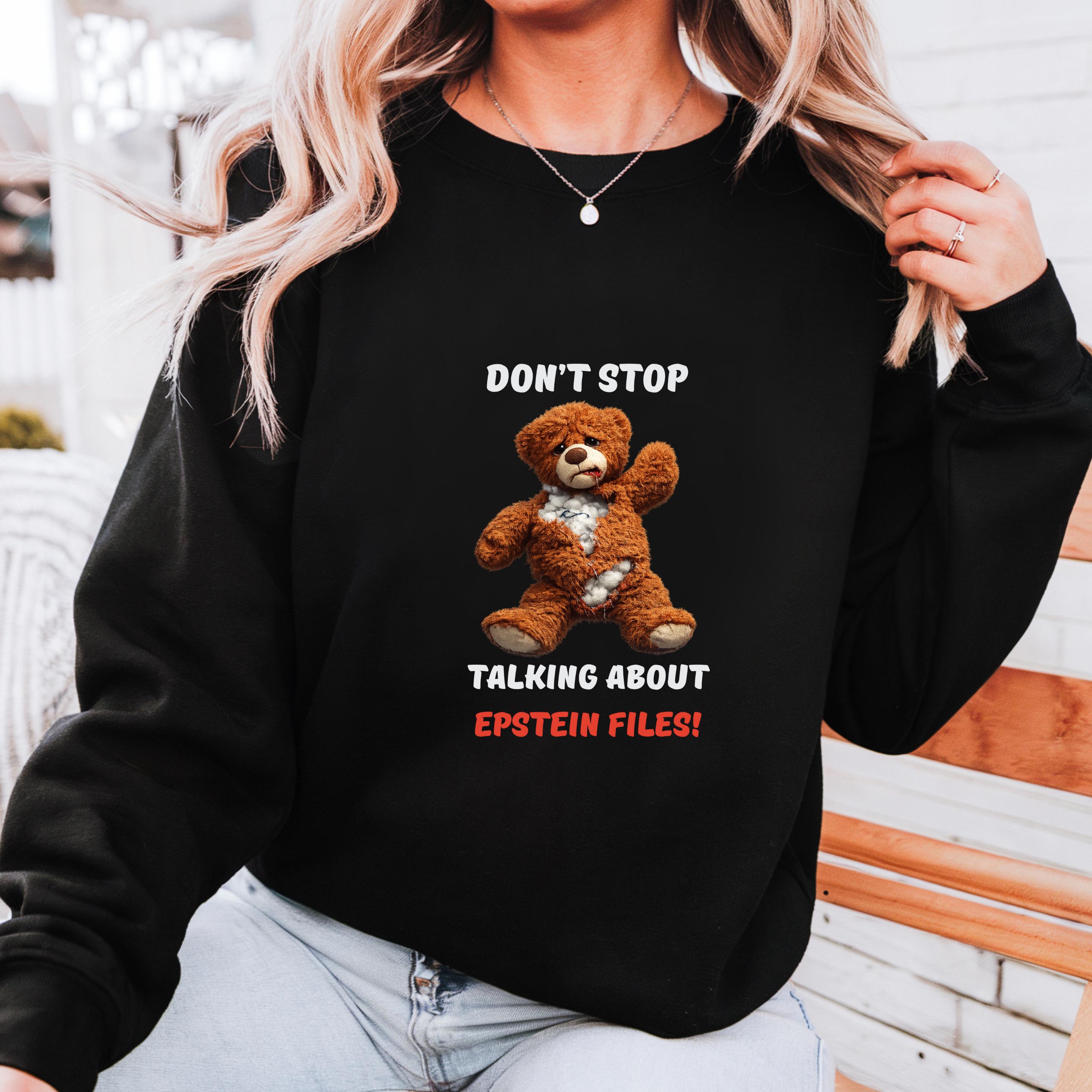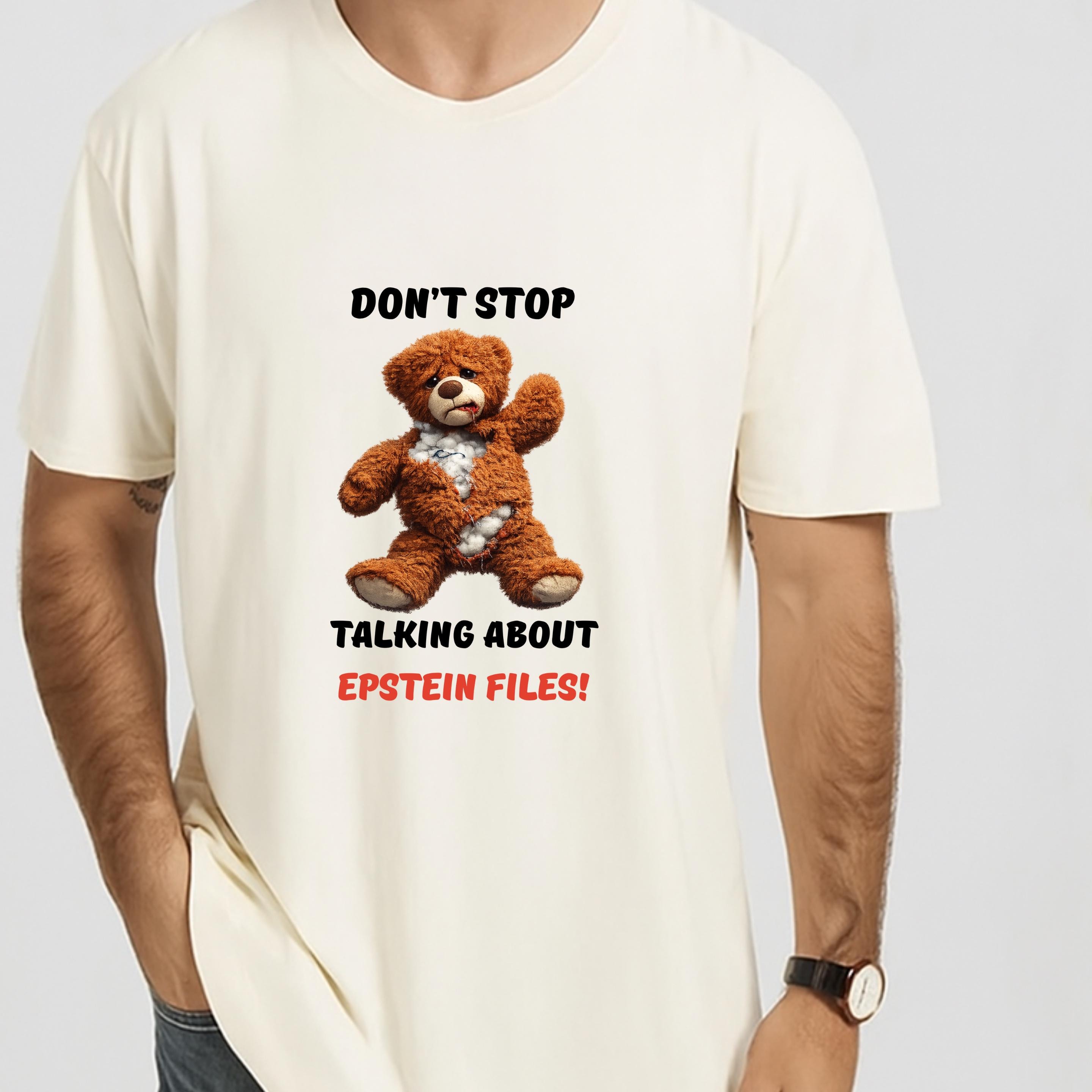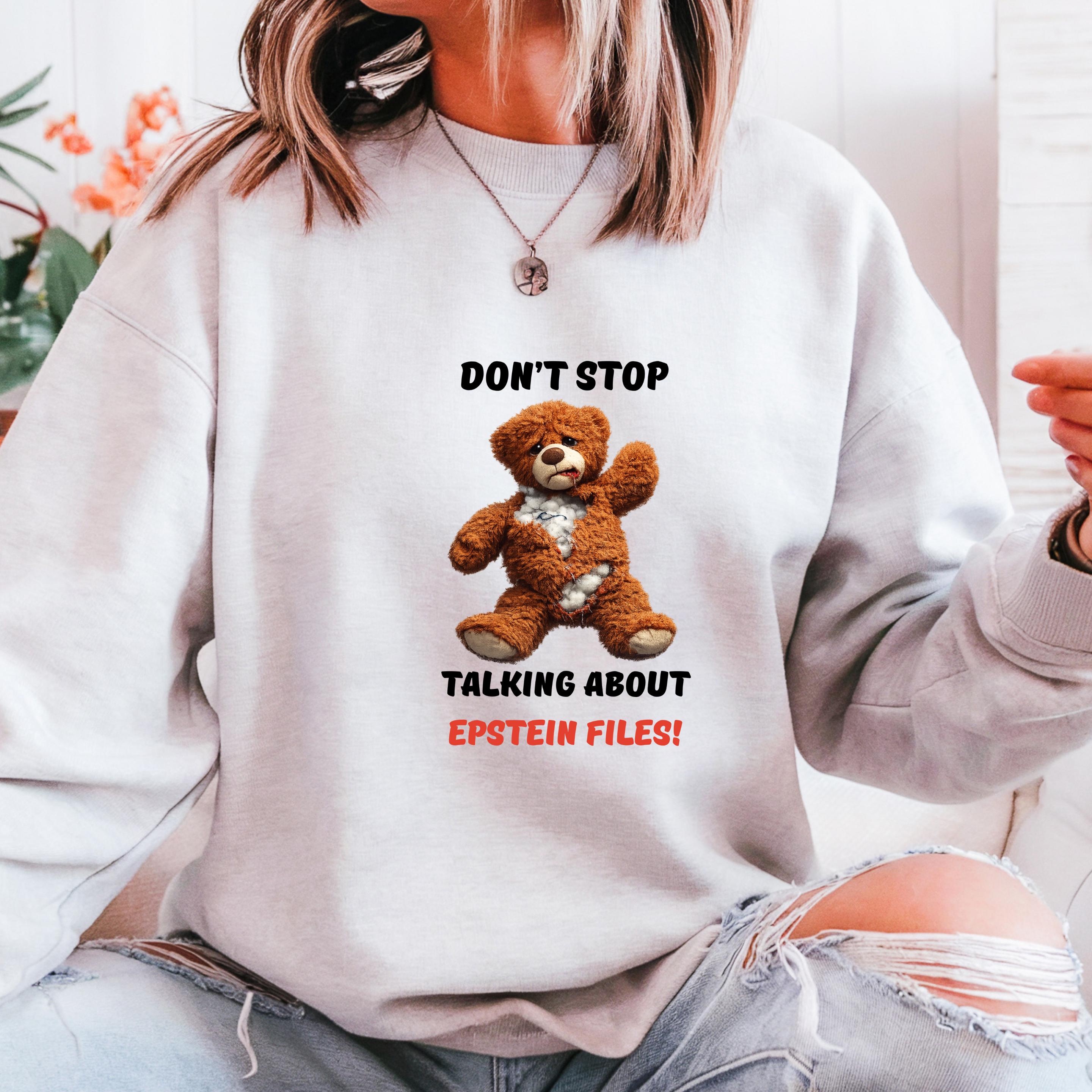 This striking design features a distressed teddy bear with visible stuffing alongside the bold message “Don’t Stop Talking About Epstein Files!” The image serves as a powerful metaphor for hidden truths being exposed, urging viewers not to look away from uncomfortable realities.