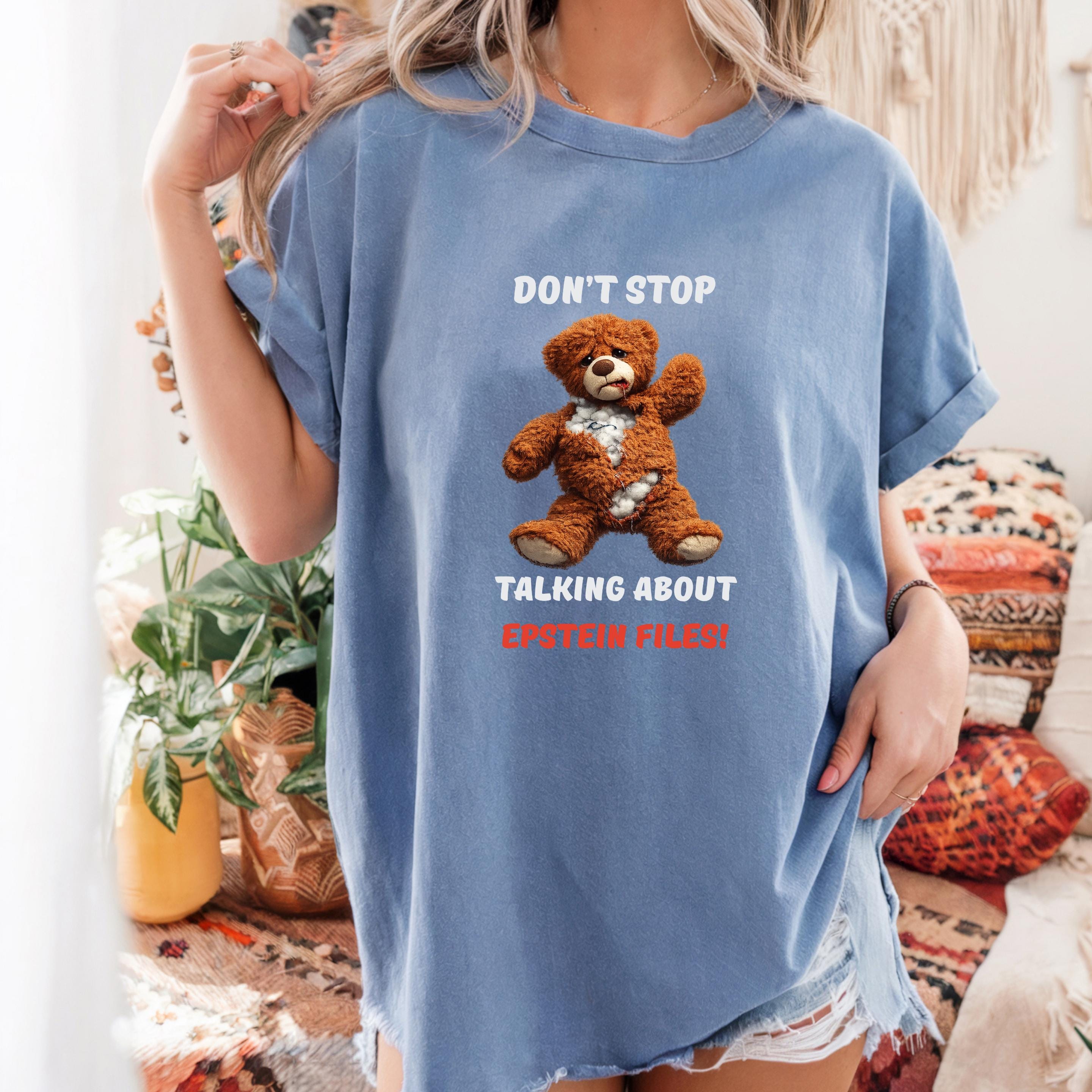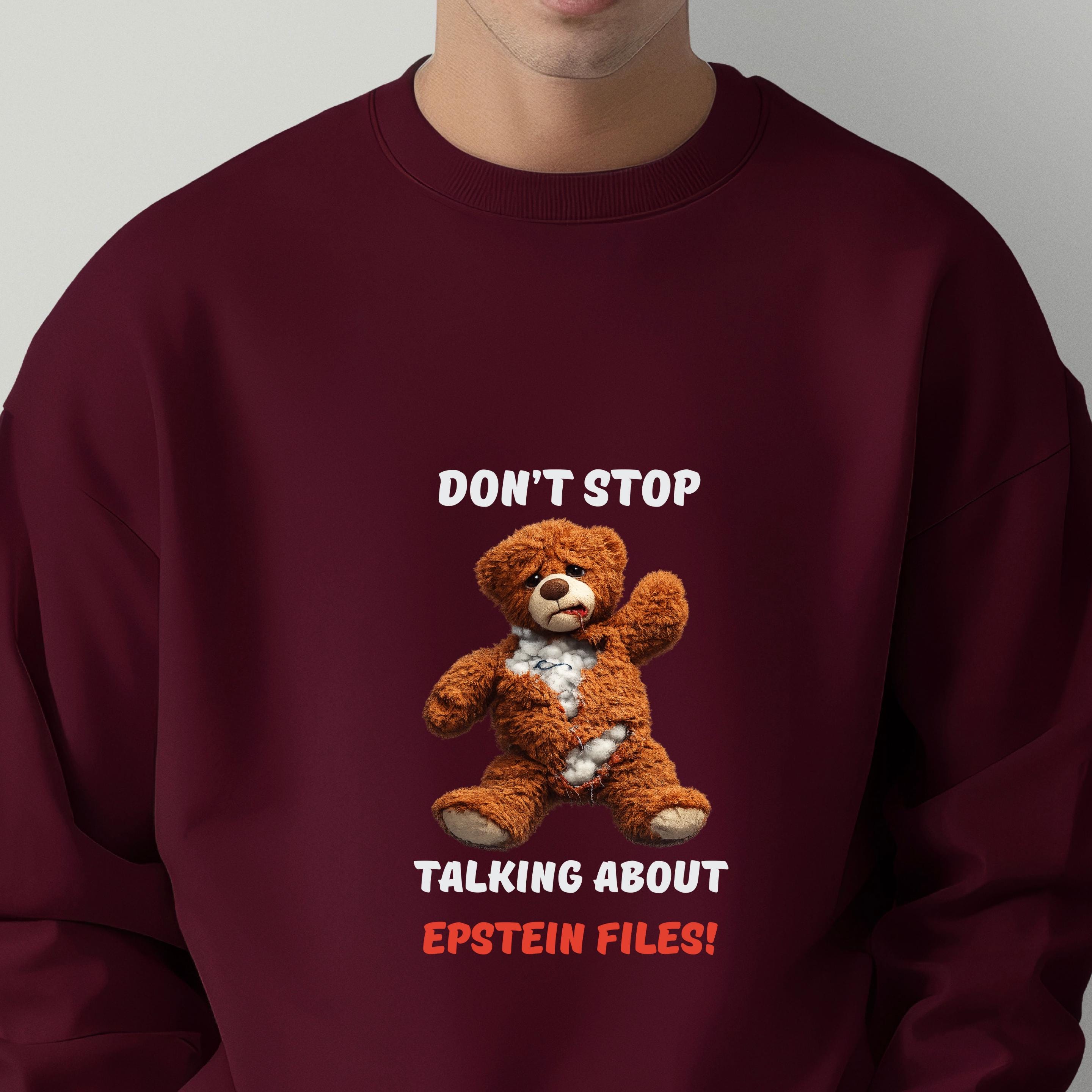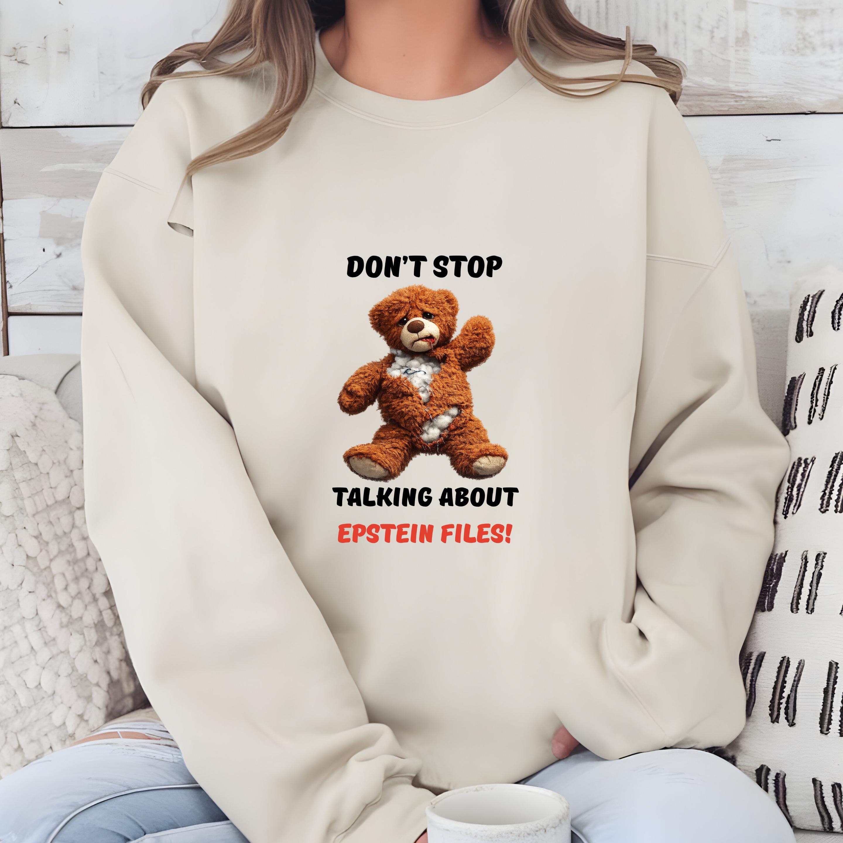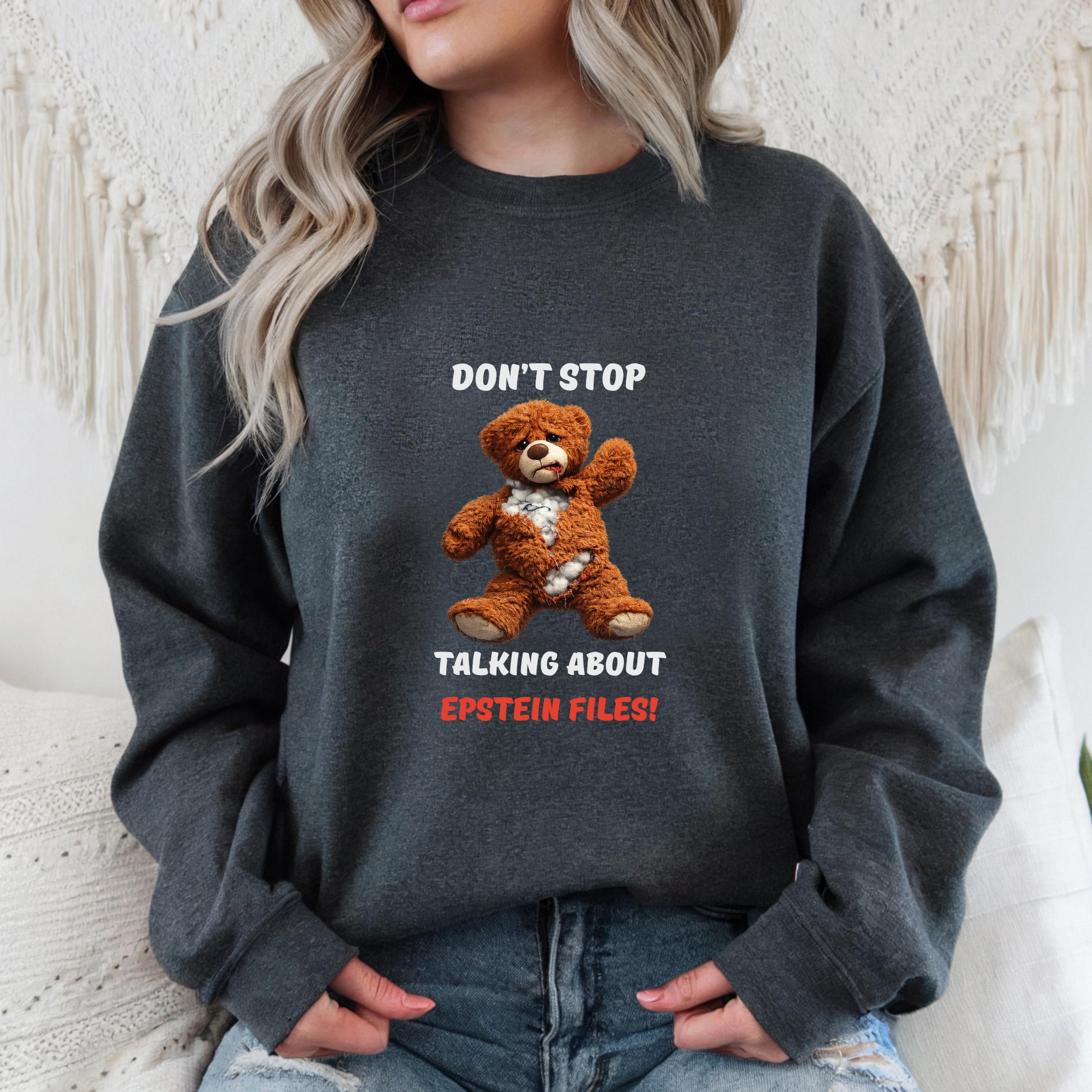 This striking design features a distressed teddy bear with visible stuffing alongside the bold message “Don’t Stop Talking About Epstein Files!” The image serves as a powerful metaphor for hidden truths being exposed, urging viewers not to look away from uncomfortable realities.