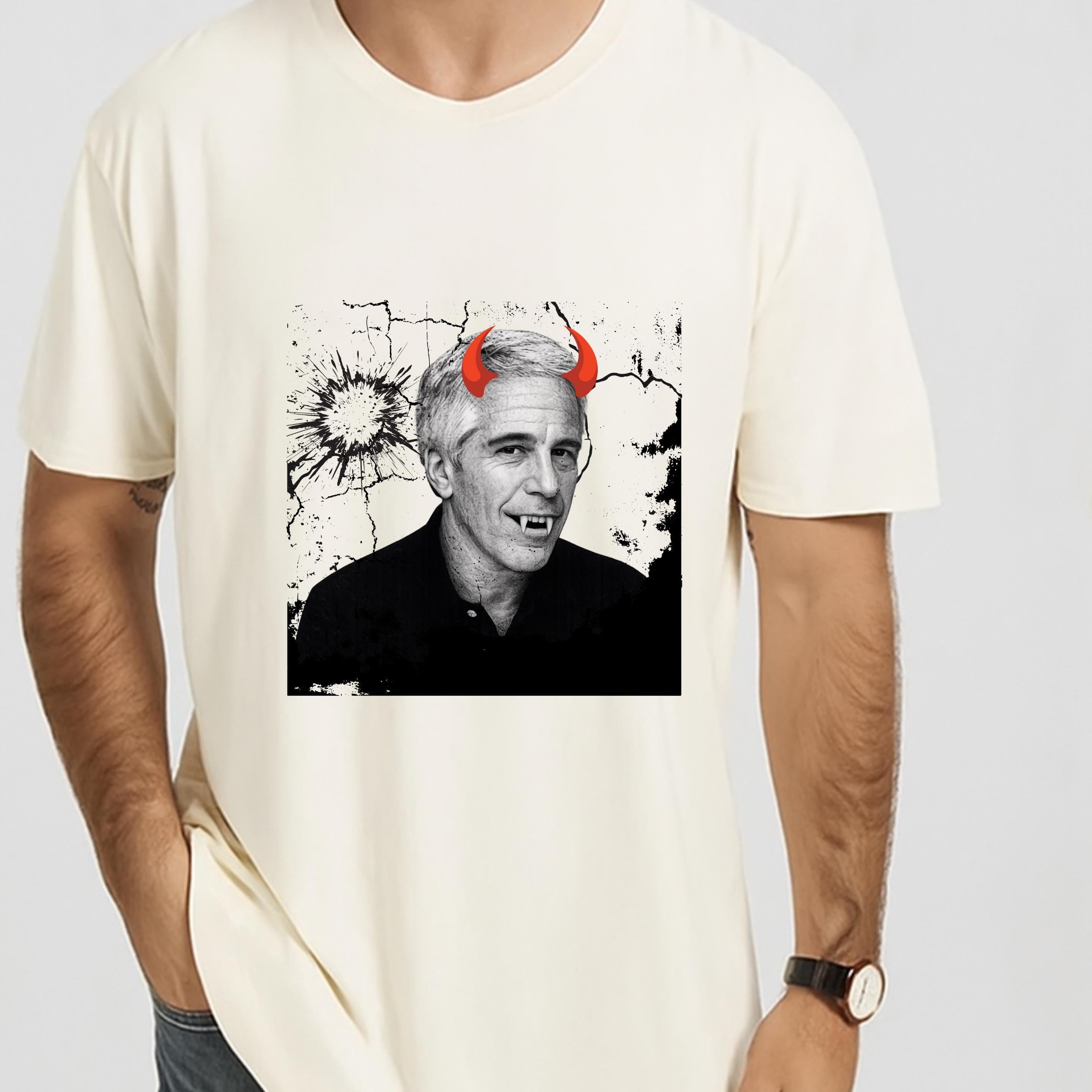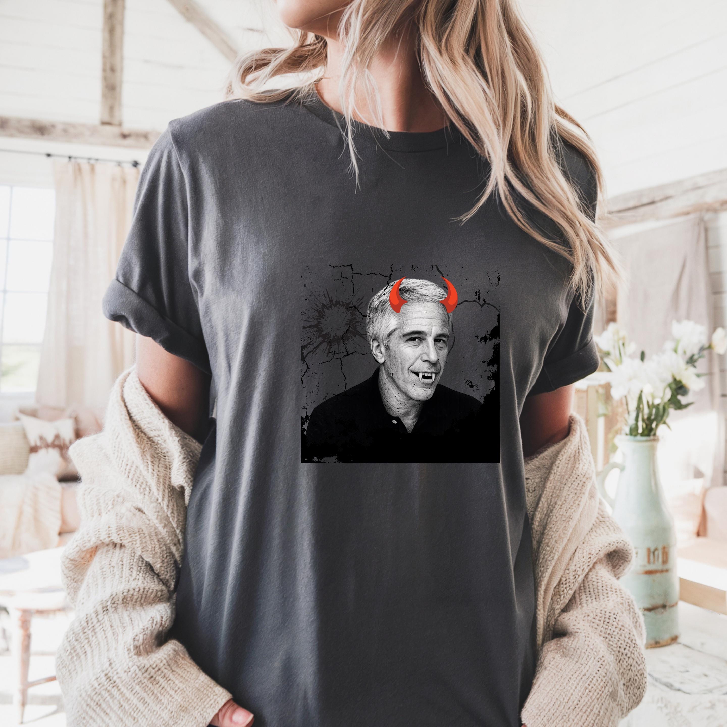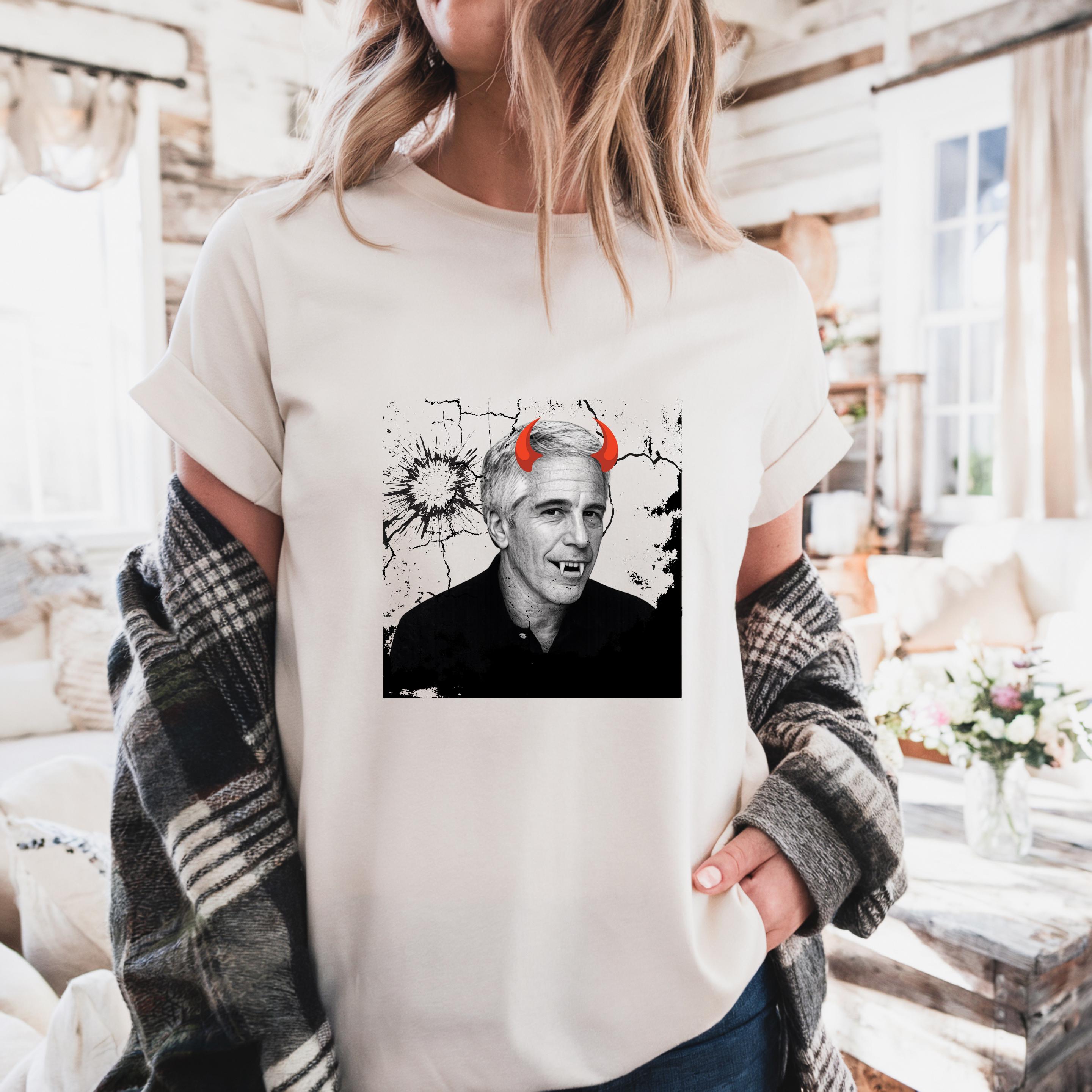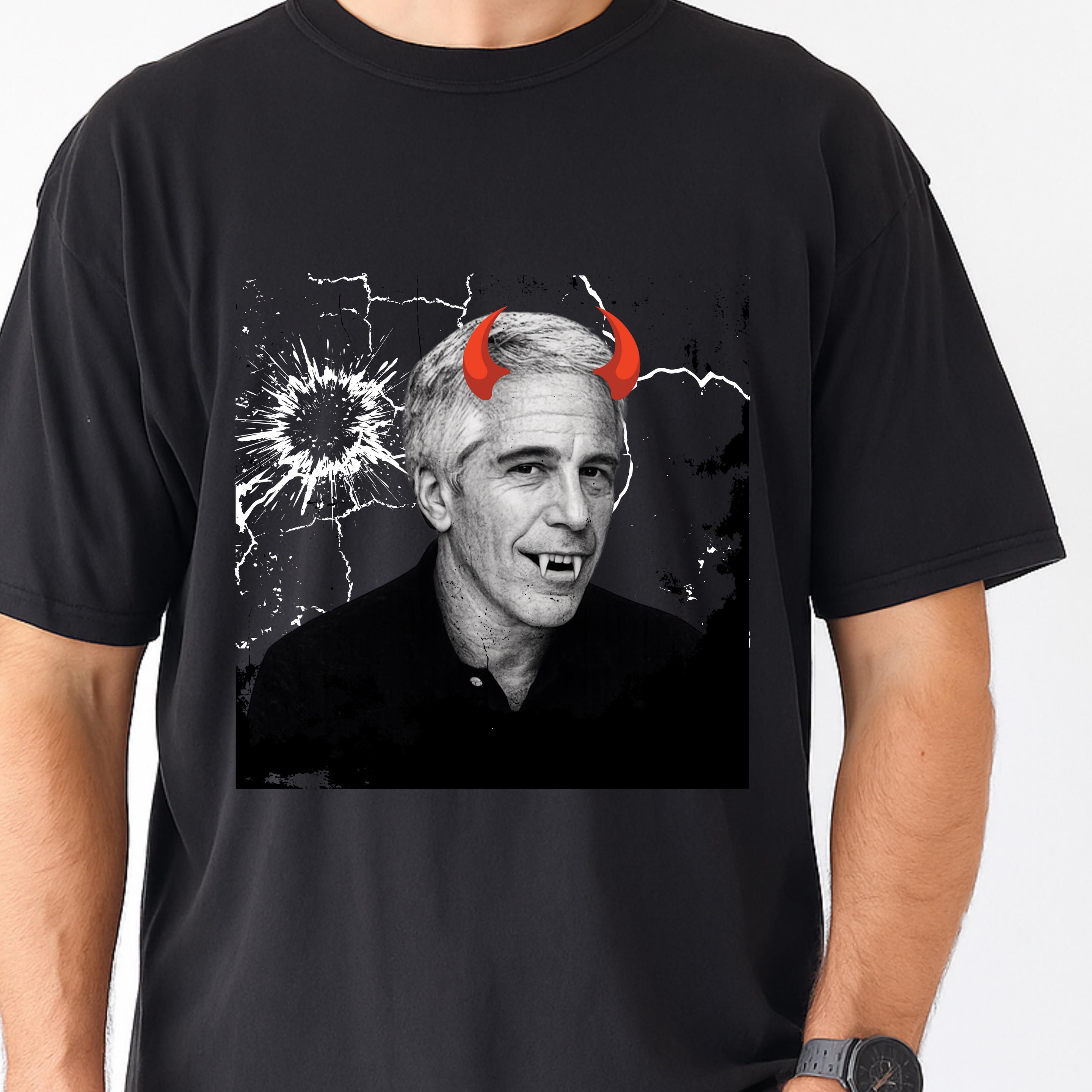 The added red devil horns sharpen the message: this is not just a portrait, but a visual indictment of systems that protect abusers rather than victims. The minimalist black-and-white base ensures the design reads clearly on both black and light garments, making it versatile for streetwear, protest attire, or statement fashion.