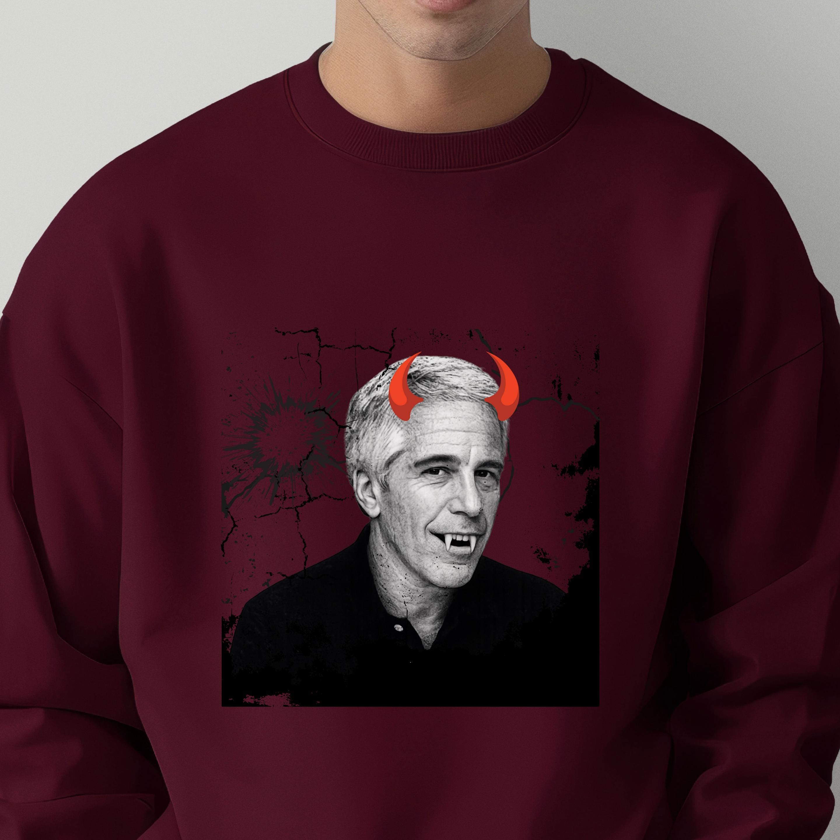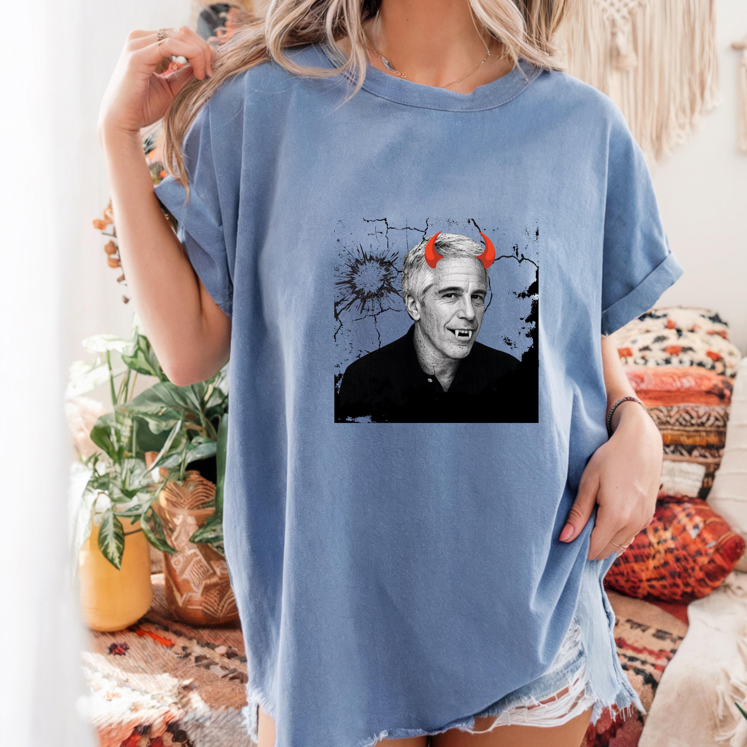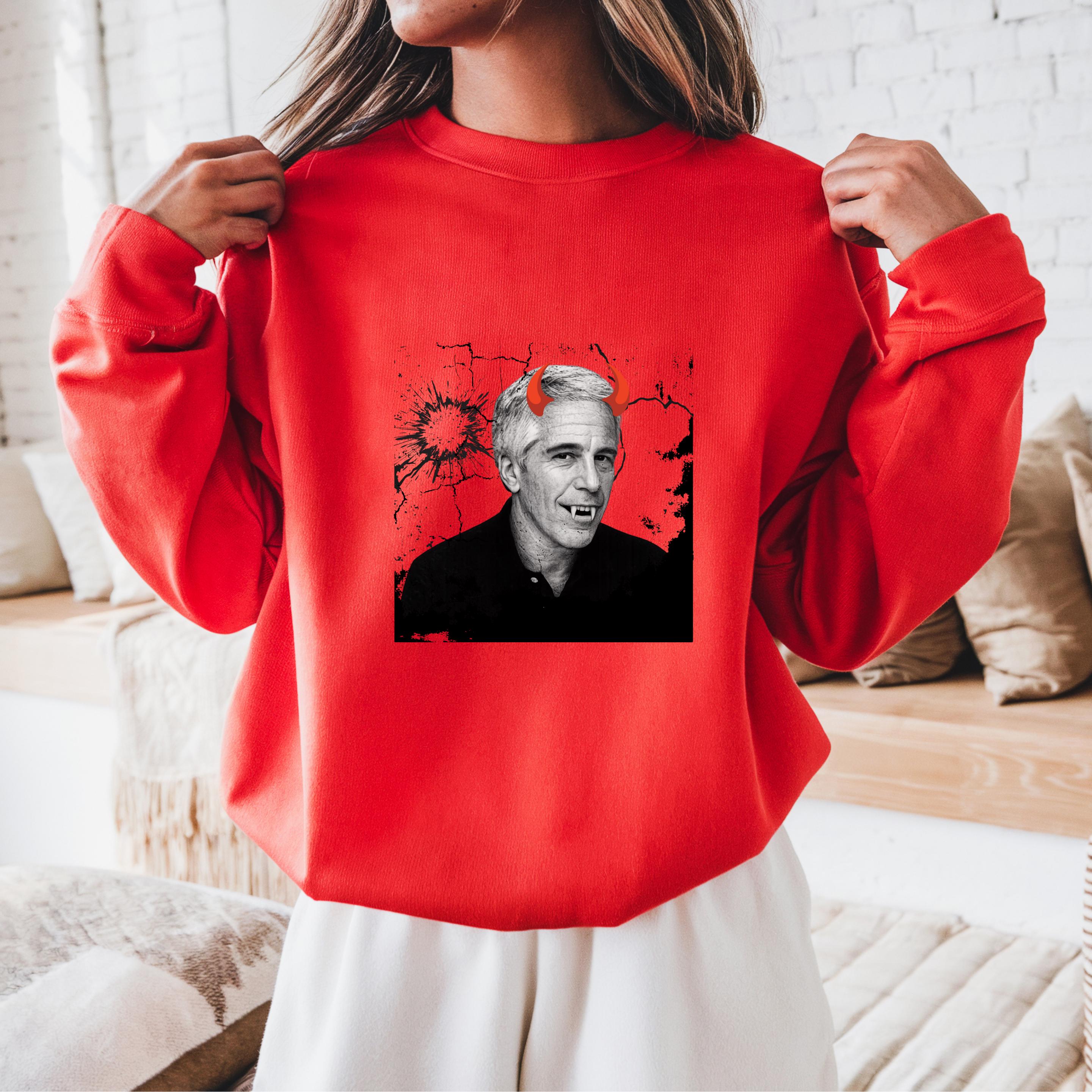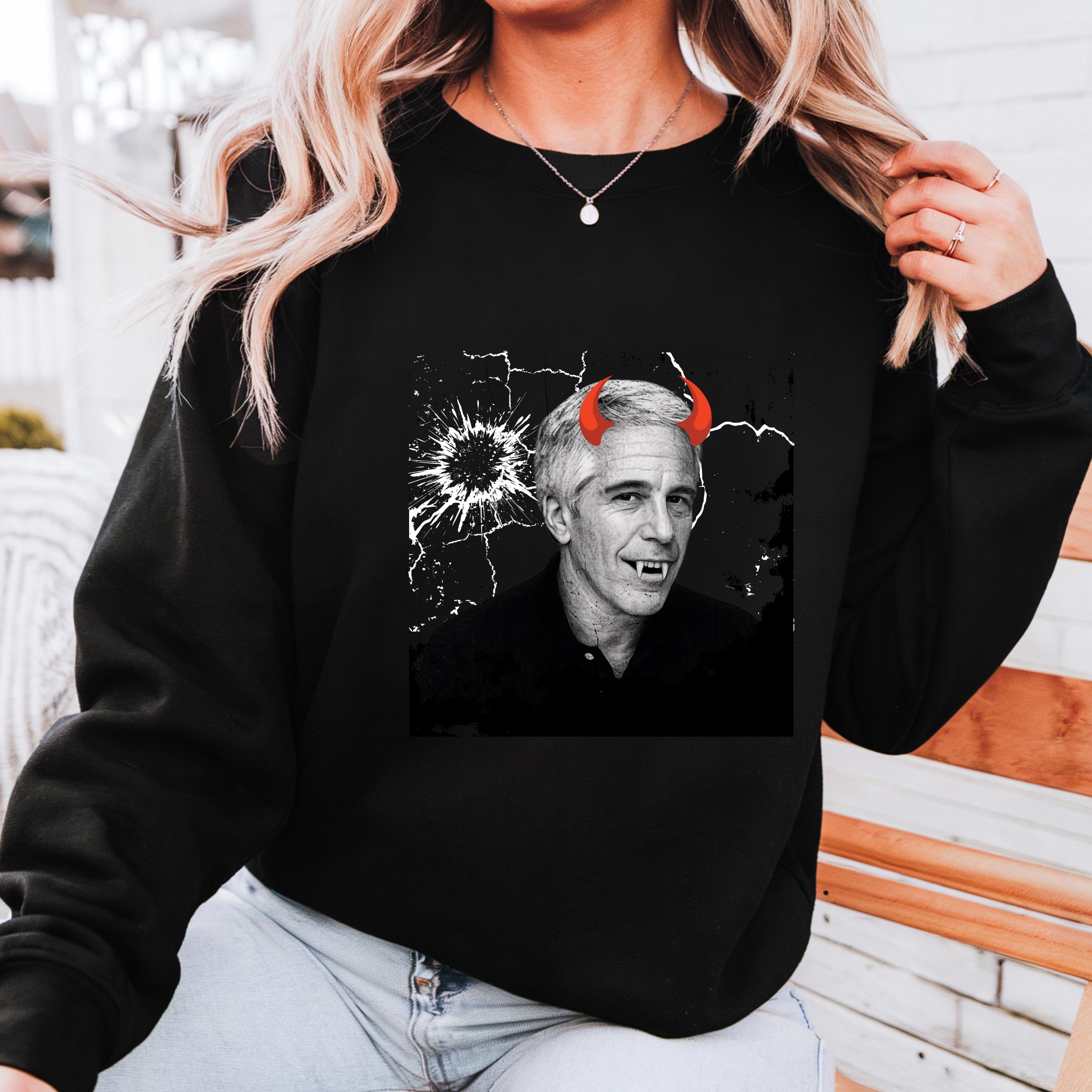 The added red devil horns sharpen the message: this is not just a portrait, but a visual indictment of systems that protect abusers rather than victims. The minimalist black-and-white base ensures the design reads clearly on both black and light garments, making it versatile for streetwear, protest attire, or statement fashion.