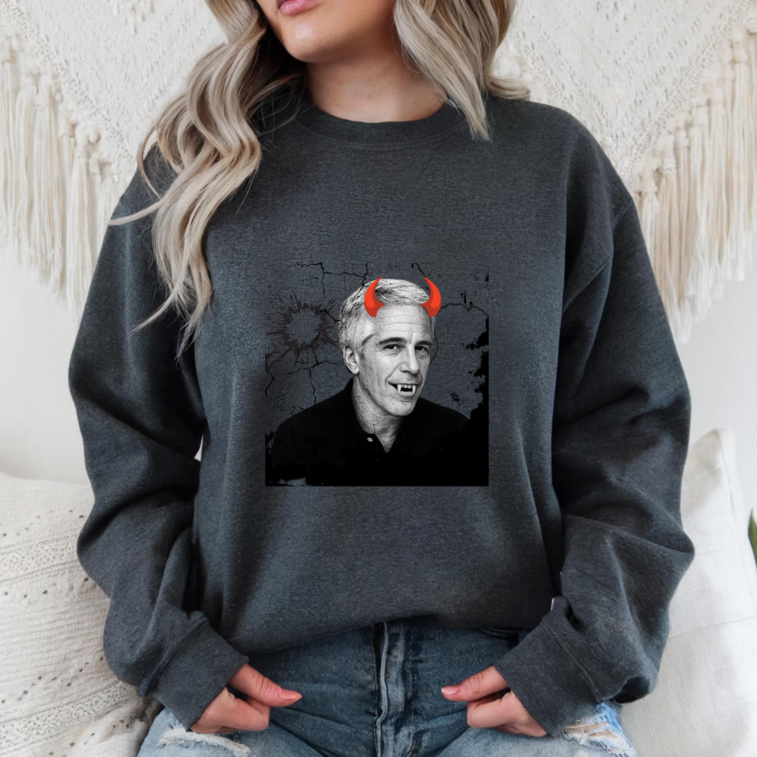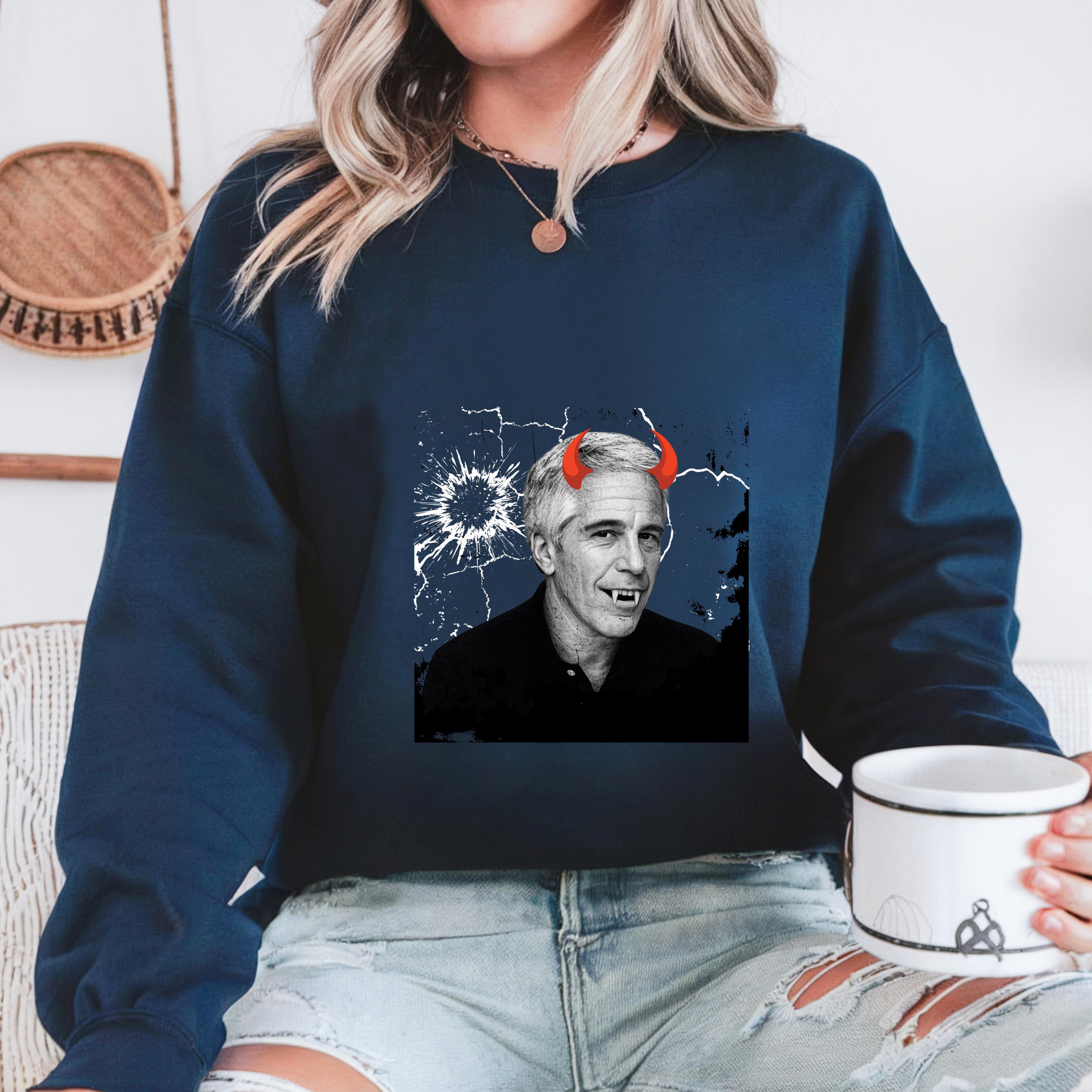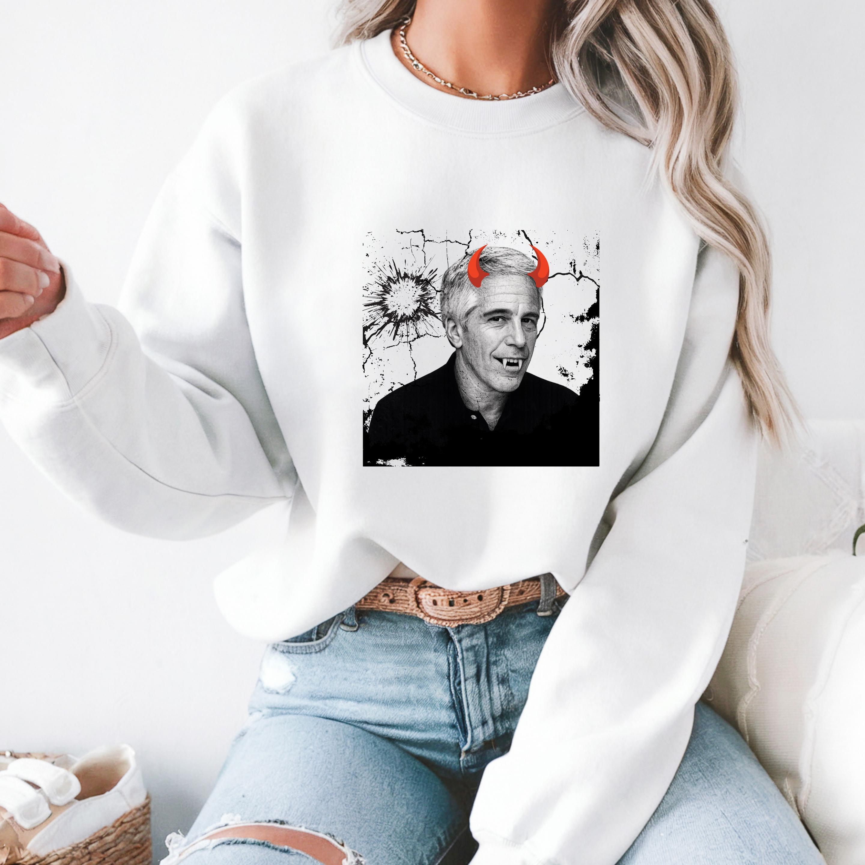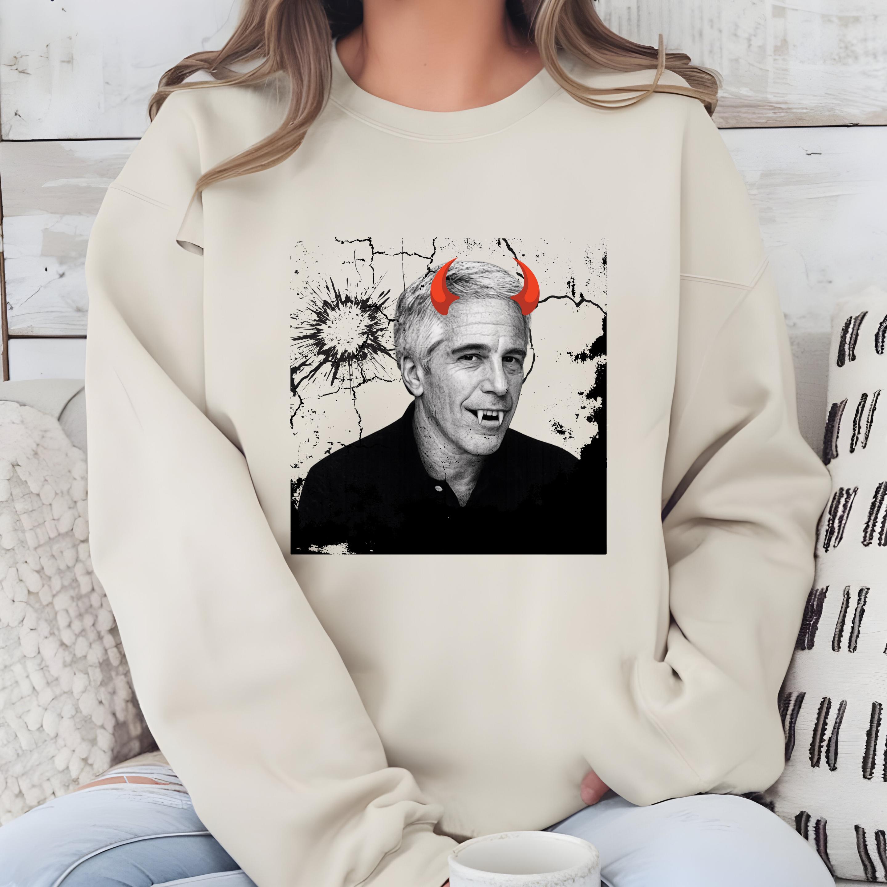 The added red devil horns sharpen the message: this is not just a portrait, but a visual indictment of systems that protect abusers rather than victims. The minimalist black-and-white base ensures the design reads clearly on both black and light garments, making it versatile for streetwear, protest attire, or statement fashion.