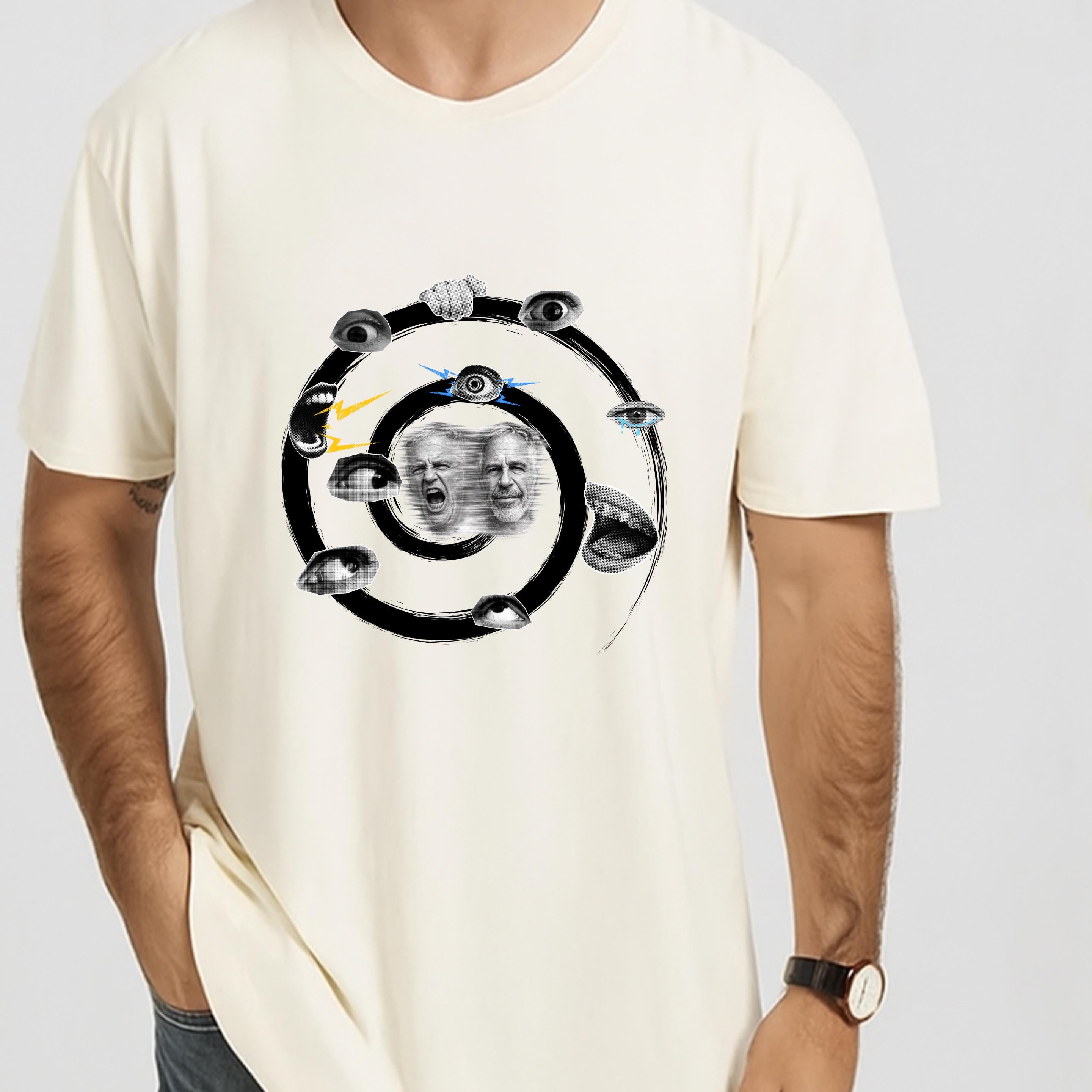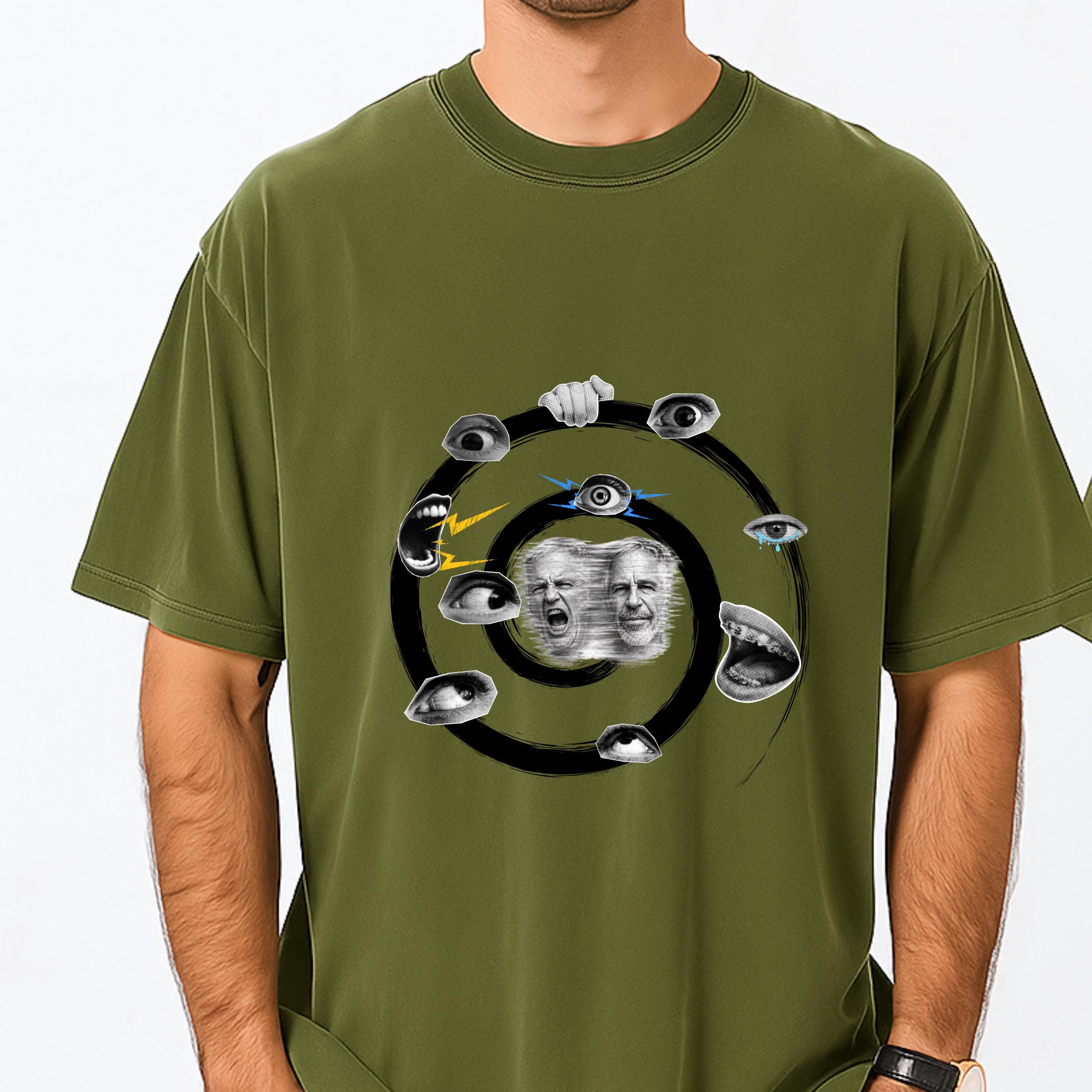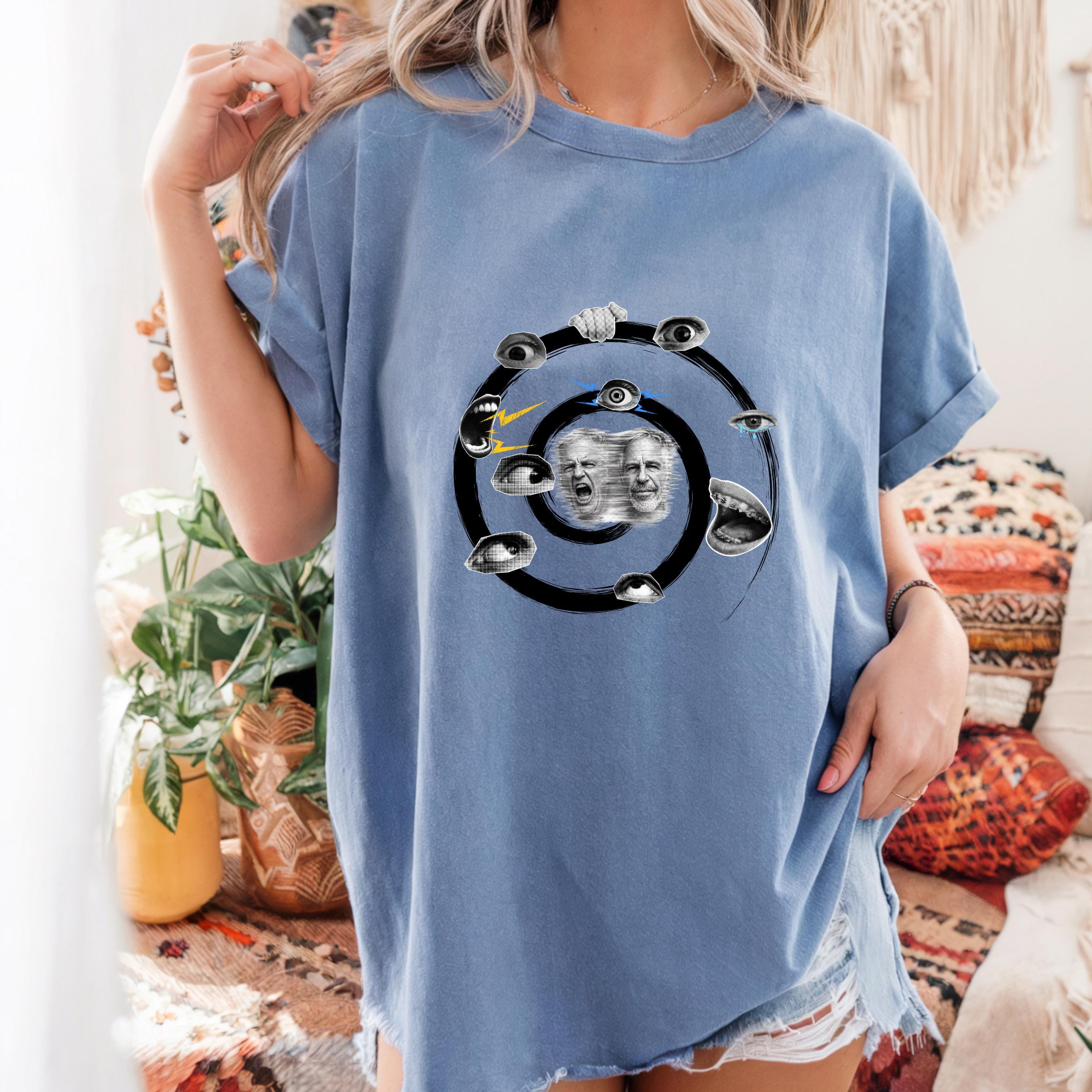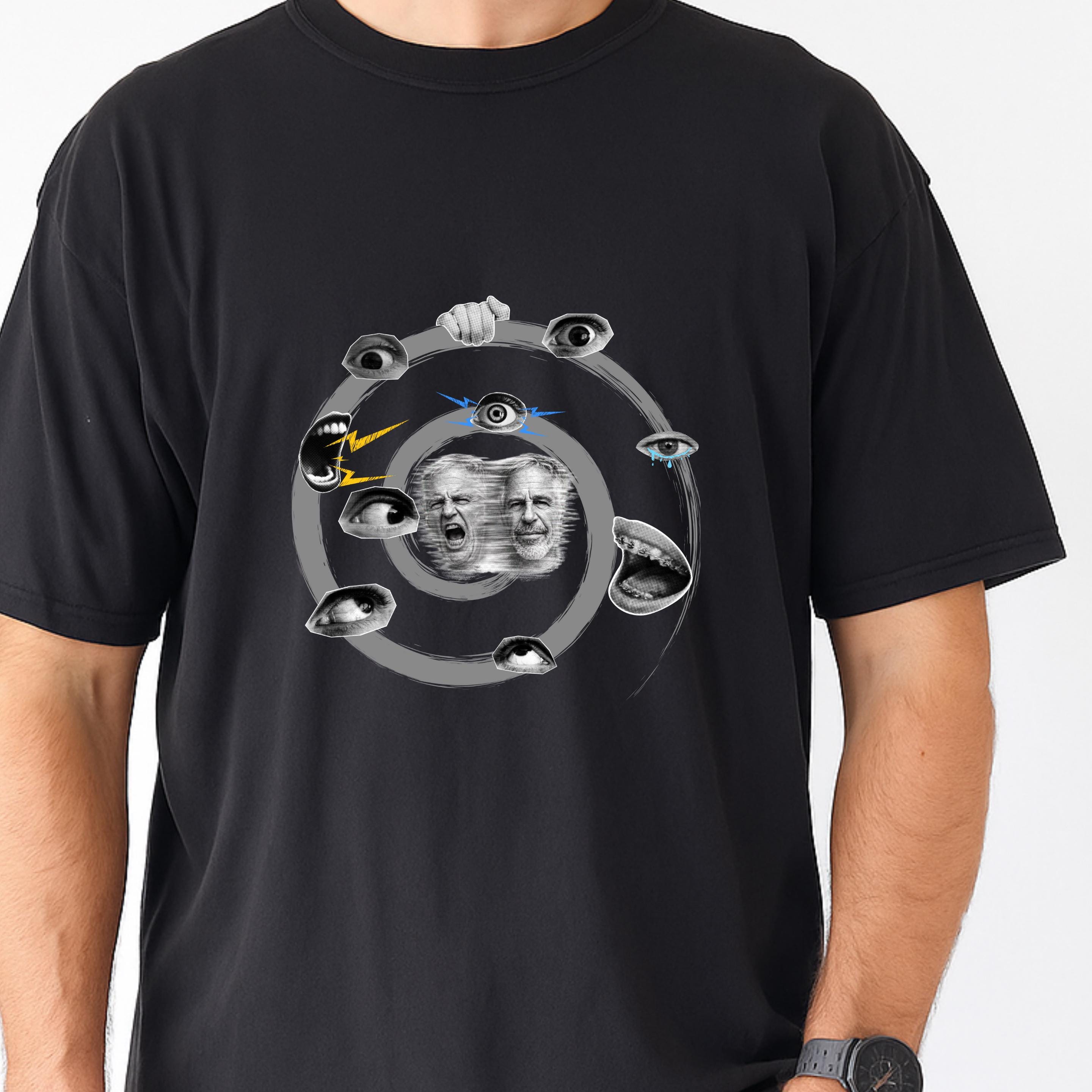 This design is a stark visual reckoning with power, silence, and the voices that refuse to disappear. The figure at the center is not the watcher, but the watched — surrounded by the eyes of victims, witnesses, and those who dared to speak when others stayed silent.