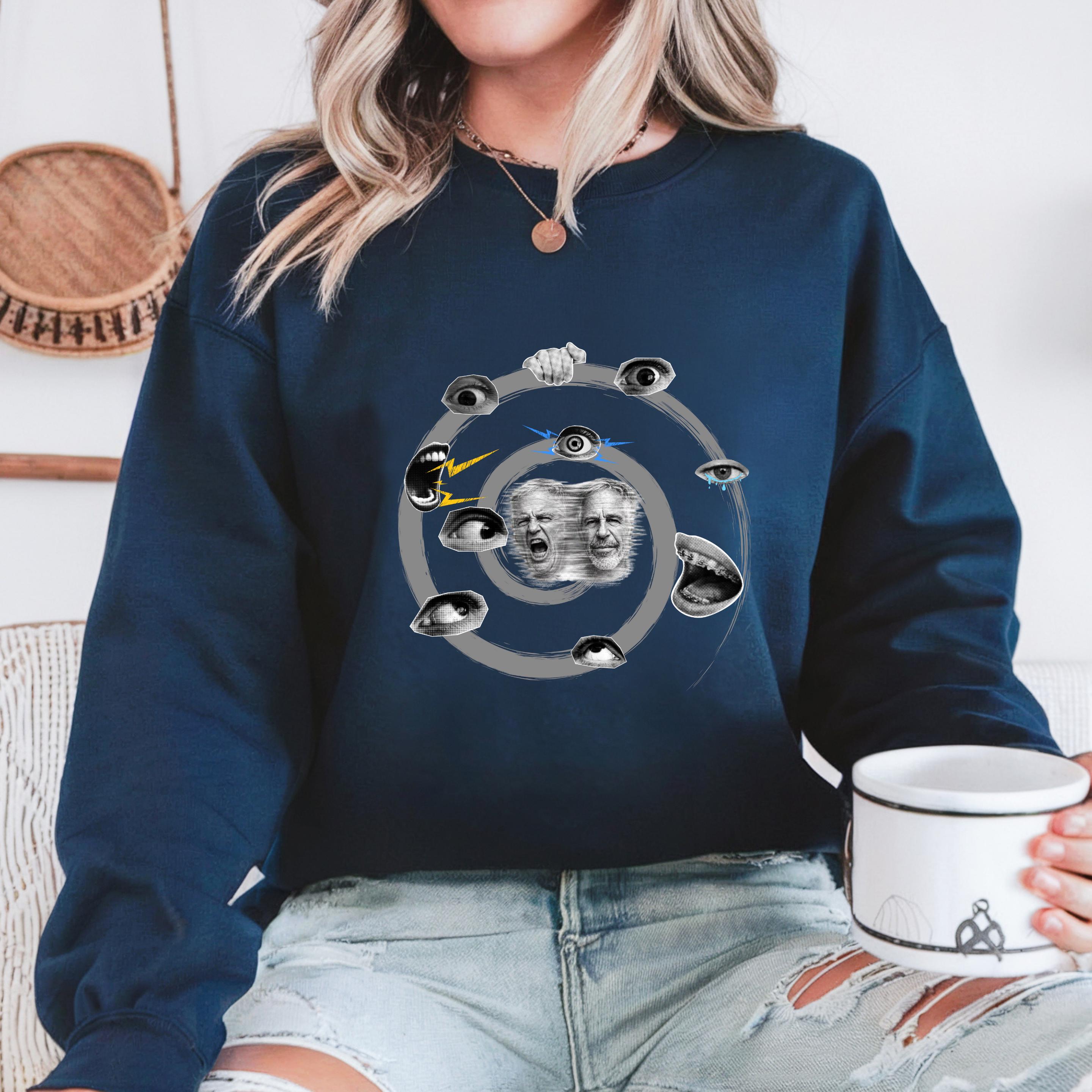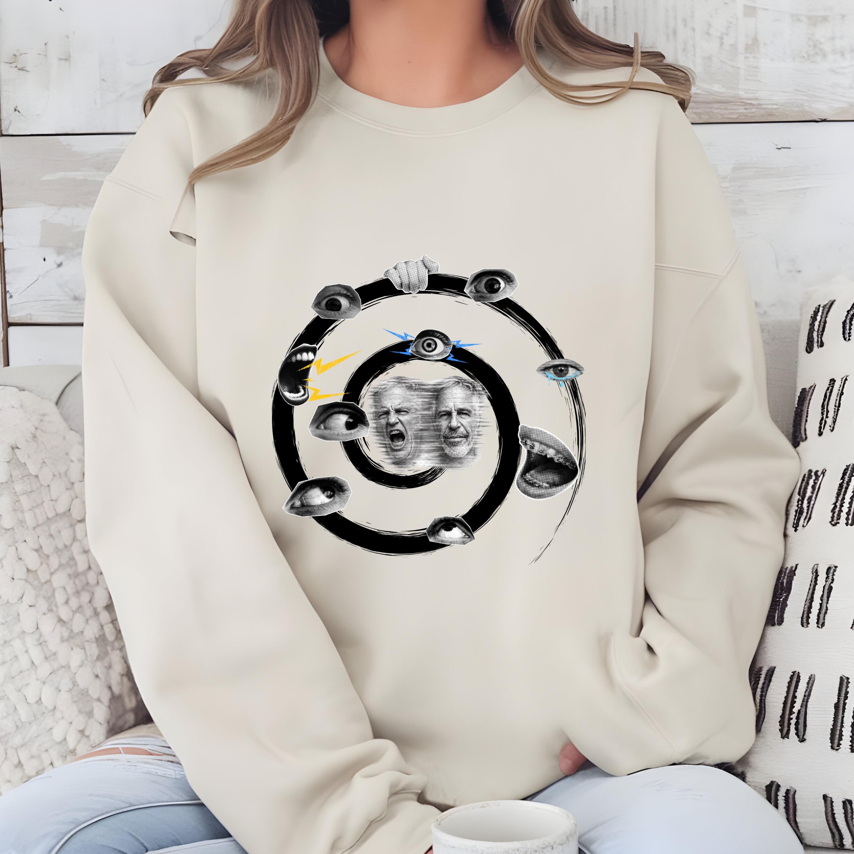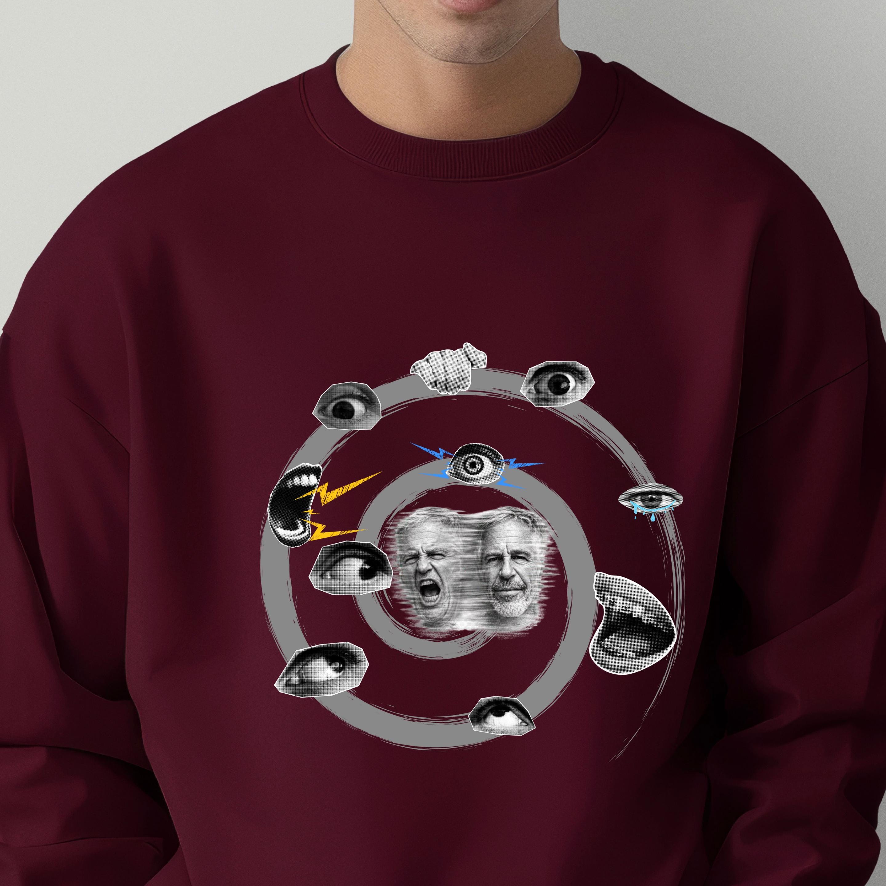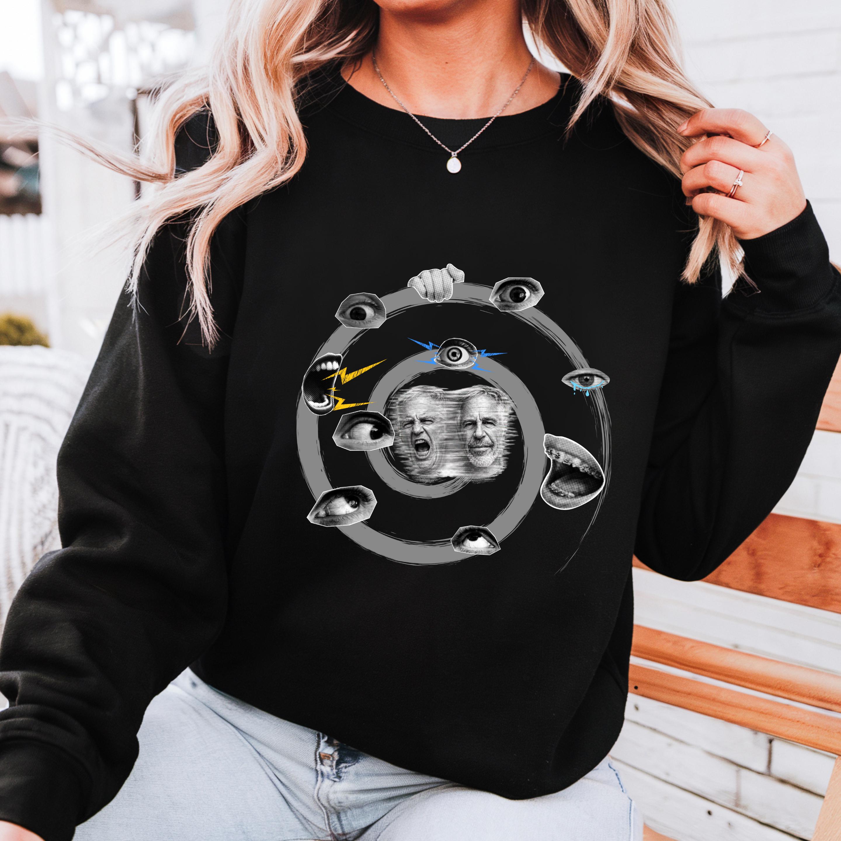 This design is a stark visual reckoning with power, silence, and the voices that refuse to disappear. The figure at the center is not the watcher, but the watched — surrounded by the eyes of victims, witnesses, and those who dared to speak when others stayed silent.