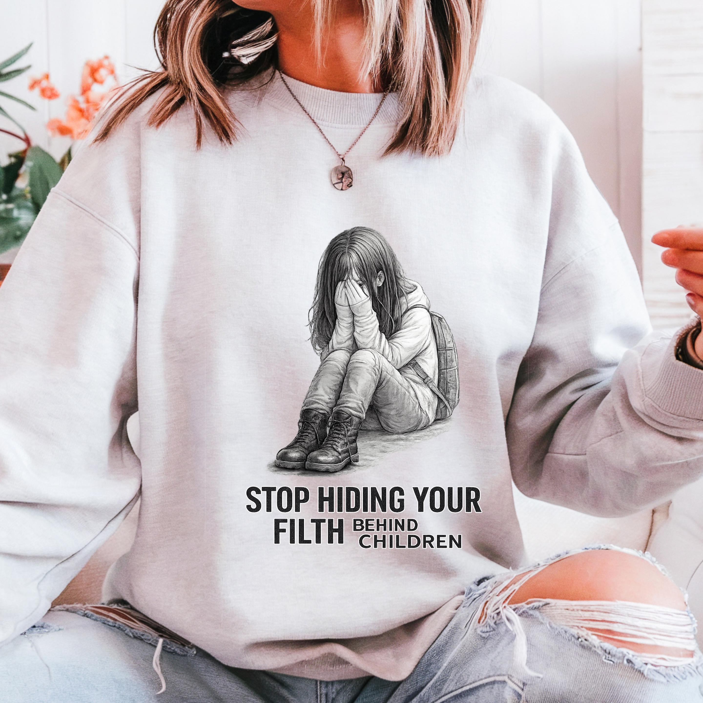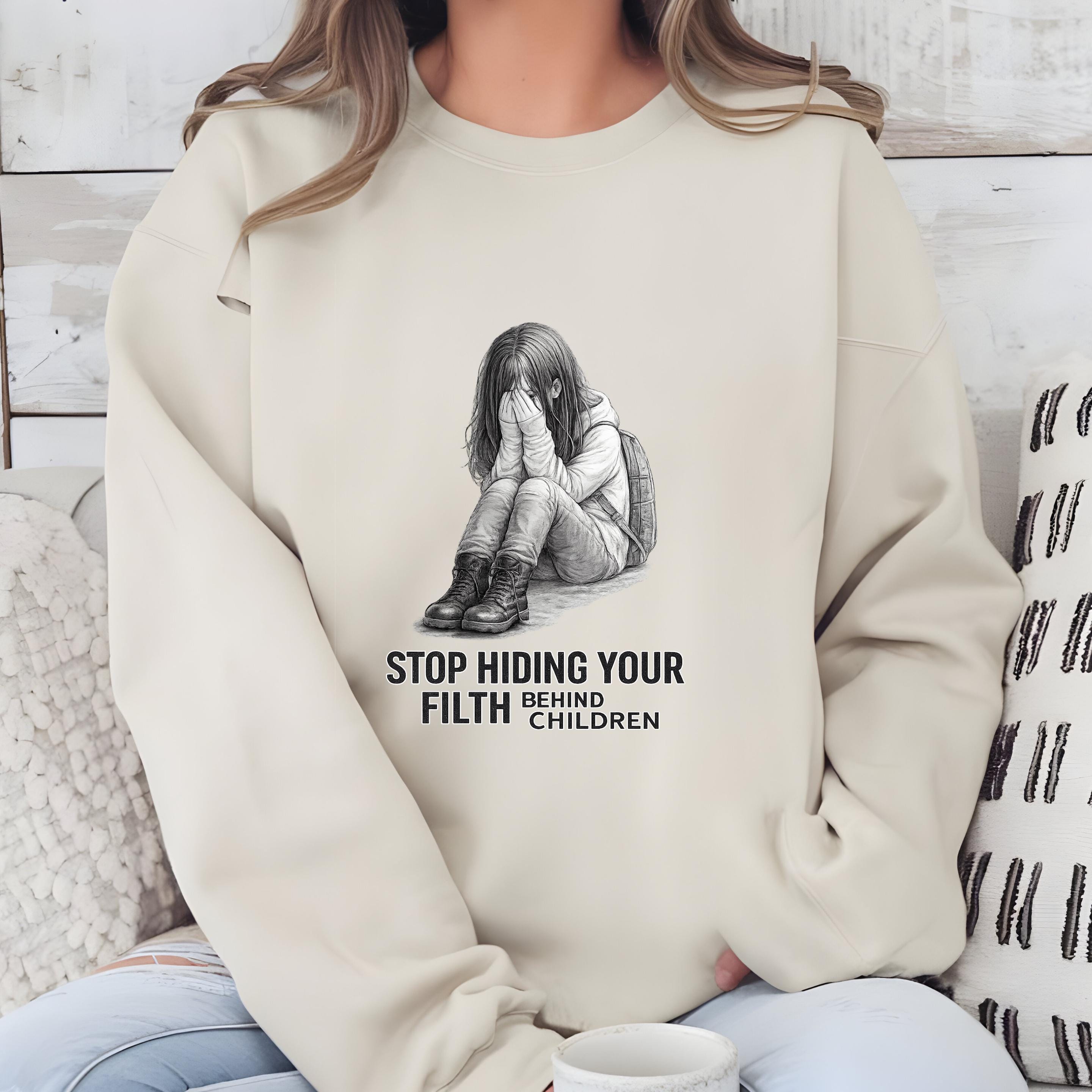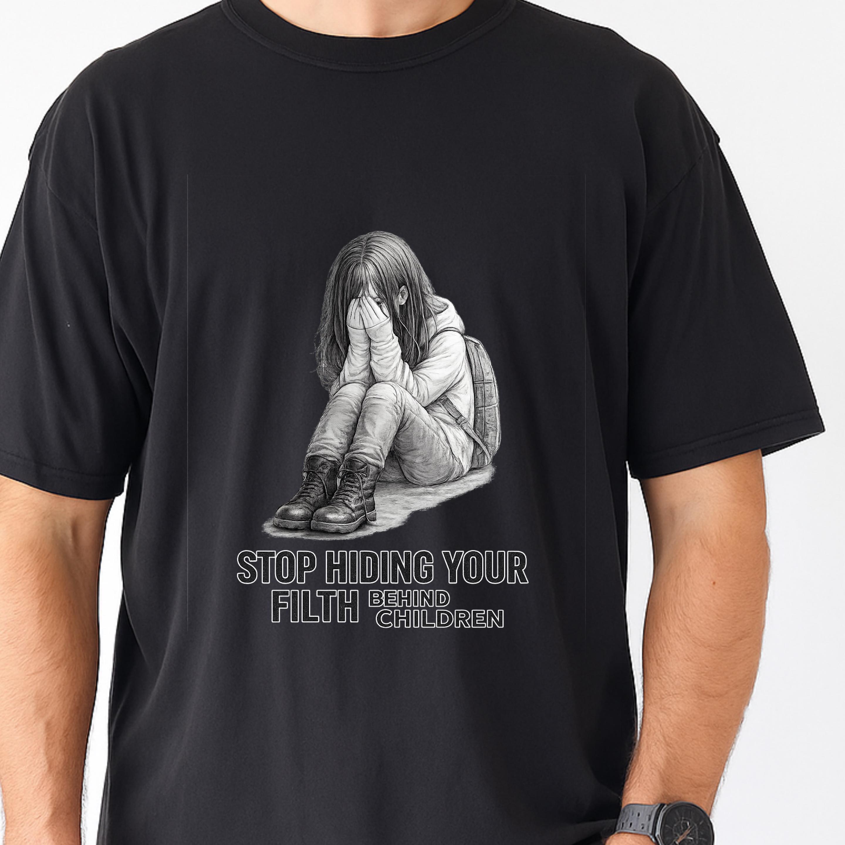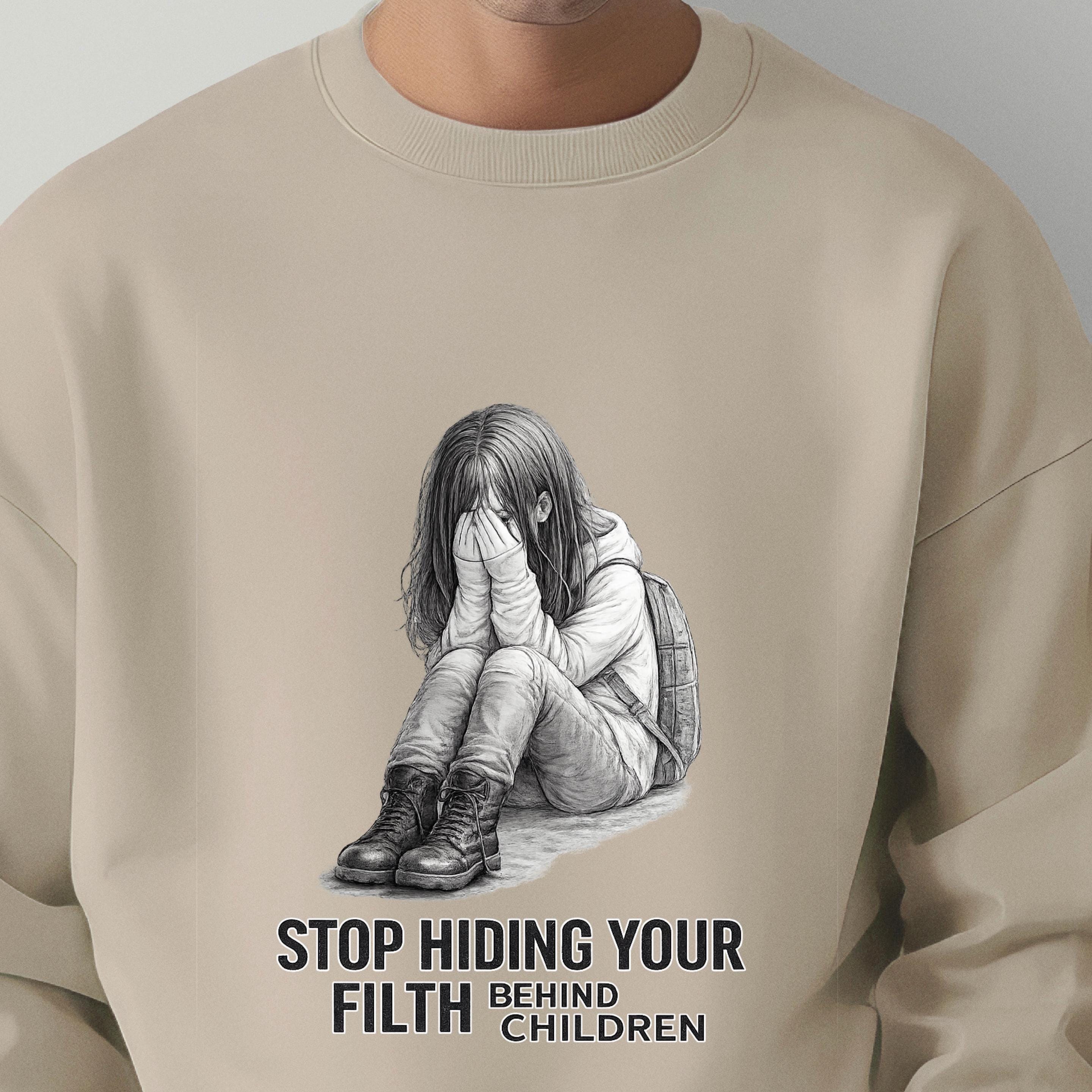 A haunting pencil illustration of a vulnerable child paired with the words “STOP HIDING YOUR FILTH BEHIND CHILDREN” delivers an unmistakable message: we see you, we remember, and we are no longer looking away.