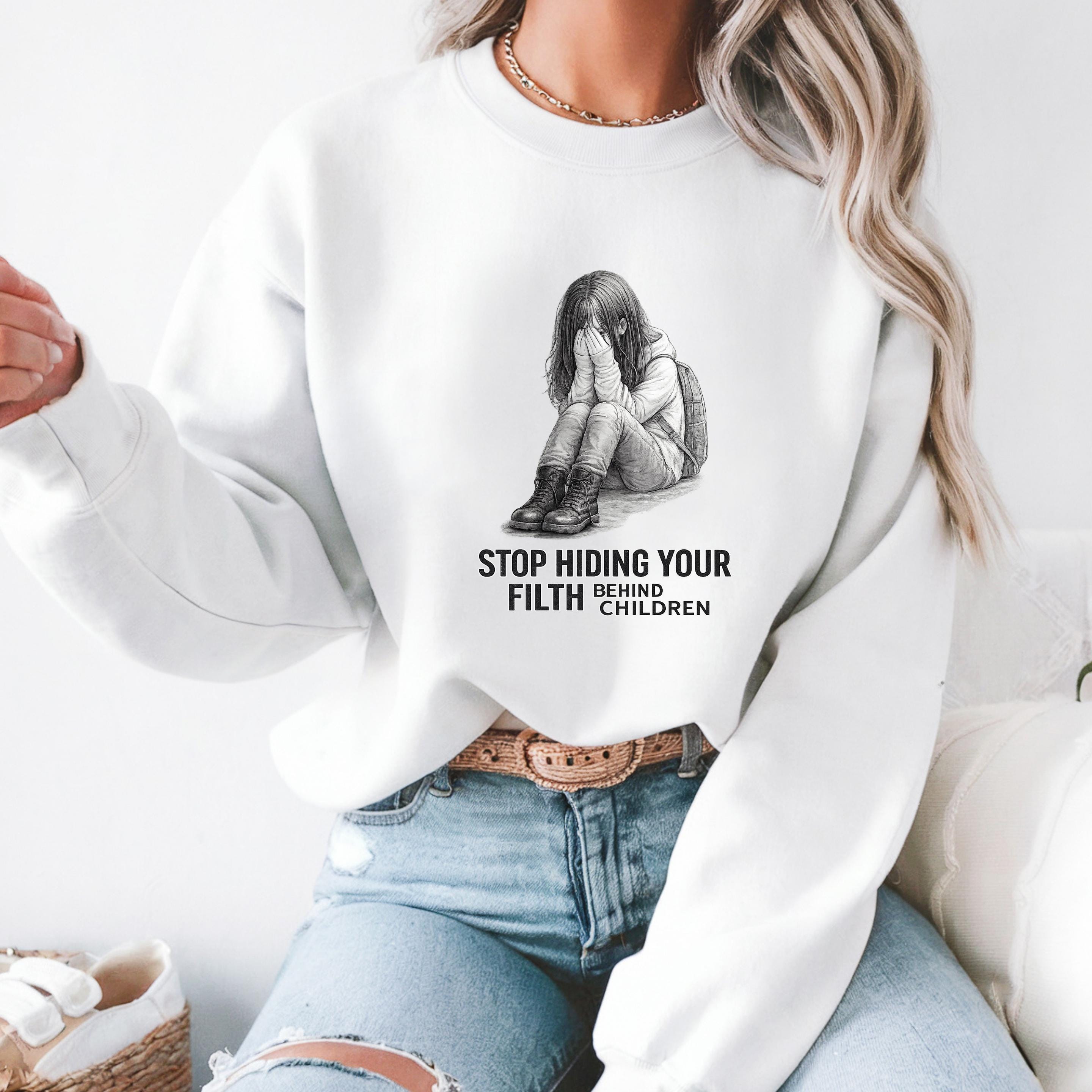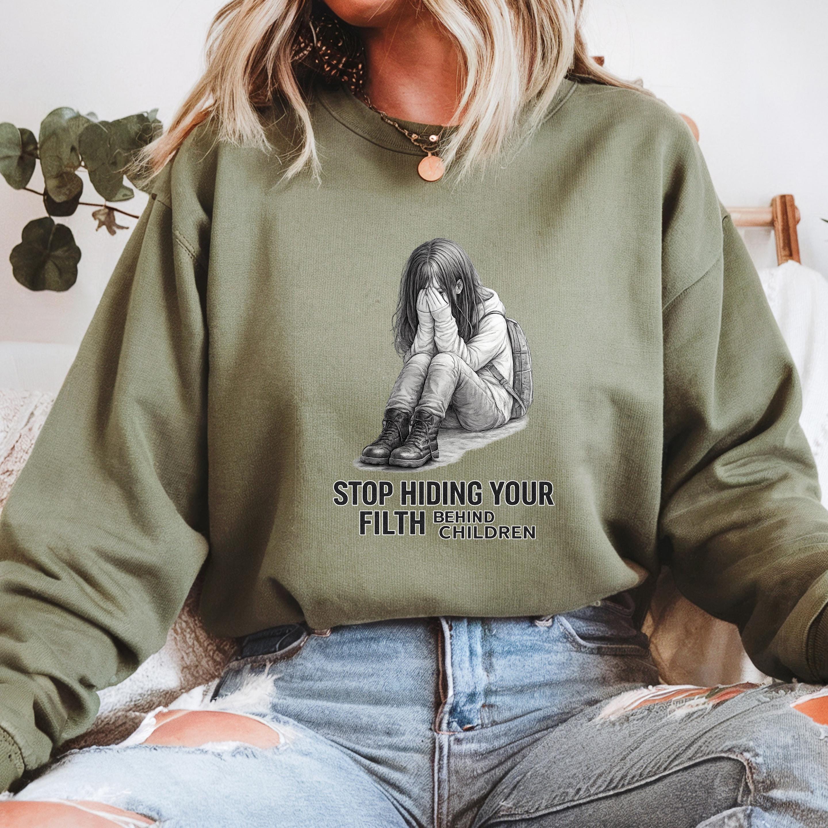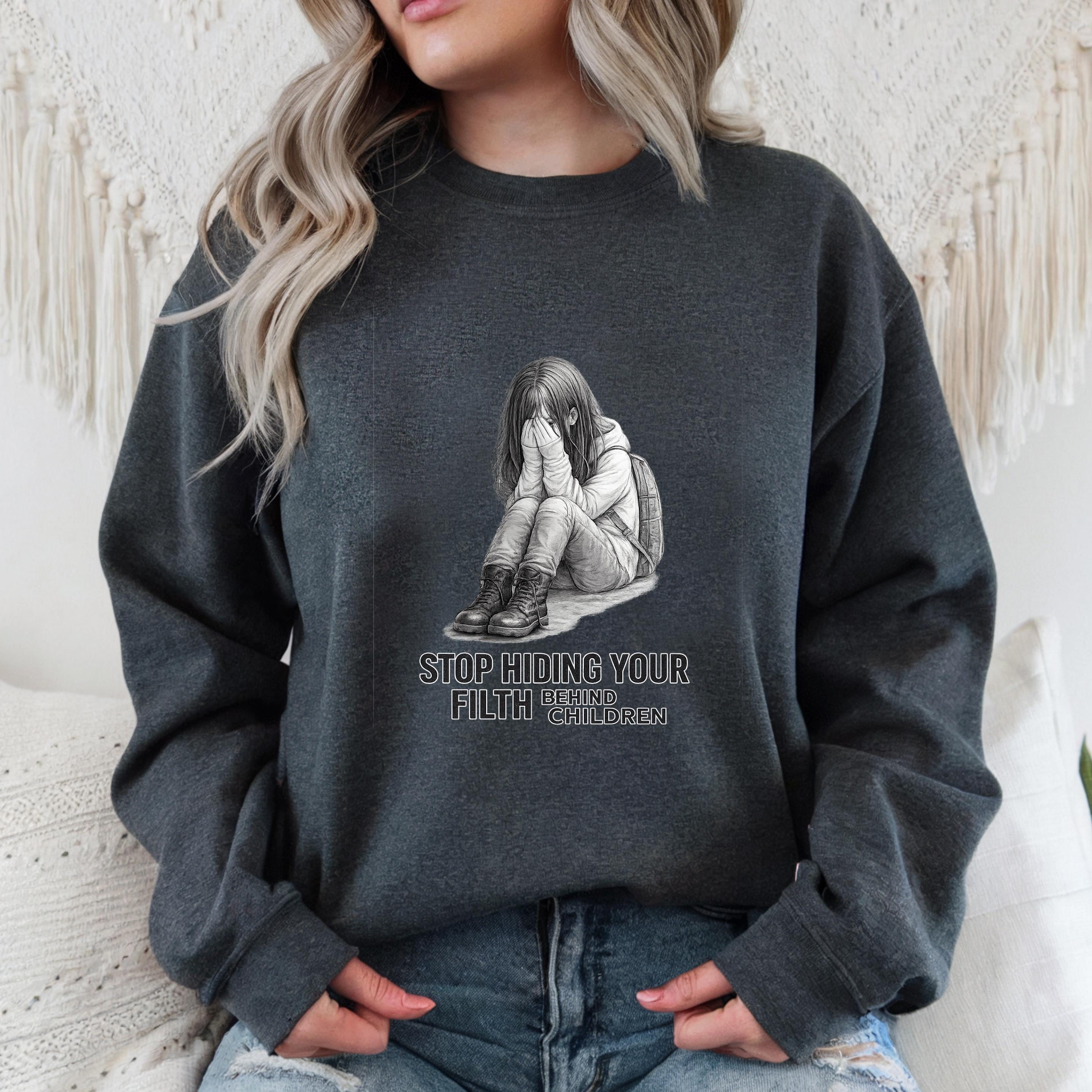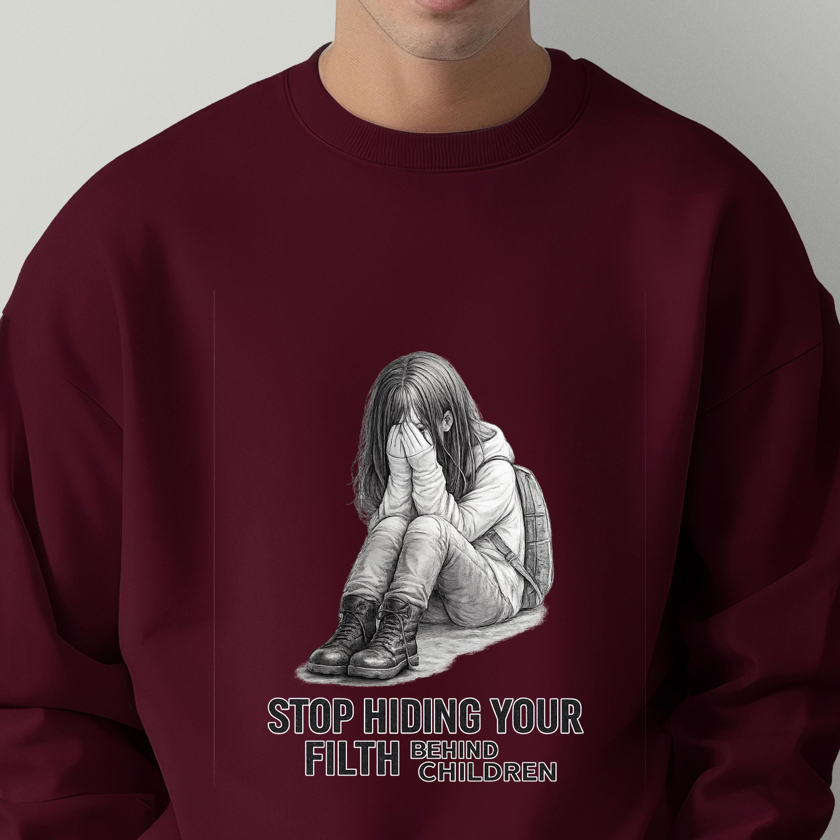 A haunting pencil illustration of a vulnerable child paired with the words “STOP HIDING YOUR FILTH BEHIND CHILDREN” delivers an unmistakable message: we see you, we remember, and we are no longer looking away.