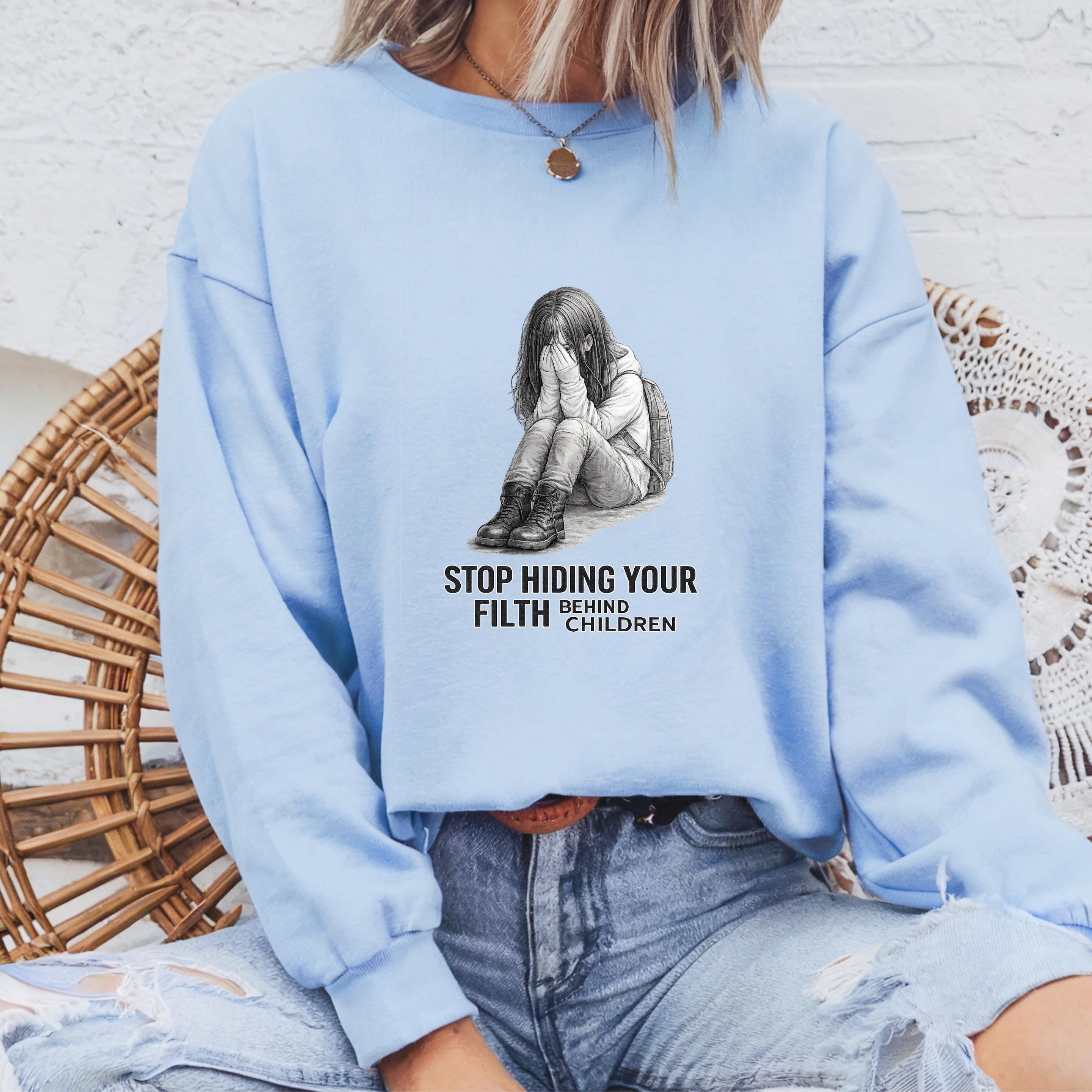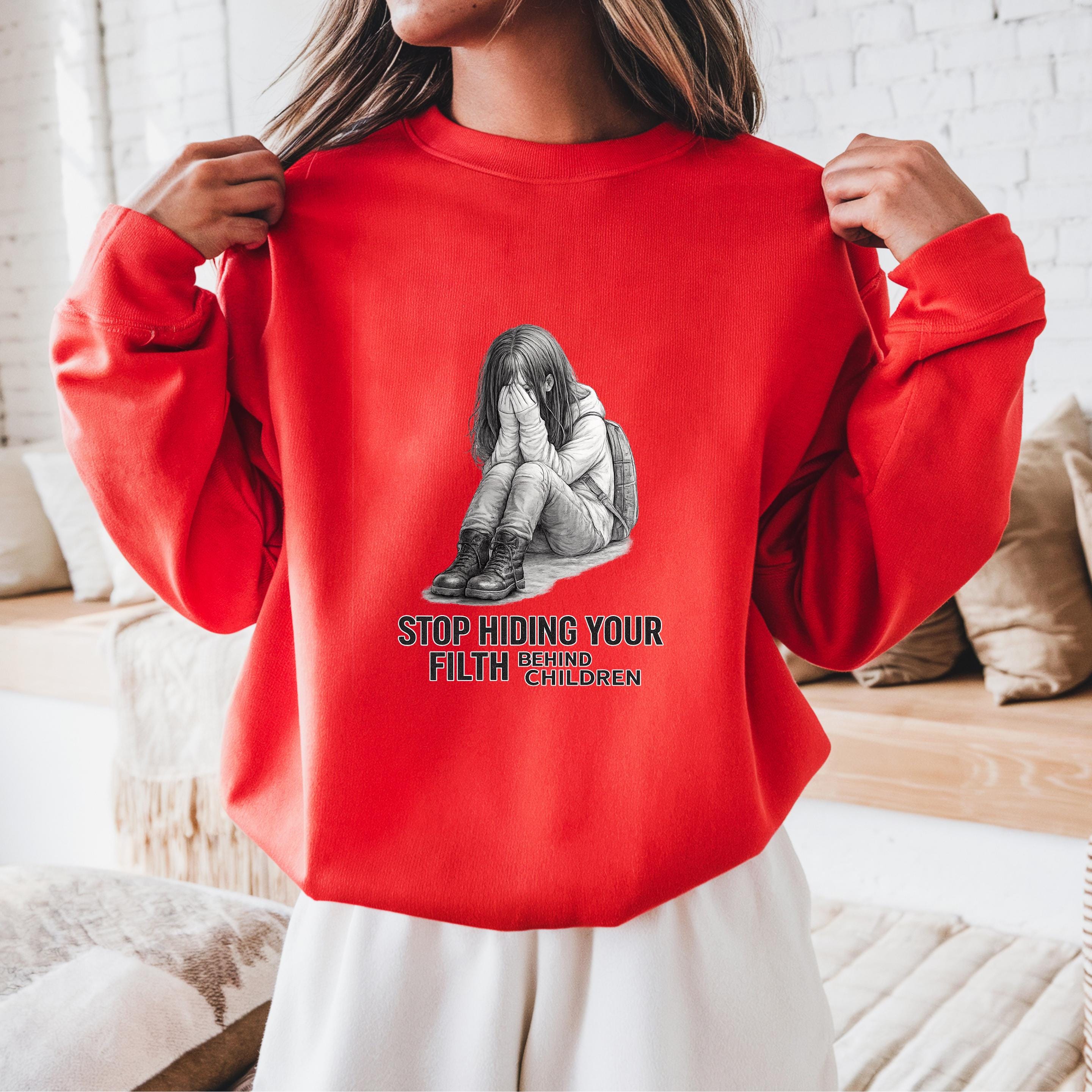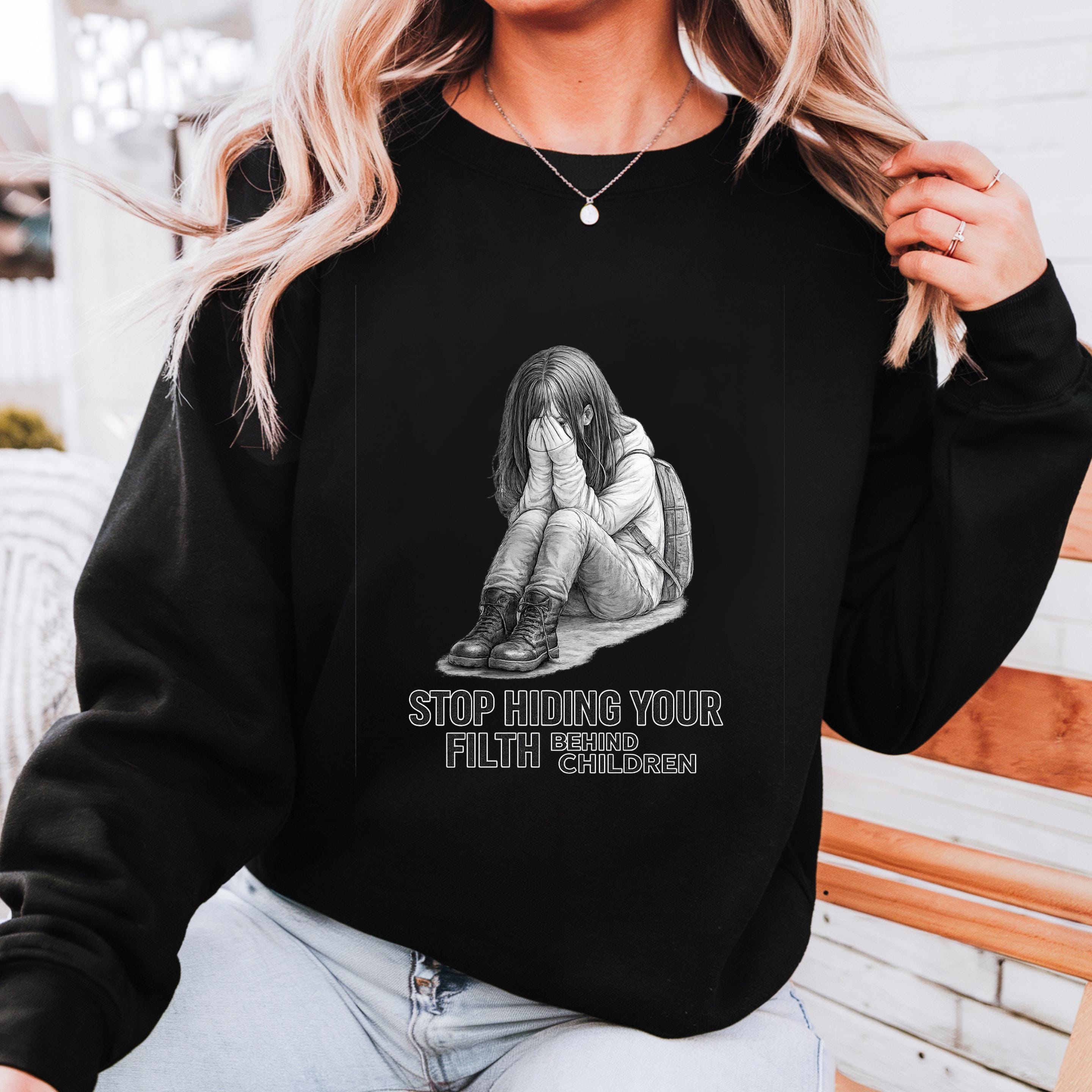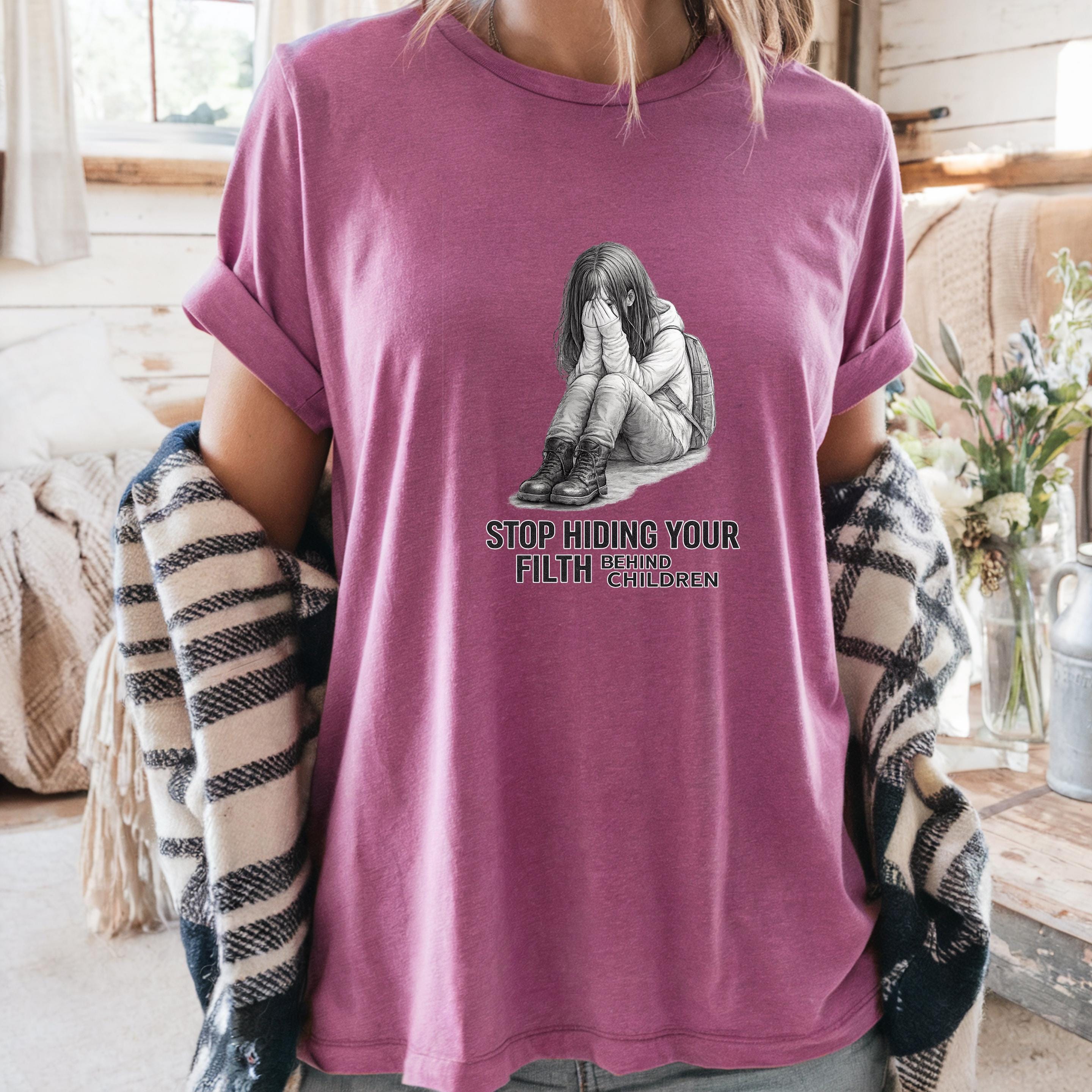 A haunting pencil illustration of a vulnerable child paired with the words “STOP HIDING YOUR FILTH BEHIND CHILDREN” delivers an unmistakable message: we see you, we remember, and we are no longer looking away.
